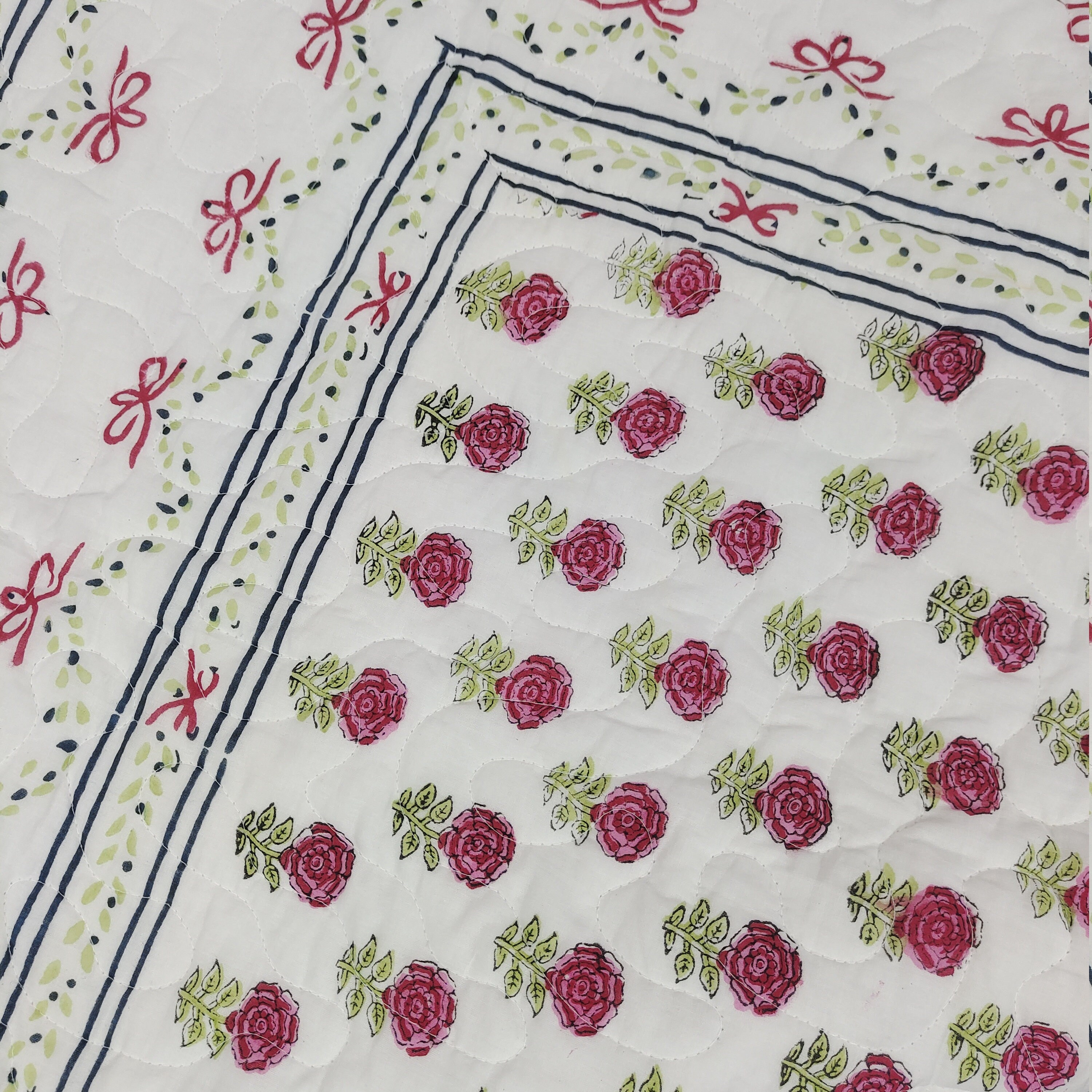 In conclusion, this machine-stitched quilt with zigzag patterns, filled with a surgical cotton sheet of 200 GSM, featuring a reversible hand block print, is a harmonious blend of craftsmanship and practicality. Its decorative elements and thoughtful construction make it a stylish yet functional addition to any bedroom. The quilt's machine washability adds a layer of convenience, ensuring that it remains a cherished and enduring part of daily lifeInternational Shipping & Customs Notice We are proud to ship our handmade cotton quilts worldwide from Jaipur, India. Please be advised: