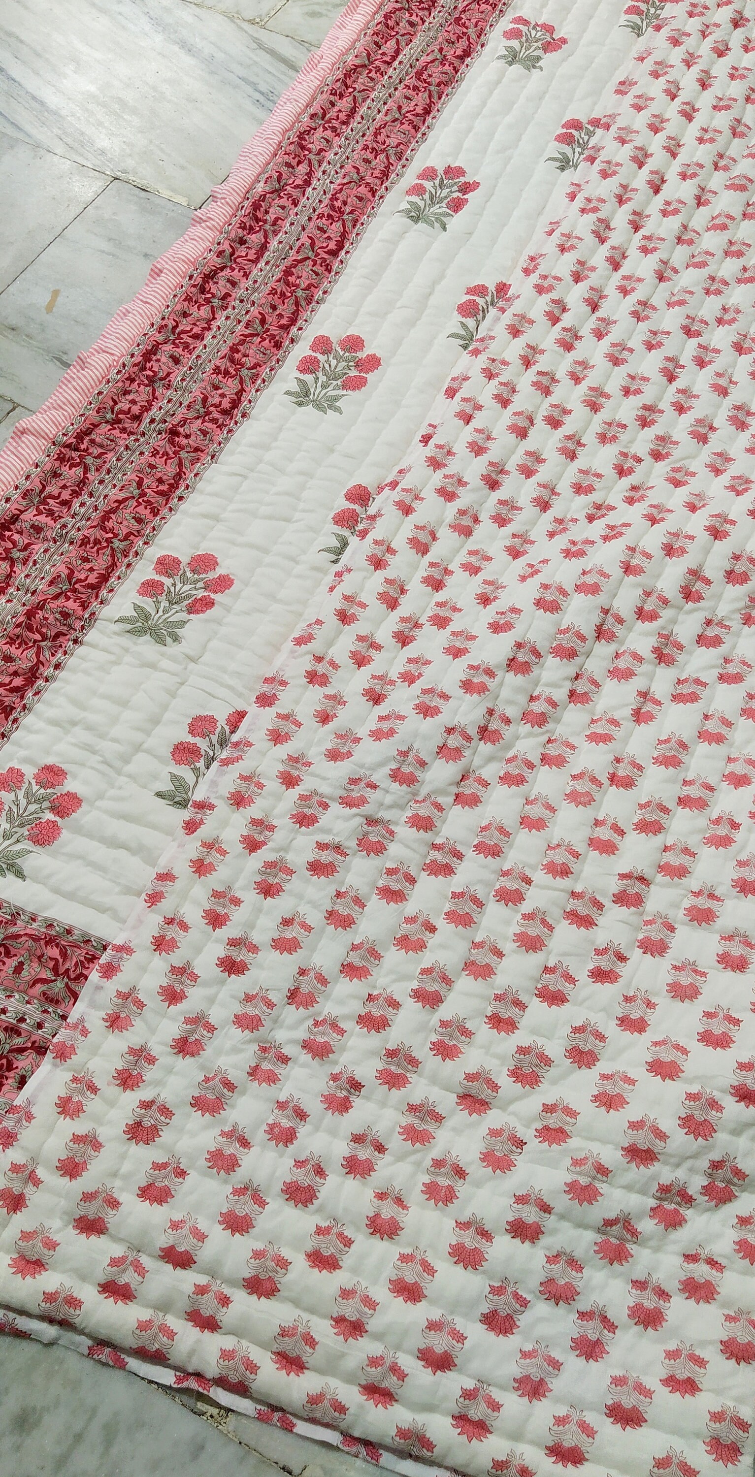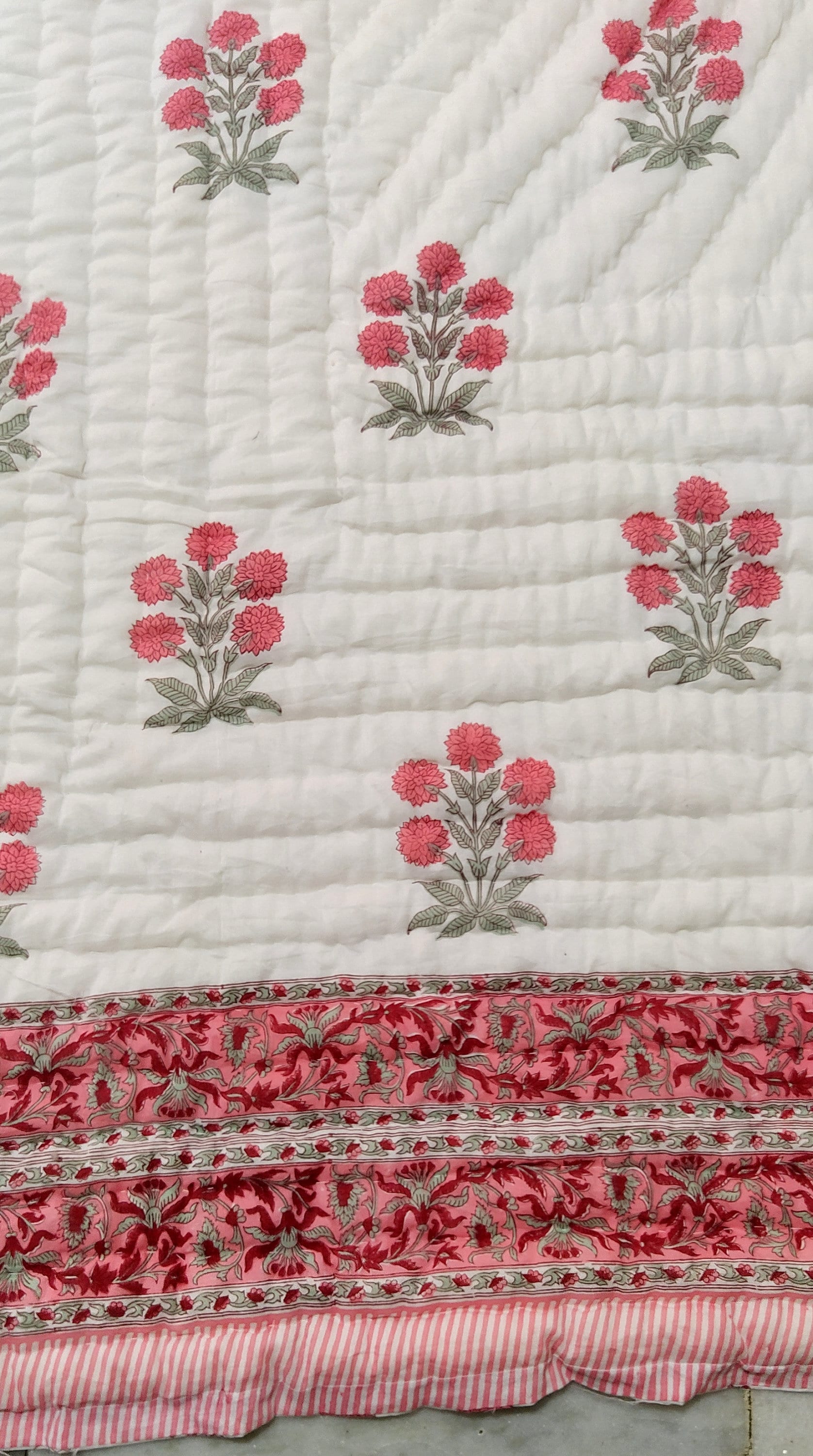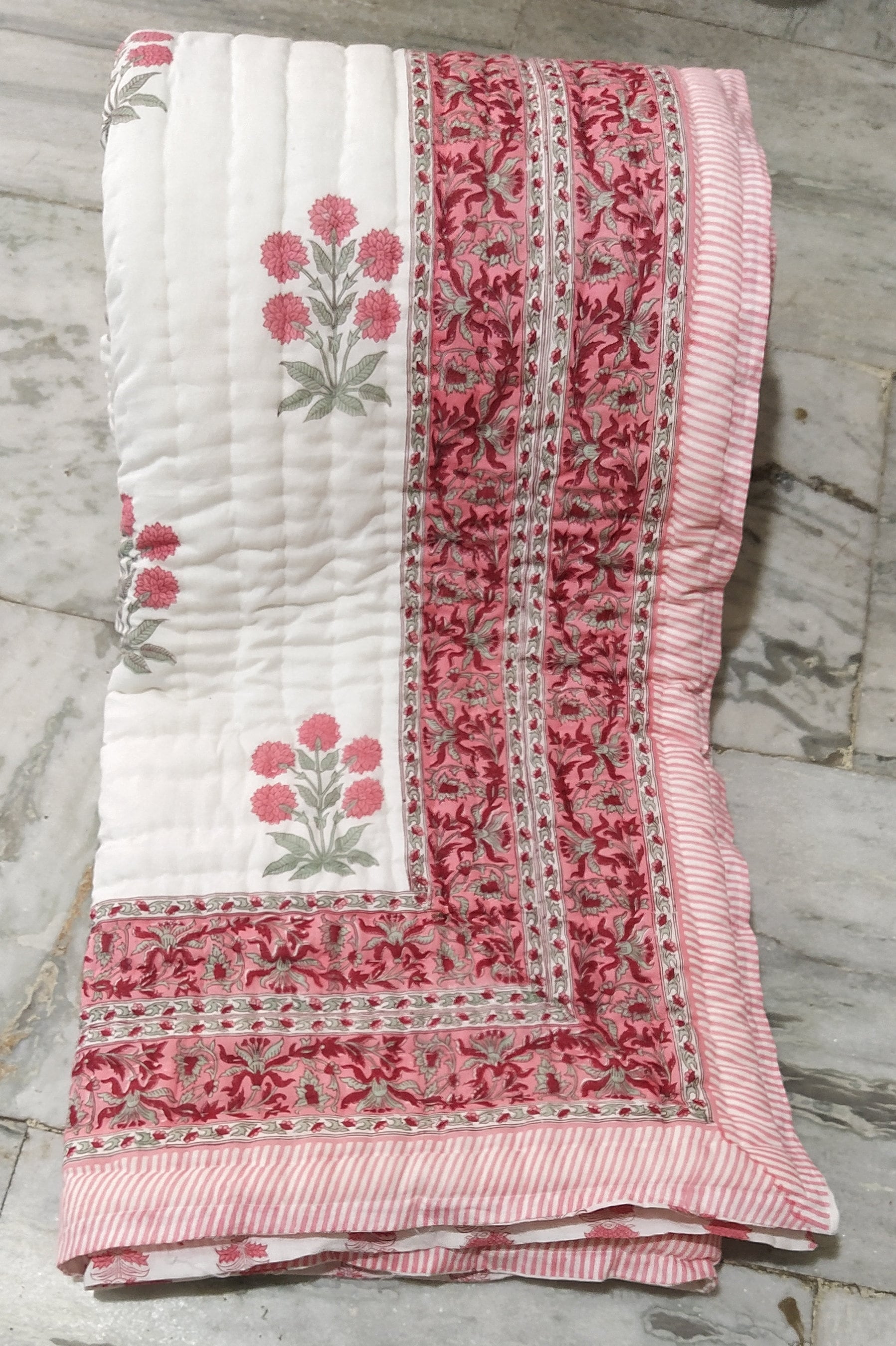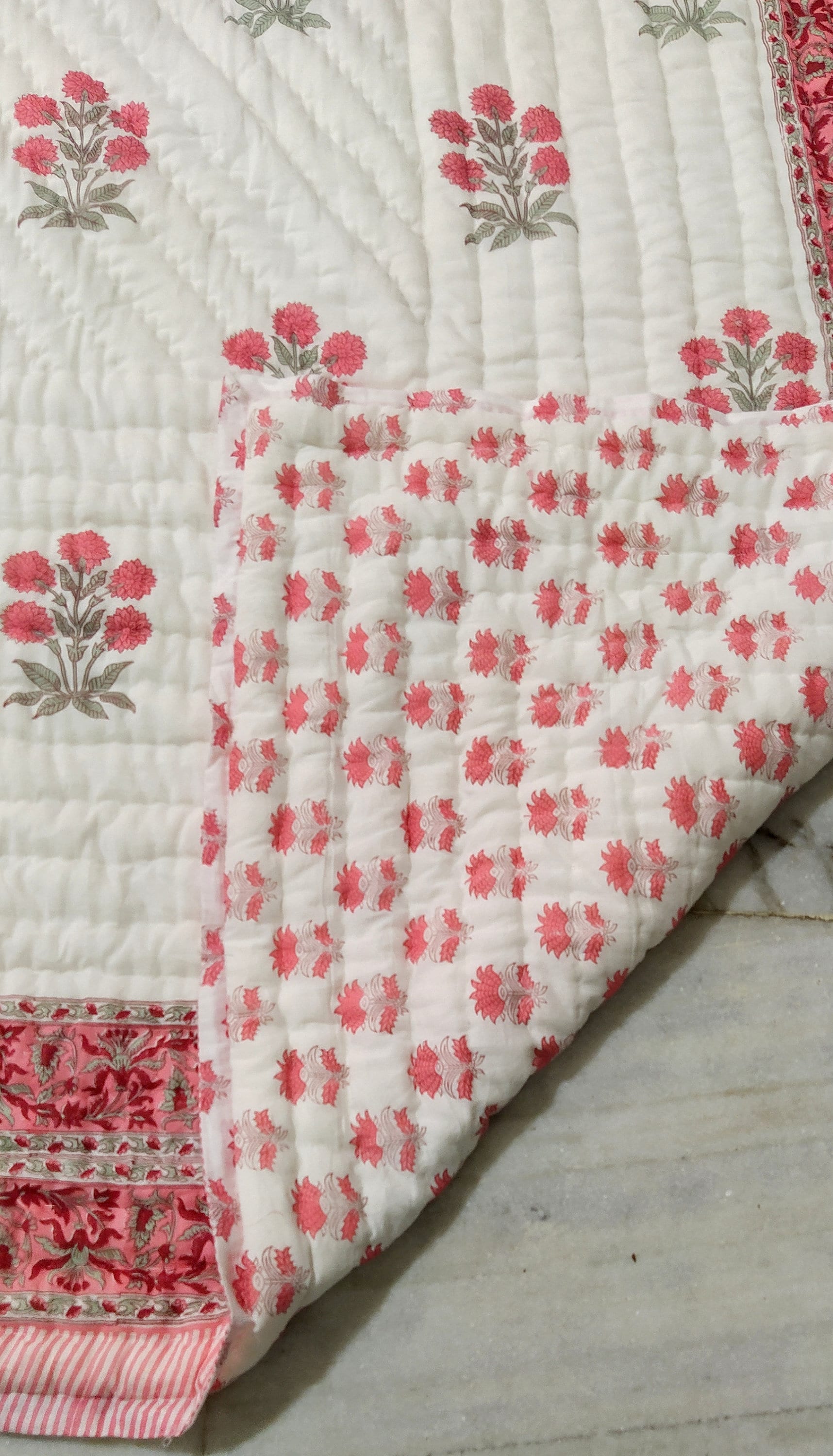 Indulge in the artistry of traditional craftsmanship with our exquisite Hand Stitched Hand Block Print Quilt. Each quilt is a masterpiece of skill and creativity, meticulously crafted by skilled artisans in Jaipur, India. From the intricate hand block printing to the careful stitching, every step in the process is a labor of love, resulting in a quilt that's as beautiful as it is functional.
