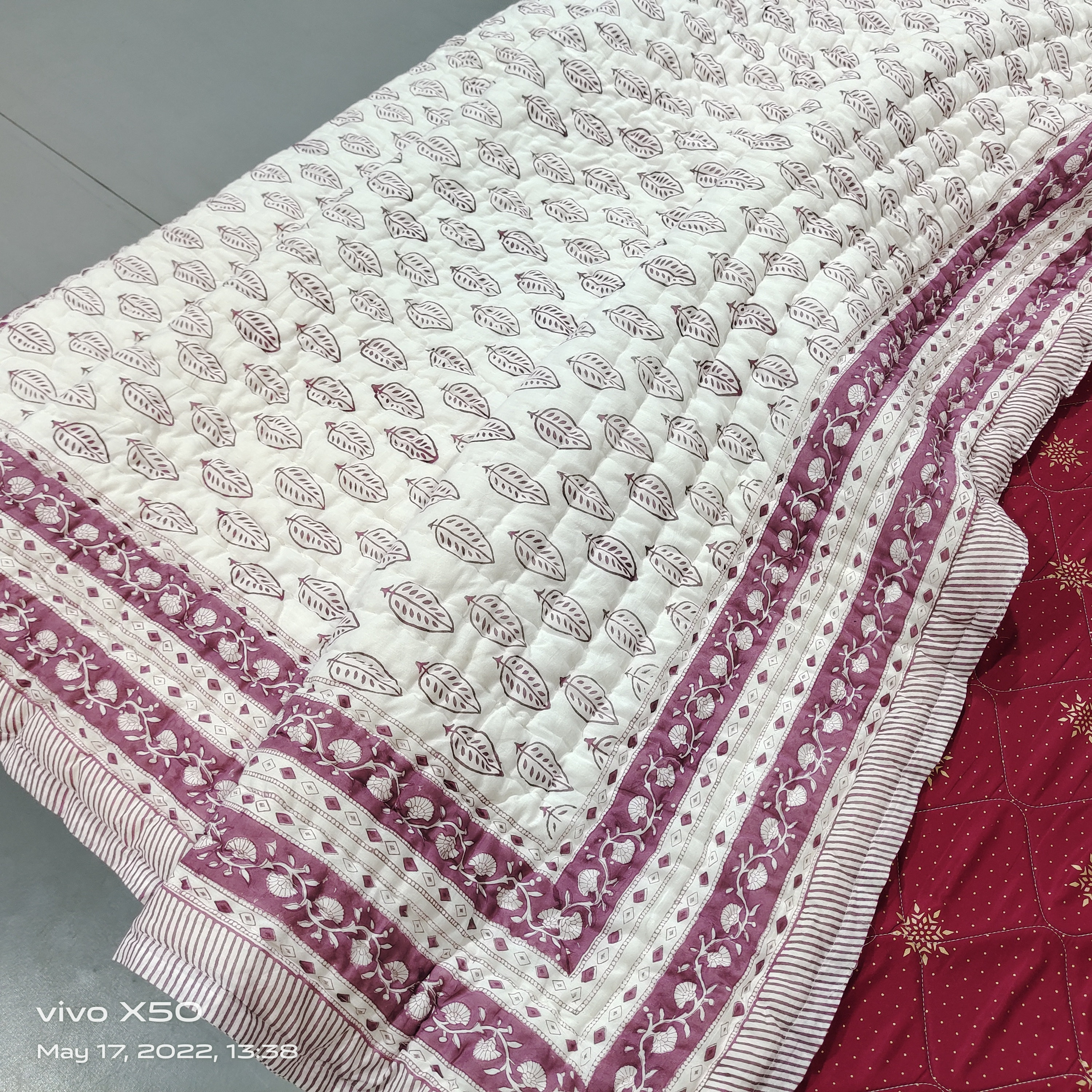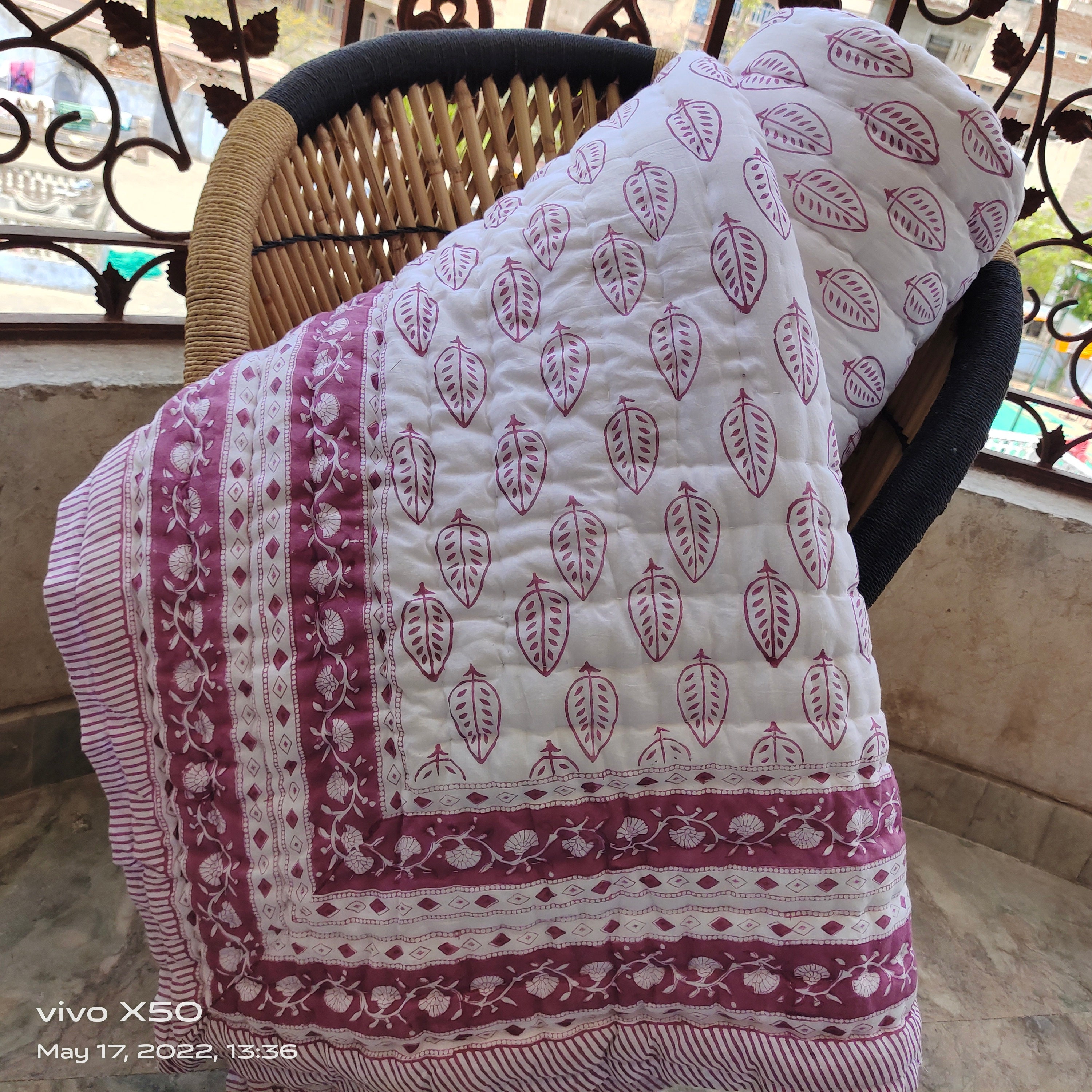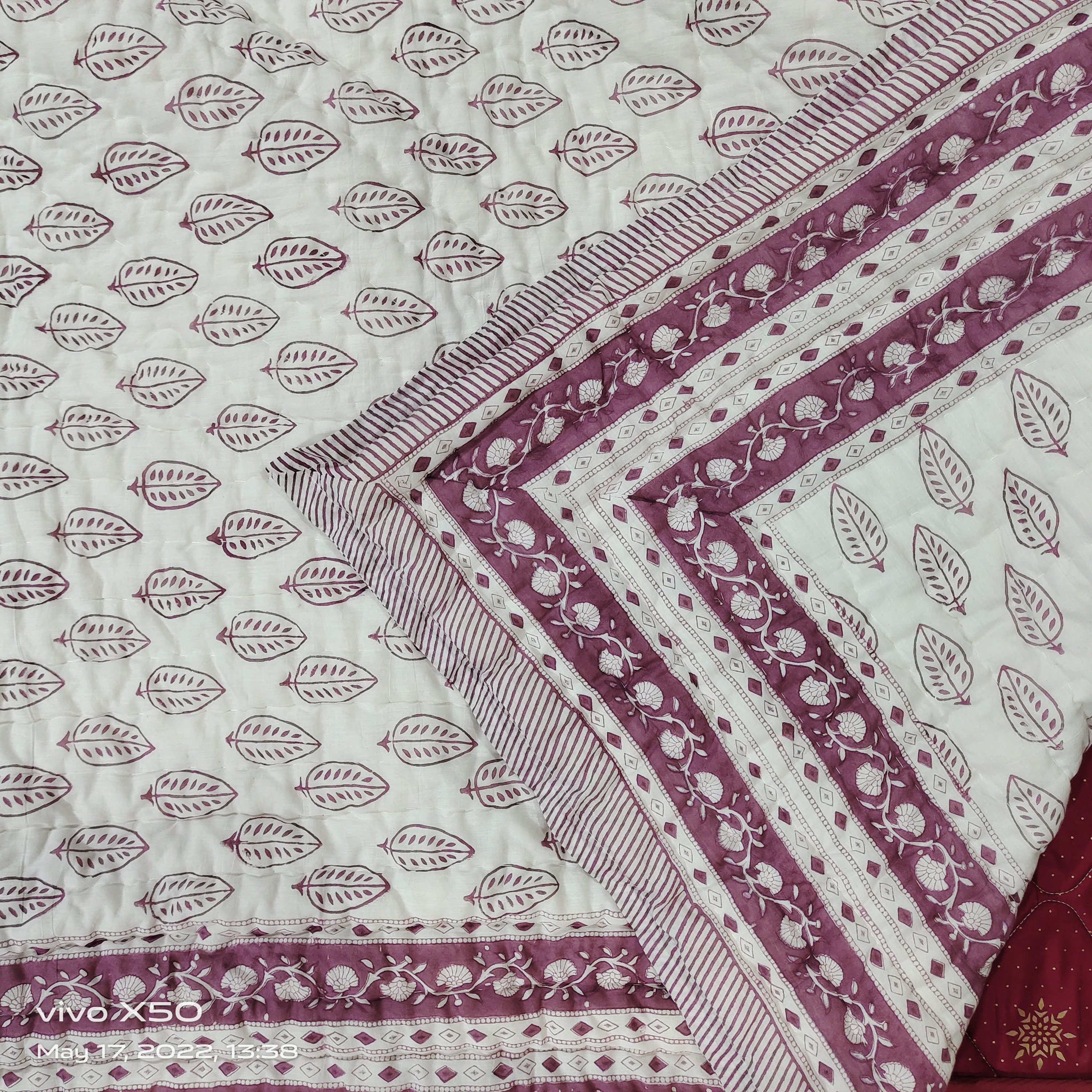 Purple Leaf Hand Block Print Quilt: Reversible Jaipuri Razai