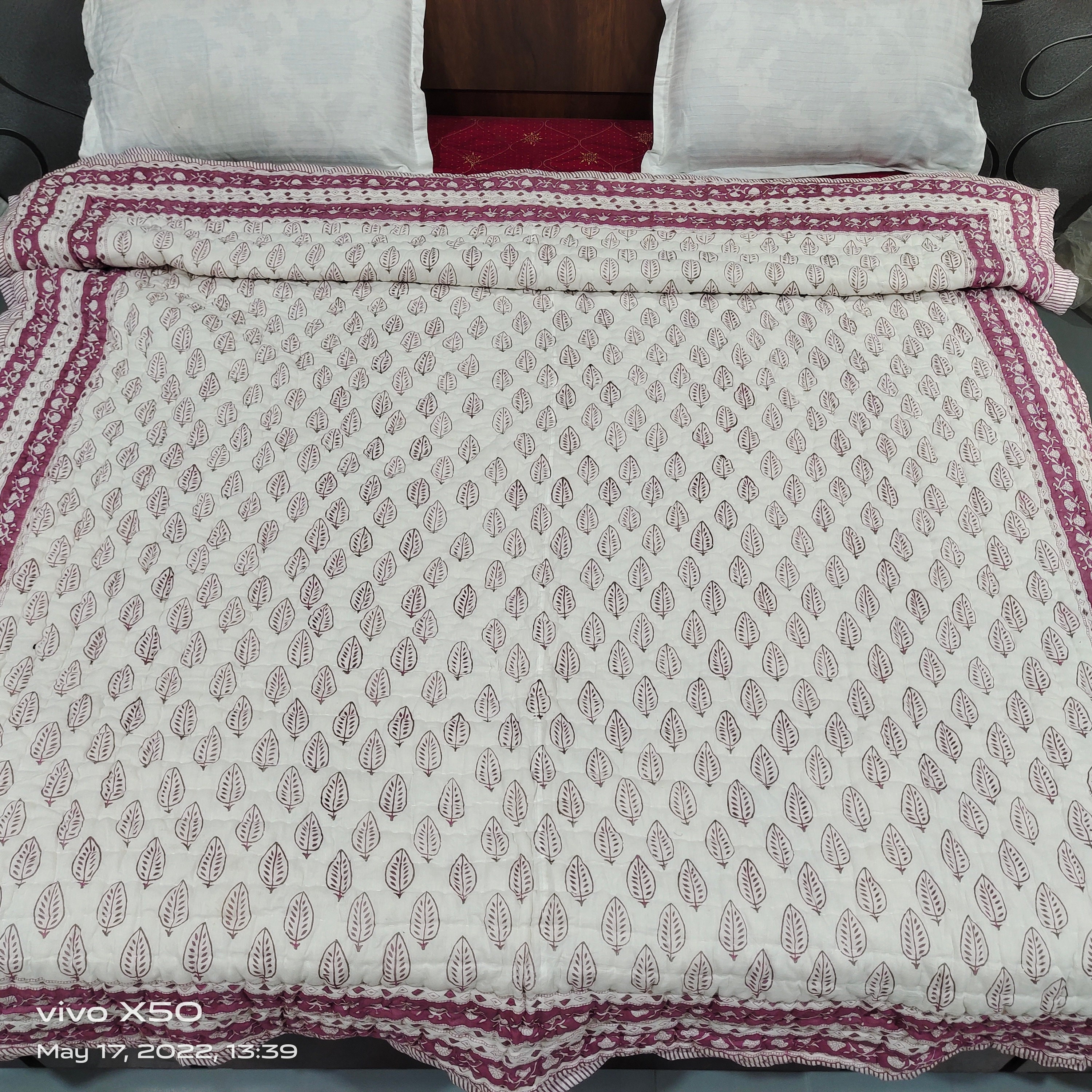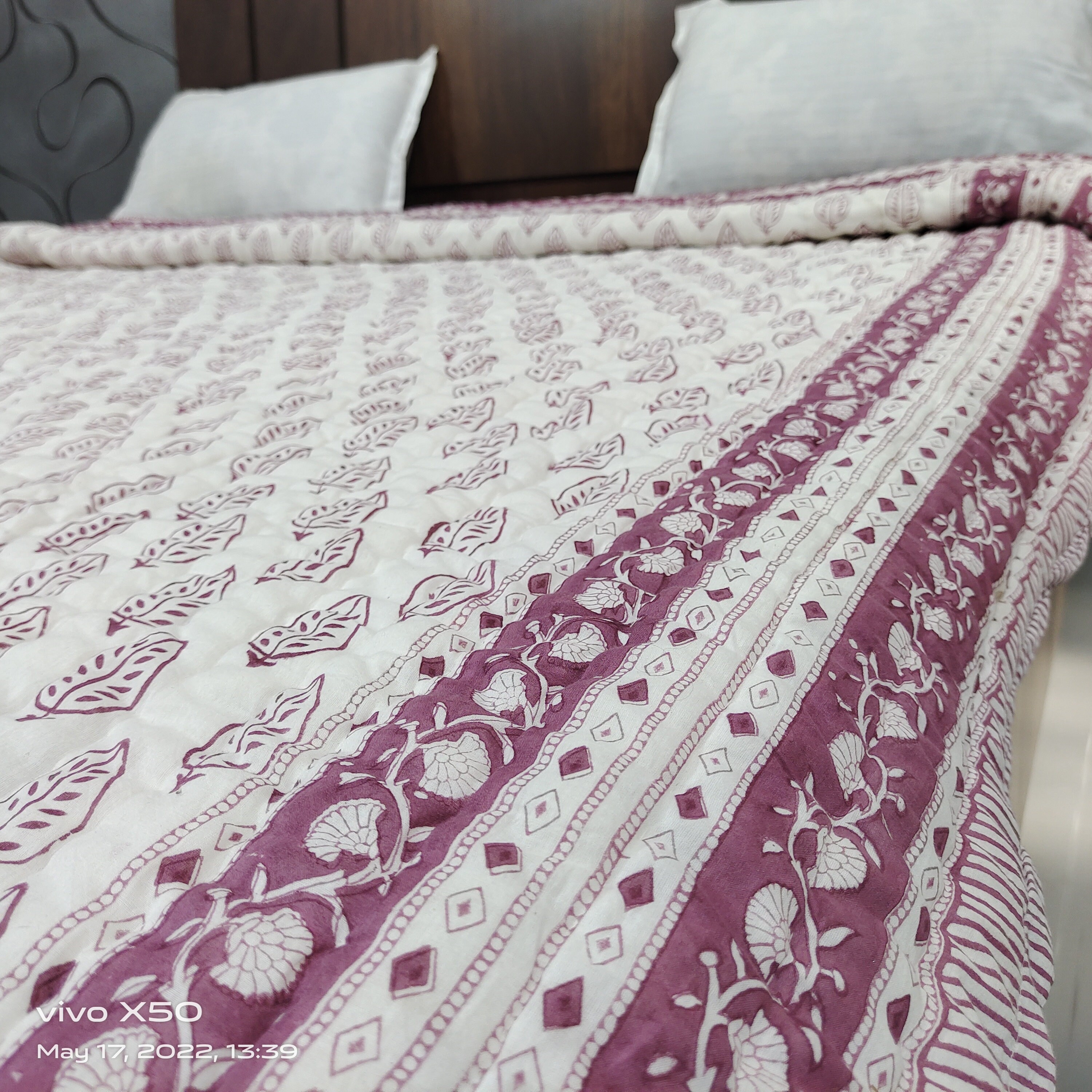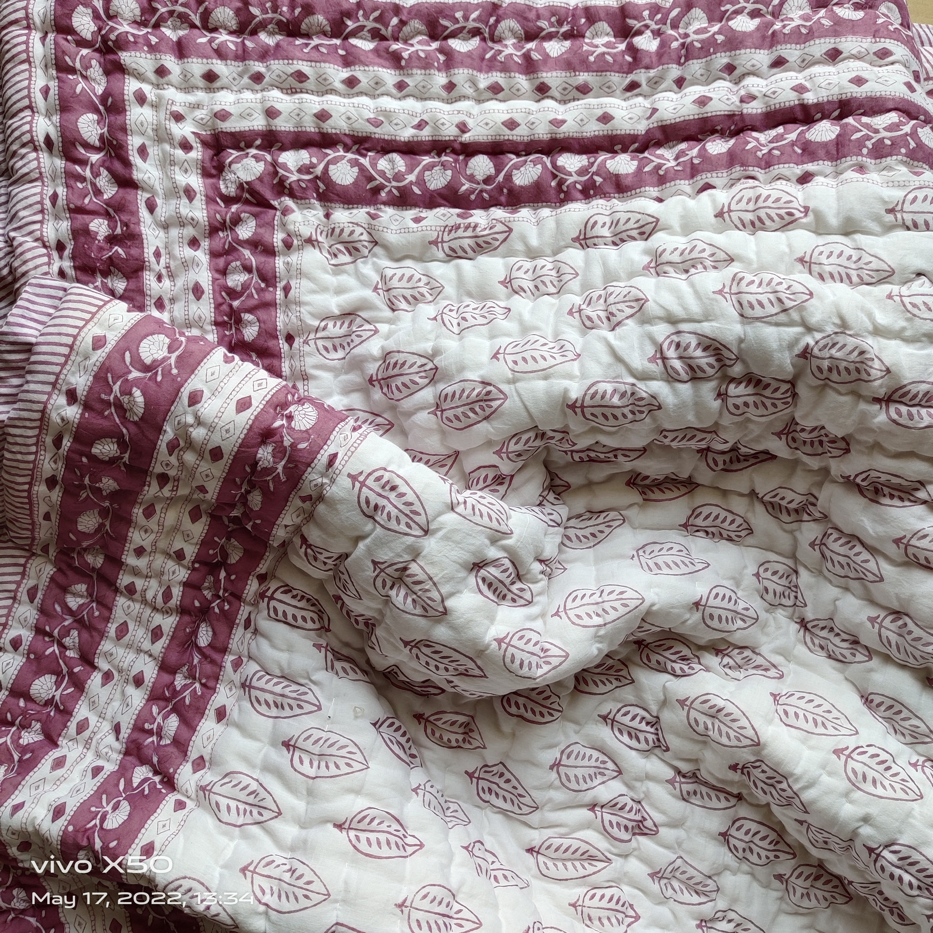 Purple Leaf Hand Block Print Quilt: Reversible Jaipuri Razai