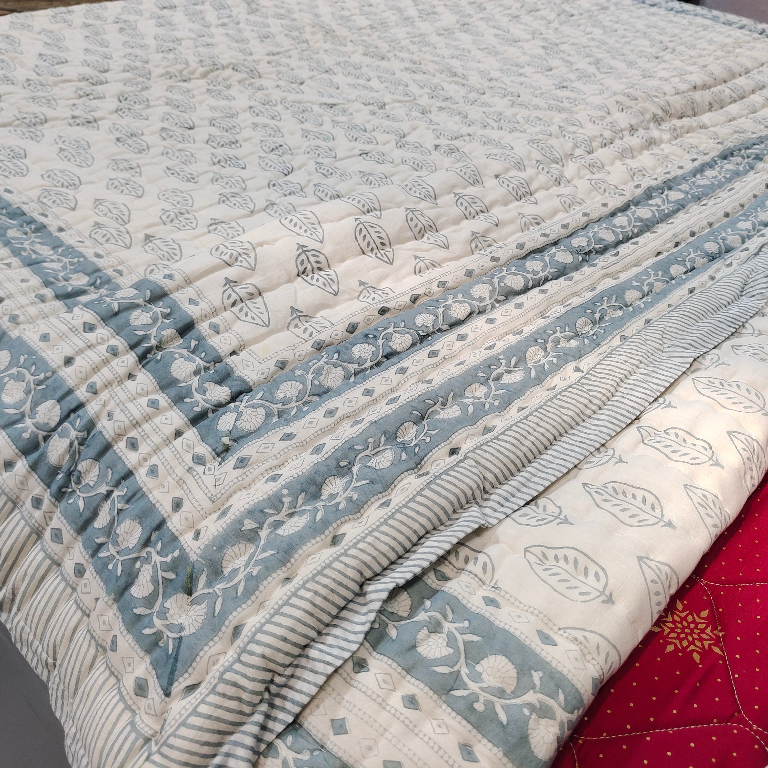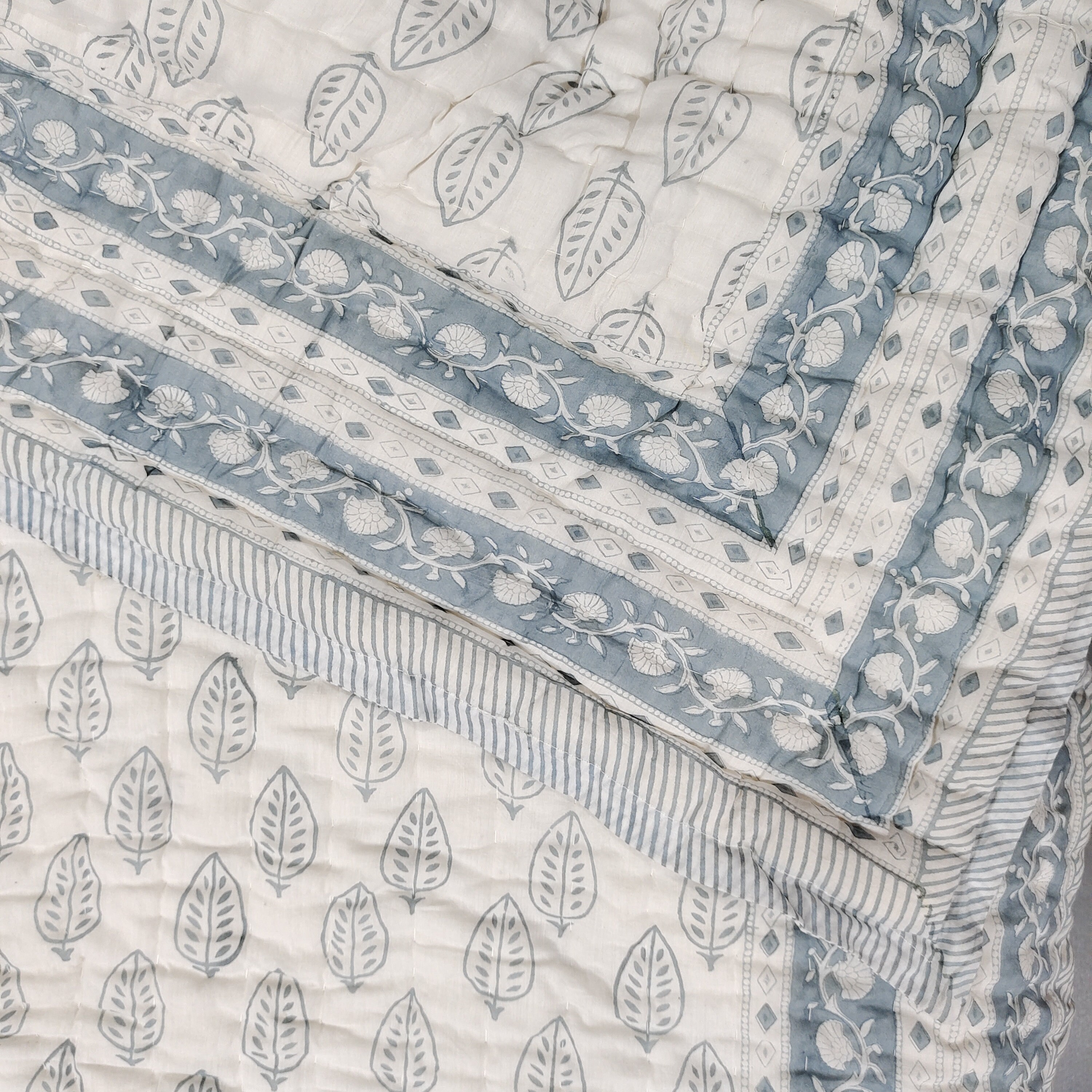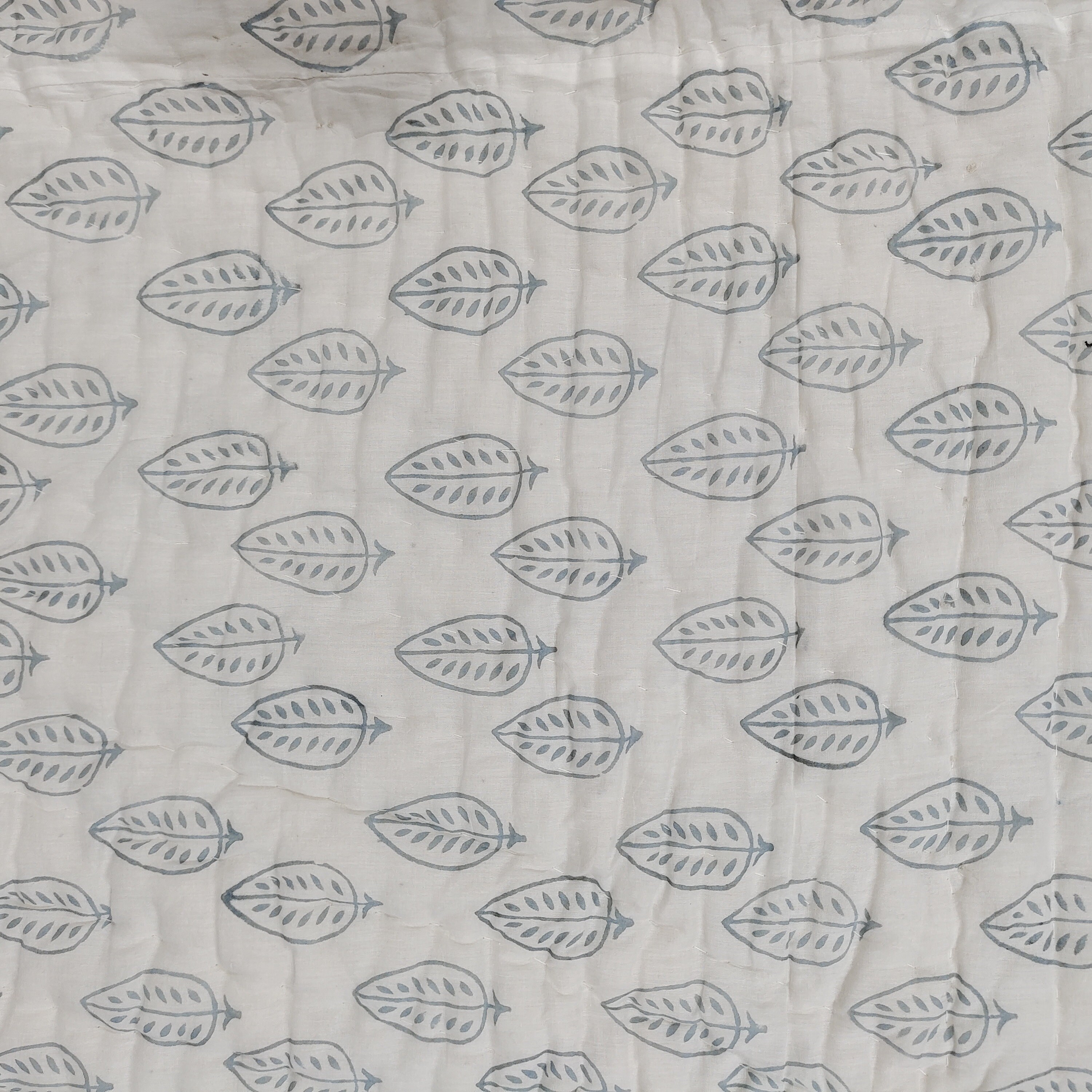 Hand Block Print Cotton Quilt: Gray Leaf Pattern, Queen Size