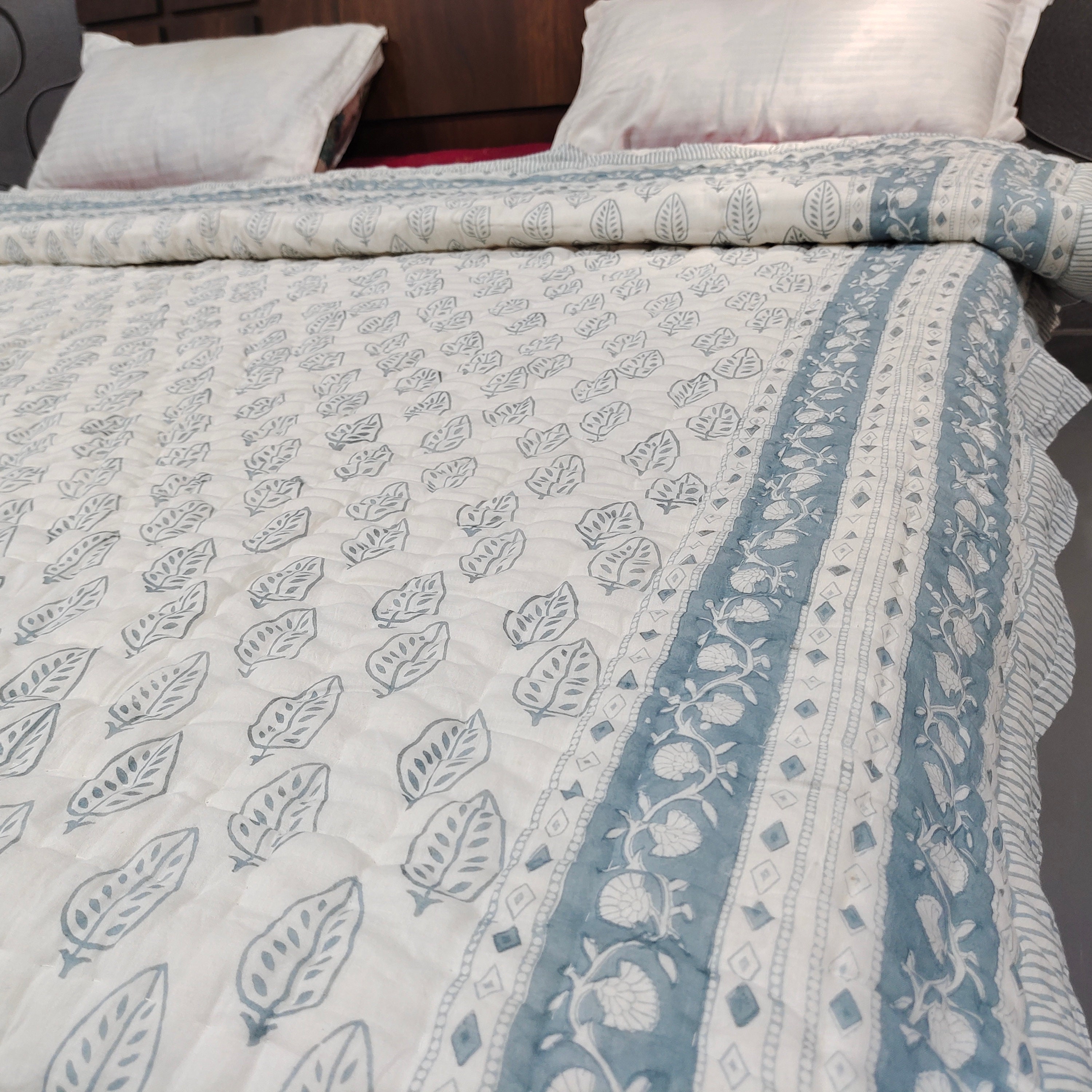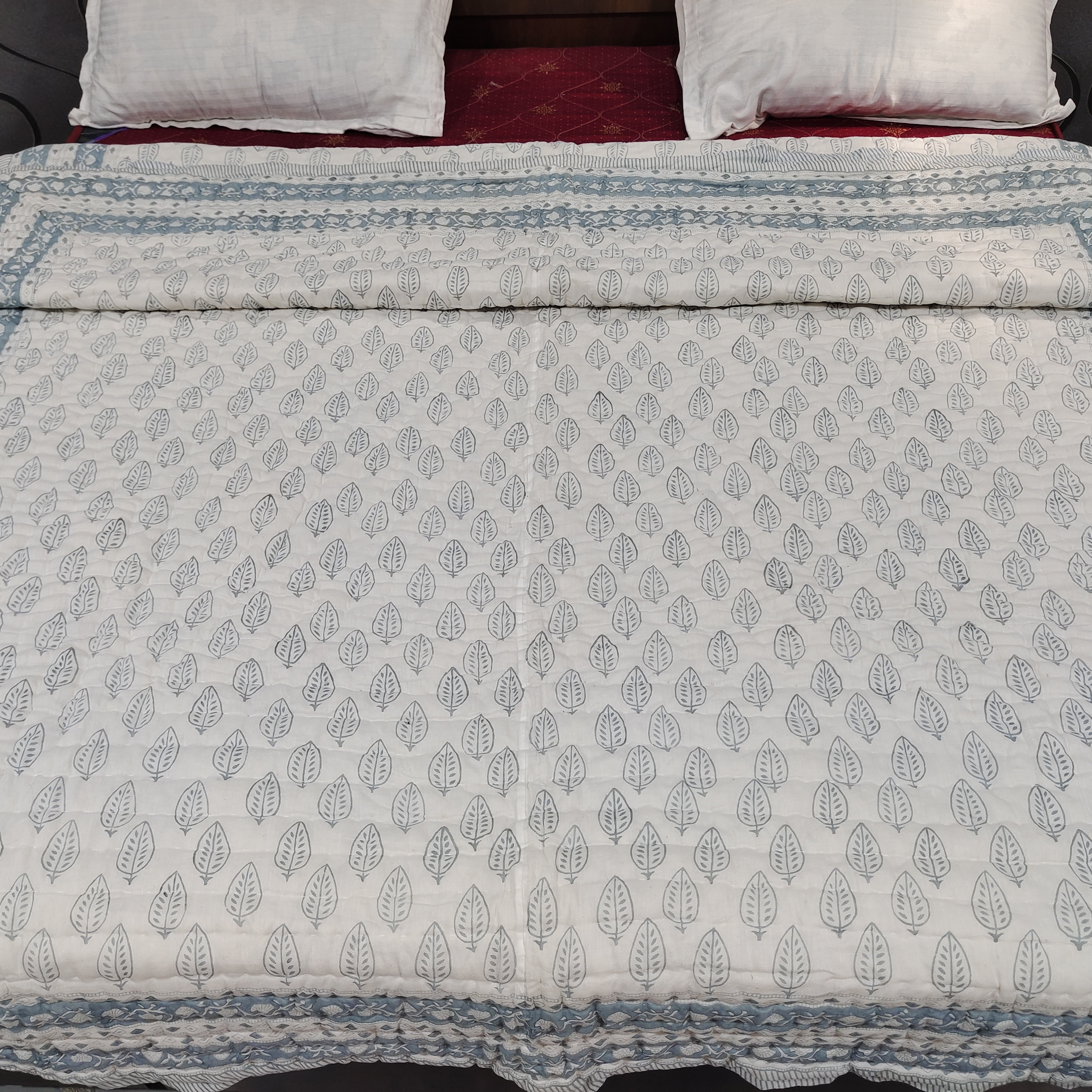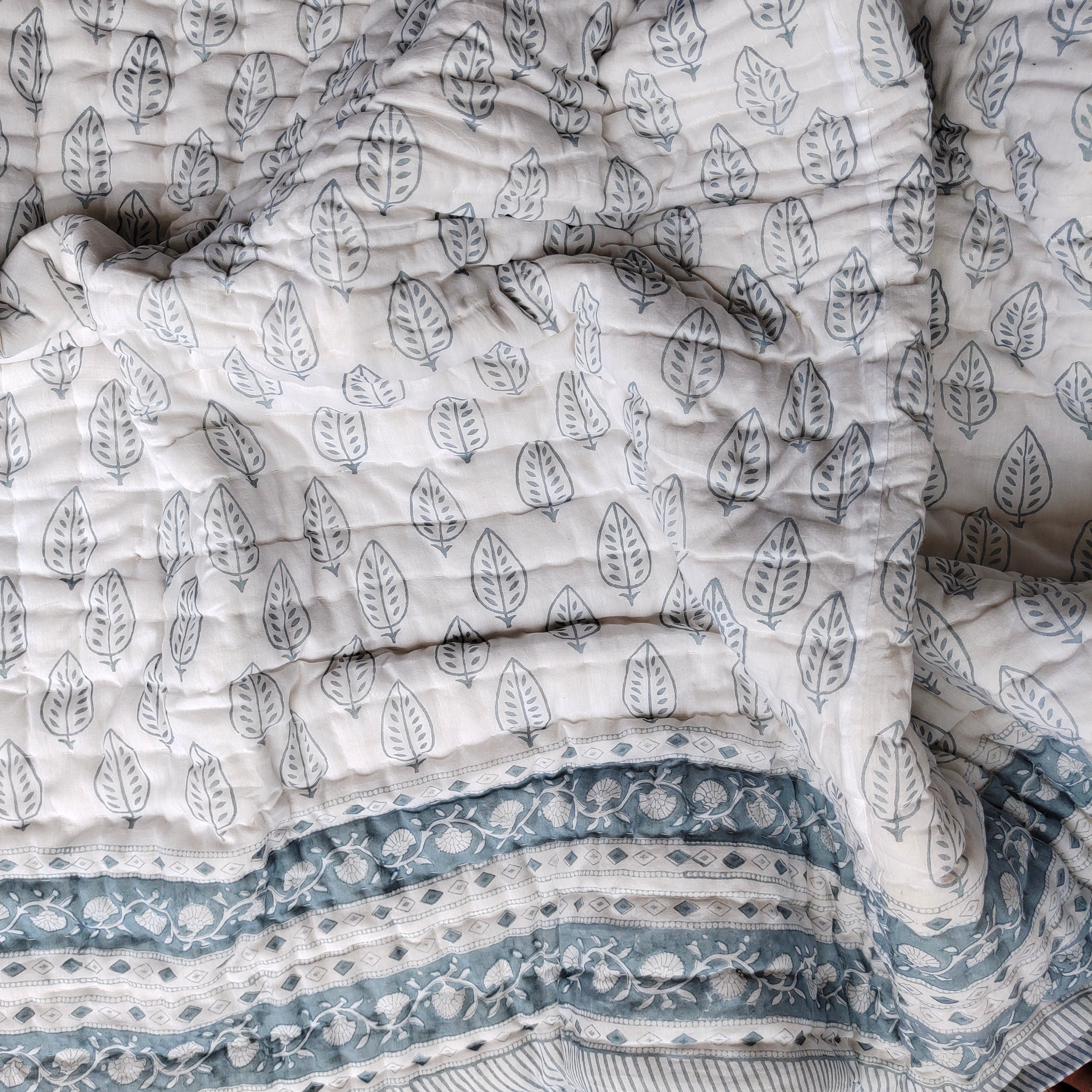 Hand Block Print Cotton Quilt: Gray Leaf Pattern, Queen Size