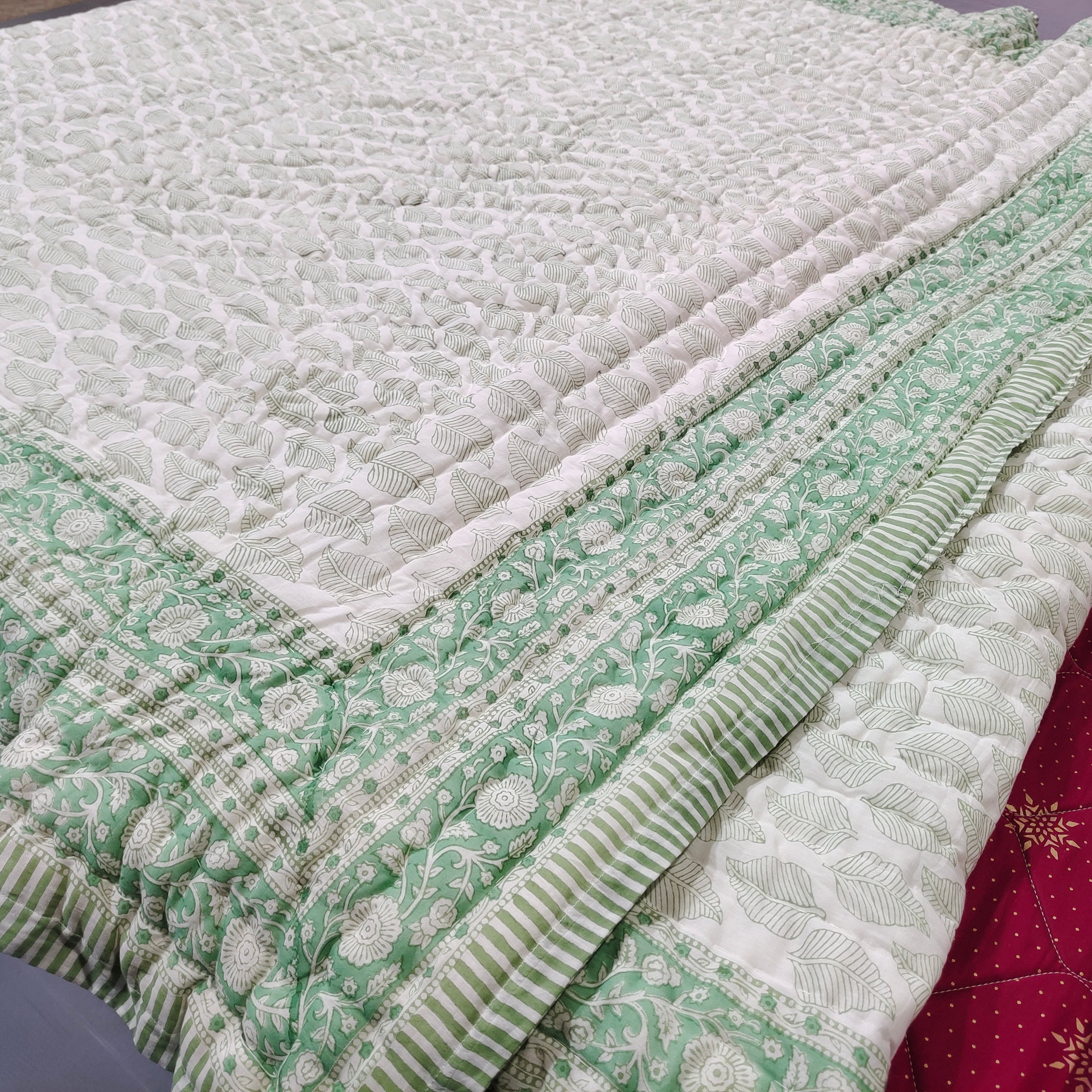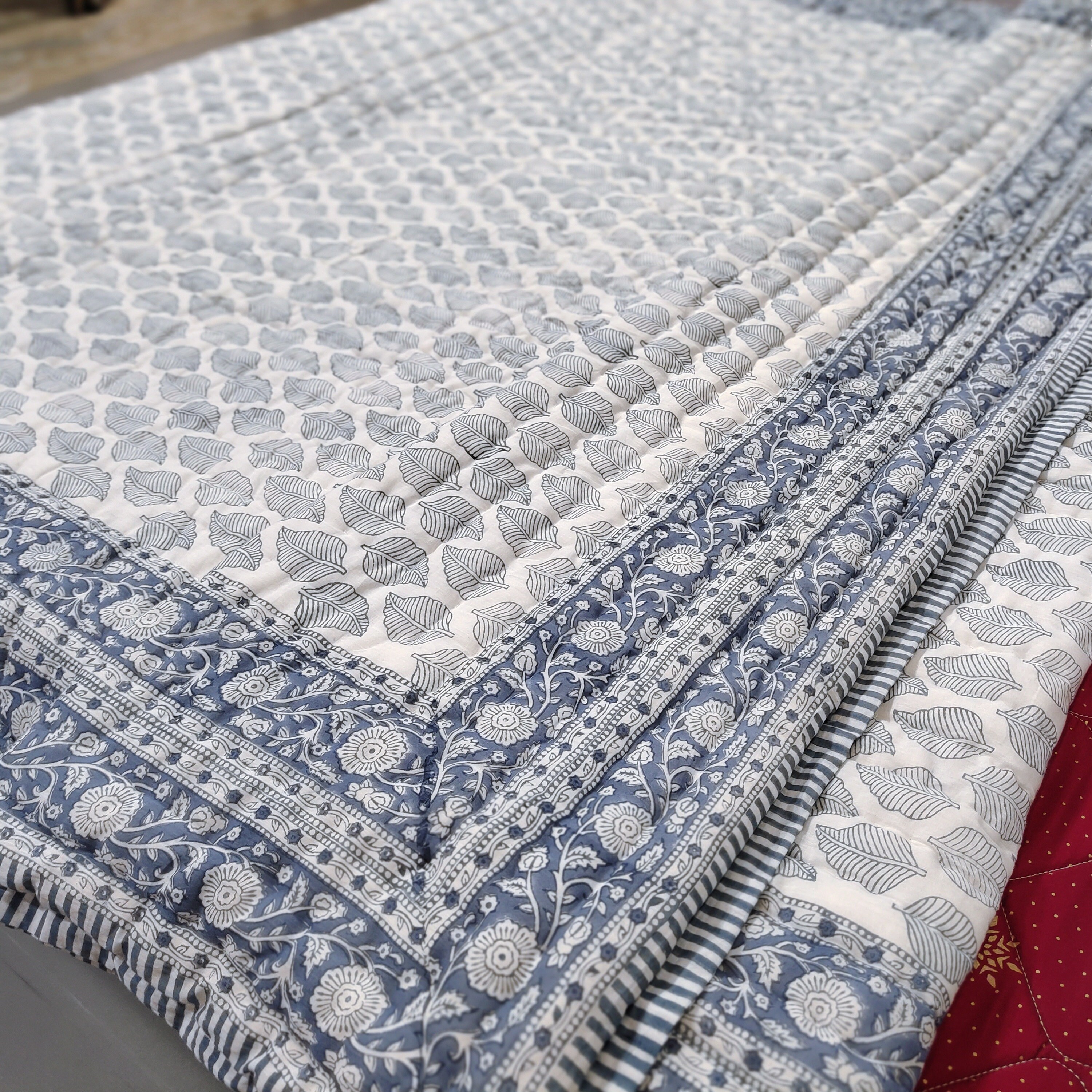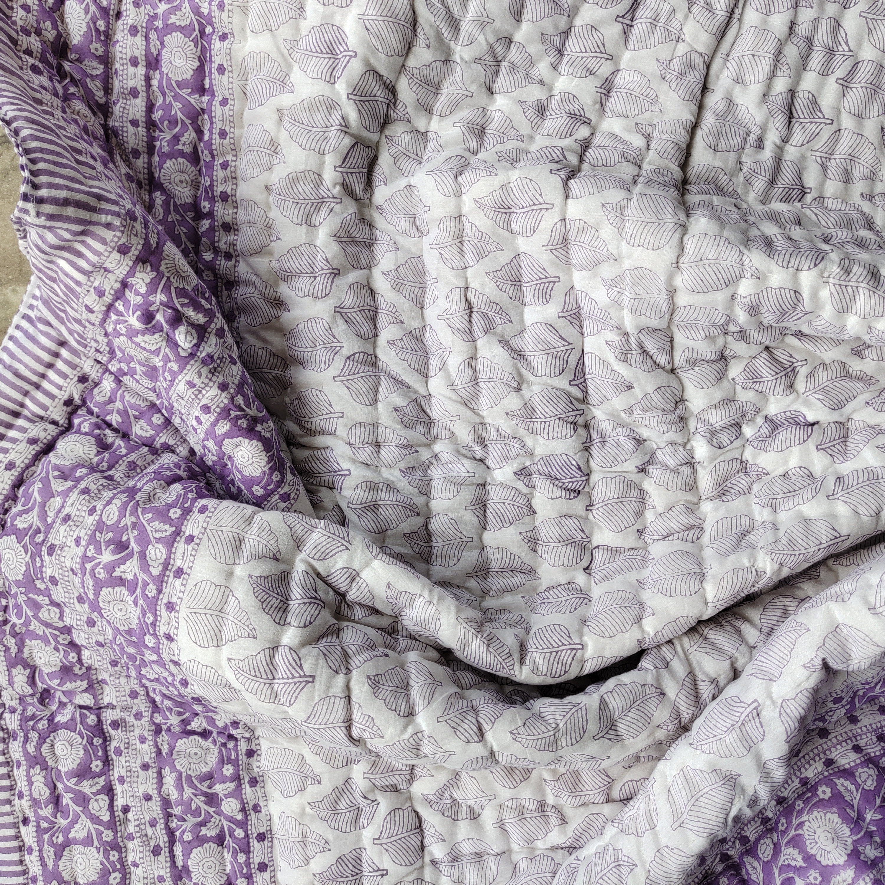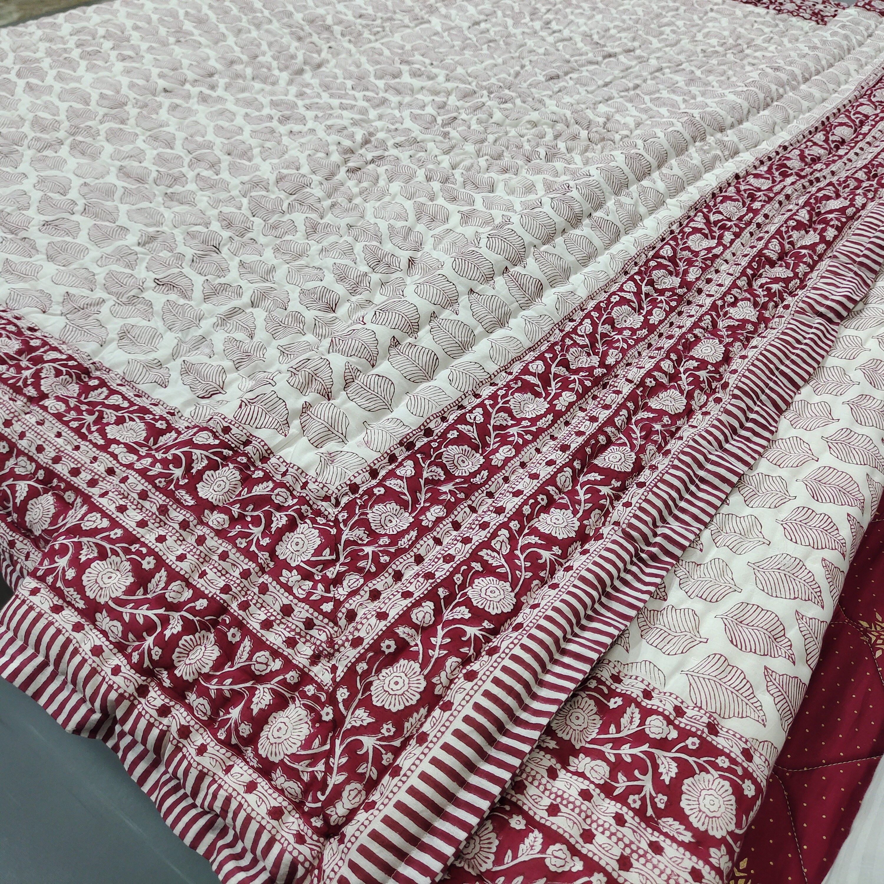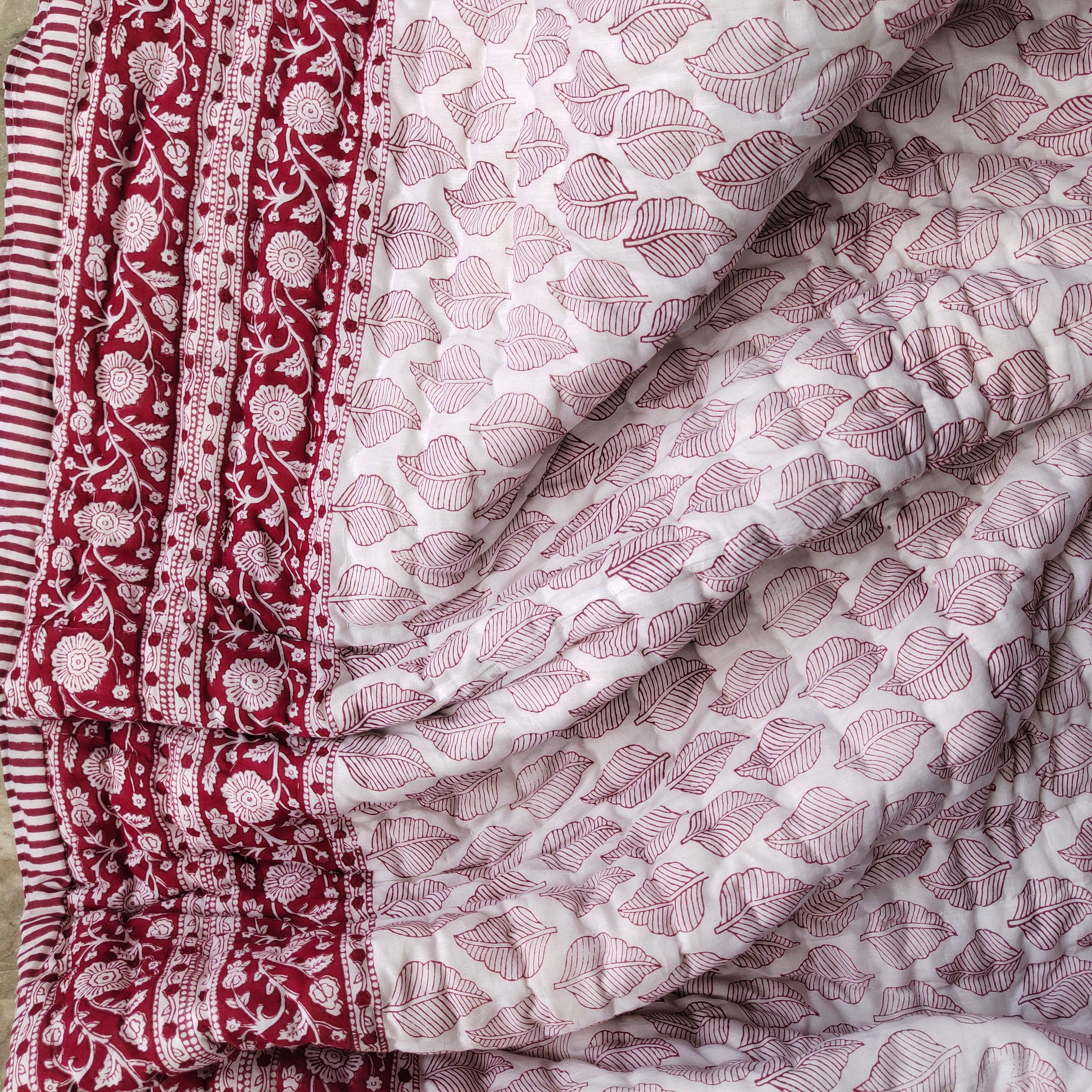 Hand Block Print Quilt: Leaves Pattern, Reversible Boho Blanket