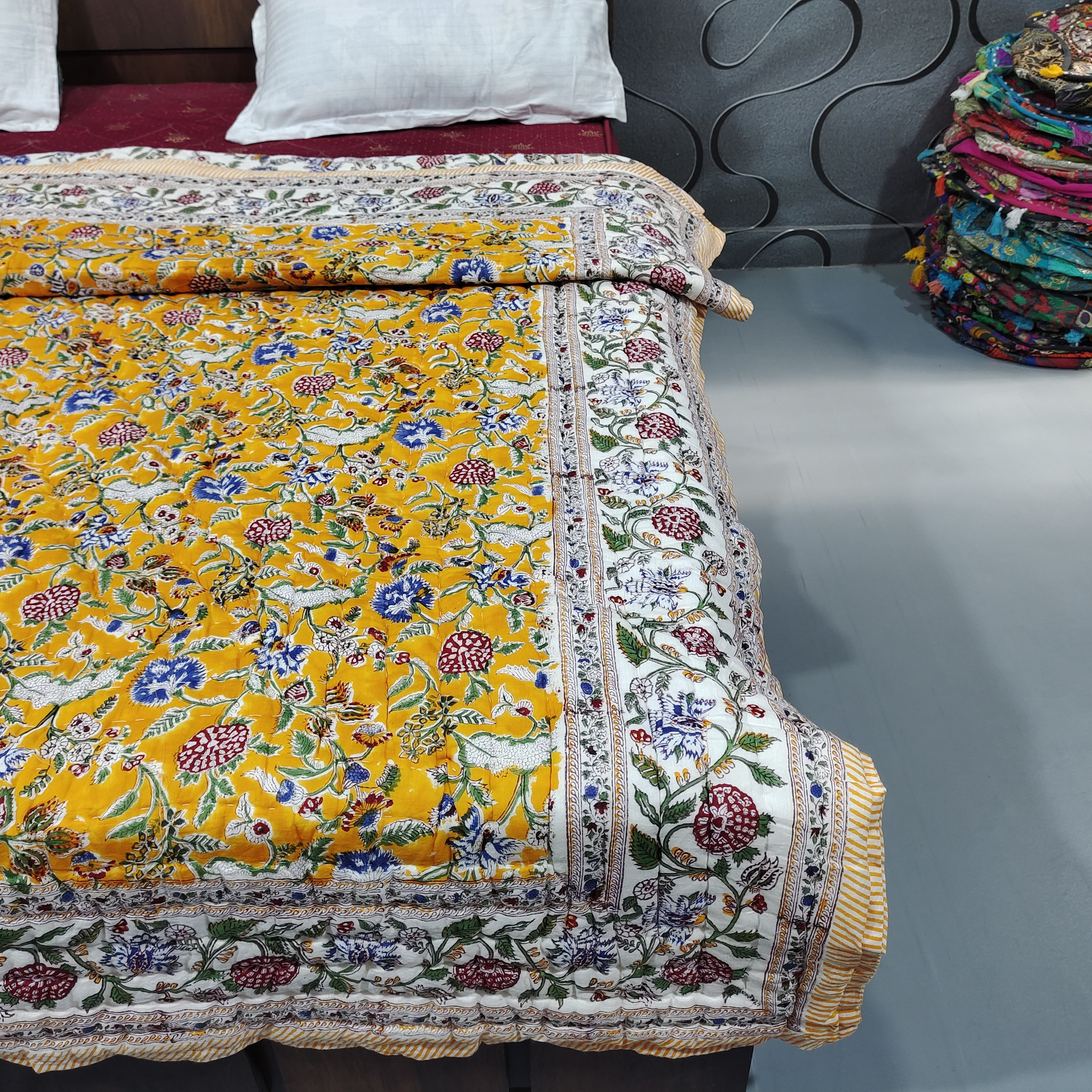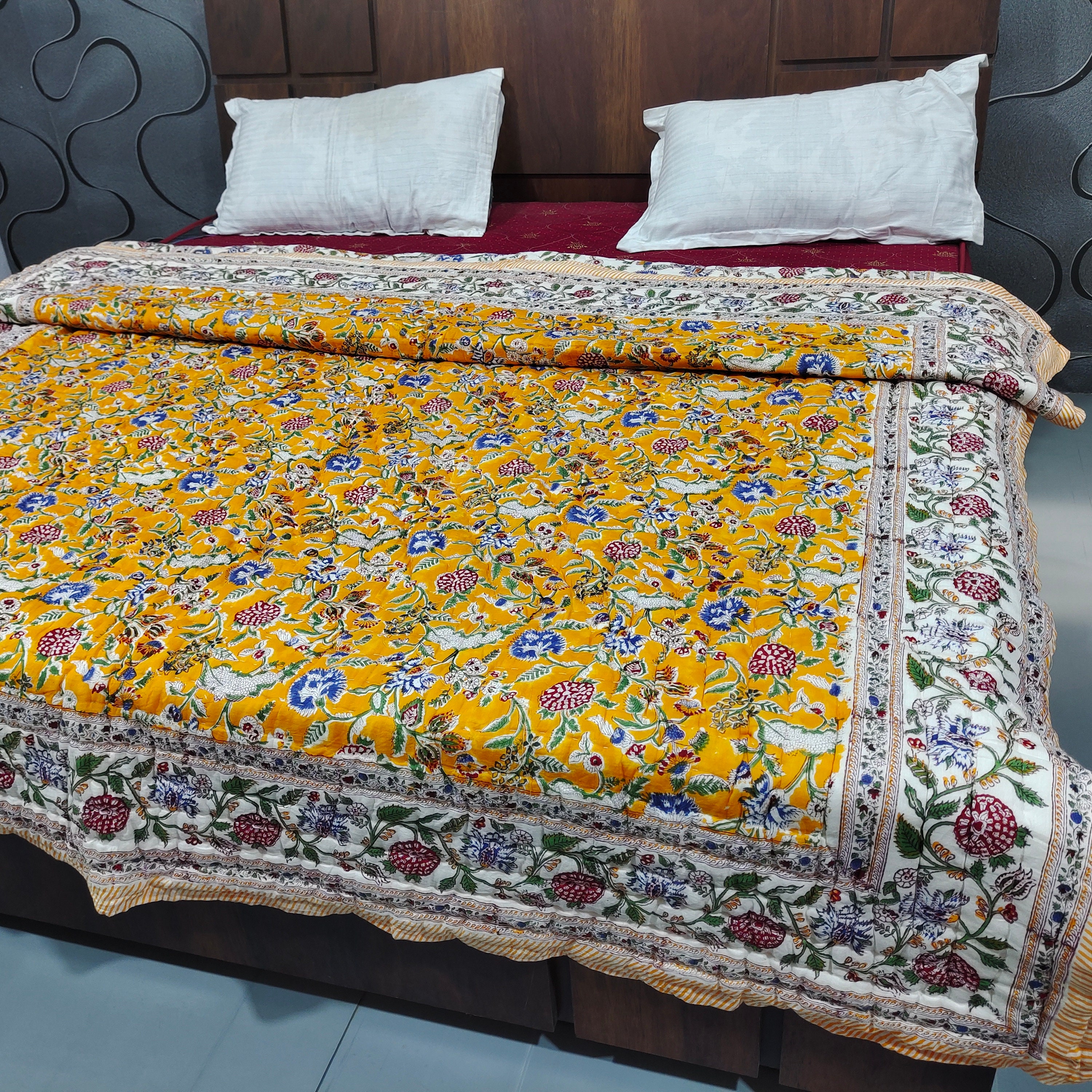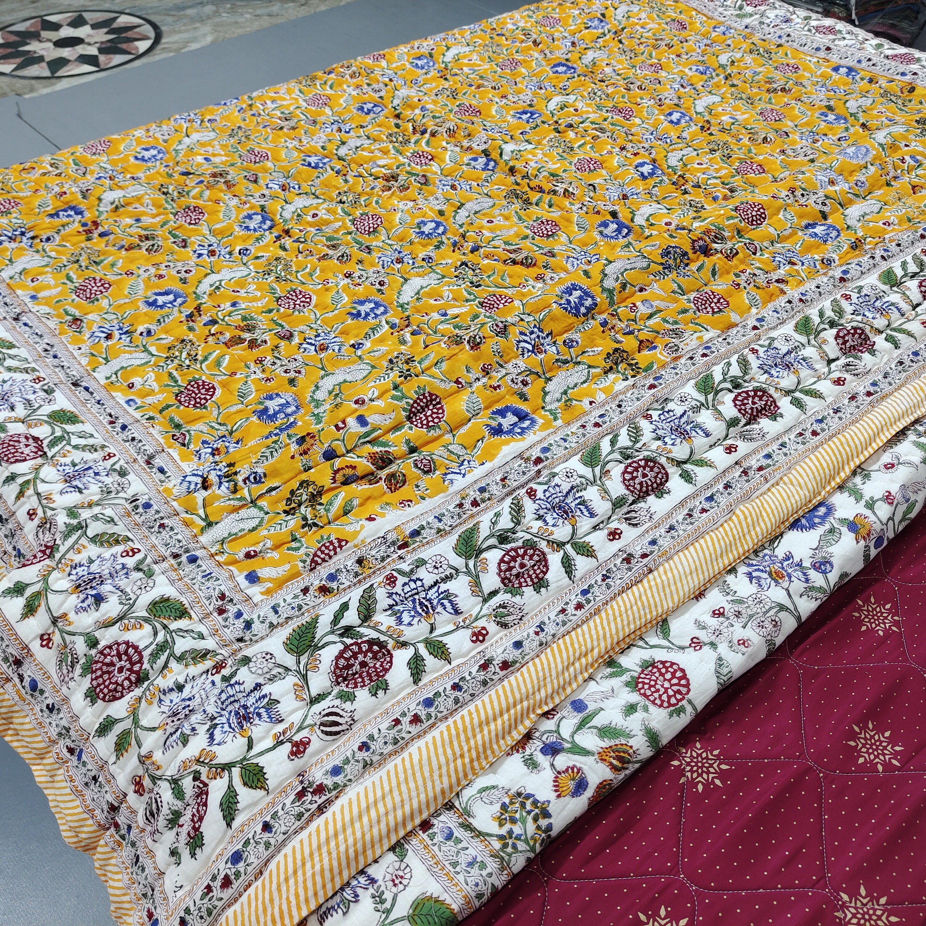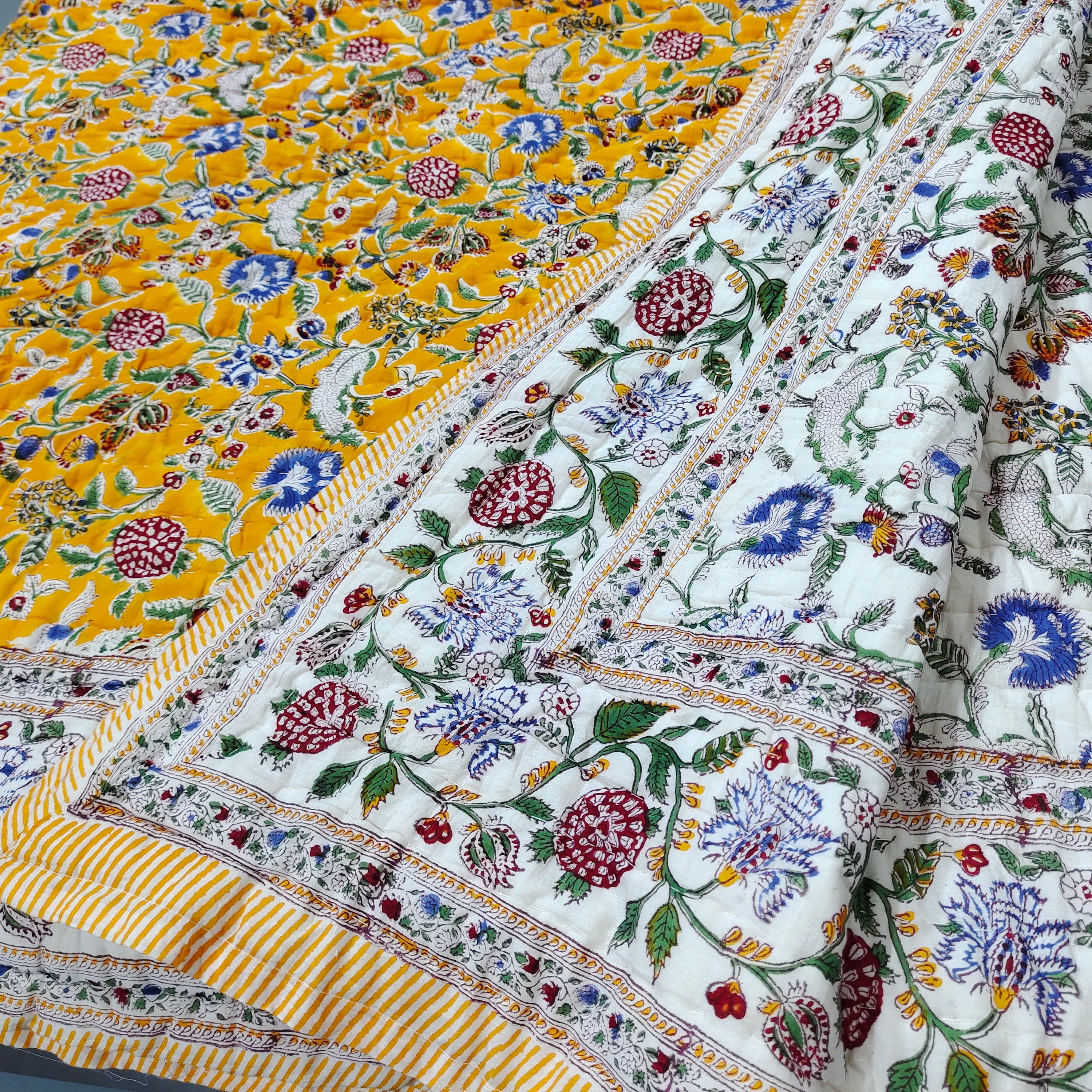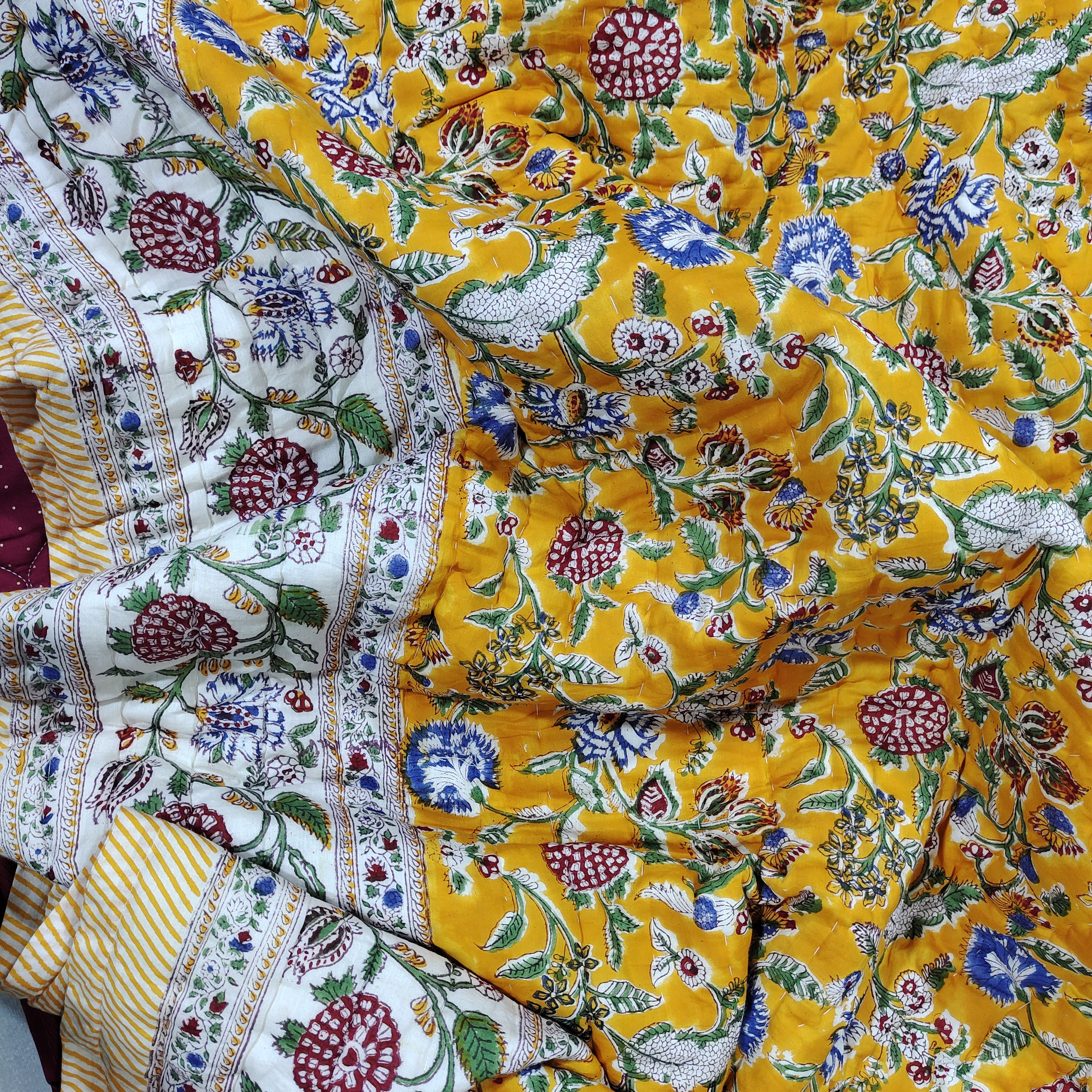 Hand Block Print Queen Quilt, Yellow Floral, Reversible Boho Comforter for Bed Decor