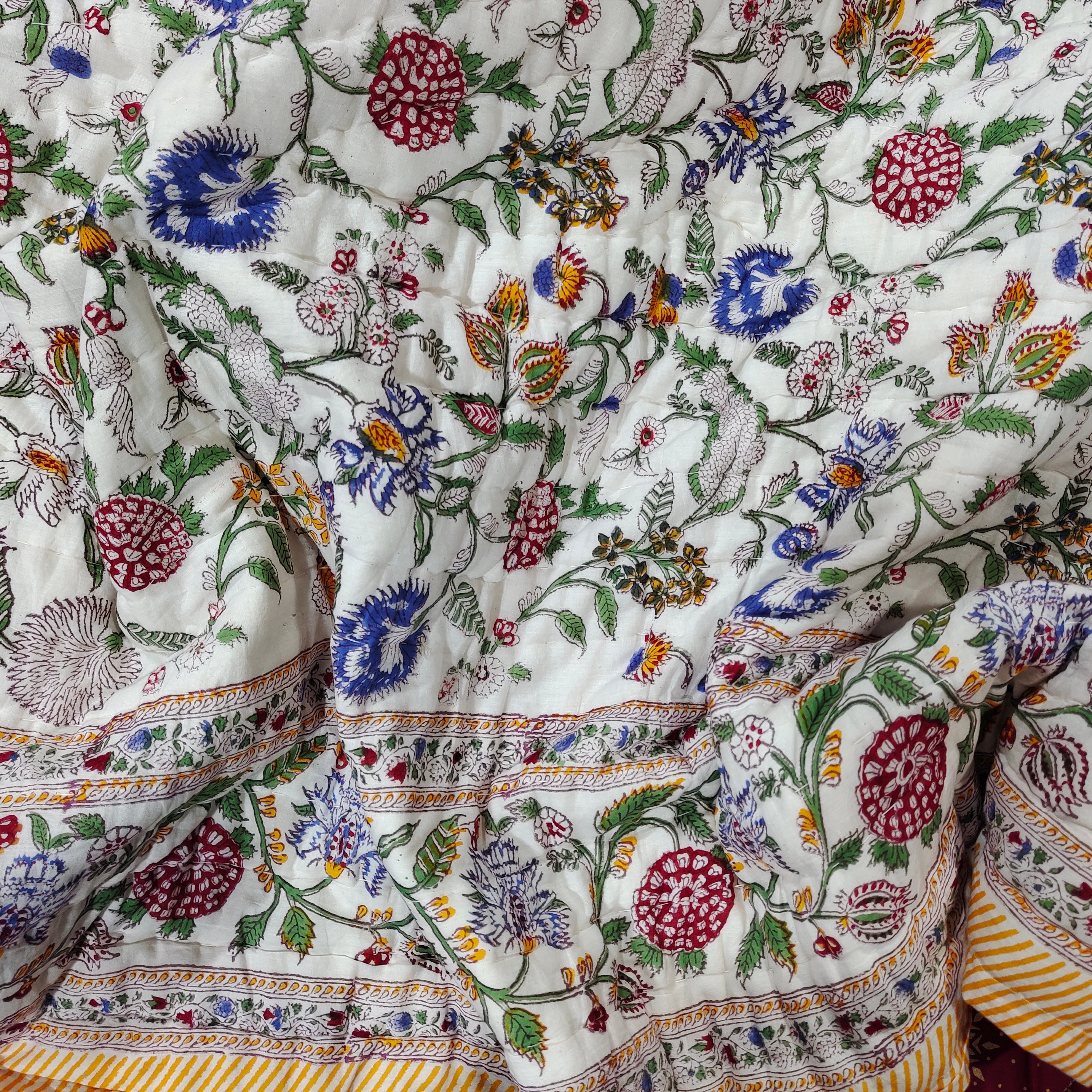 Indulge in the artistry of traditional craftsmanship with our exquisite Hand Stitched Hand Block Print Quilt. Each quilt is a masterpiece of skill and creativity, meticulously crafted by skilled artisans in Jaipur, India. From the intricate hand block printing to the careful stitching, every step in the process is a labor of love, resulting in a quilt that's as beautiful as it is functional.