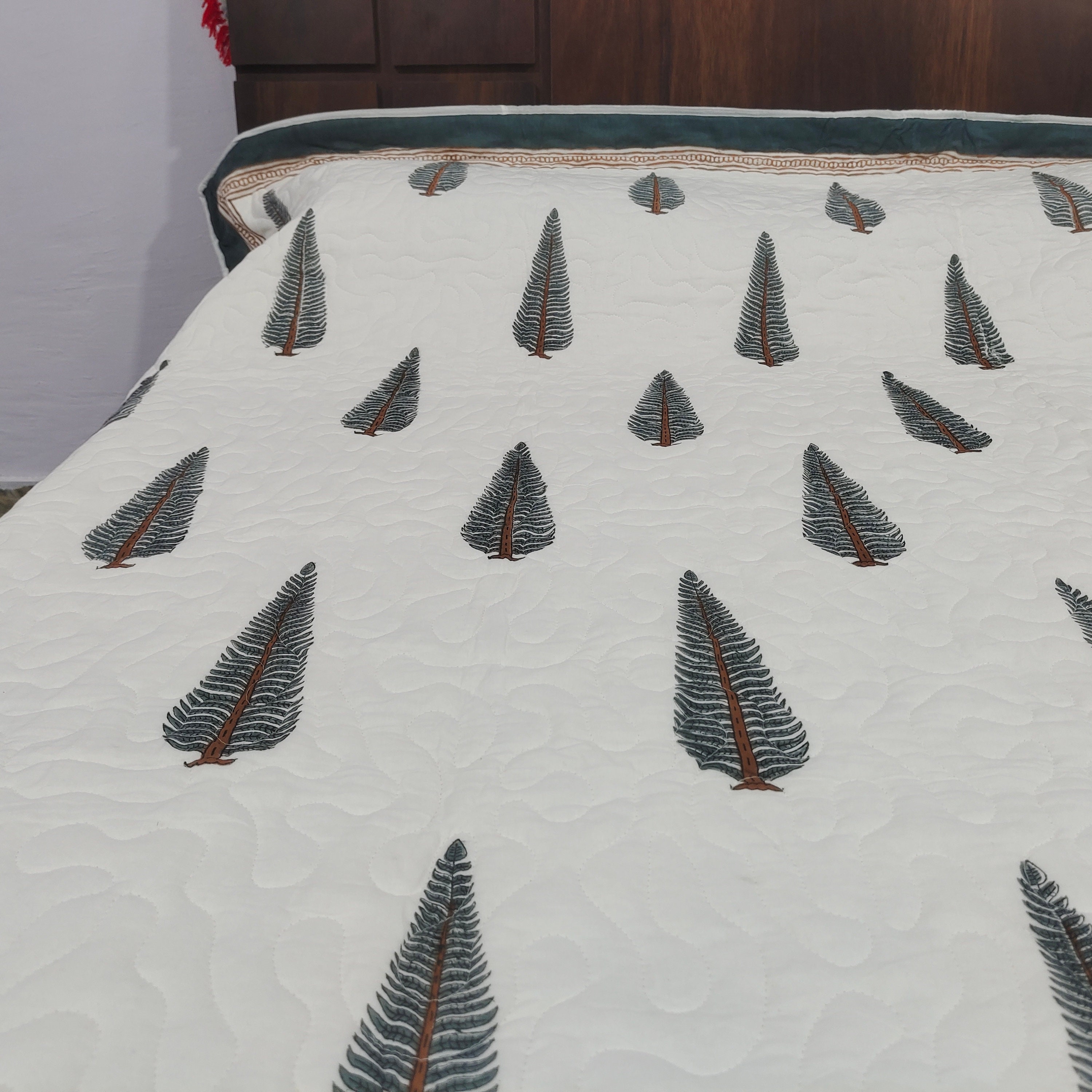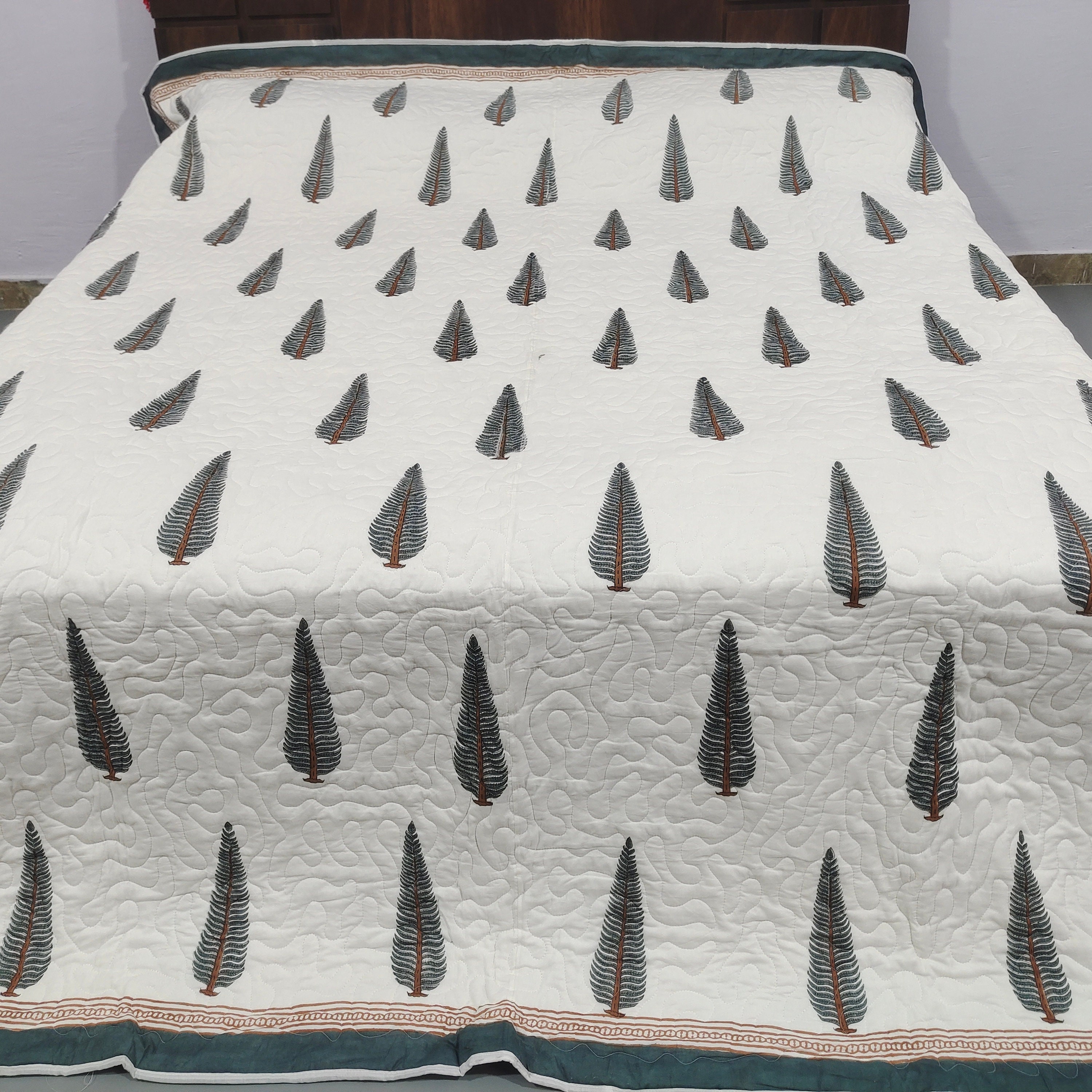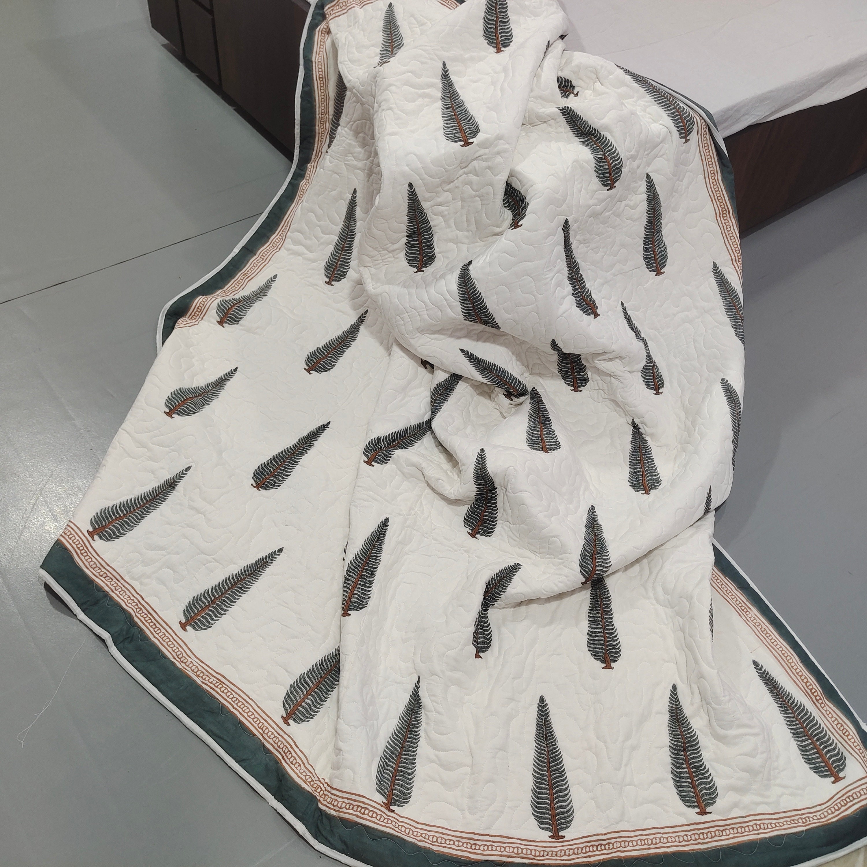 Leaf Hand Block Print Cotton Quilt, Reversible Boho Bed Cover
