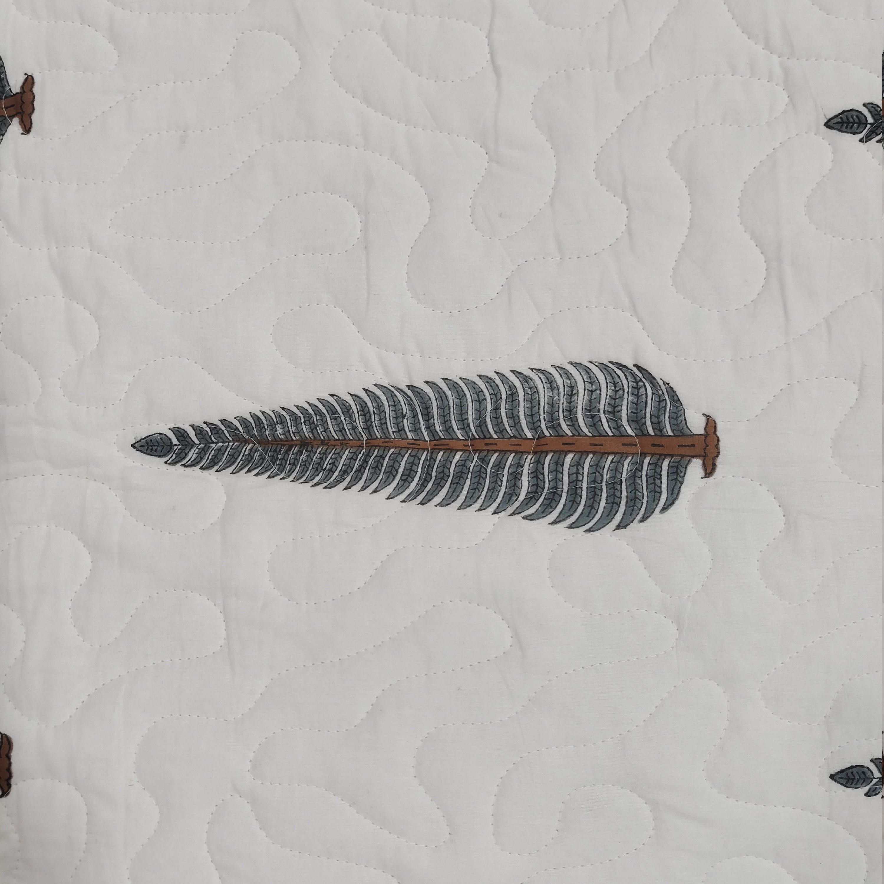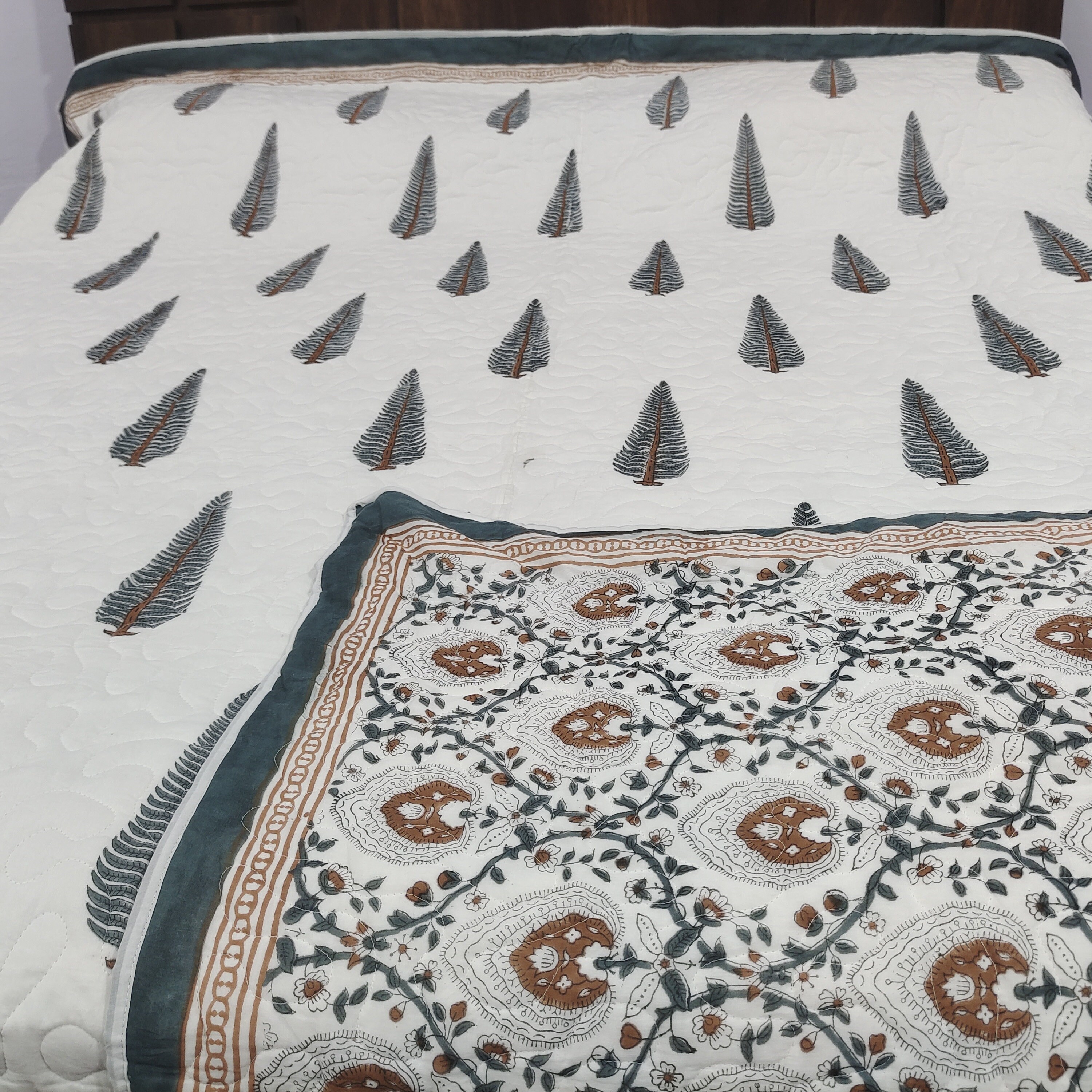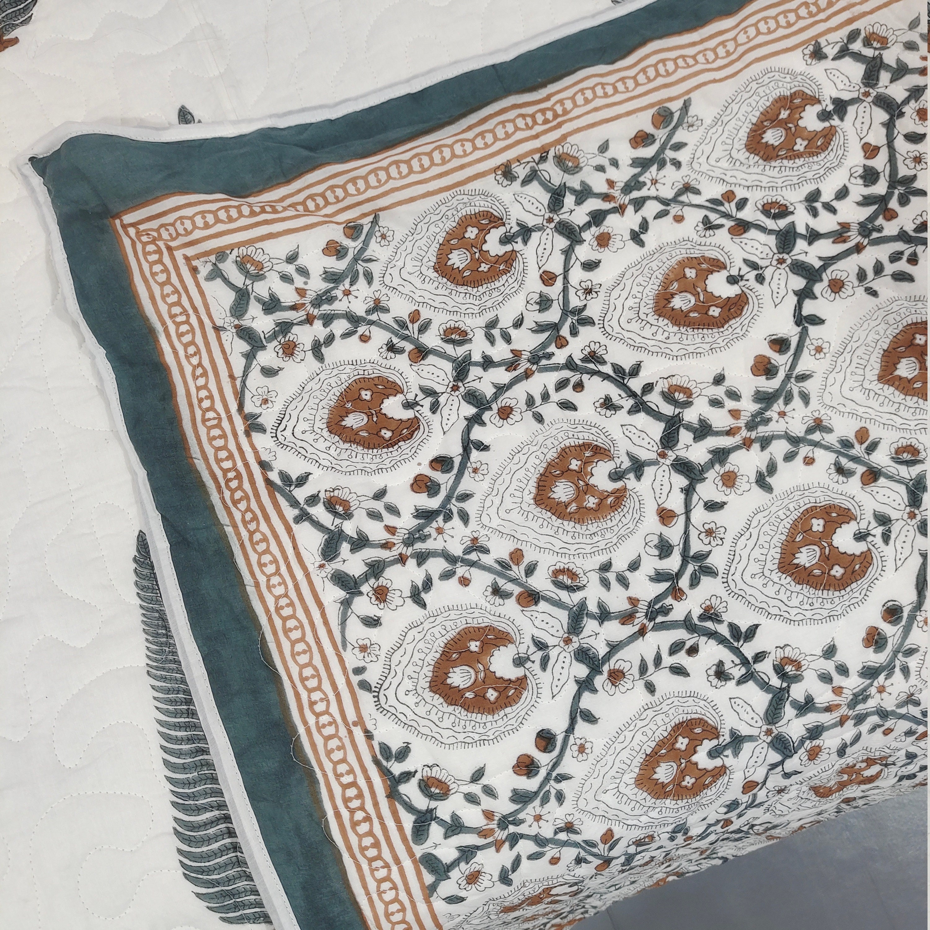Leaf Hand Block Print Cotton Quilt, Reversible Boho Bed Cover