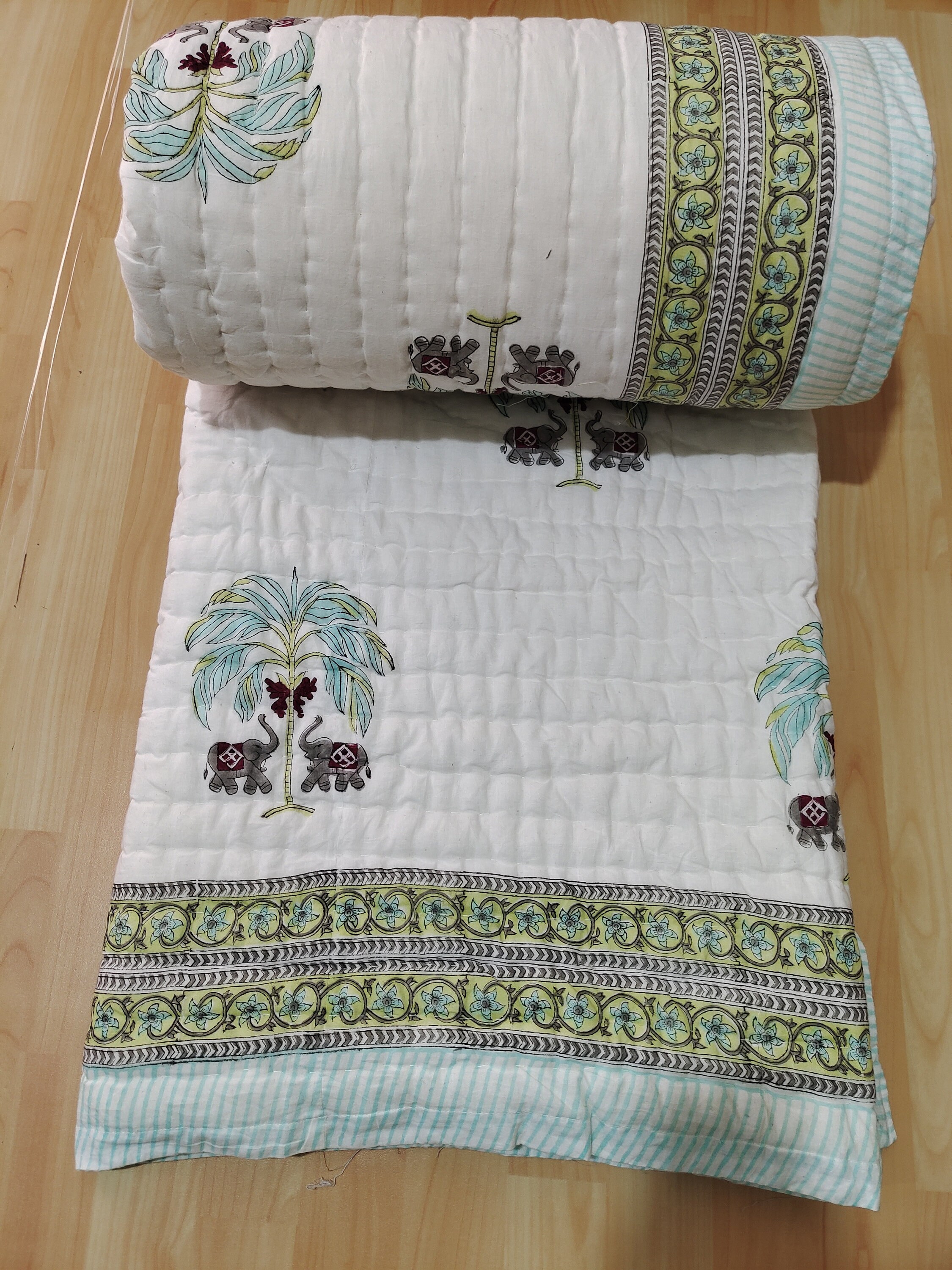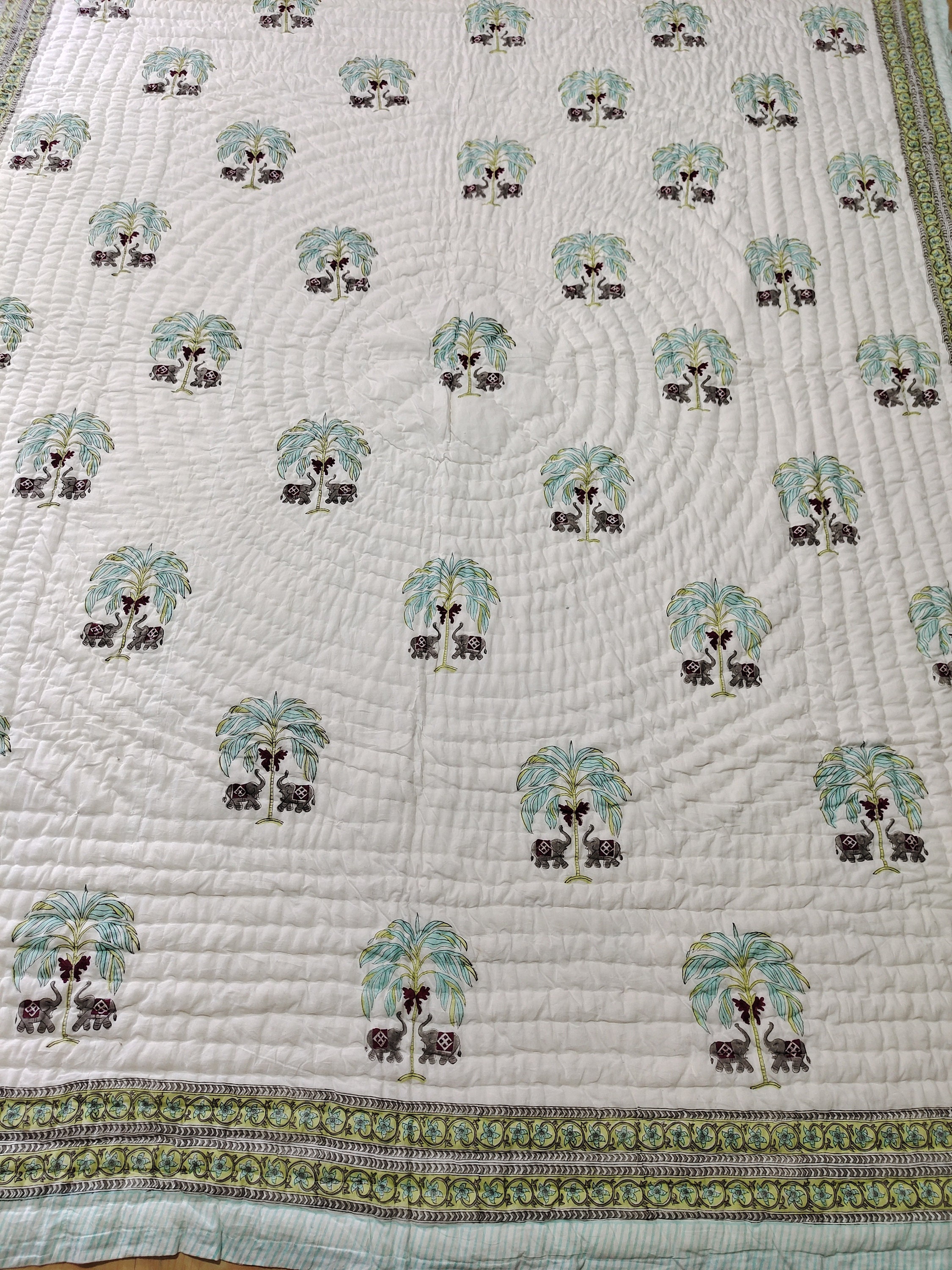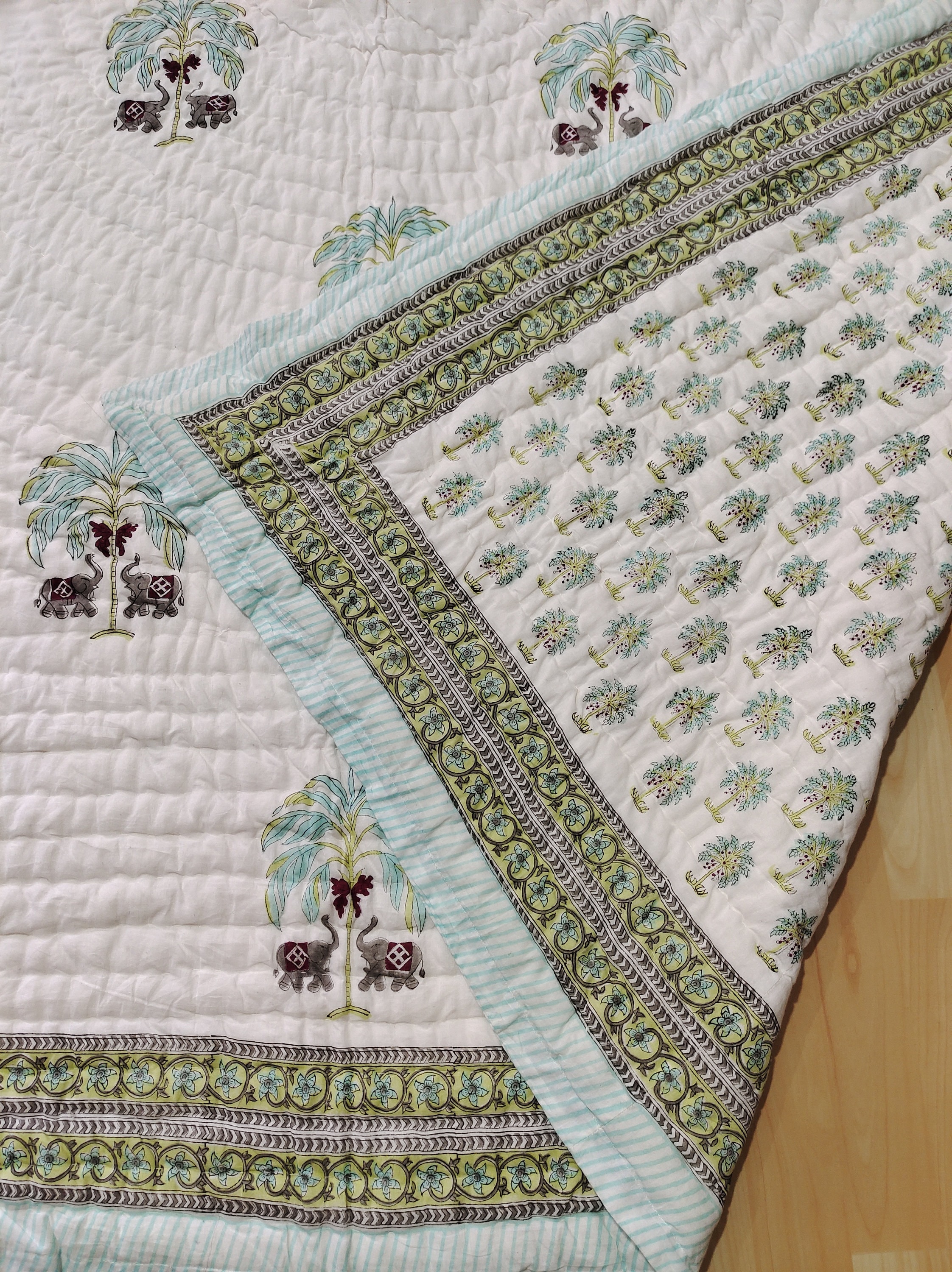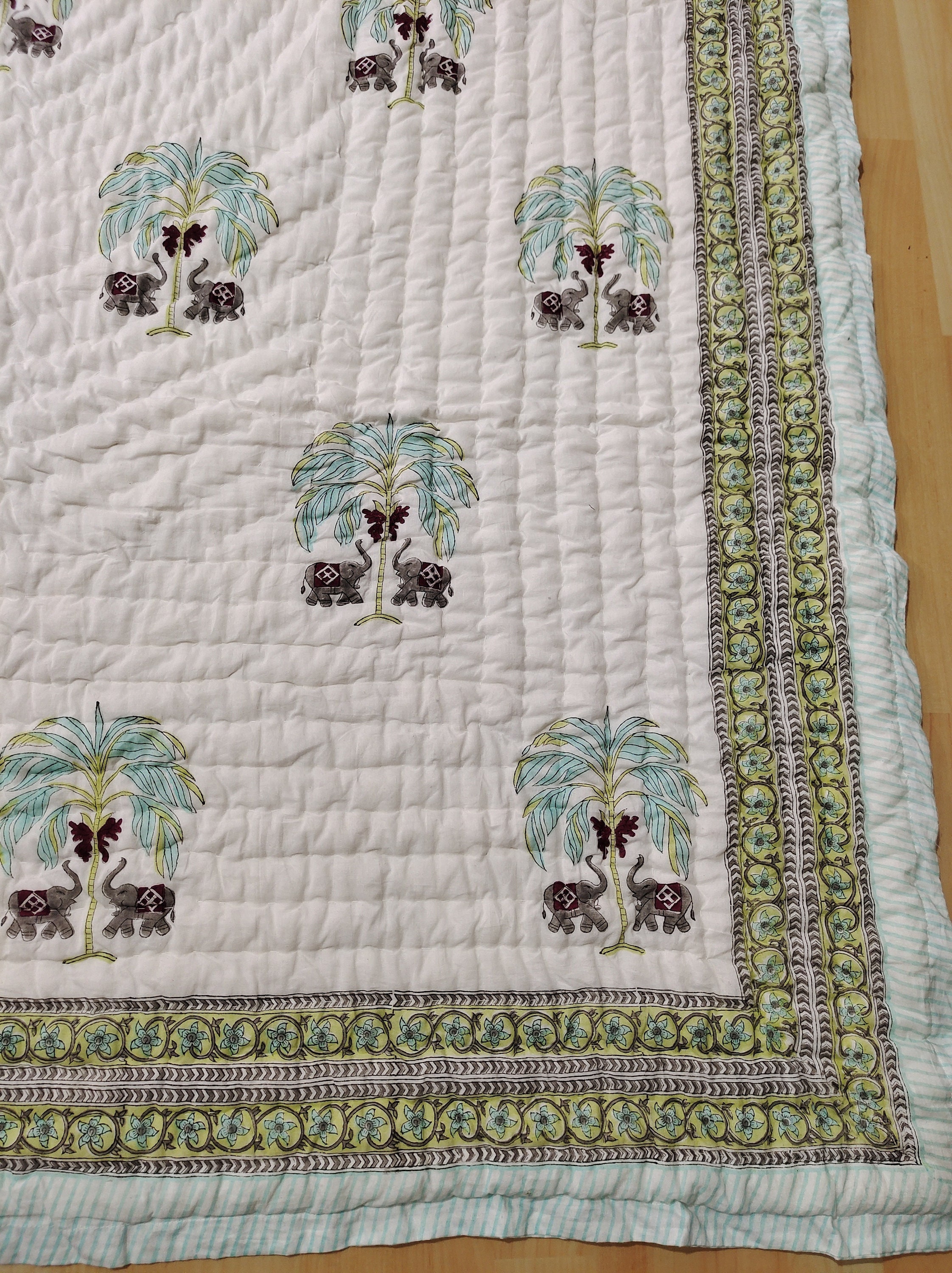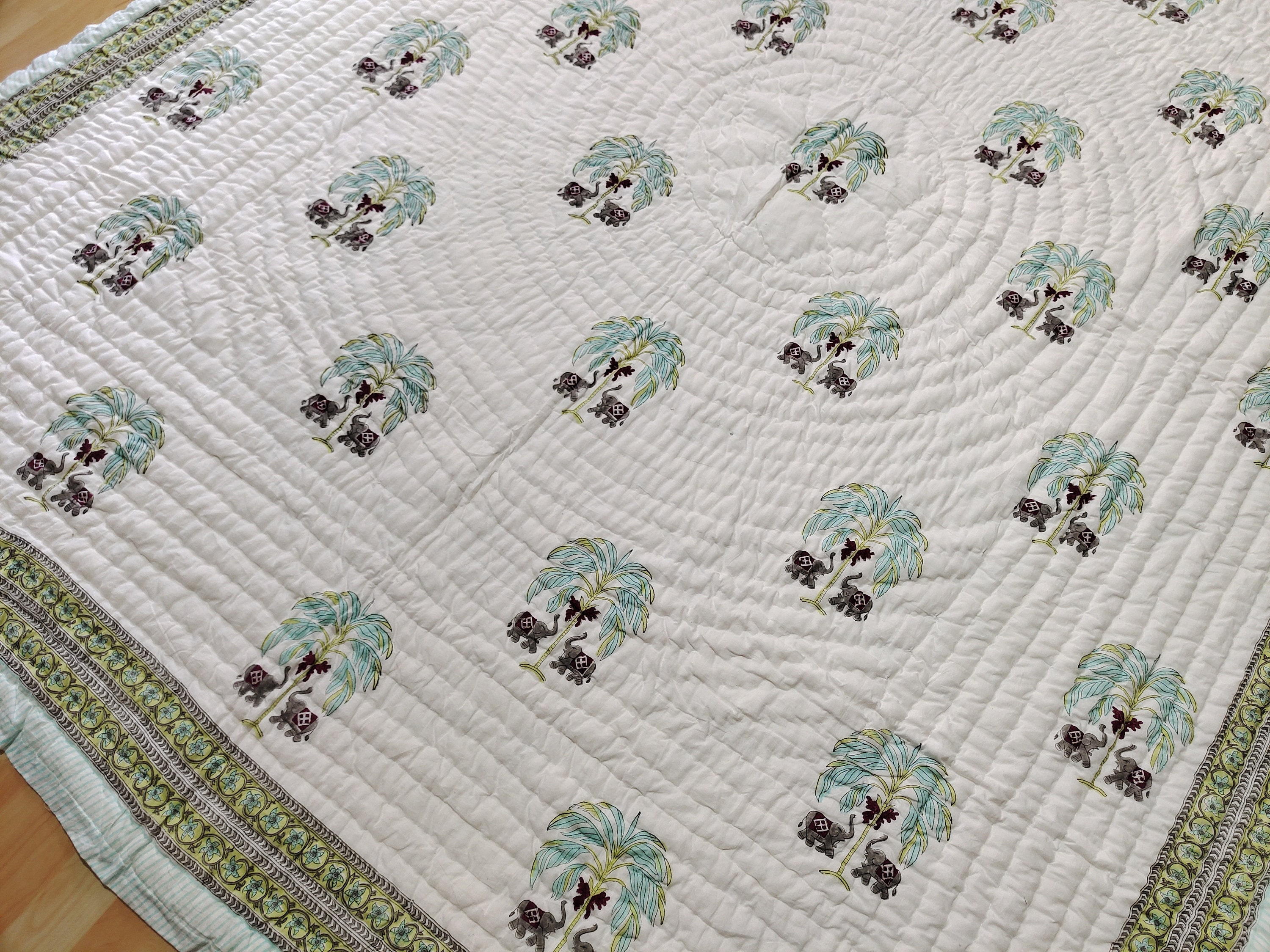 Elephant Tree Quilt: Hand Block Print Cotton Comforter, Jaipuri Design