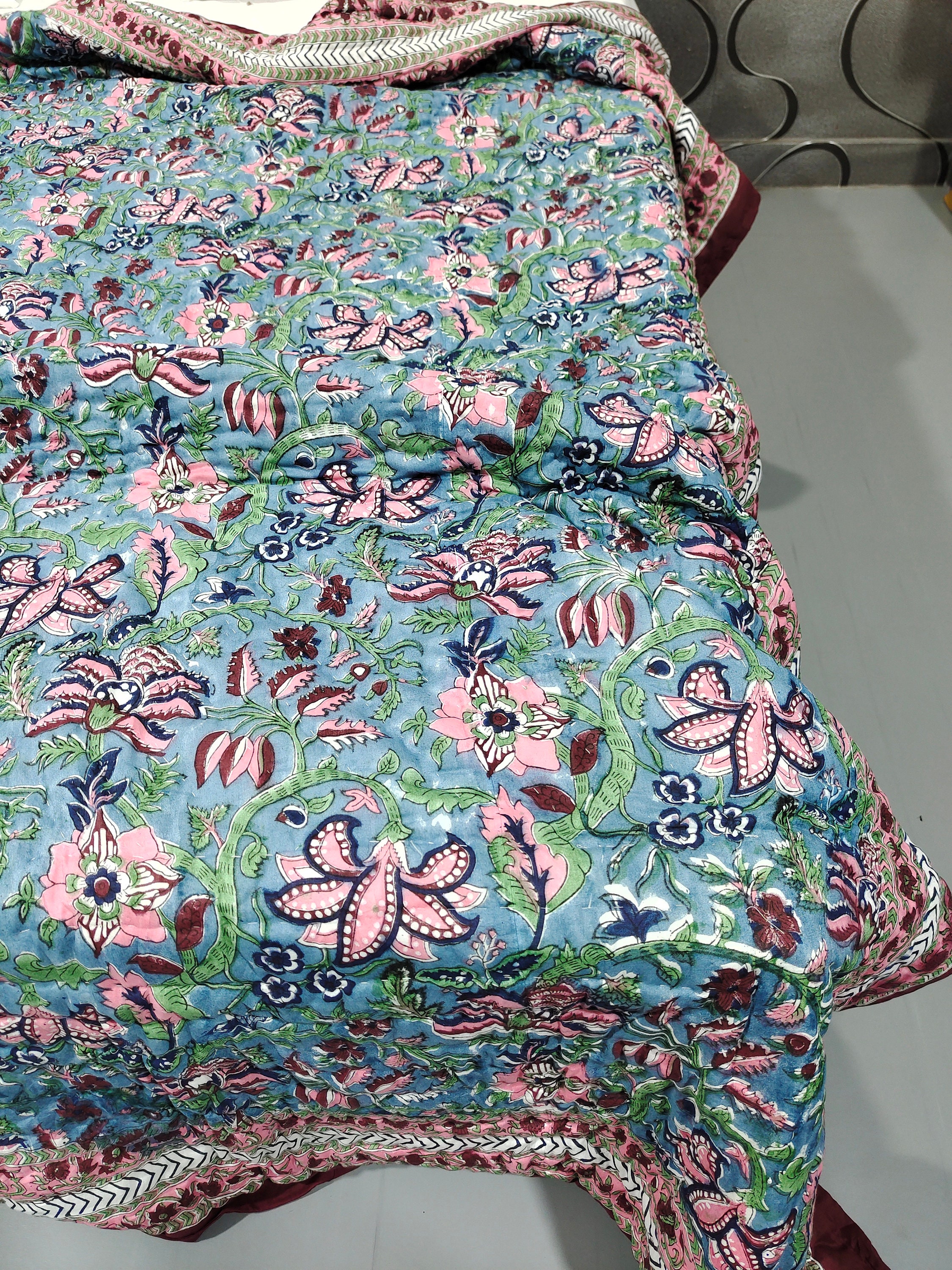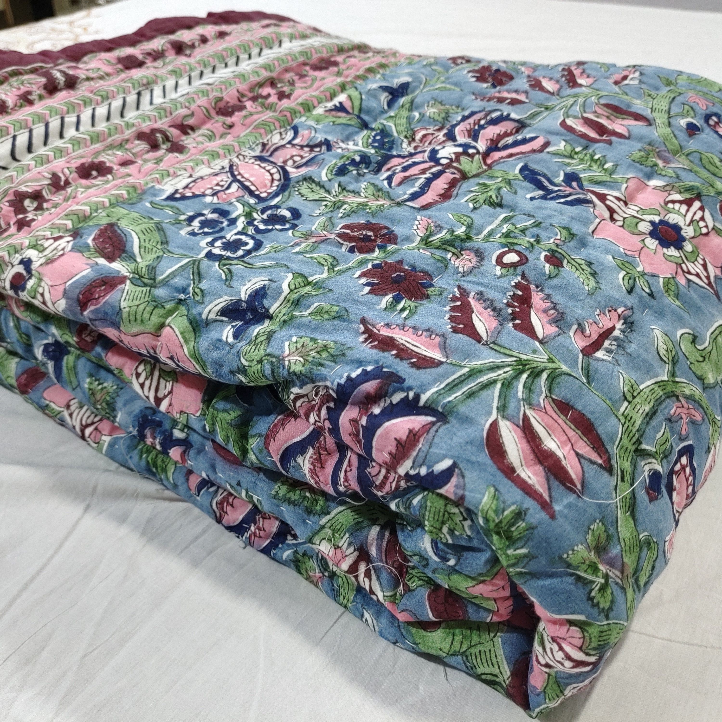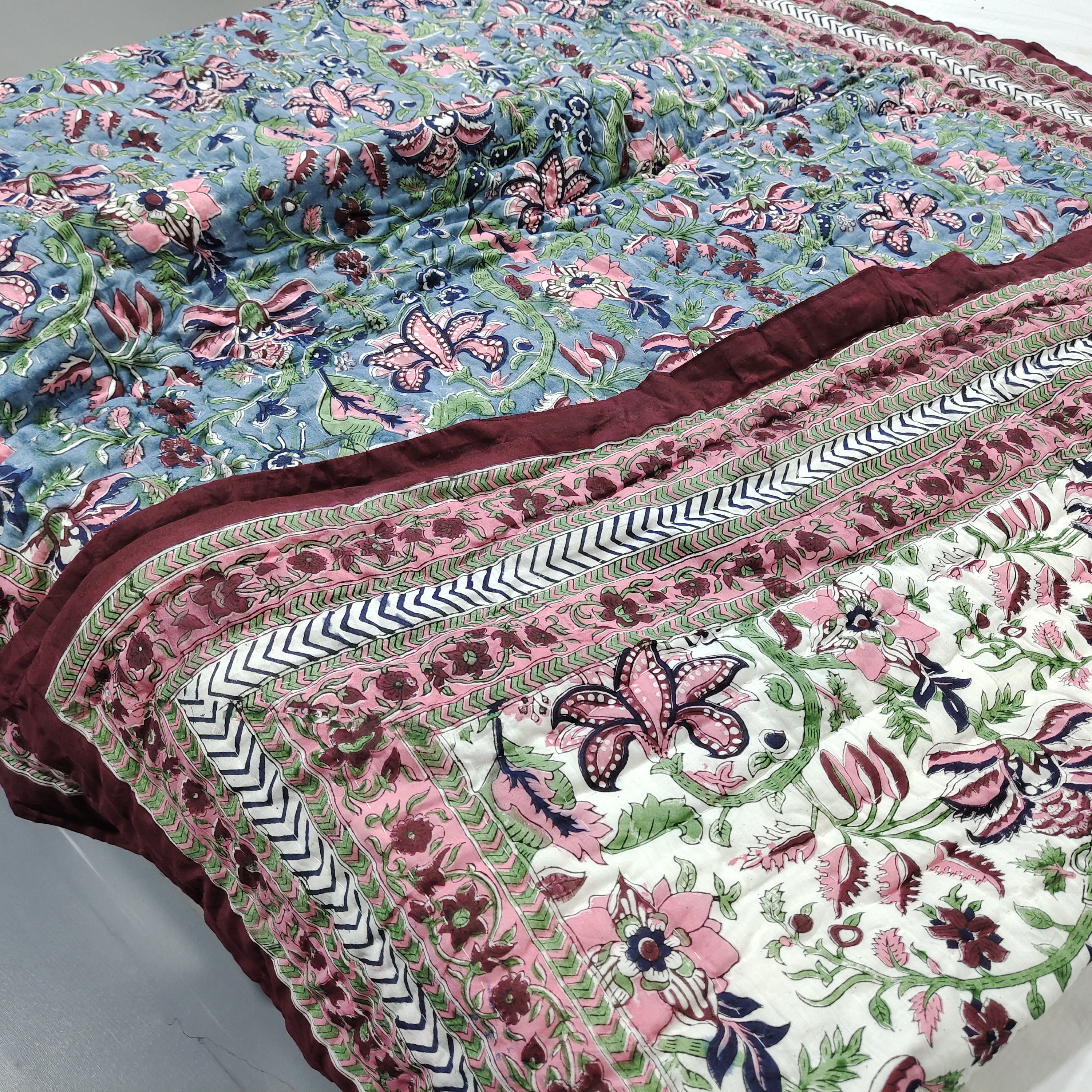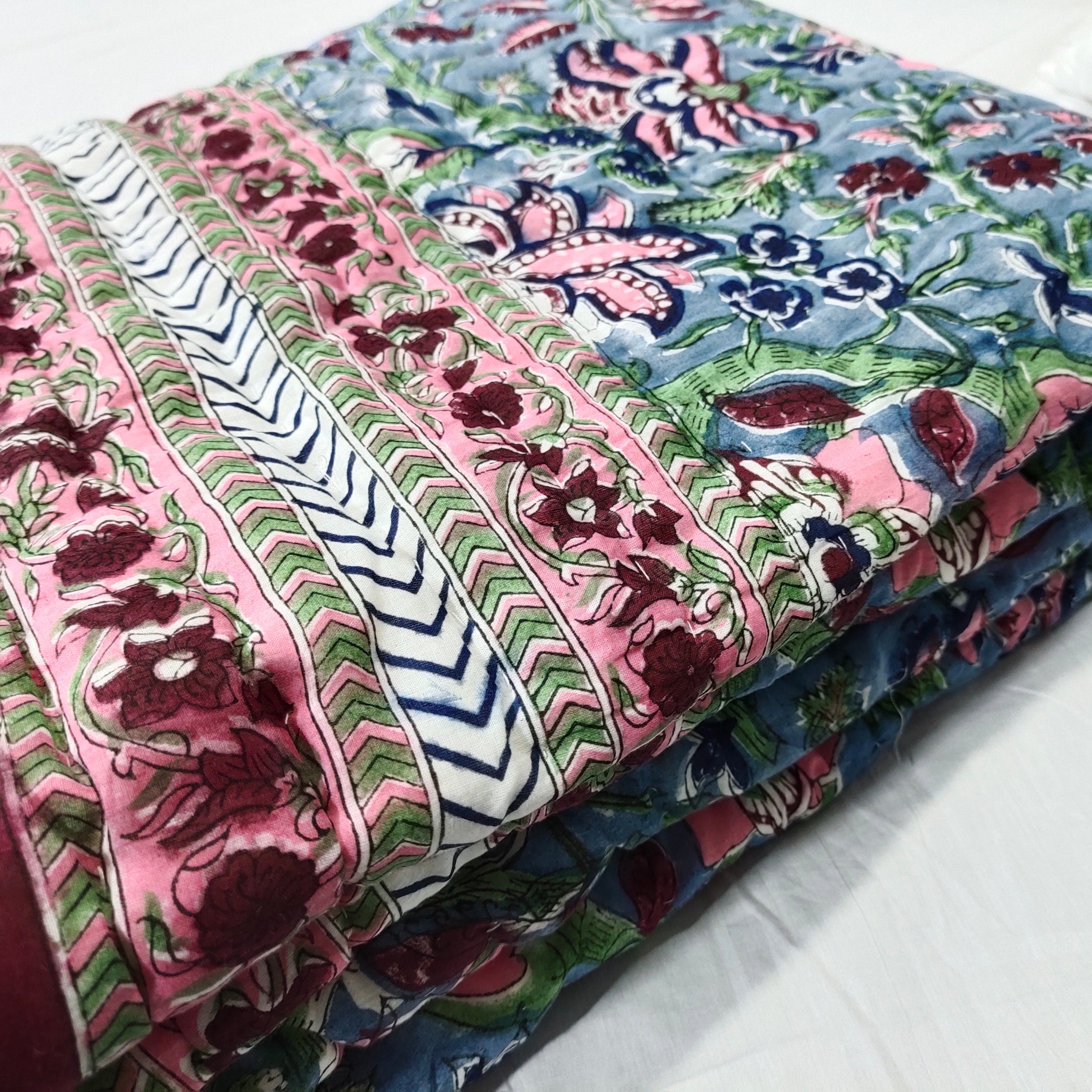 Hand Block Print Cotton Quilt: Reversible Jaipuri Queen Size