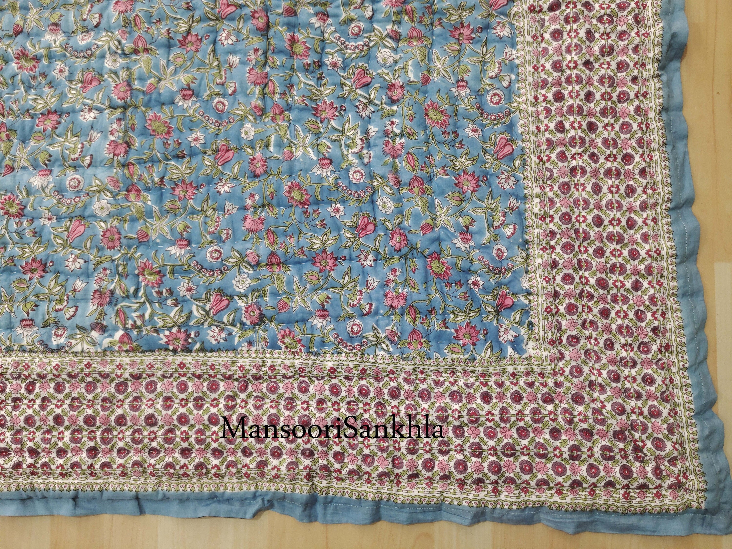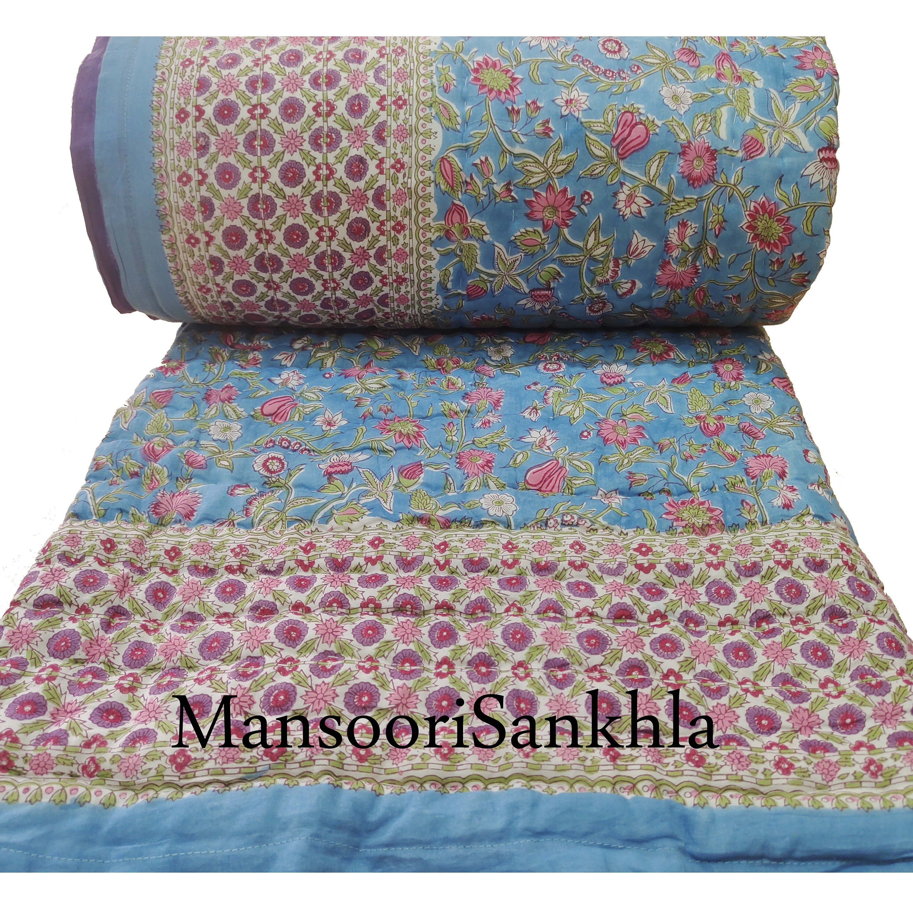 Handmade Floral Quilt: Reversible Hand Block Print Cotton Bedding