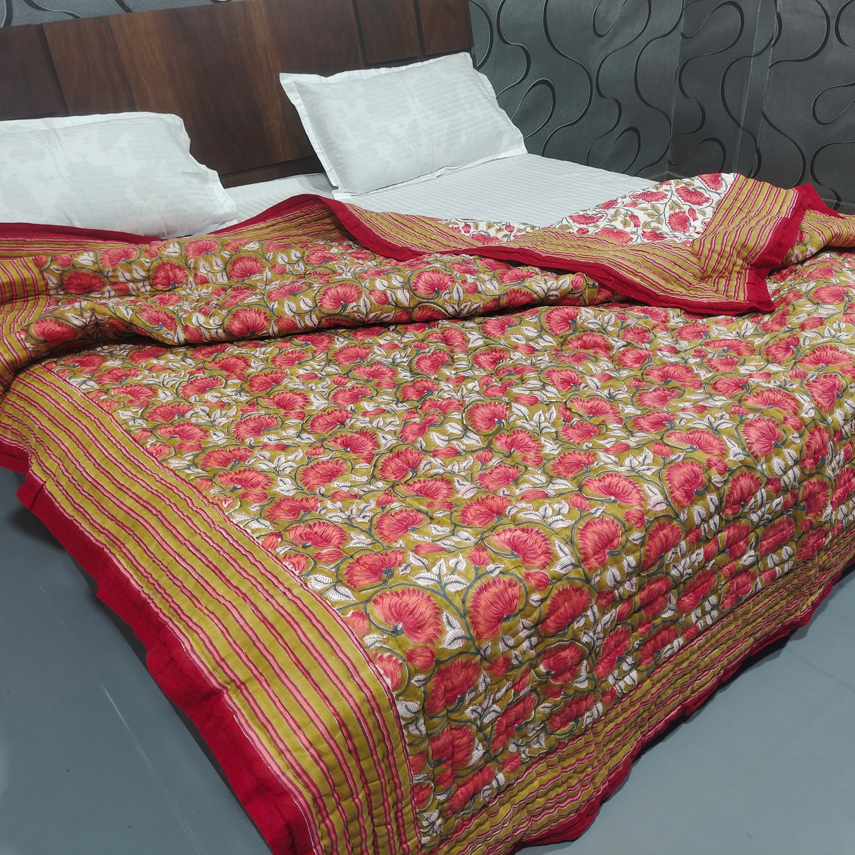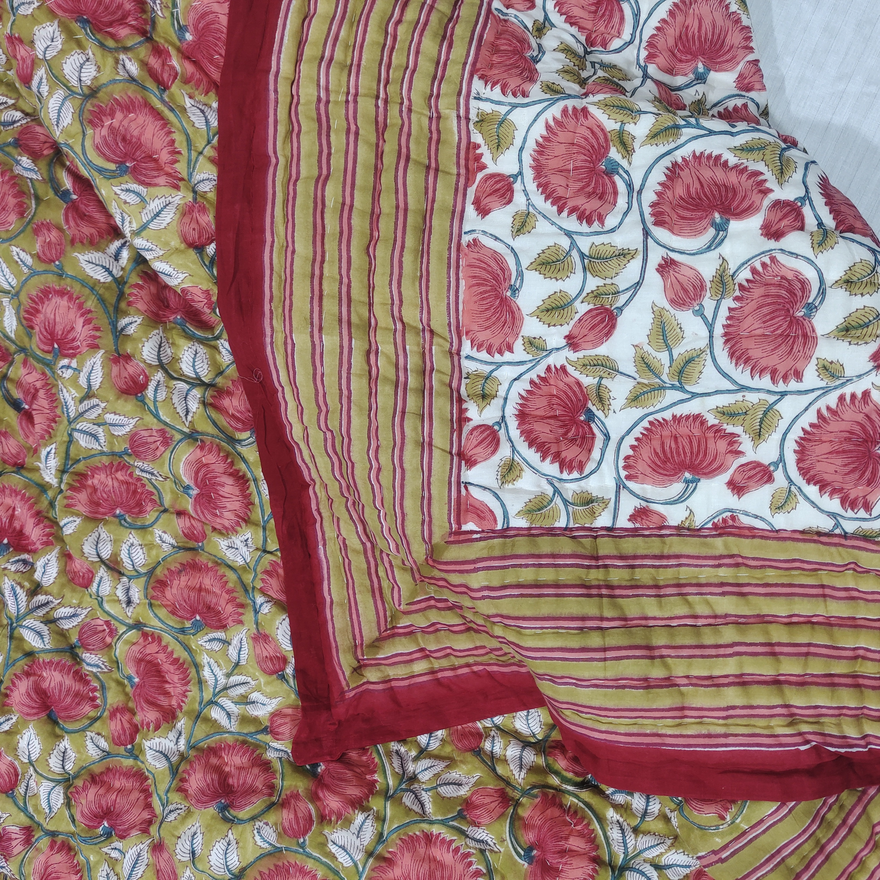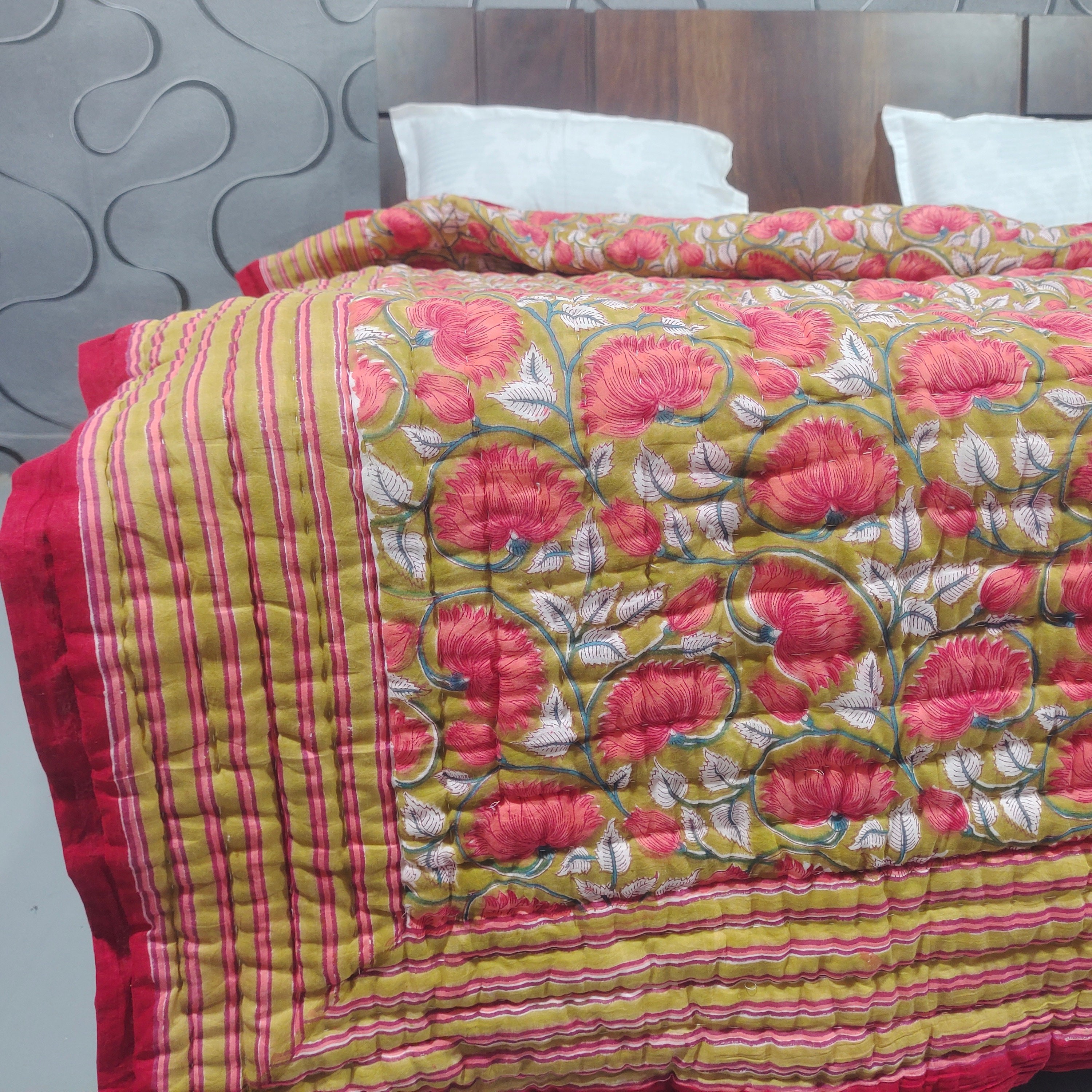 Indulge in the artistry of traditional craftsmanship with our exquisite Hand Stitched Hand Block Print Quilt. Each quilt is a masterpiece of skill and creativity, meticulously crafted by skilled artisans in Jaipur, India. From the intricate hand block printing to the careful stitching, every step in the process is a labor of love, resulting in a quilt that's as beautiful as it is functional.