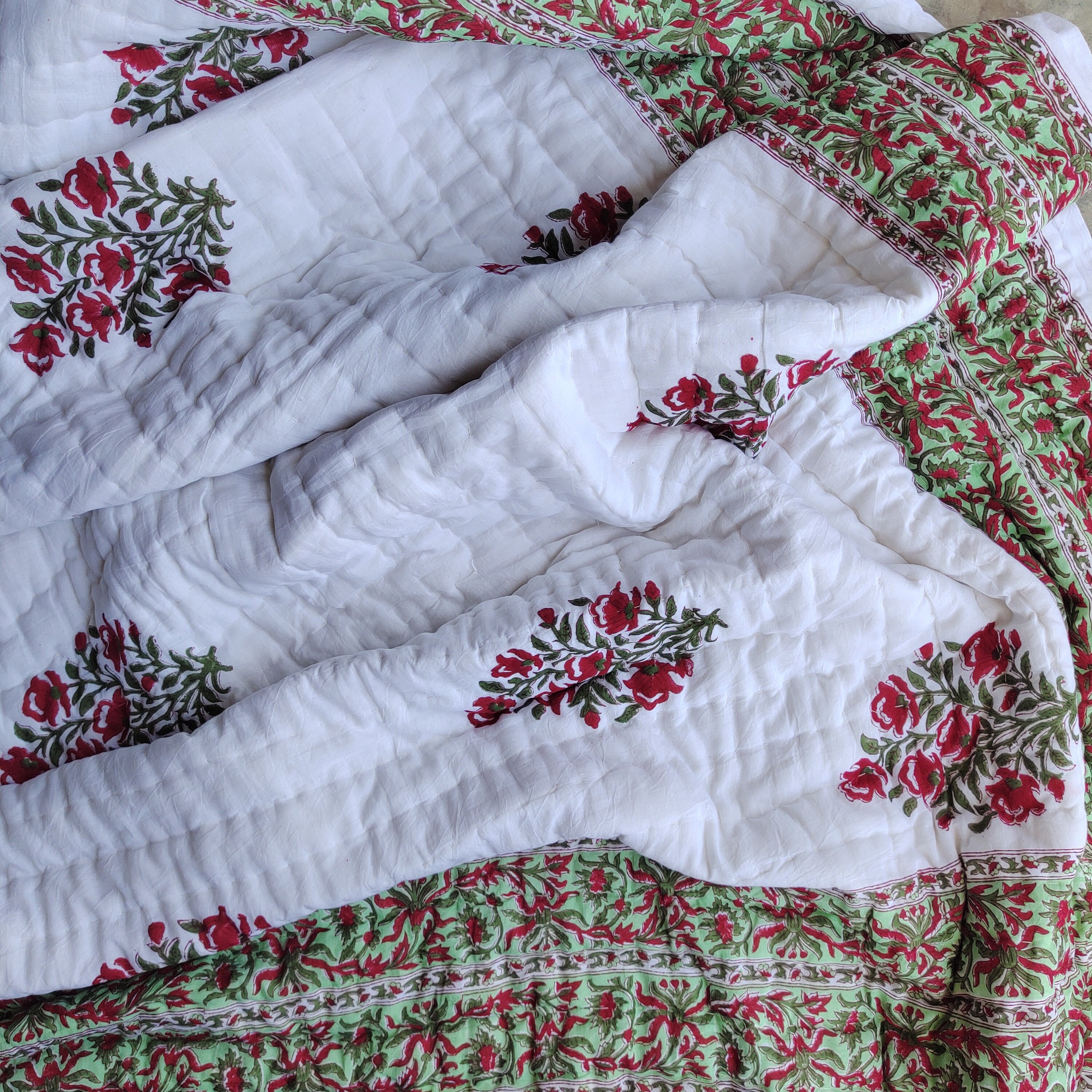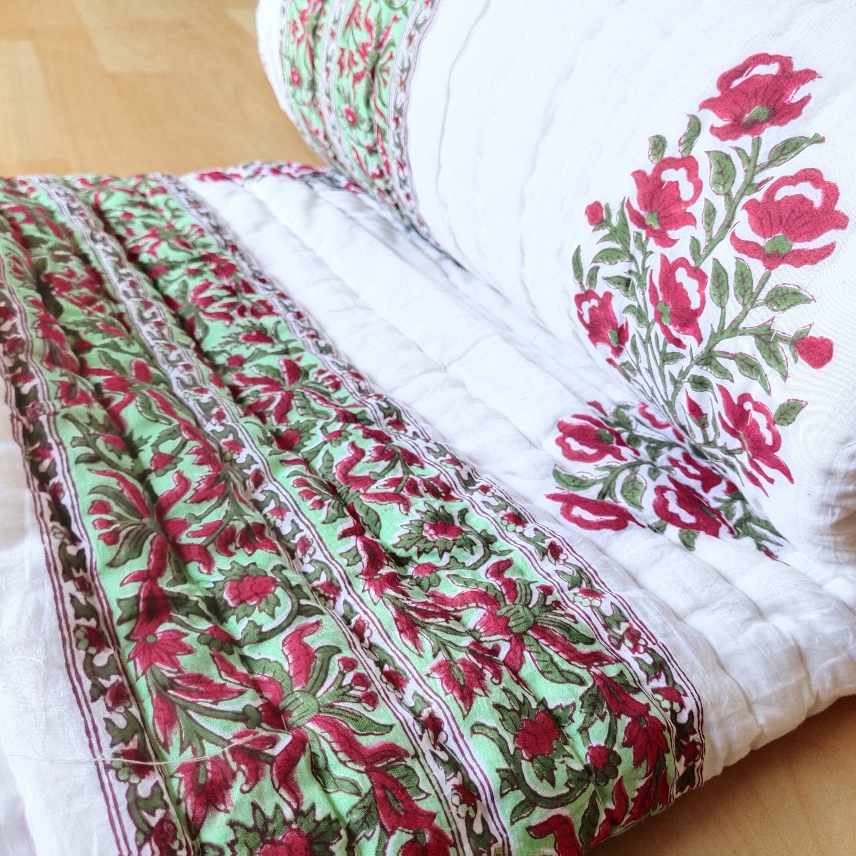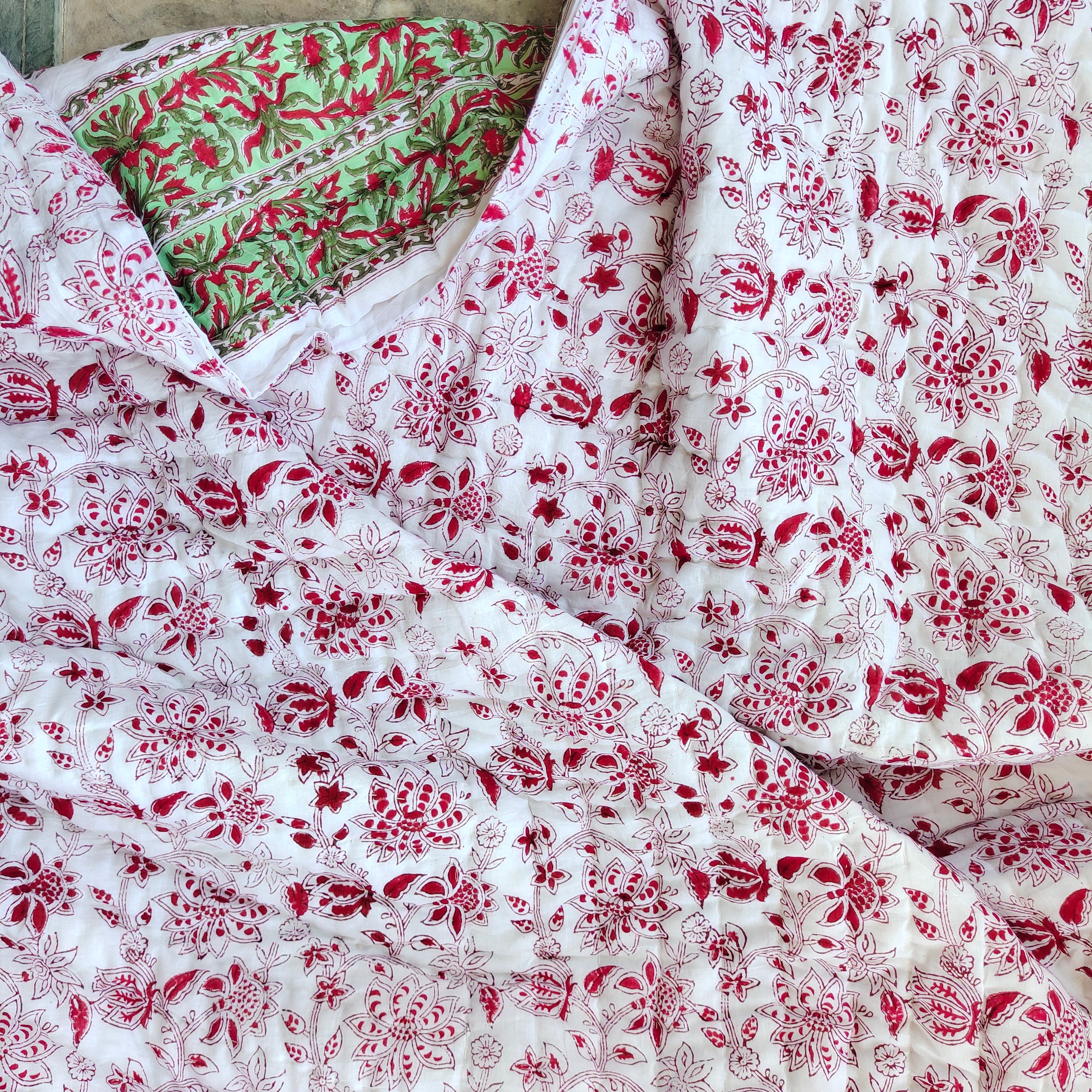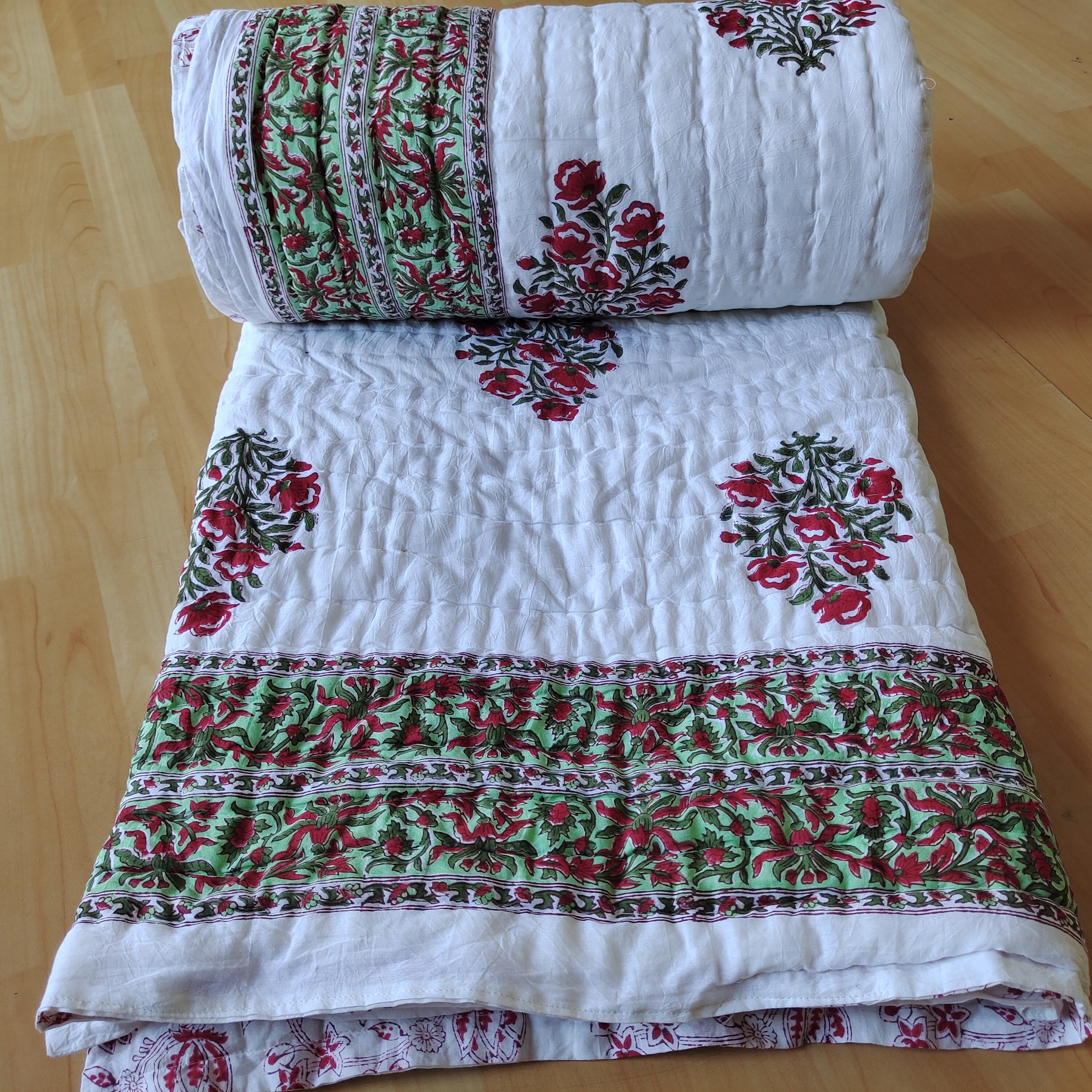 Indulge in the artistry of traditional craftsmanship with our exquisite Hand Stitched Hand Block Print Quilt. Each quilt is a masterpiece of skill and creativity, meticulously crafted by skilled artisans in Jaipur, India. From the intricate hand block printing to the careful stitching, every step in the process is a labor of love, resulting in a quilt that's as beautiful as it is functional.