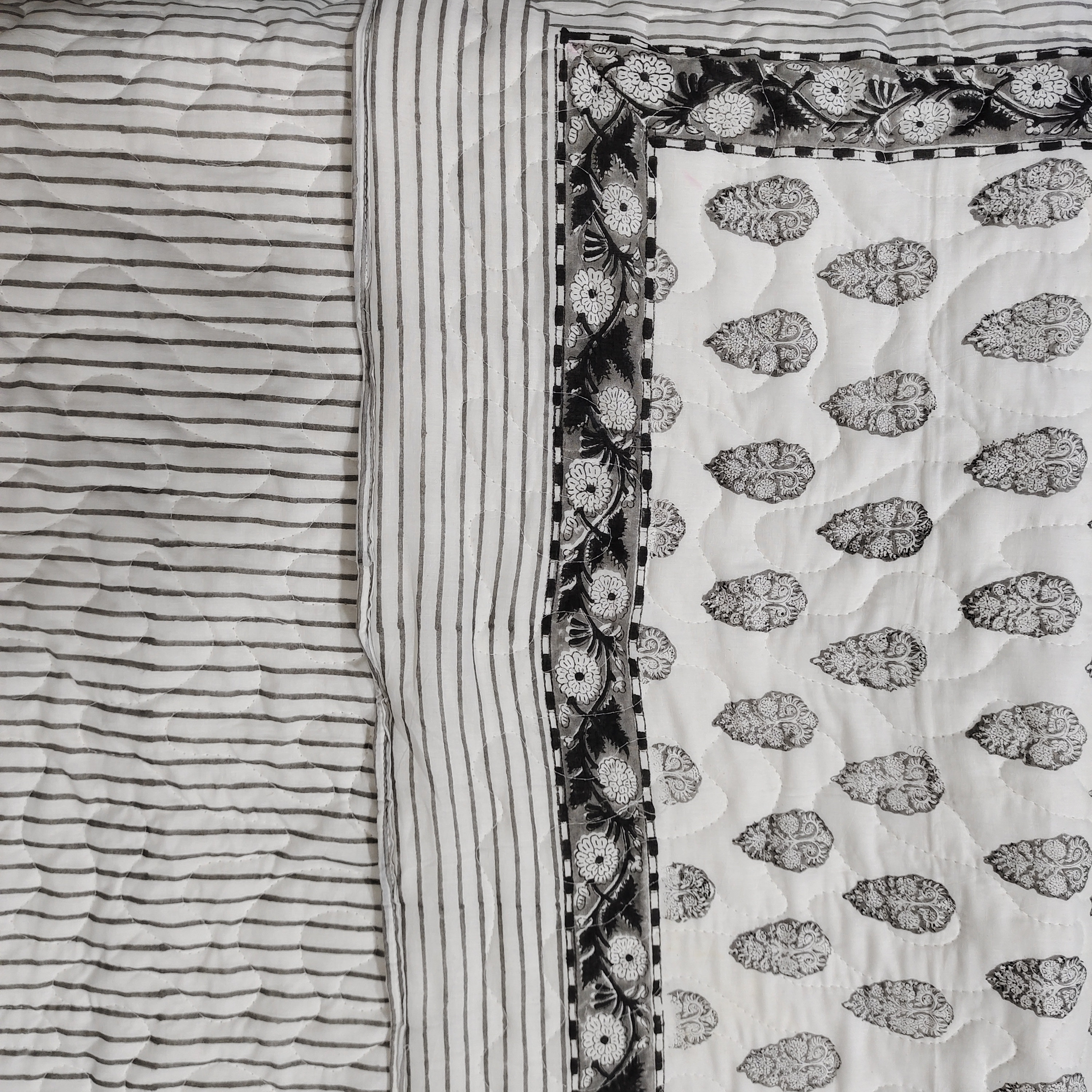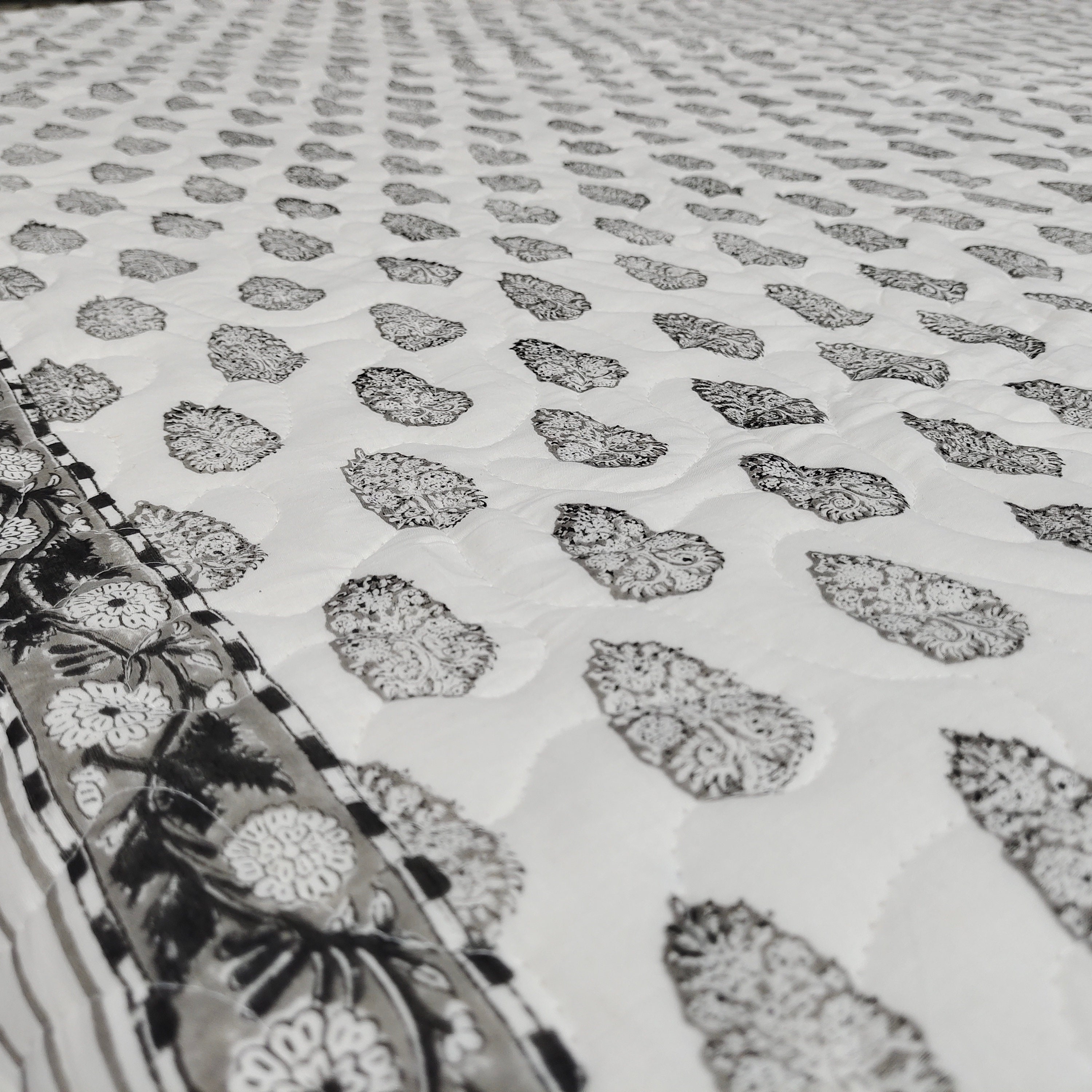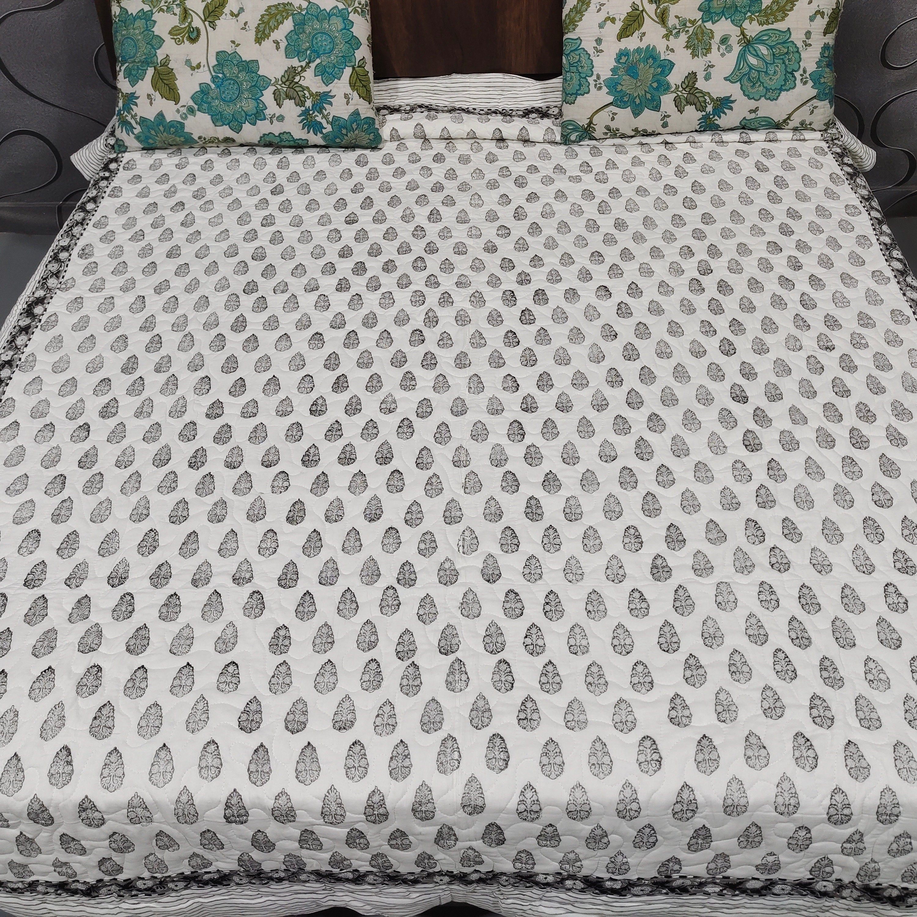 New Reversible Black and Gray Block Print Quilt, Machine Washable Cotton Bedcover