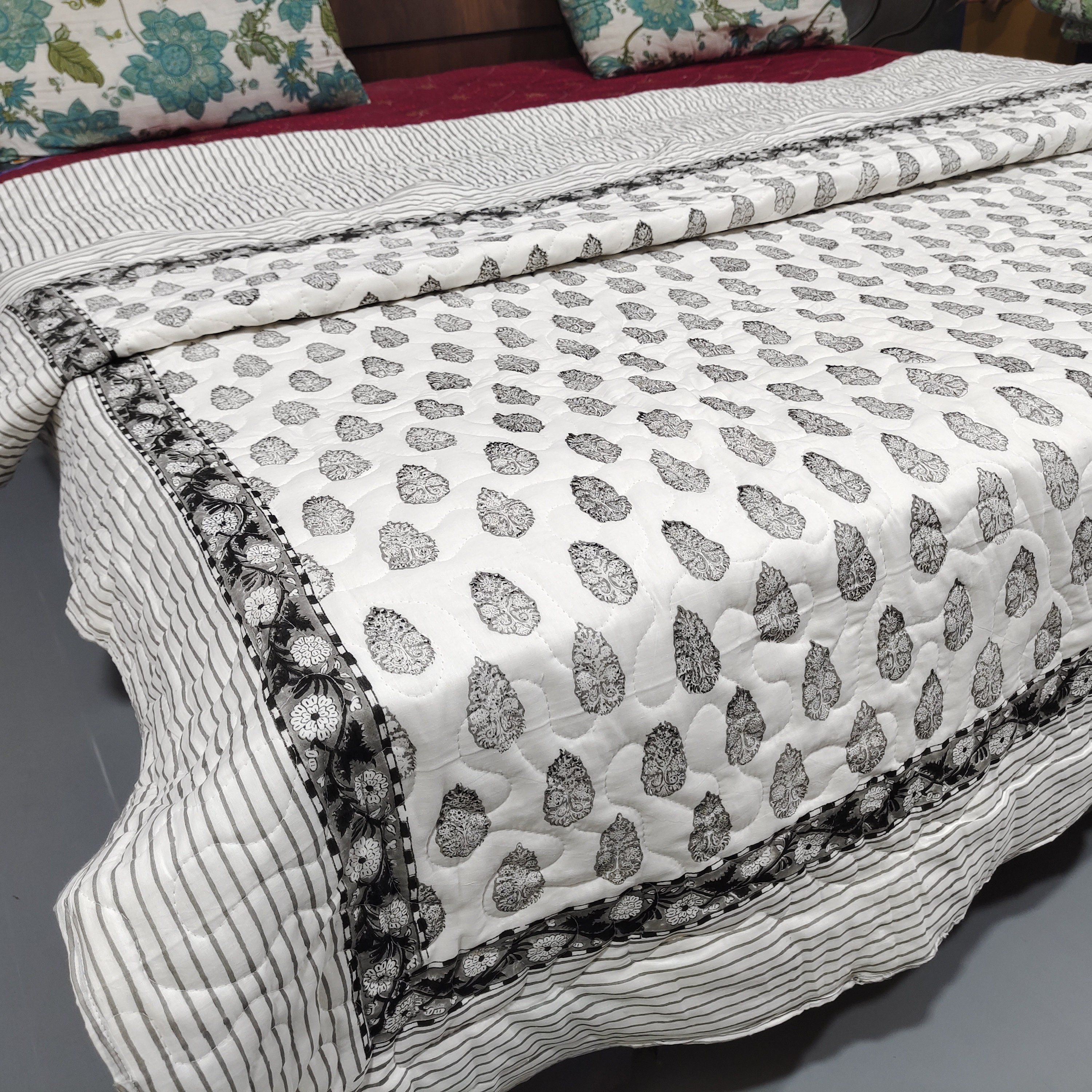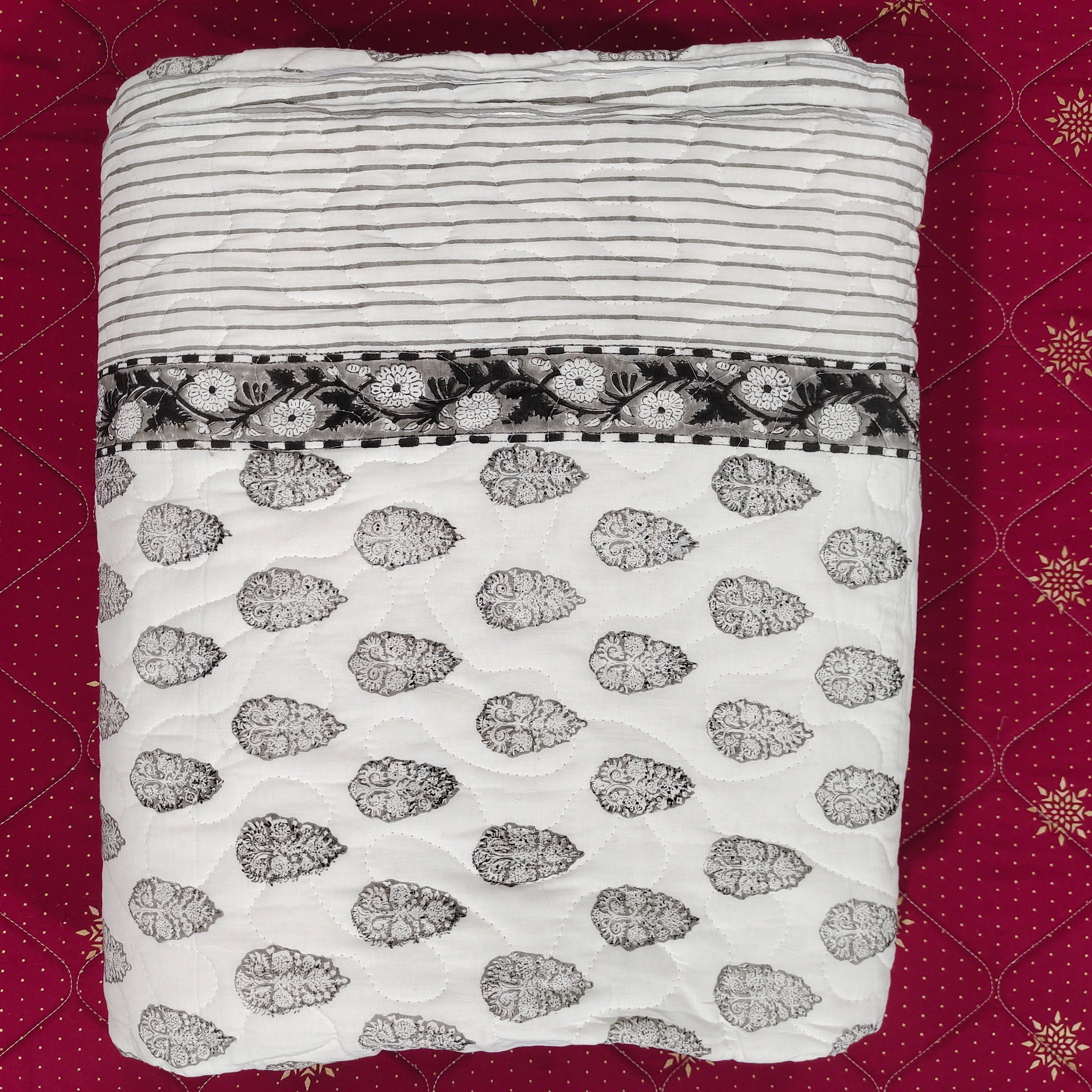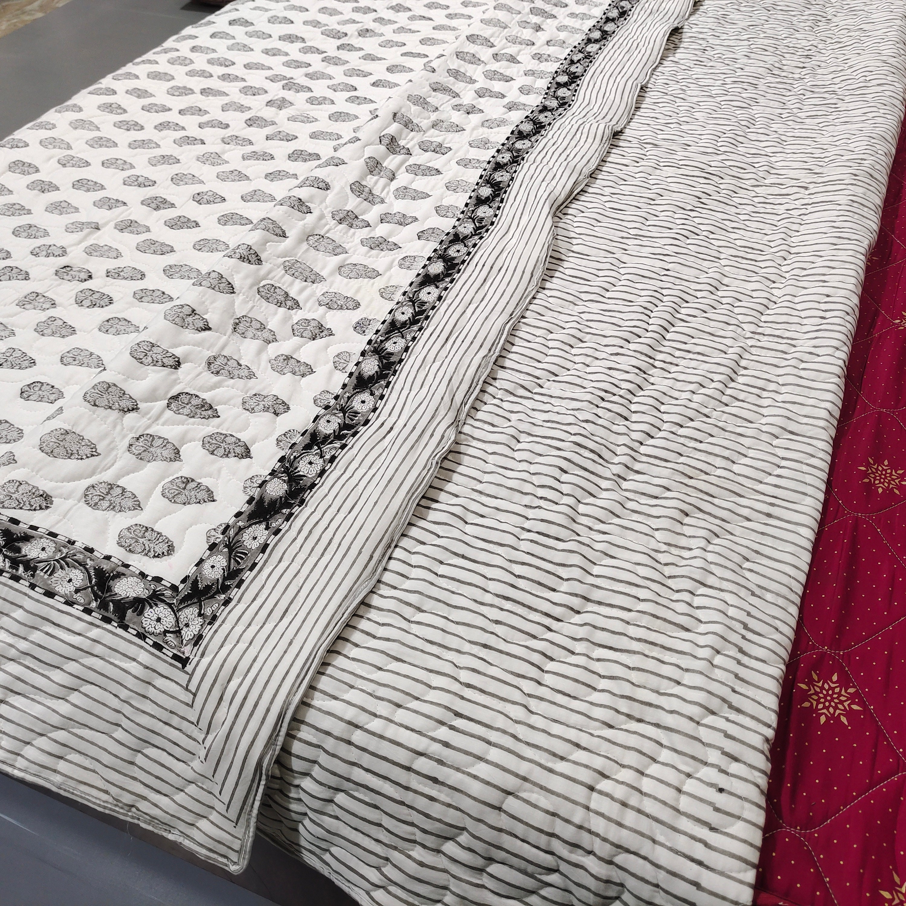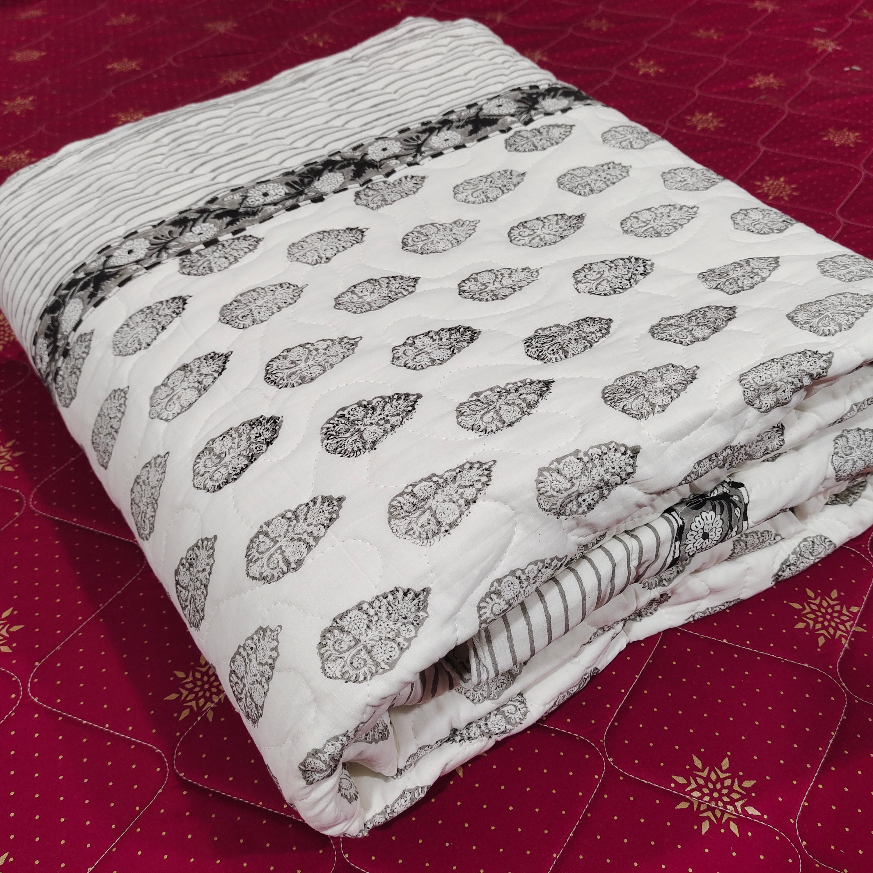 One distinctive feature of this quilt is its reversible hand block print. This traditional printing technique adds a unique and artistic touch to the quilt, making it not only a functional bedding item but also a piece of aesthetic appeal. Hand block printing involves skilled artisans carving intricate designs onto wooden blocks, which are then dipped in dye and stamped onto the fabric.
