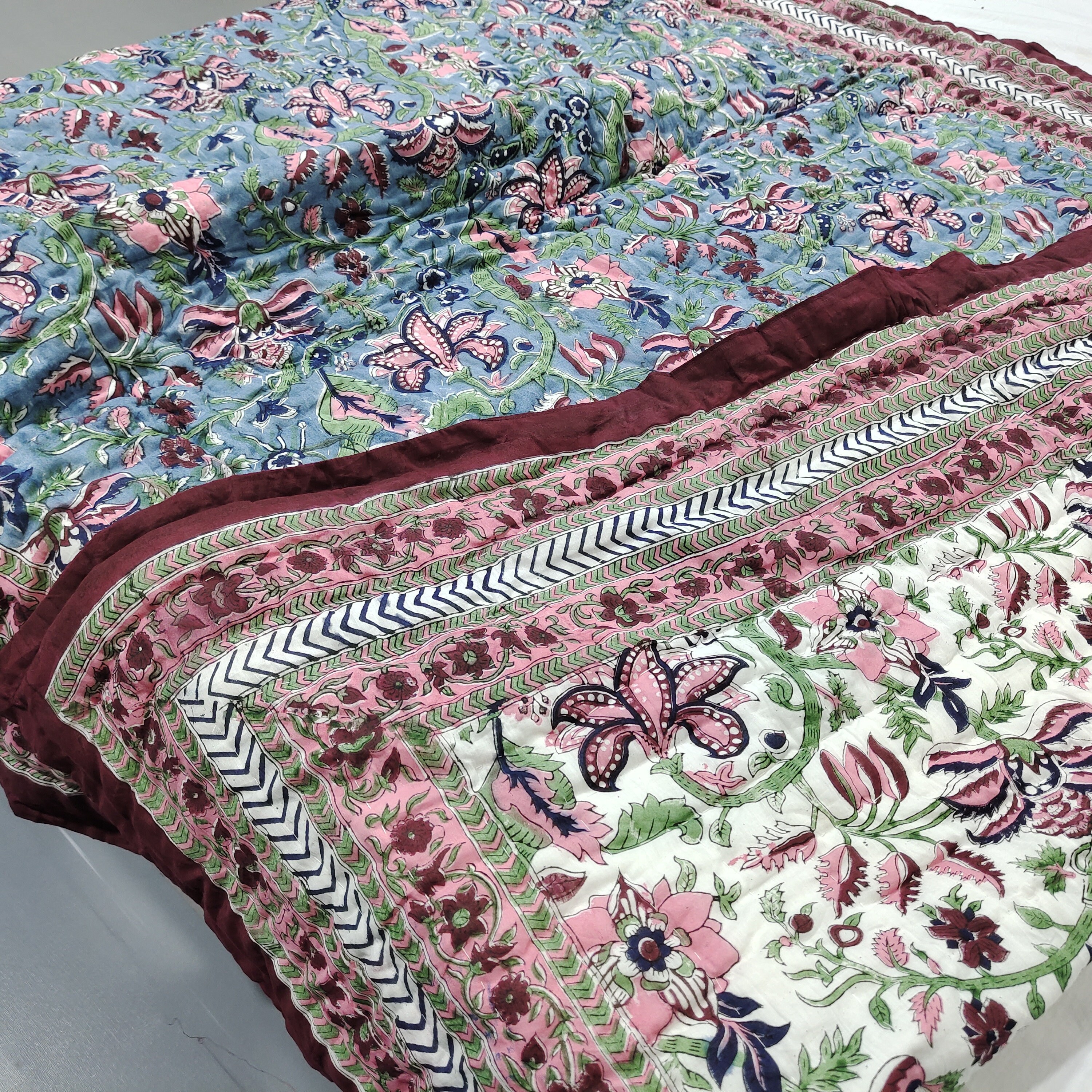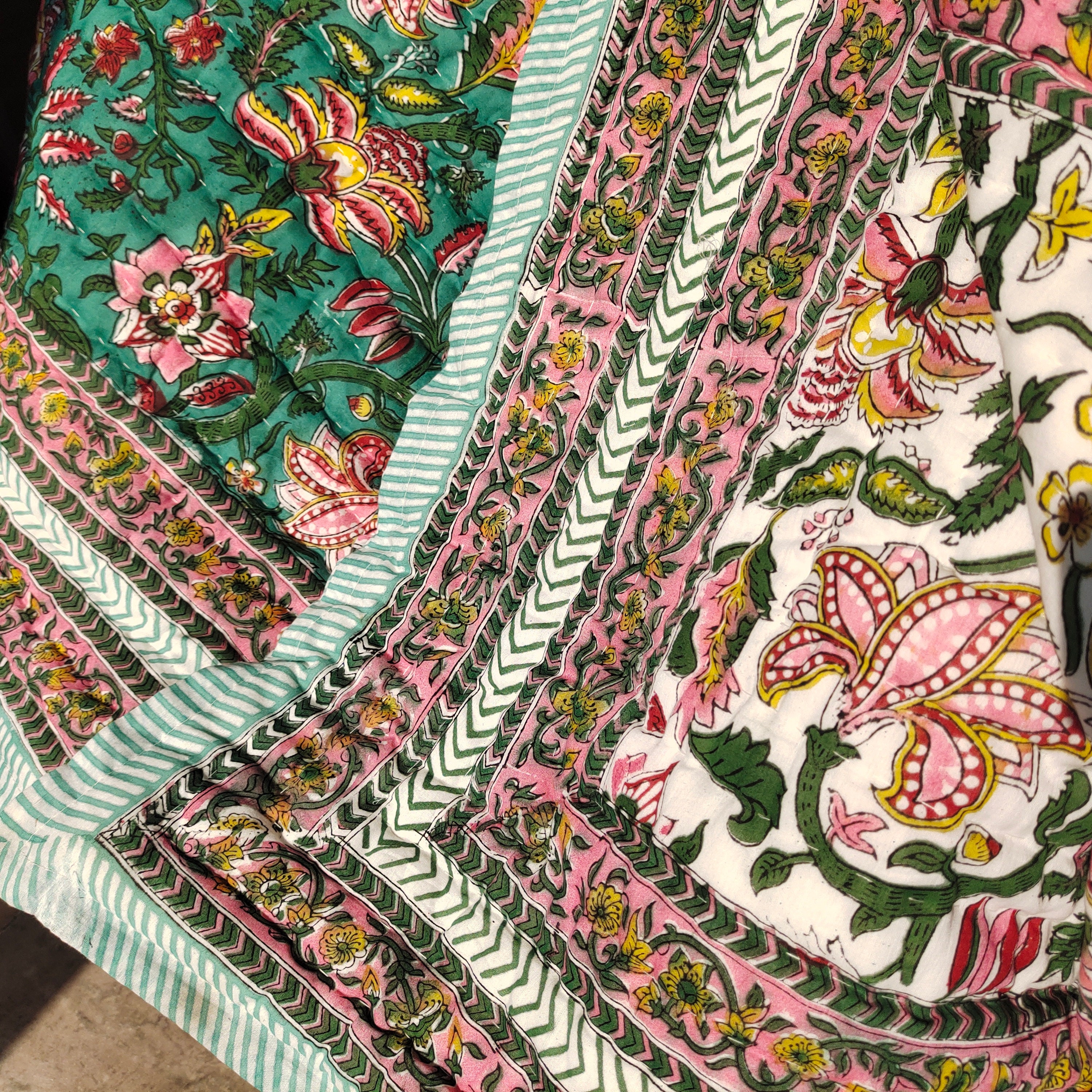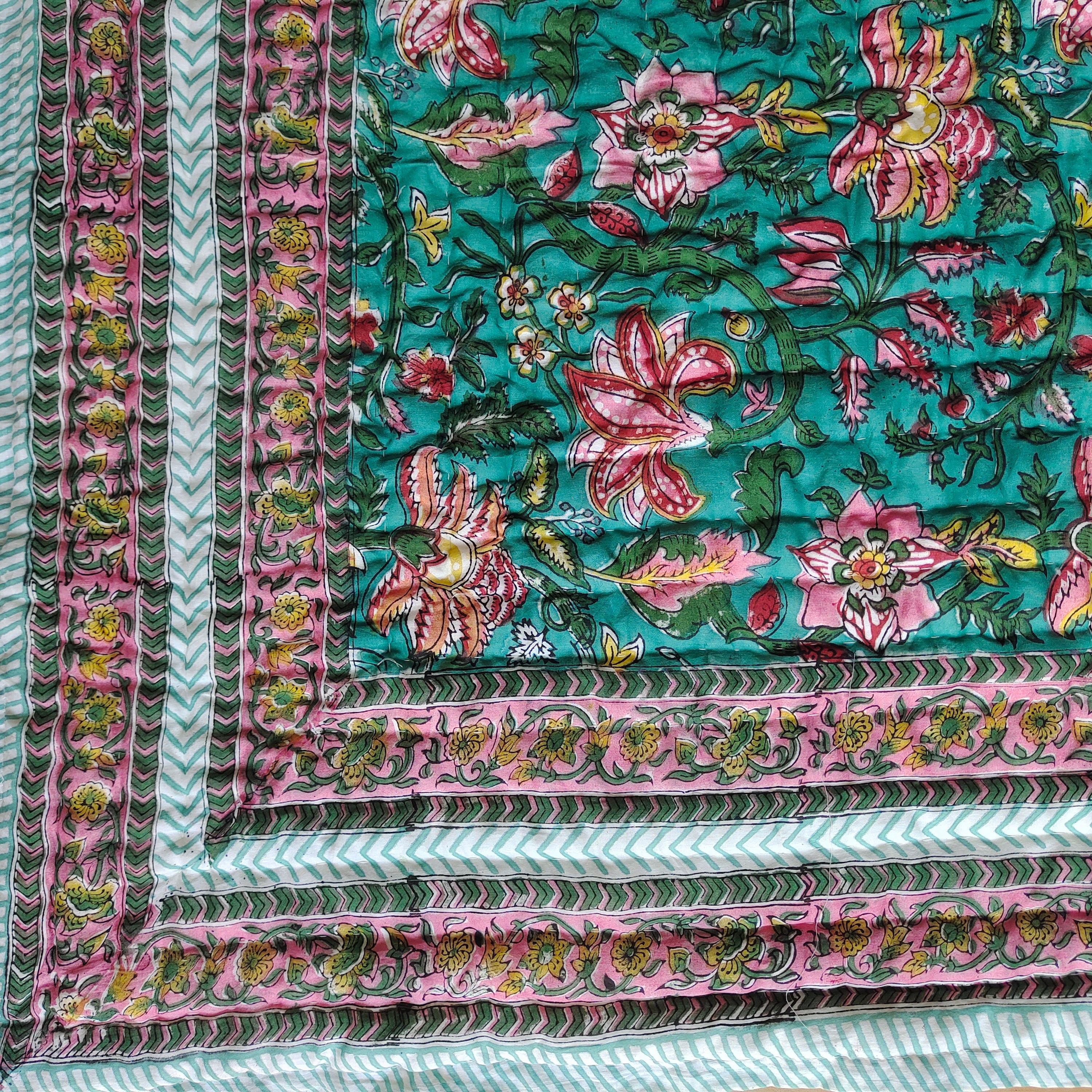 Hand Block Print Cotton Quilt: Floral Queen Size Bedding