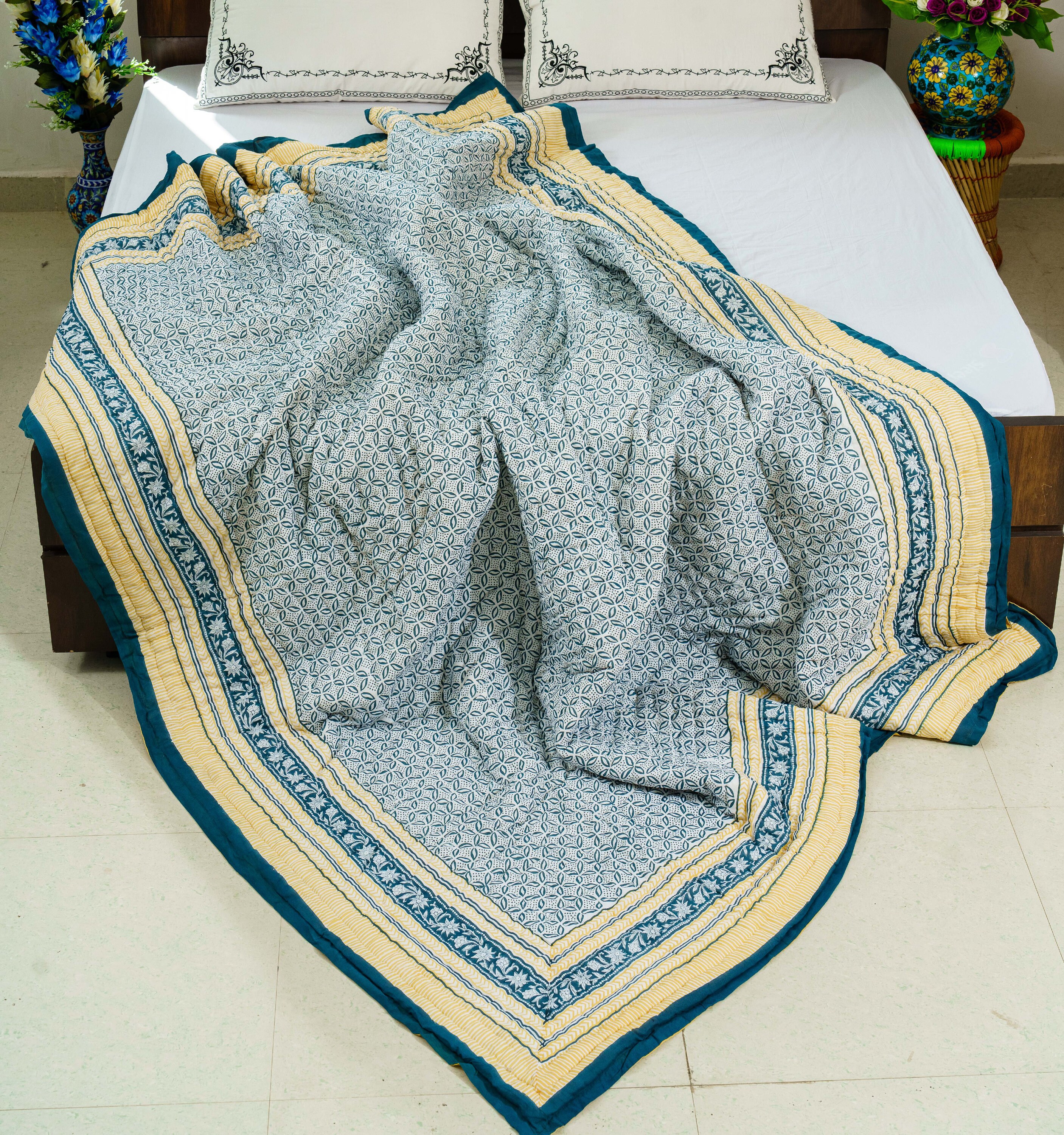 Hand Block Print Cotton Quilt: Geometric Floral Comforter