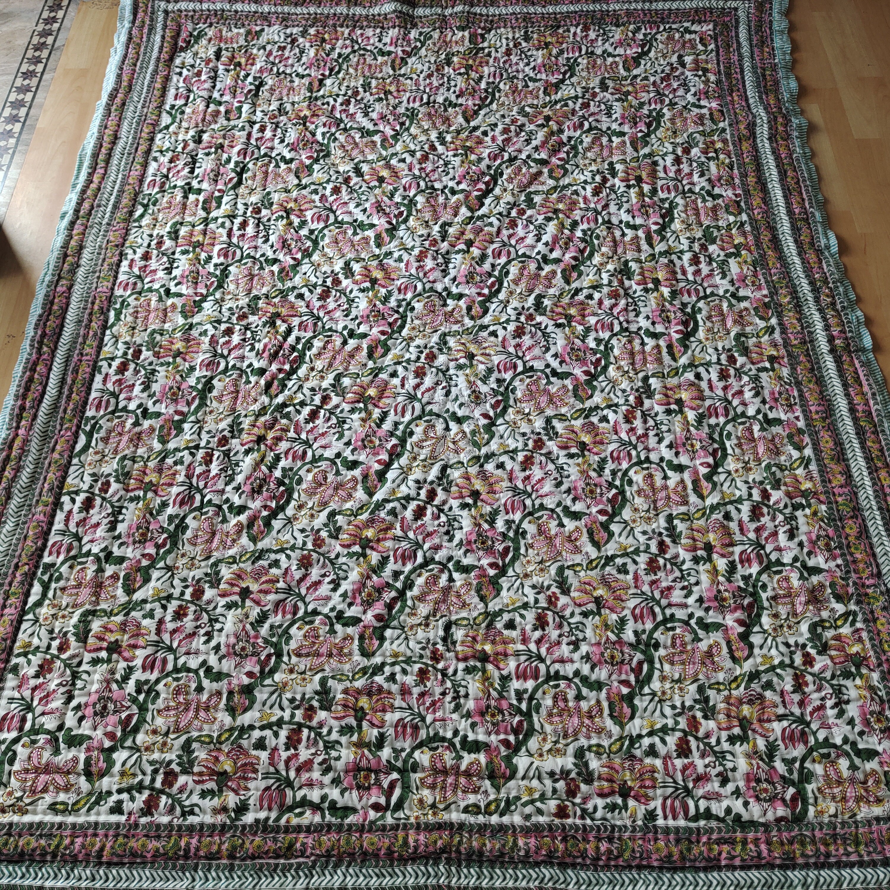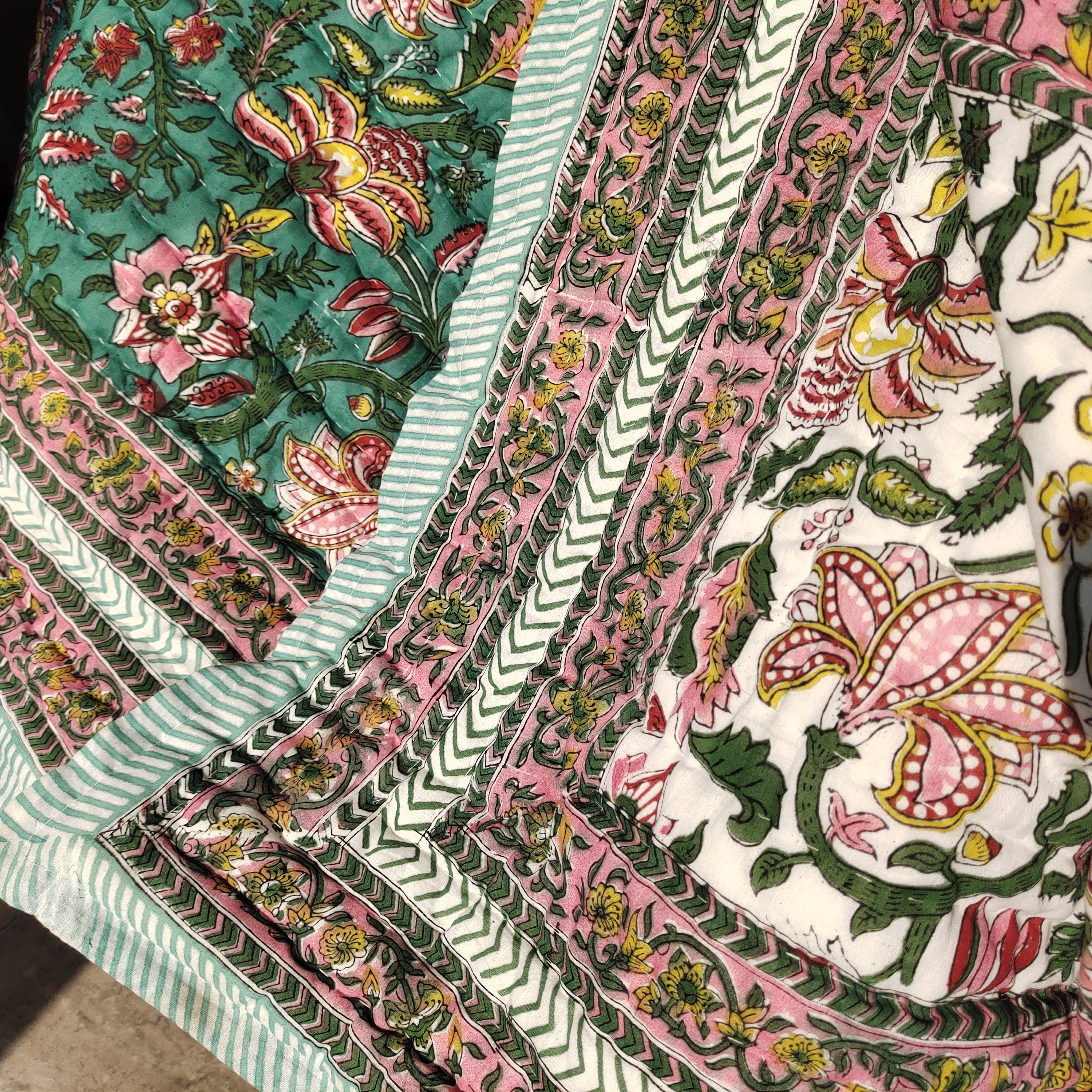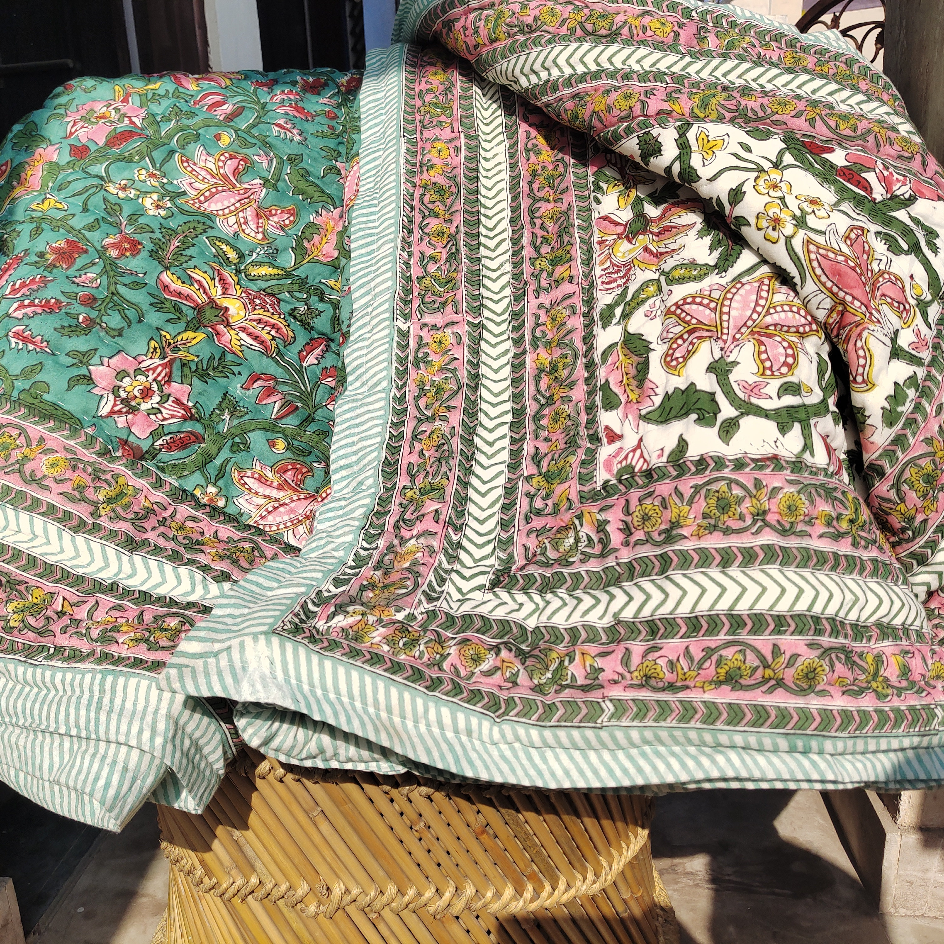 Indulge in the artistry of traditional craftsmanship with our exquisite Hand Stitched Hand Block Print Quilt. Each quilt is a masterpiece of skill and creativity, meticulously crafted by skilled artisans in Jaipur, India. From the intricate hand block printing to the careful stitching, every step in the process is a labor of love, resulting in a quilt that's as beautiful as it is functional.