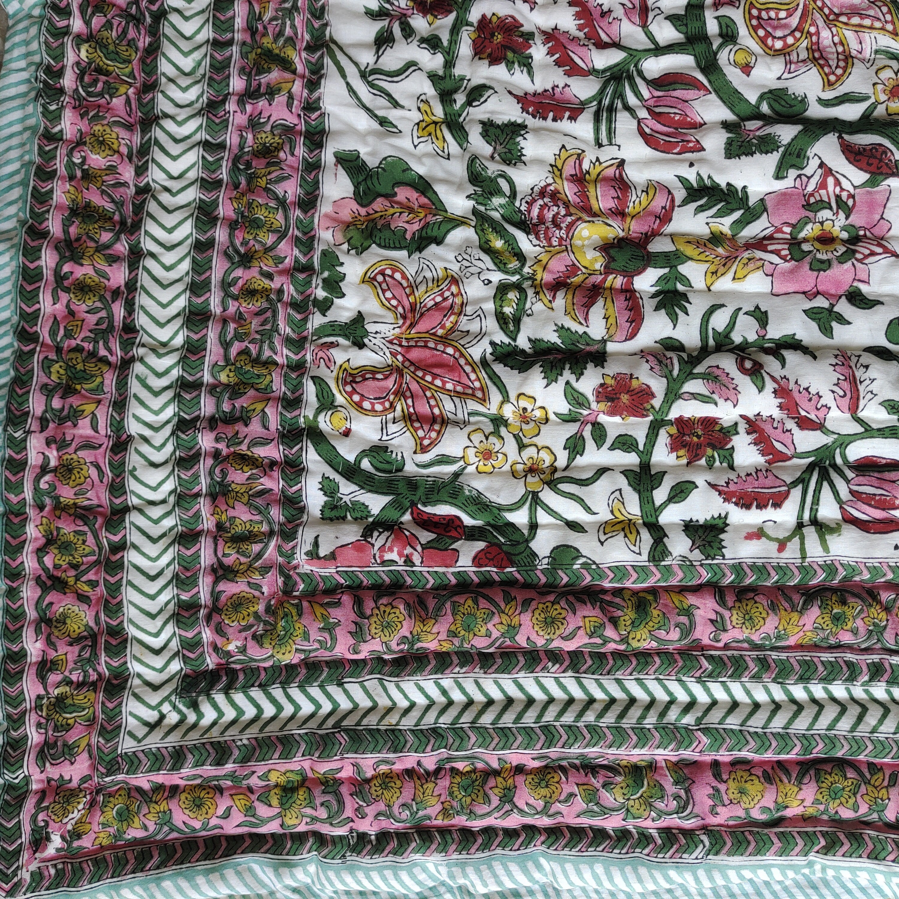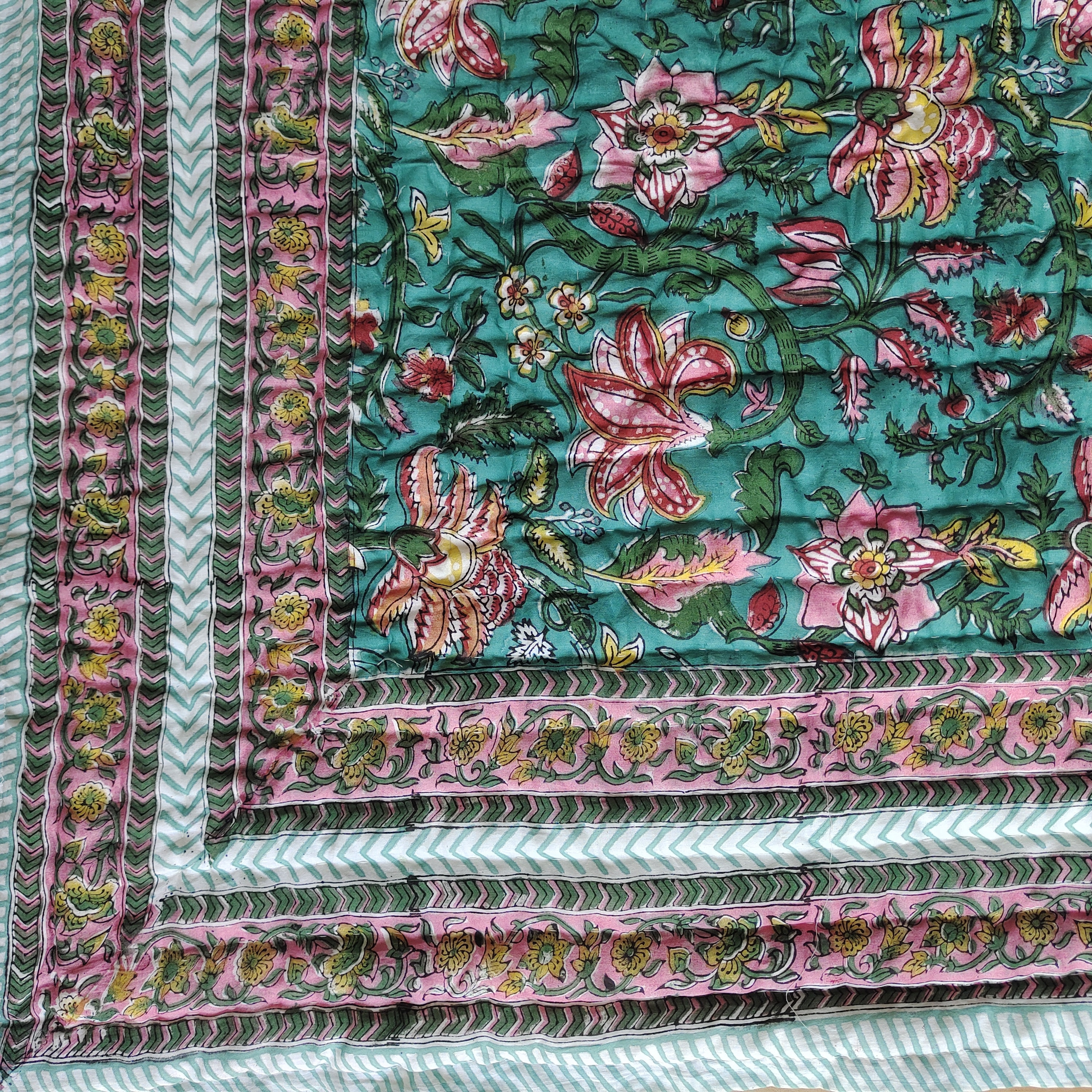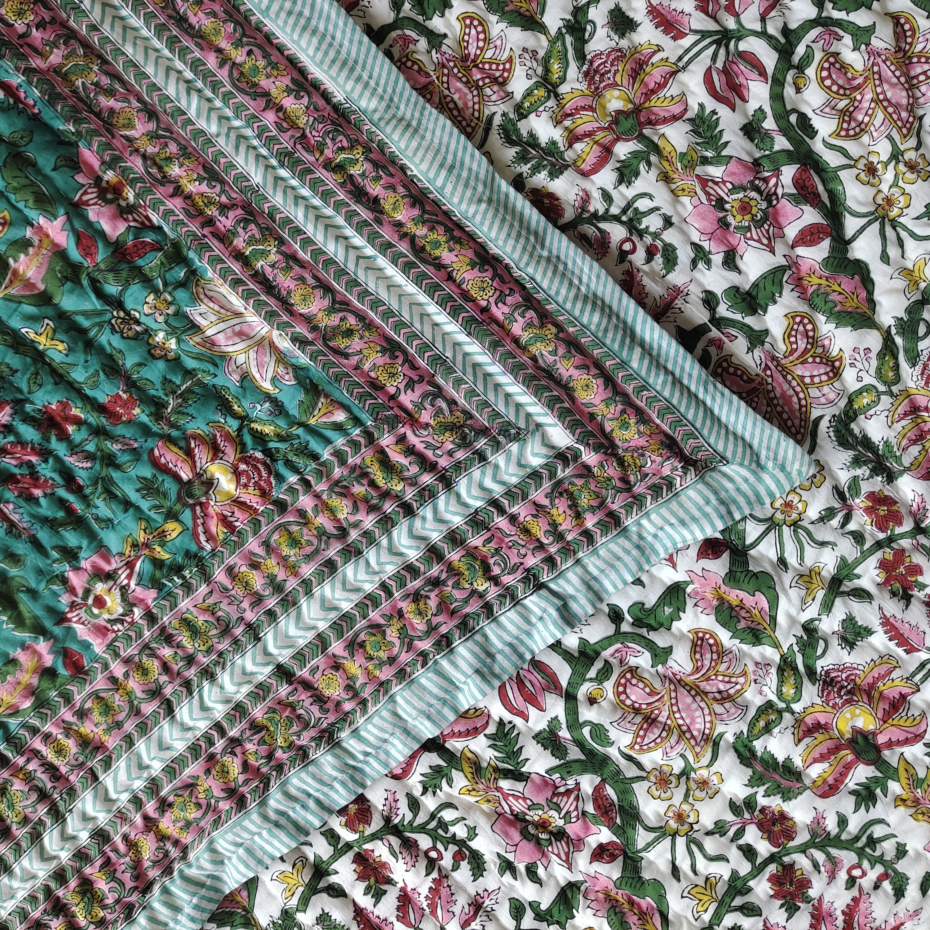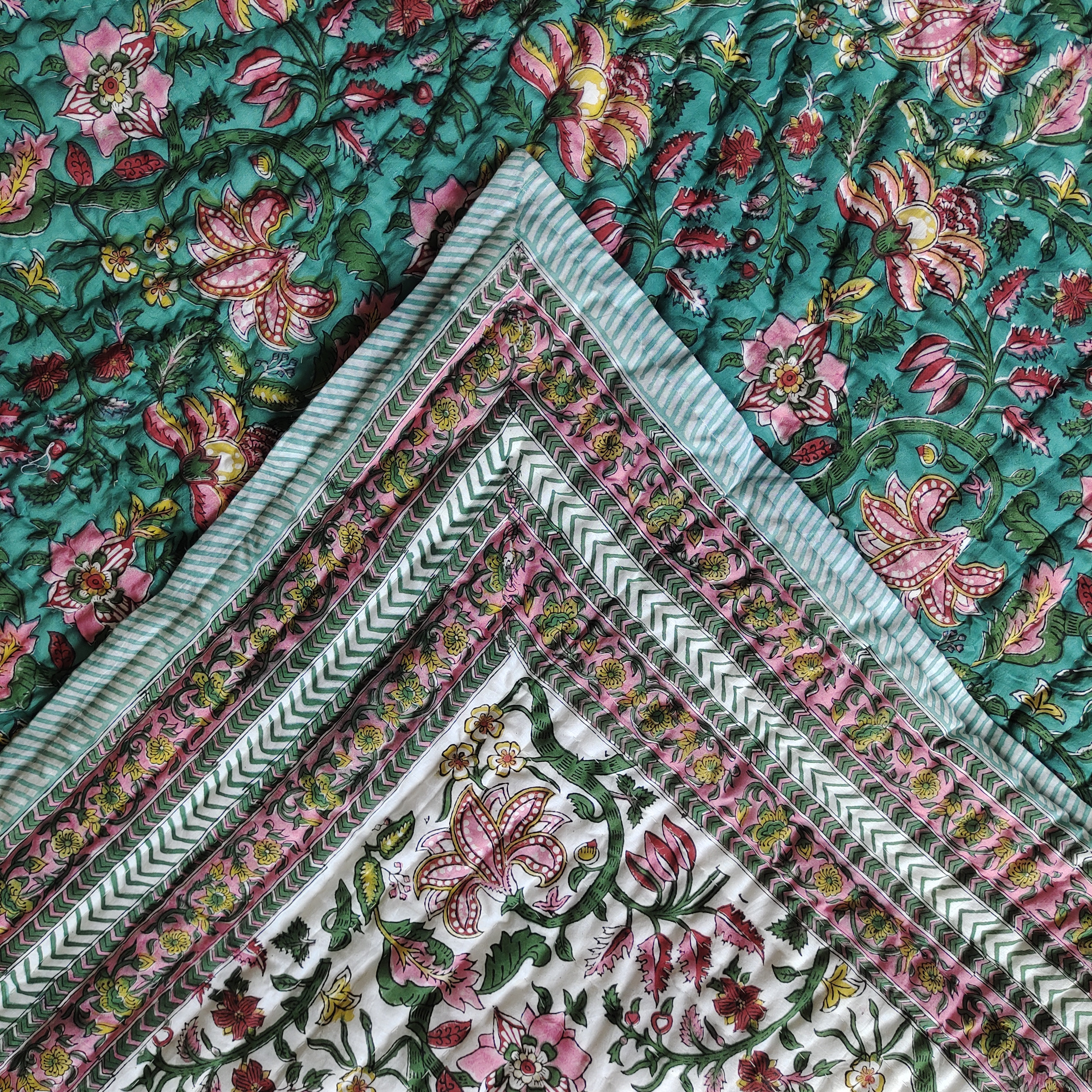 Indulge in the artistry of traditional craftsmanship with our exquisite Hand Stitched Hand Block Print Quilt. Each quilt is a masterpiece of skill and creativity, meticulously crafted by skilled artisans in Jaipur, India. From the intricate hand block printing to the careful stitching, every step in the process is a labor of love, resulting in a quilt that's as beautiful as it is functional.