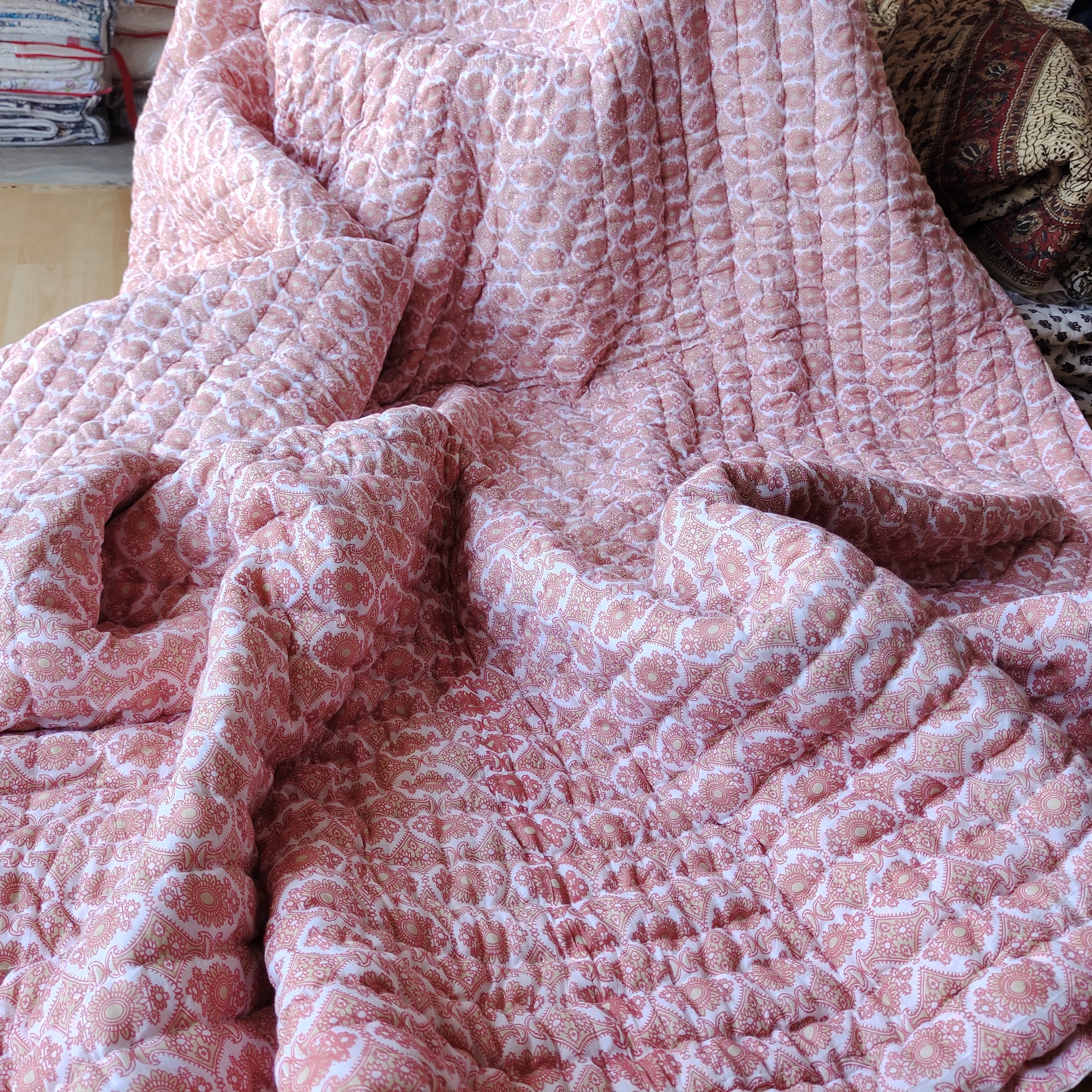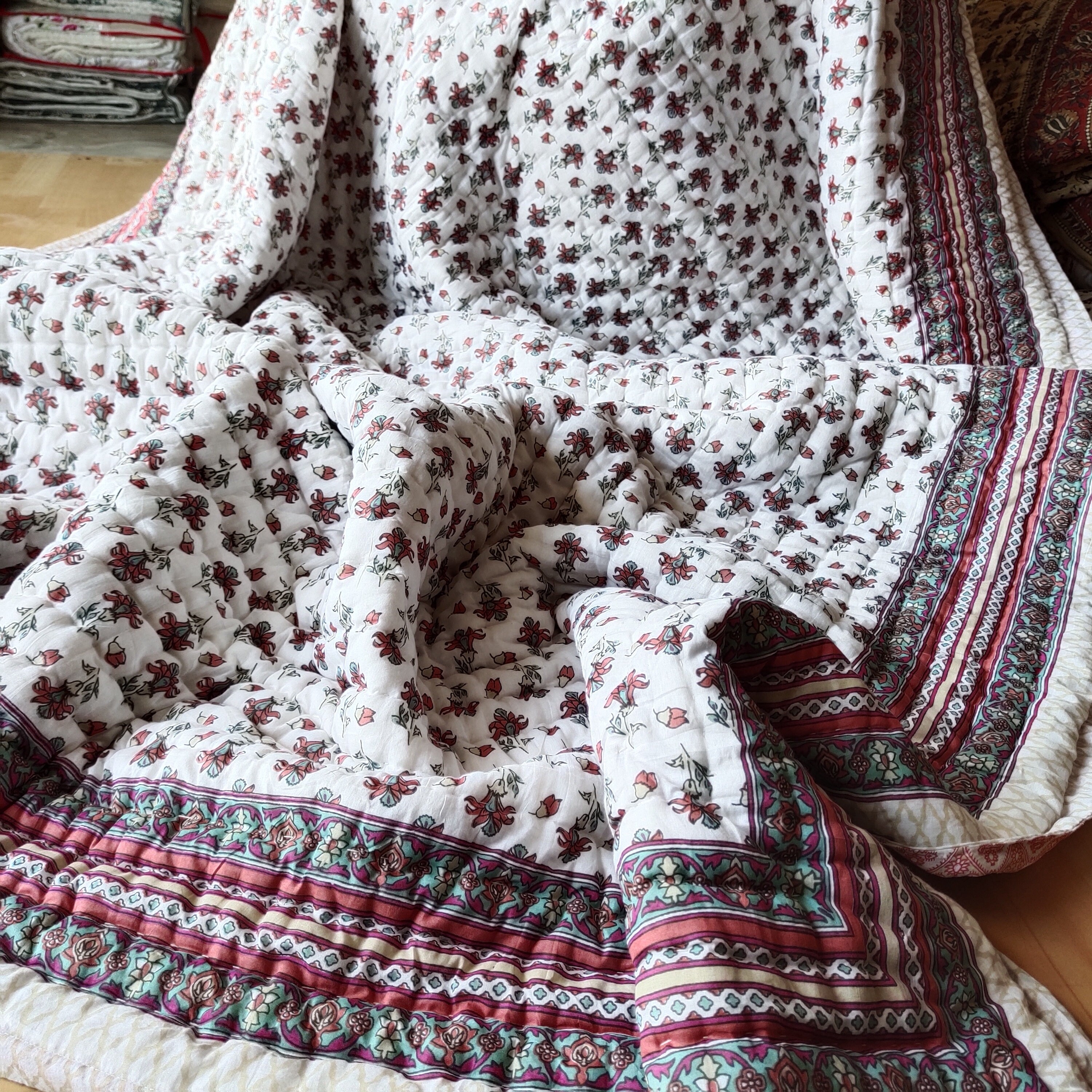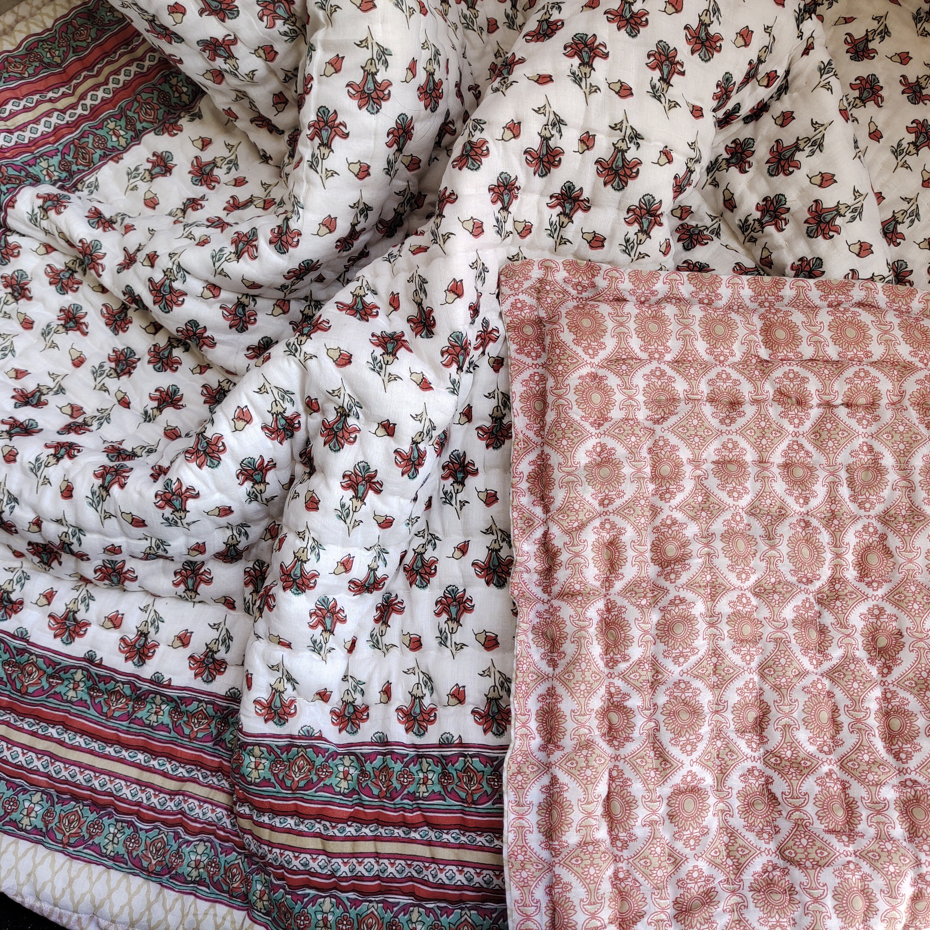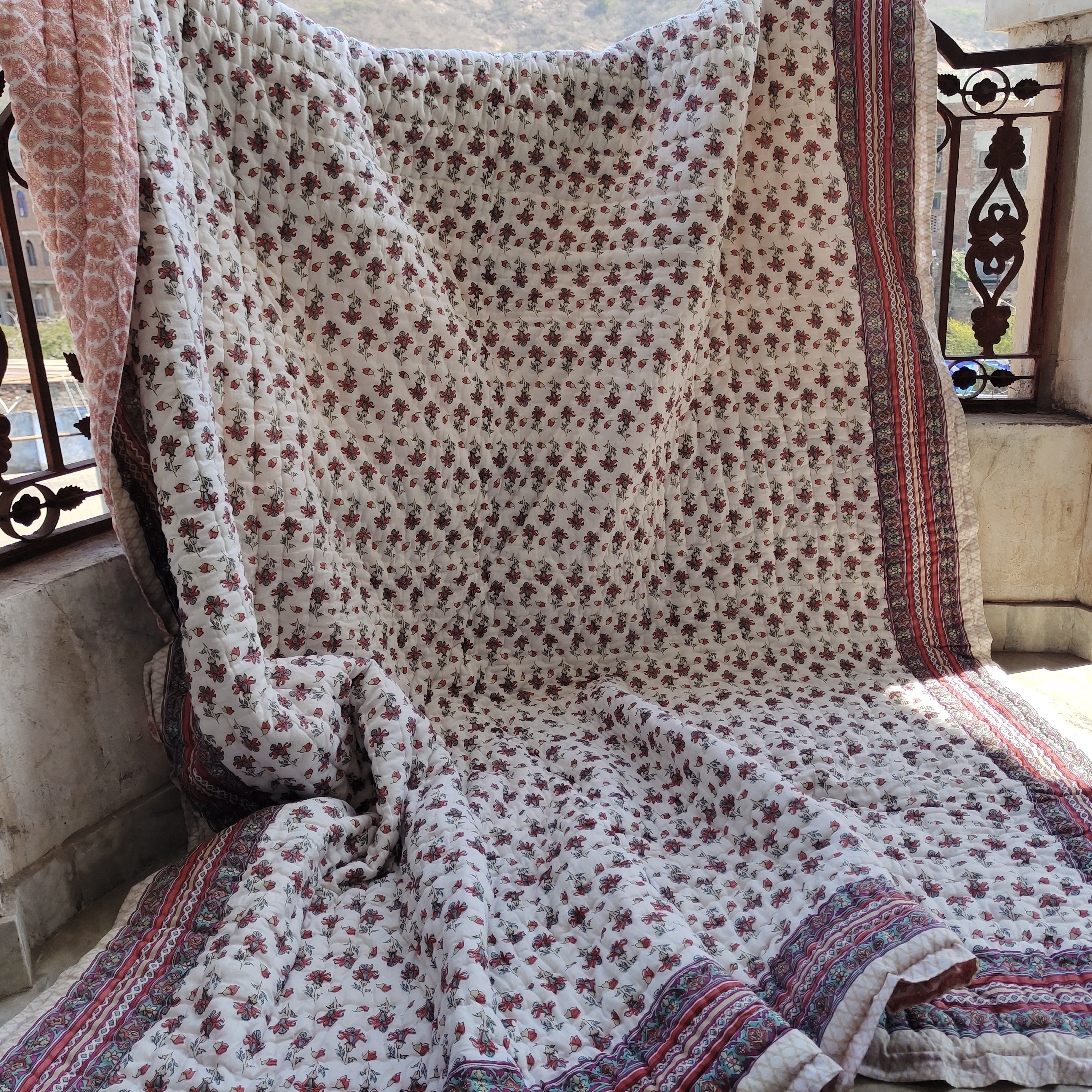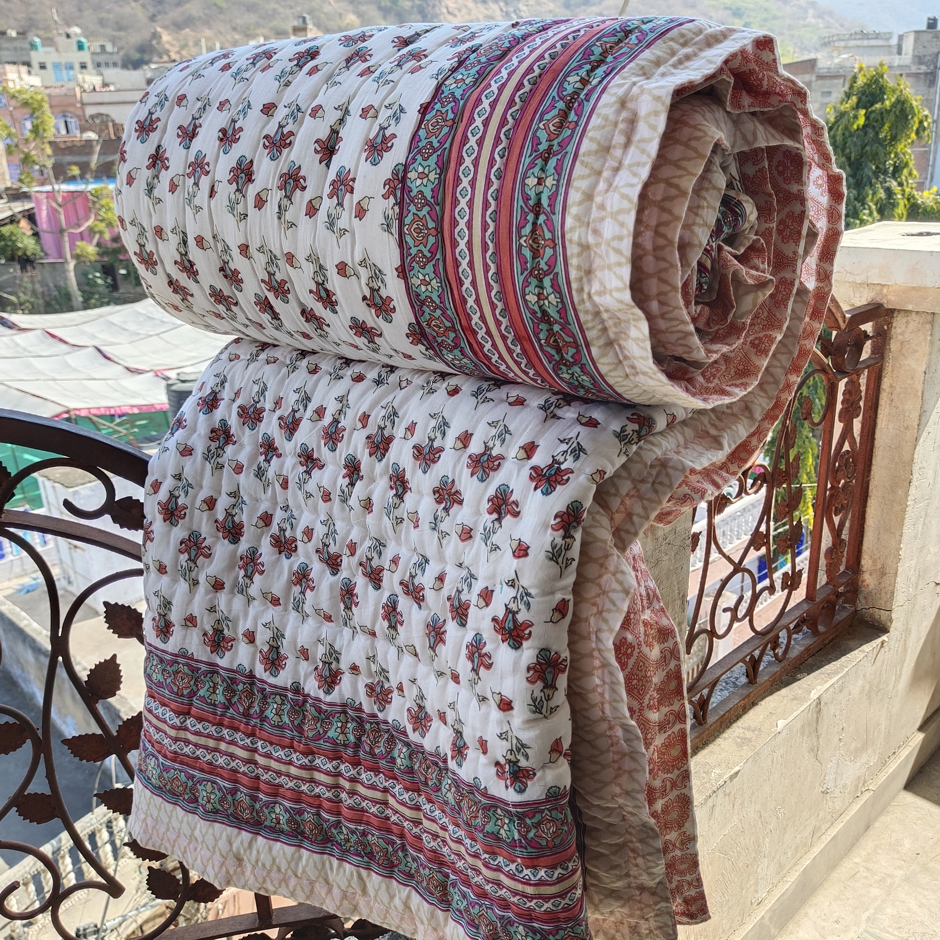 Hand Block Printed Jaipur Quilt: Reversible Cotton Double Bed Quilt