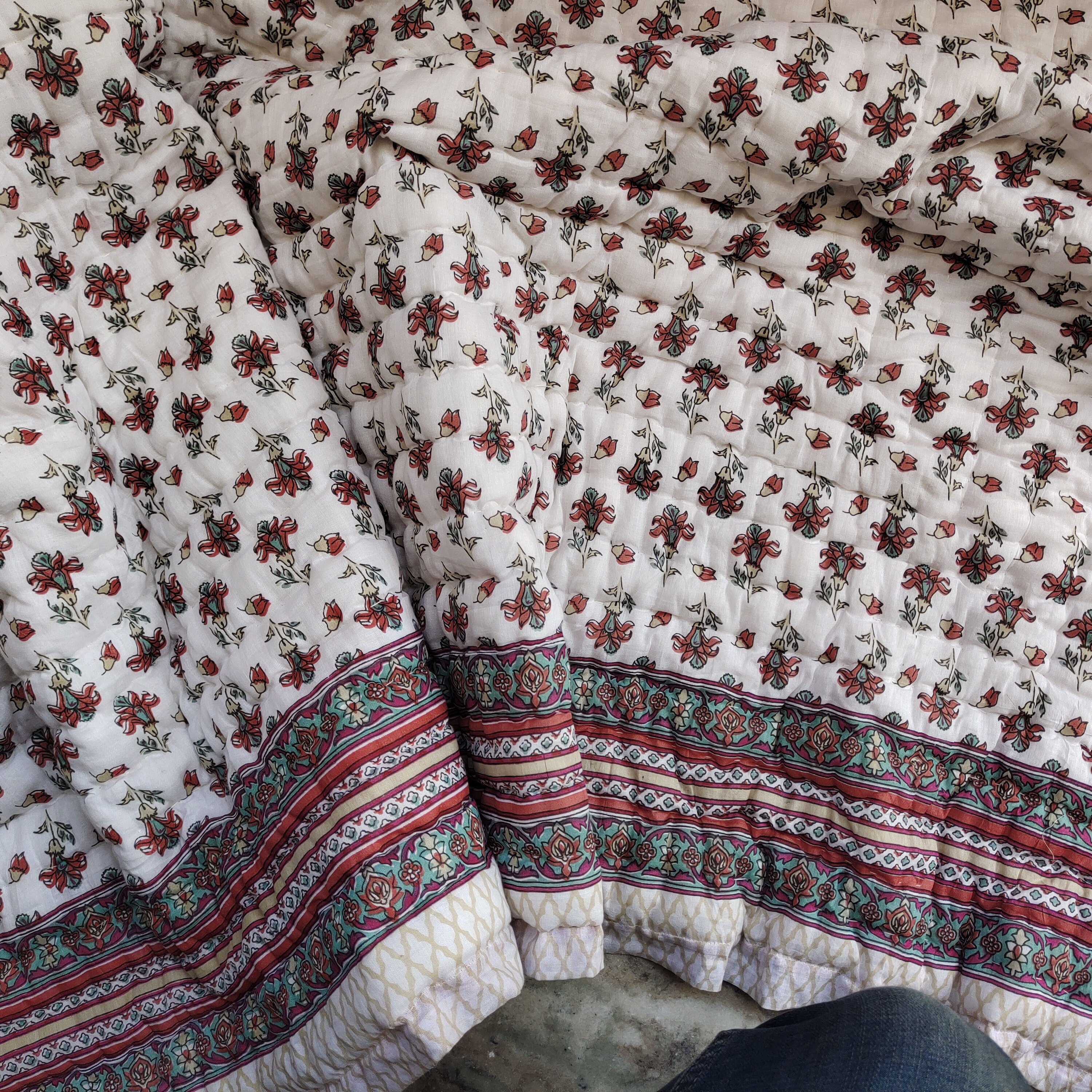 Indulge in the artistry of traditional craftsmanship with our exquisite Hand Stitched Hand Block Print Quilt. Each quilt is a masterpiece of skill and creativity, meticulously crafted by skilled artisans in Jaipur, India. From the intricate hand block printing to the careful stitching, every step in the process is a labor of love, resulting in a quilt that's as beautiful as it is functional.