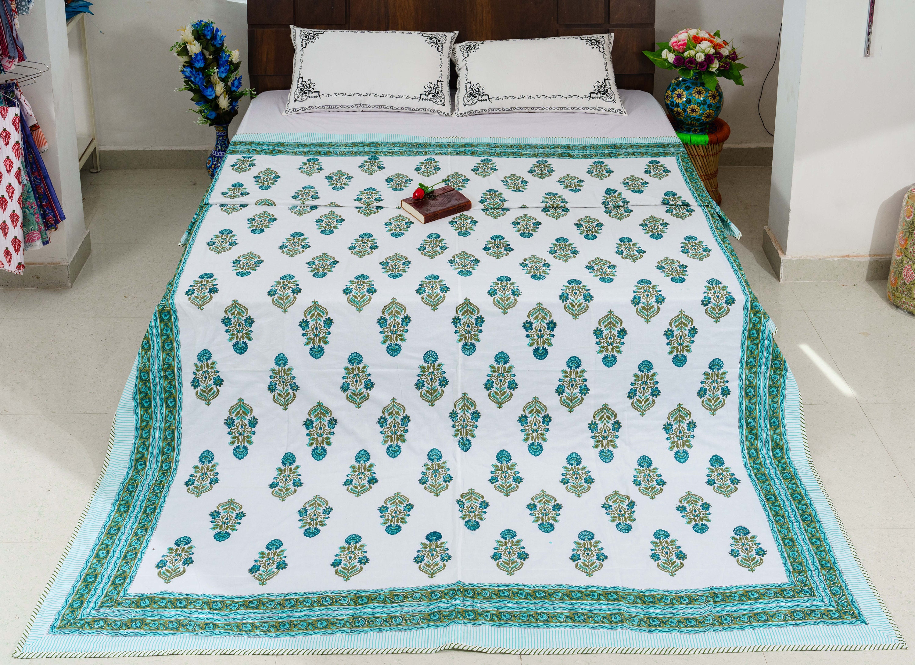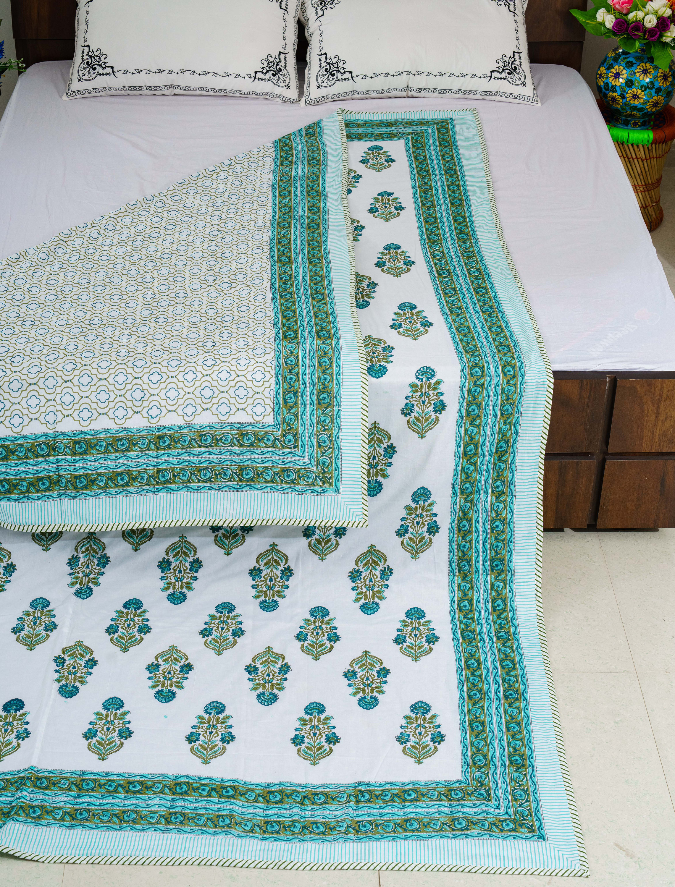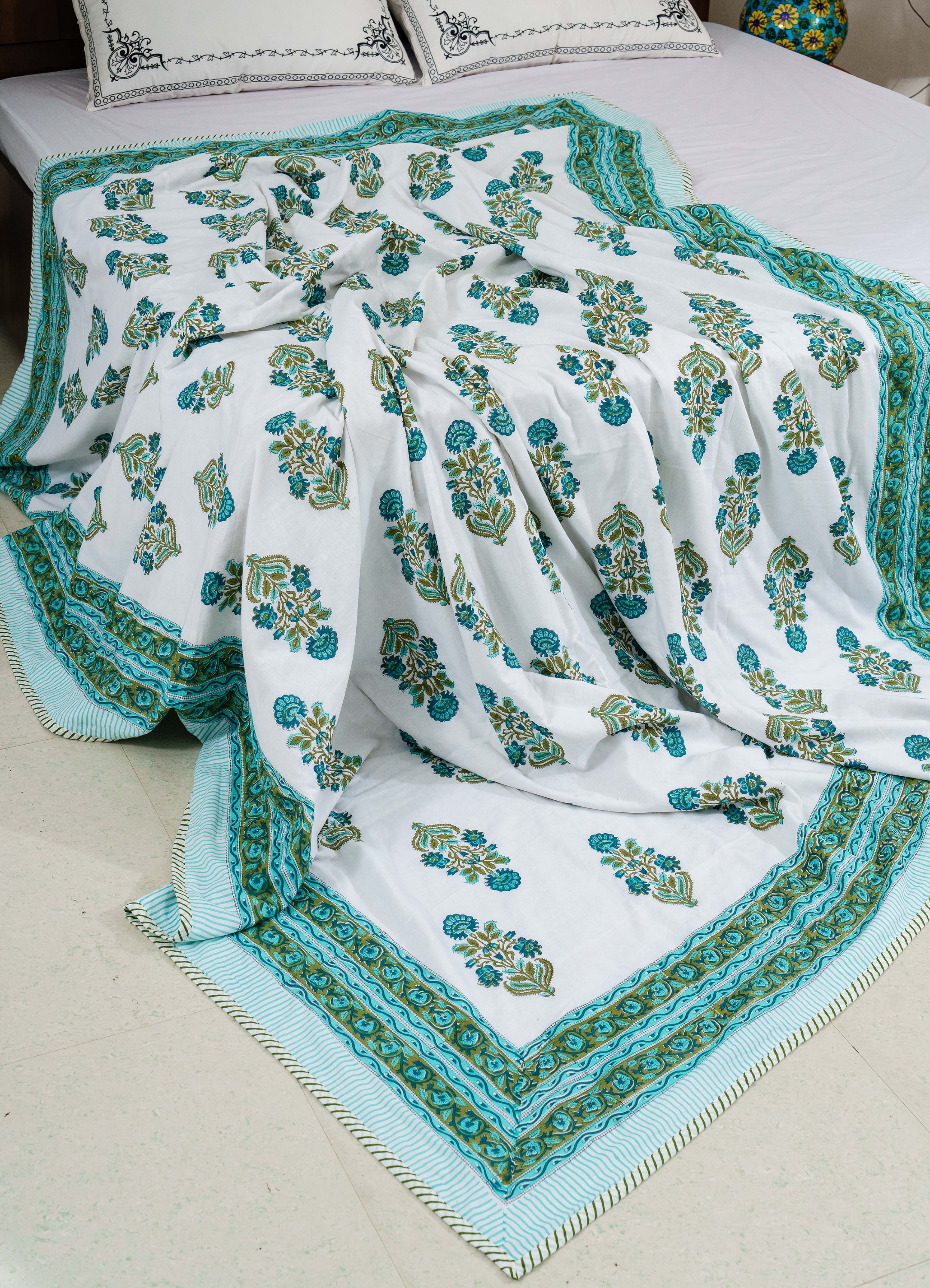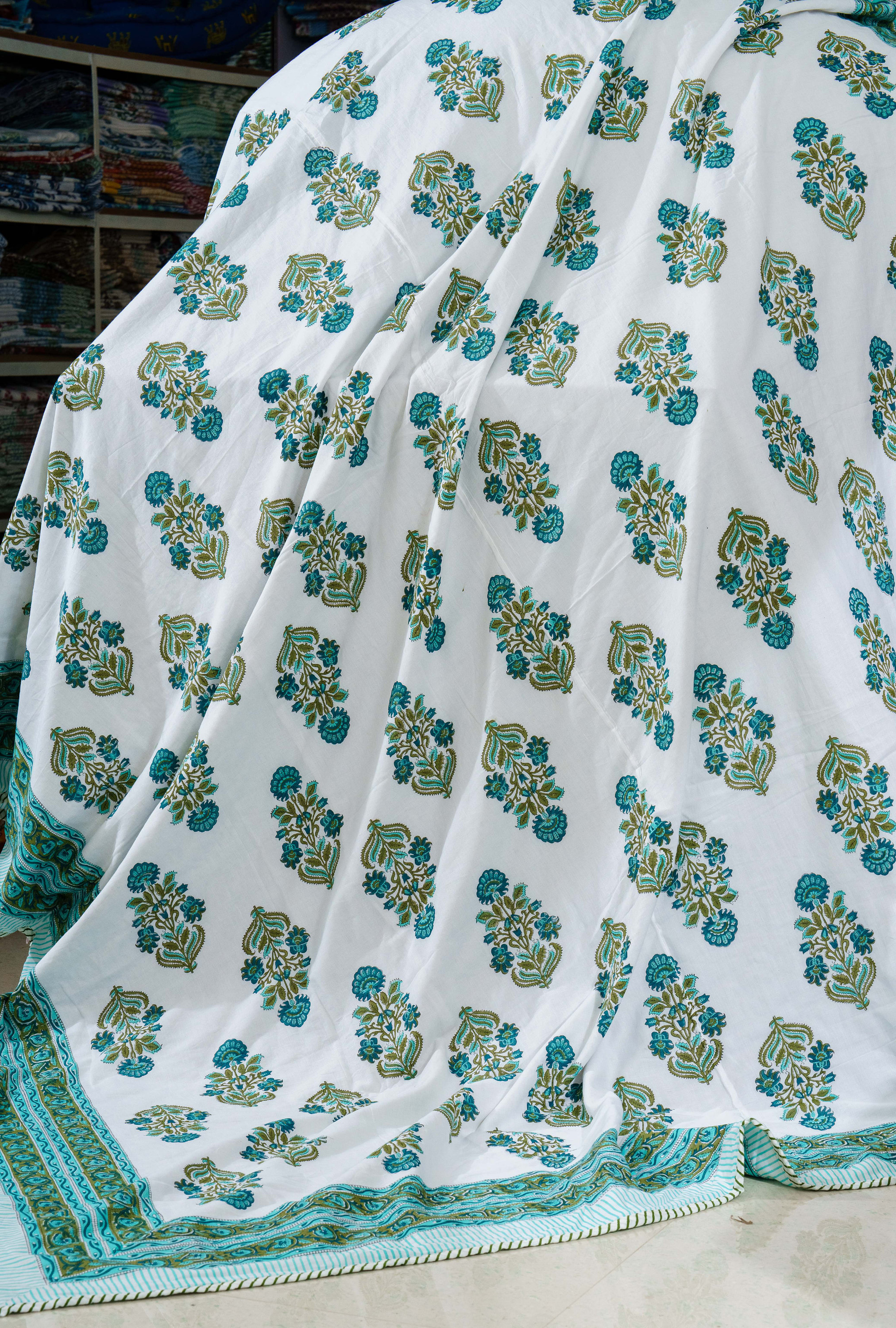 Green Floral Hand Block Print Cotton Blanket, Lightweight Comforter