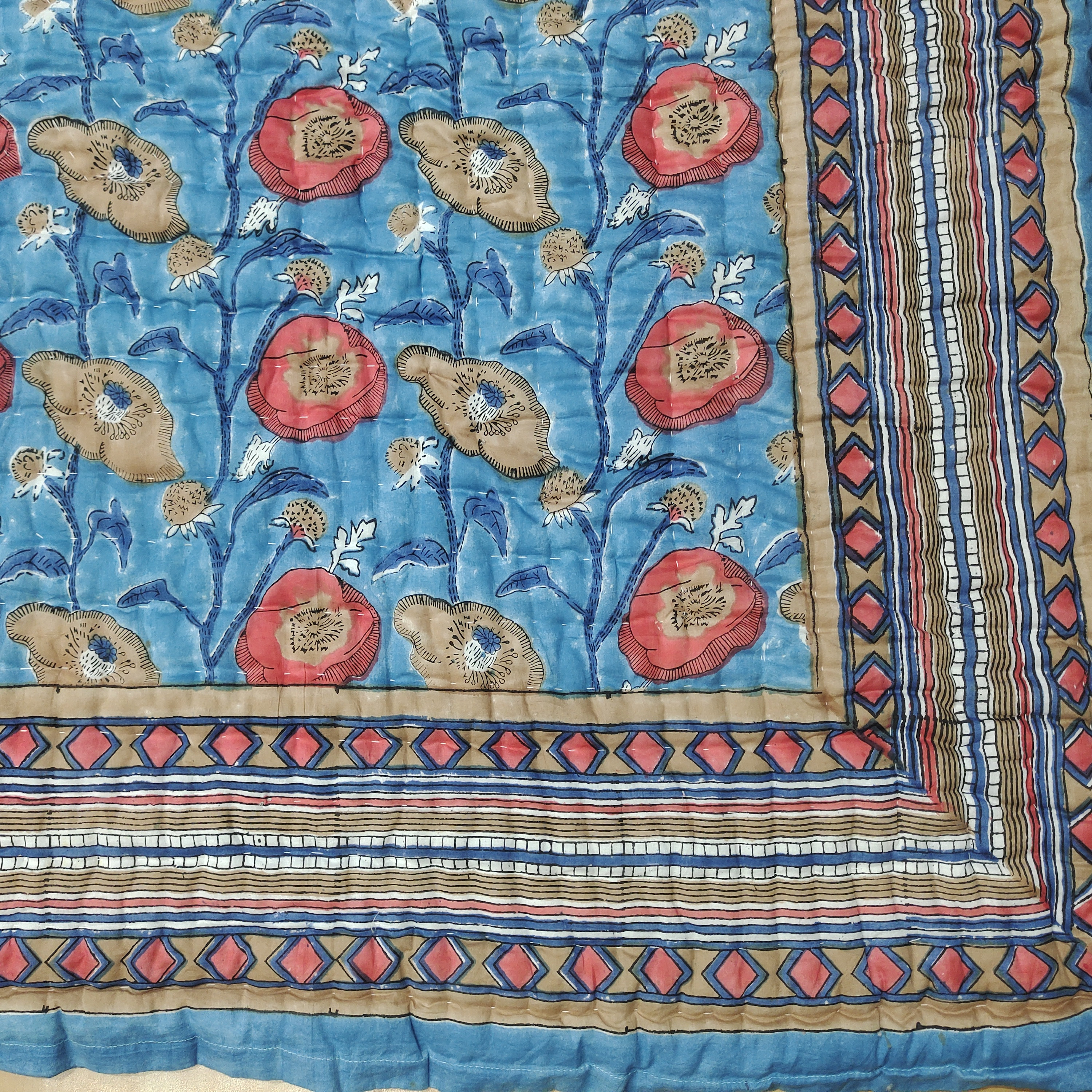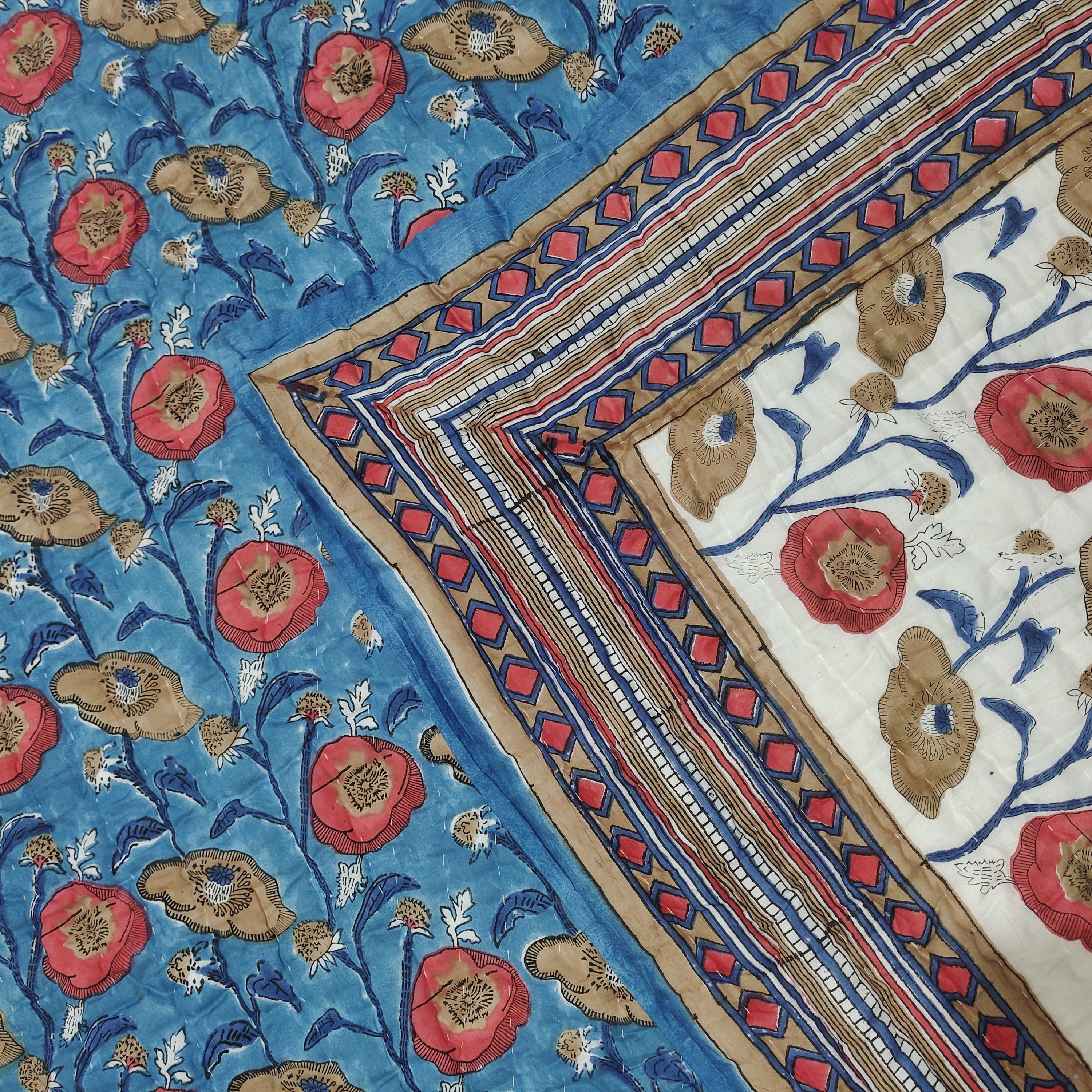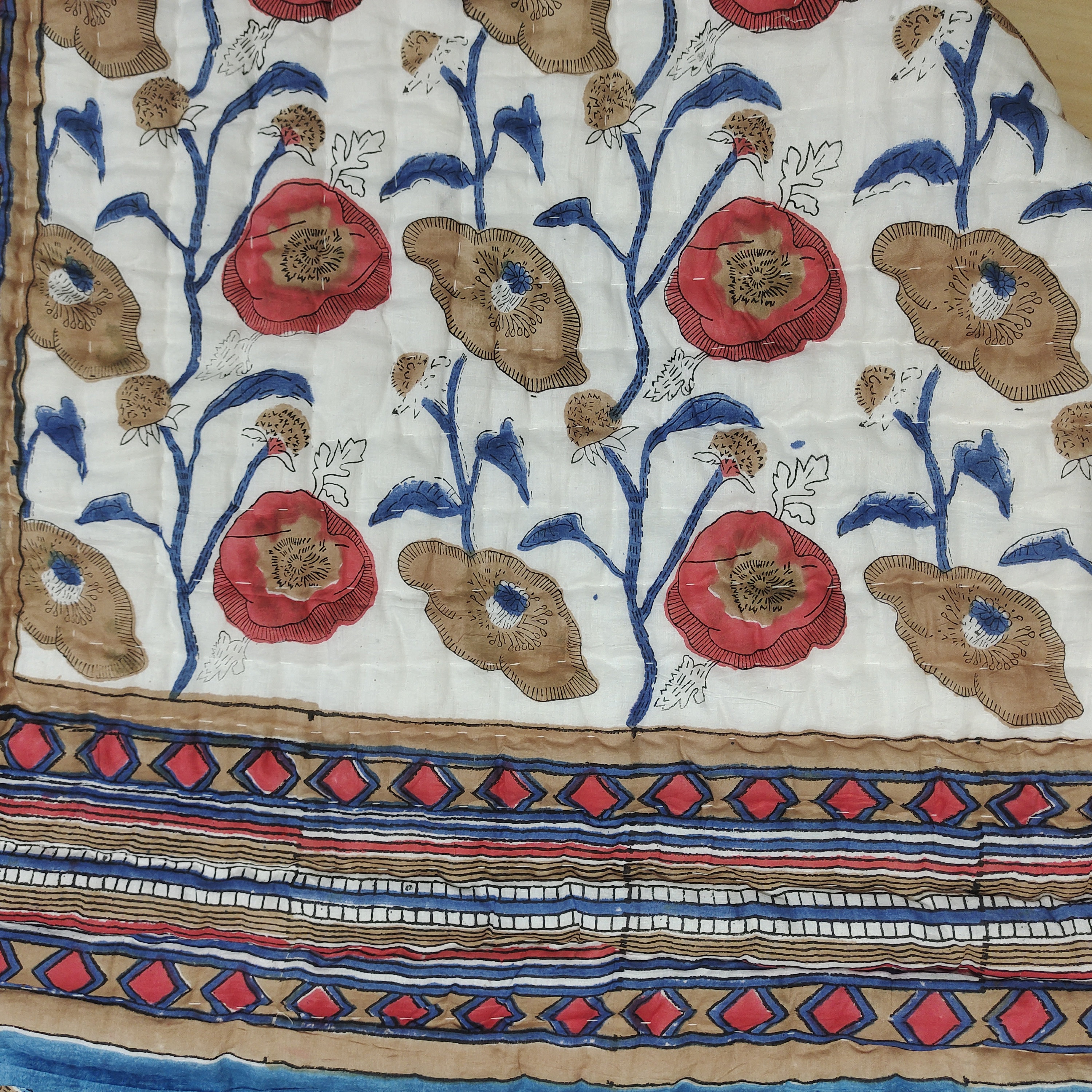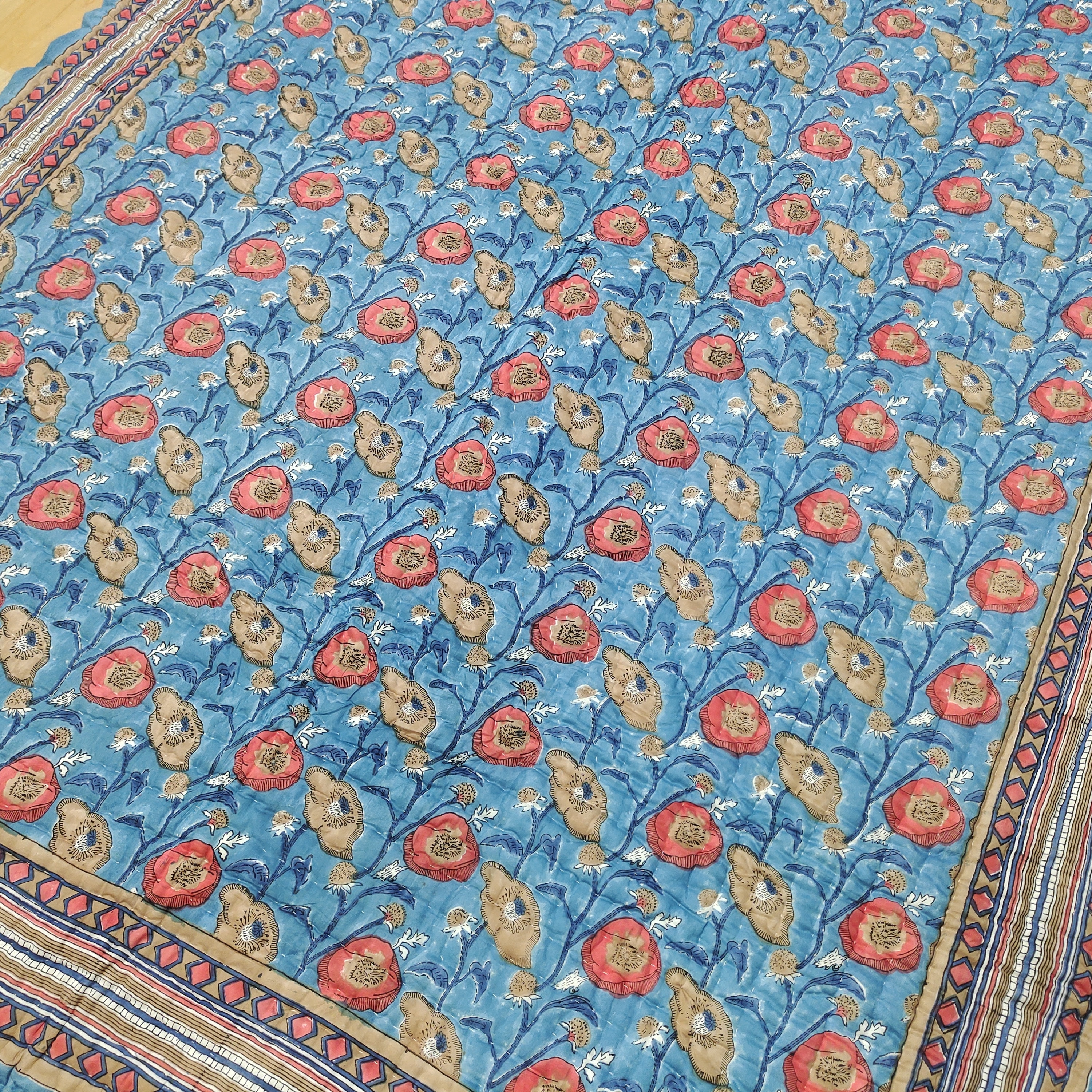 Hand Block Printed Cotton Quilt: Floral Jaipuri Razai Bedspread