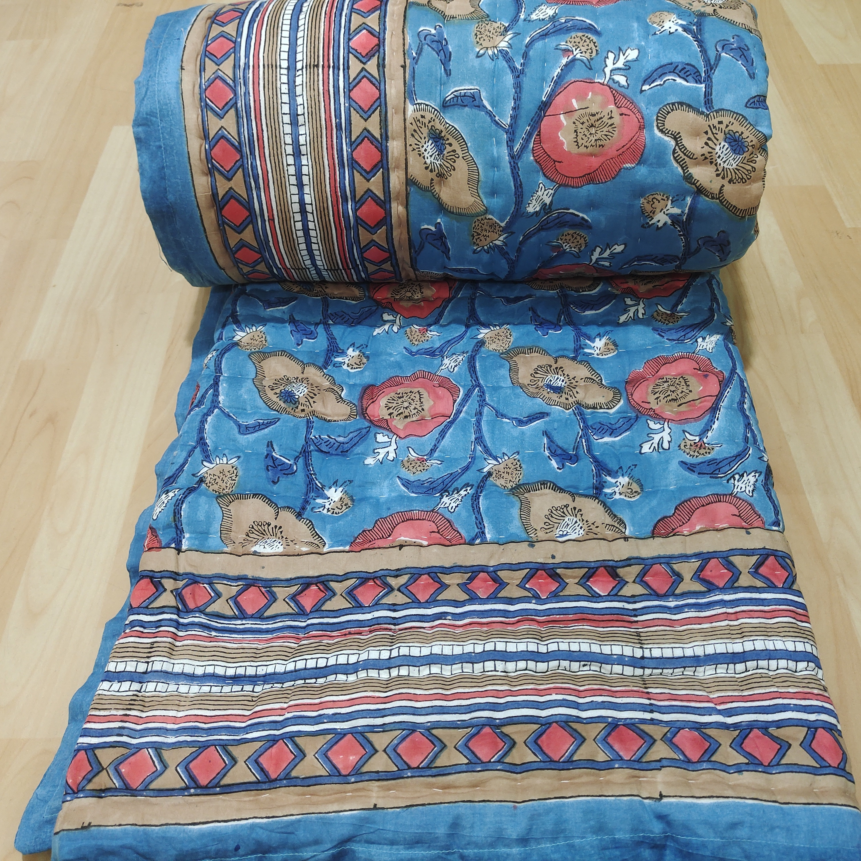 Indulge in the artistry of traditional craftsmanship with our exquisite Hand Stitched Hand Block Print Quilt. Each quilt is a masterpiece of skill and creativity, meticulously crafted by skilled artisans in Jaipur, India. From the intricate hand block printing to the careful stitching, every step in the process is a labor of love, resulting in a quilt that's as beautiful as it is functional.