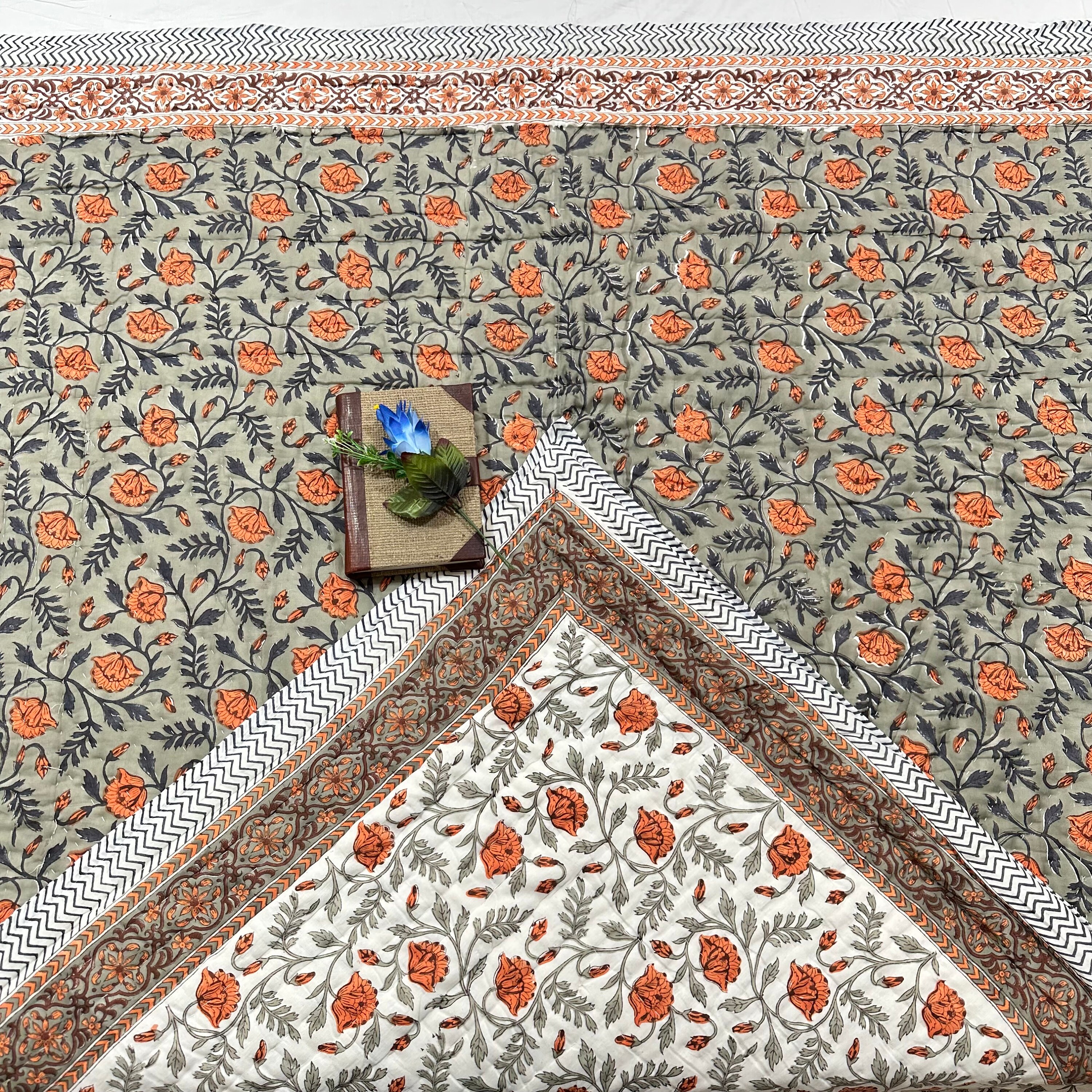 Hand Stitched Floral Quilt: Indian Hand Block Print Cotton Blanket