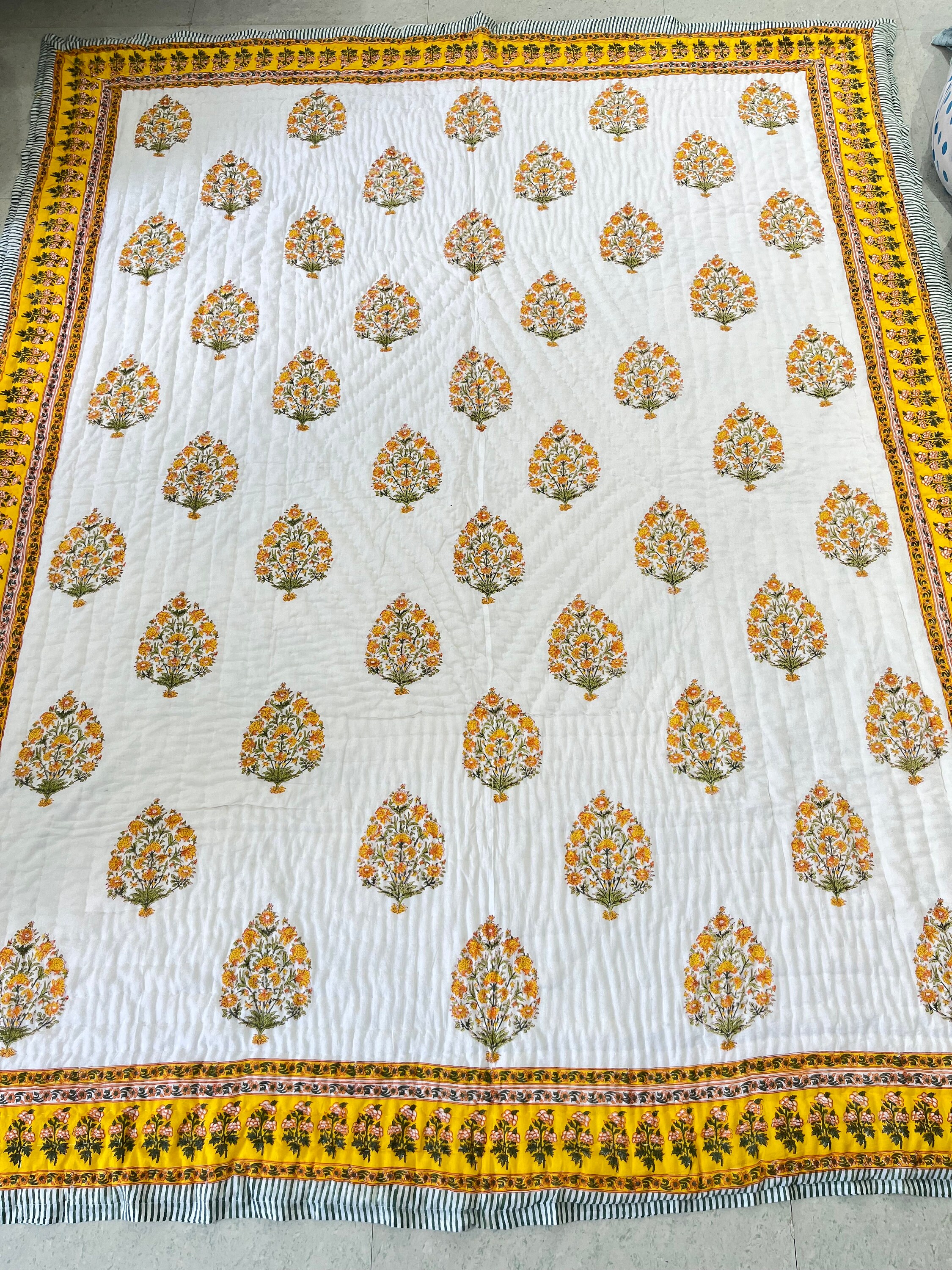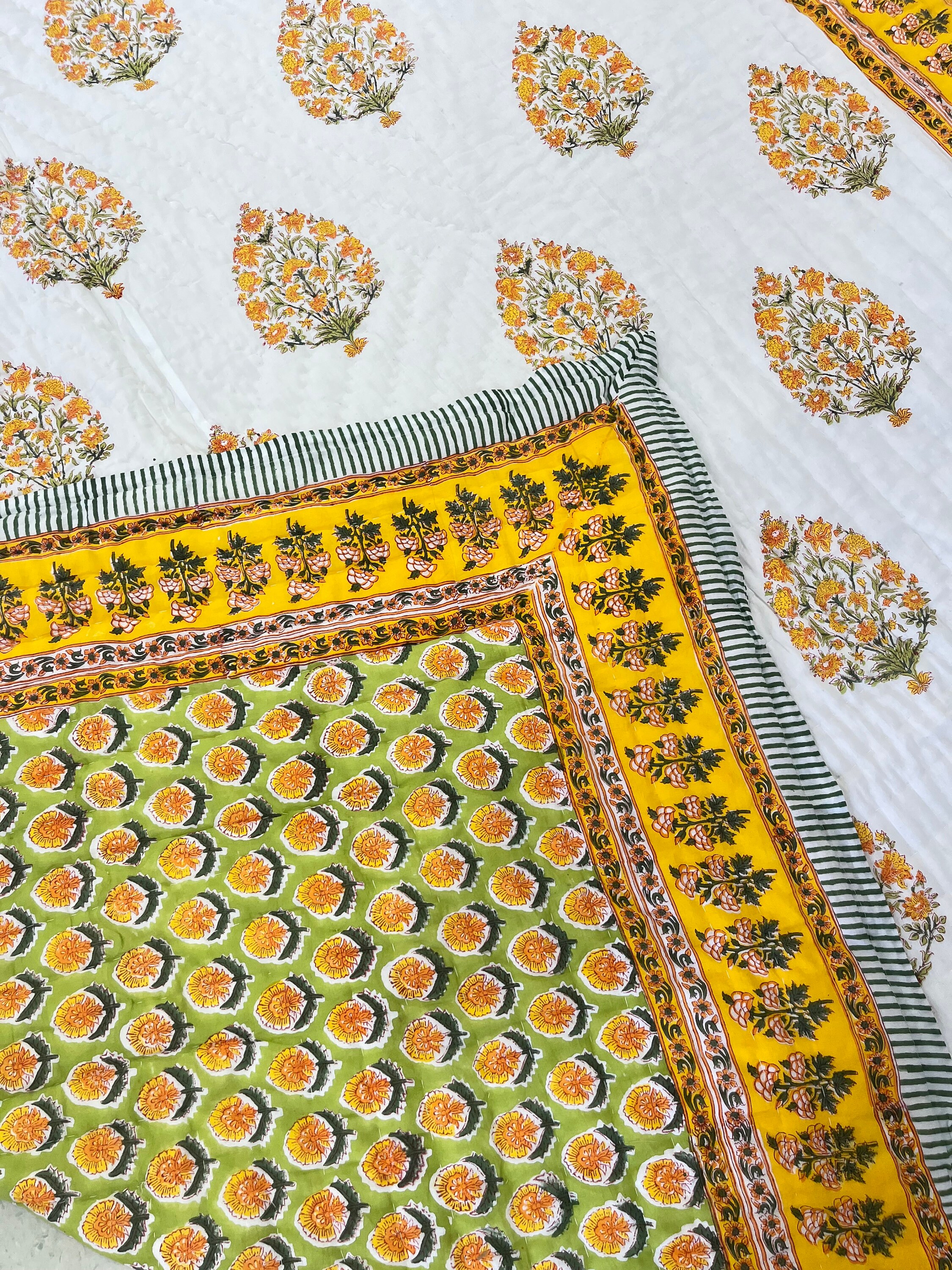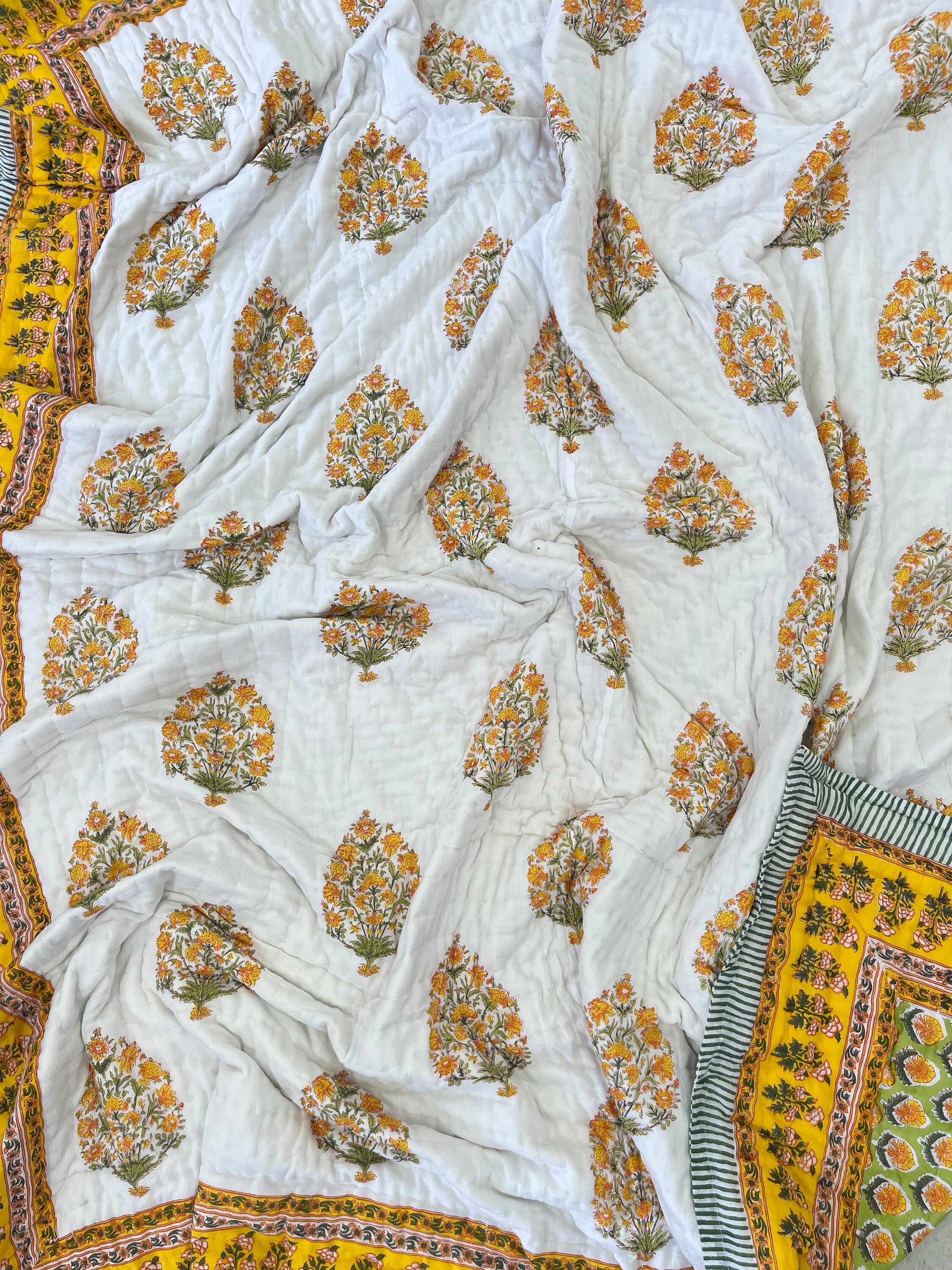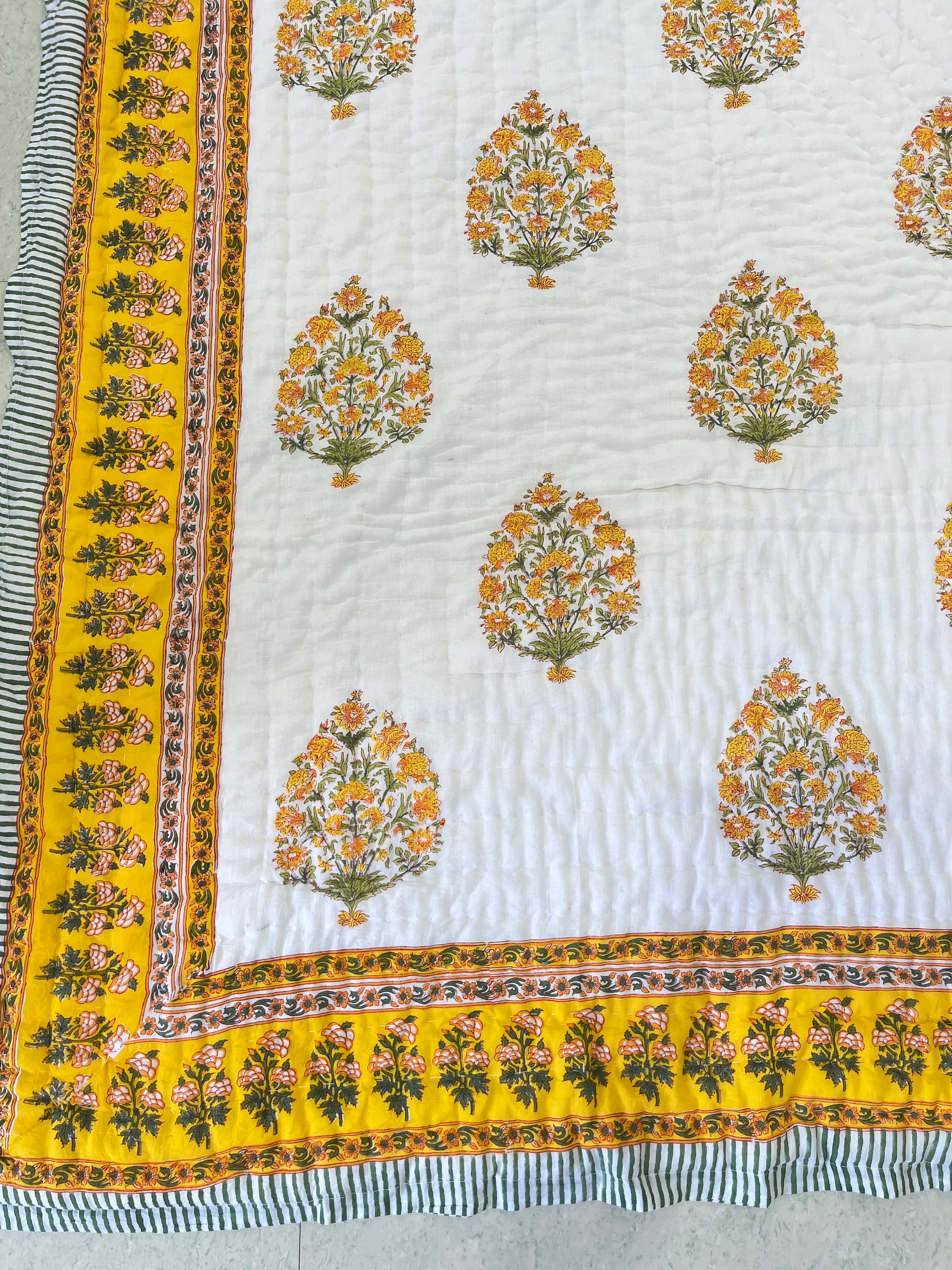 Hand Block Printed Cotton Quilt: Yellow Floral Mughal Border, Reversible Comforter