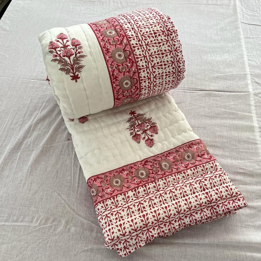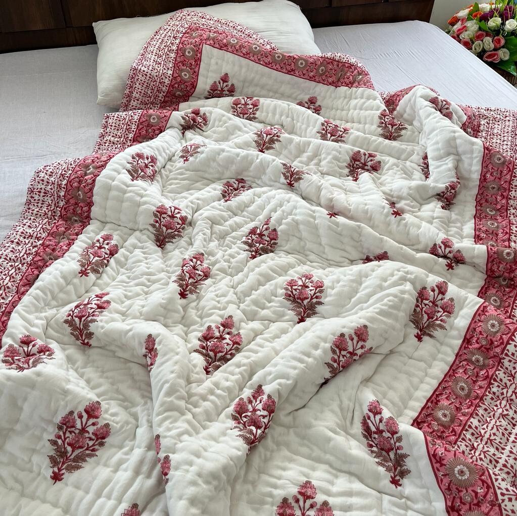 Indulge in the artistry of traditional craftsmanship with our exquisite Hand Stitched Hand Block Print Quilt. Each quilt is a masterpiece of skill and creativity, meticulously crafted by skilled artisans in Jaipur, India. From the intricate hand block printing to the careful stitching, every step in the process is a labor of love, resulting in a quilt that's as beautiful as it is functional.