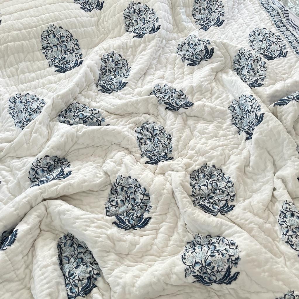 Indulge in the artistry of traditional craftsmanship with our exquisite Hand Stitched Hand Block Print Quilt. Each quilt is a masterpiece of skill and creativity, meticulously crafted by skilled artisans in Jaipur, India. From the intricate hand block printing to the careful stitching, every step in the process is a labor of love, resulting in a quilt that's as beautiful as it is functional.