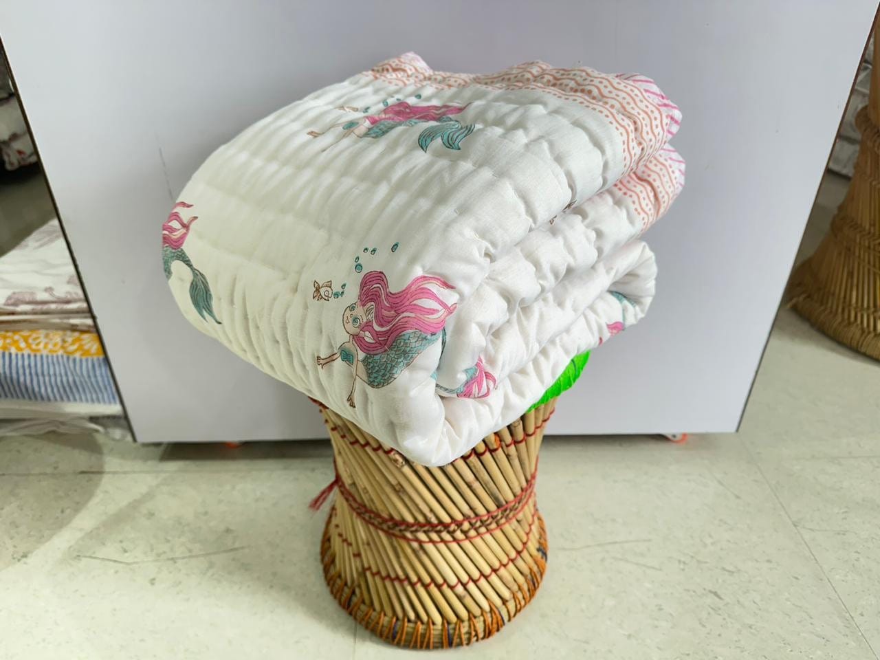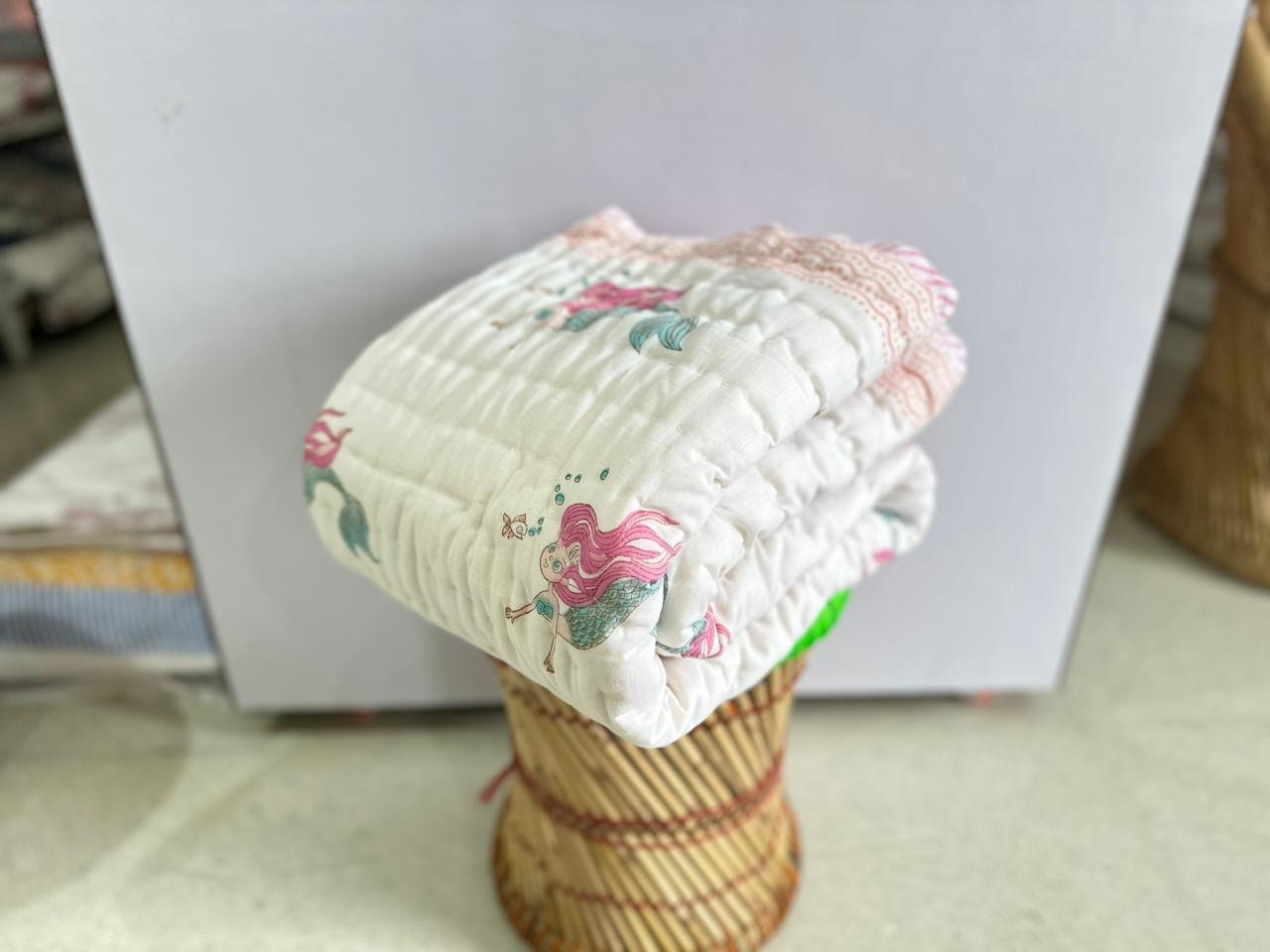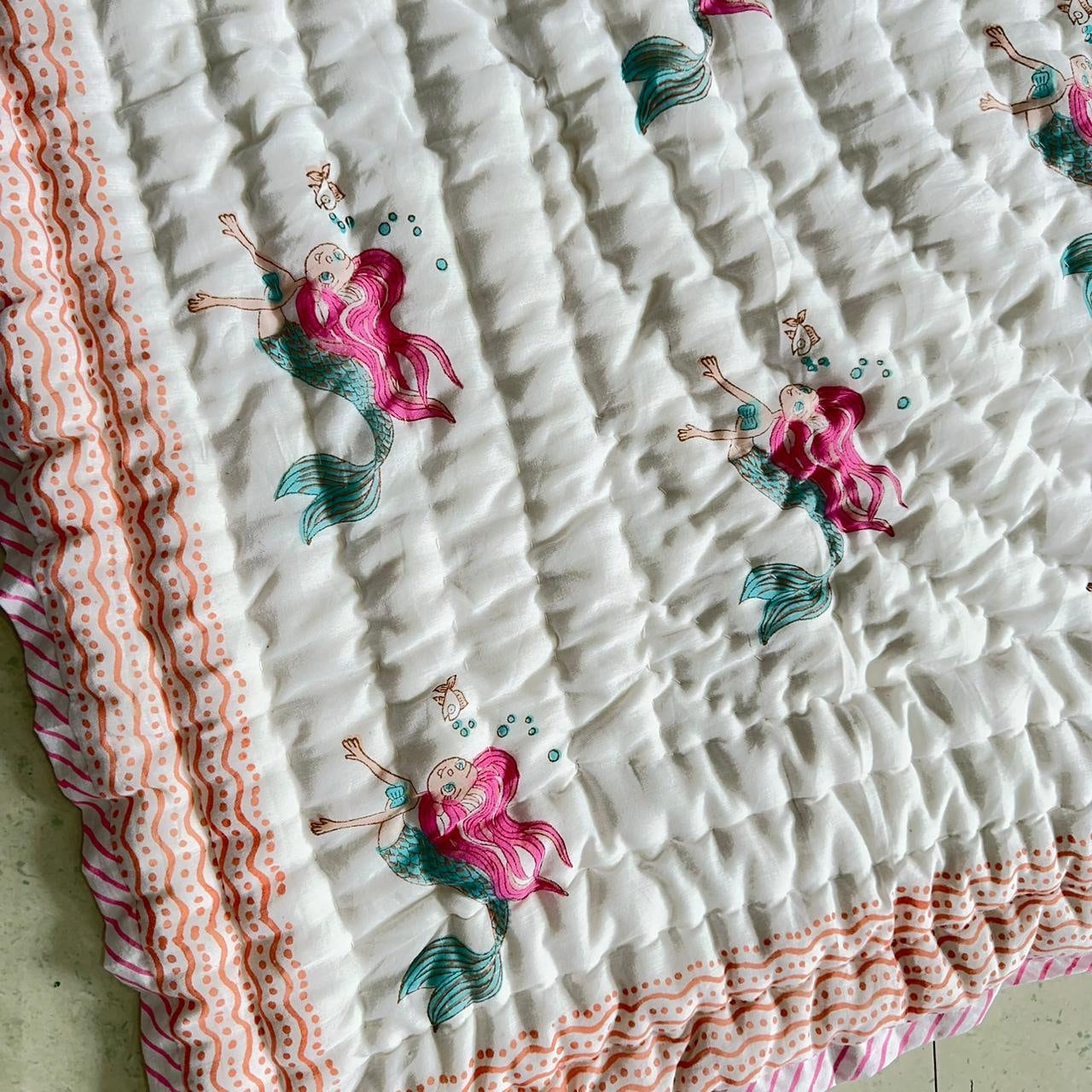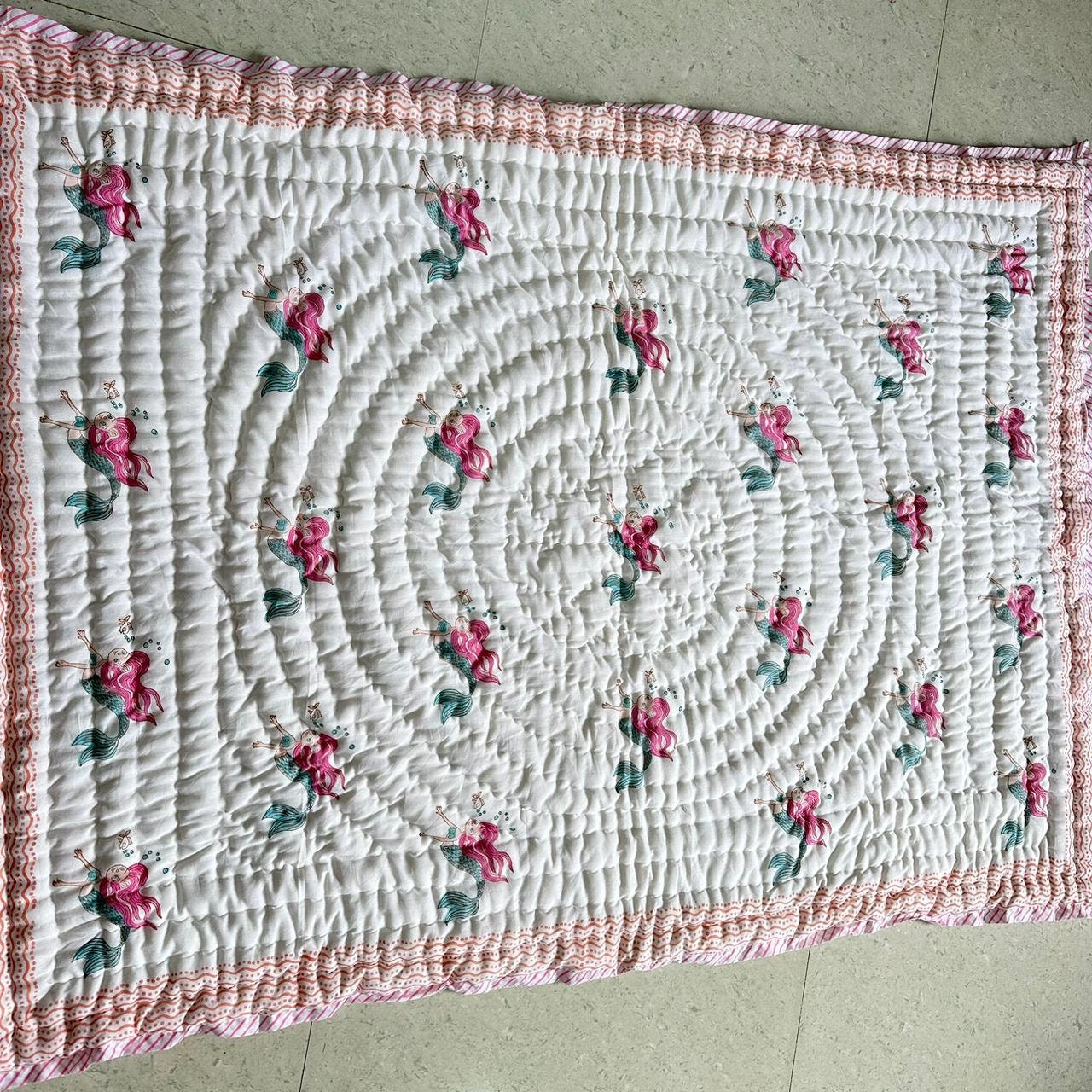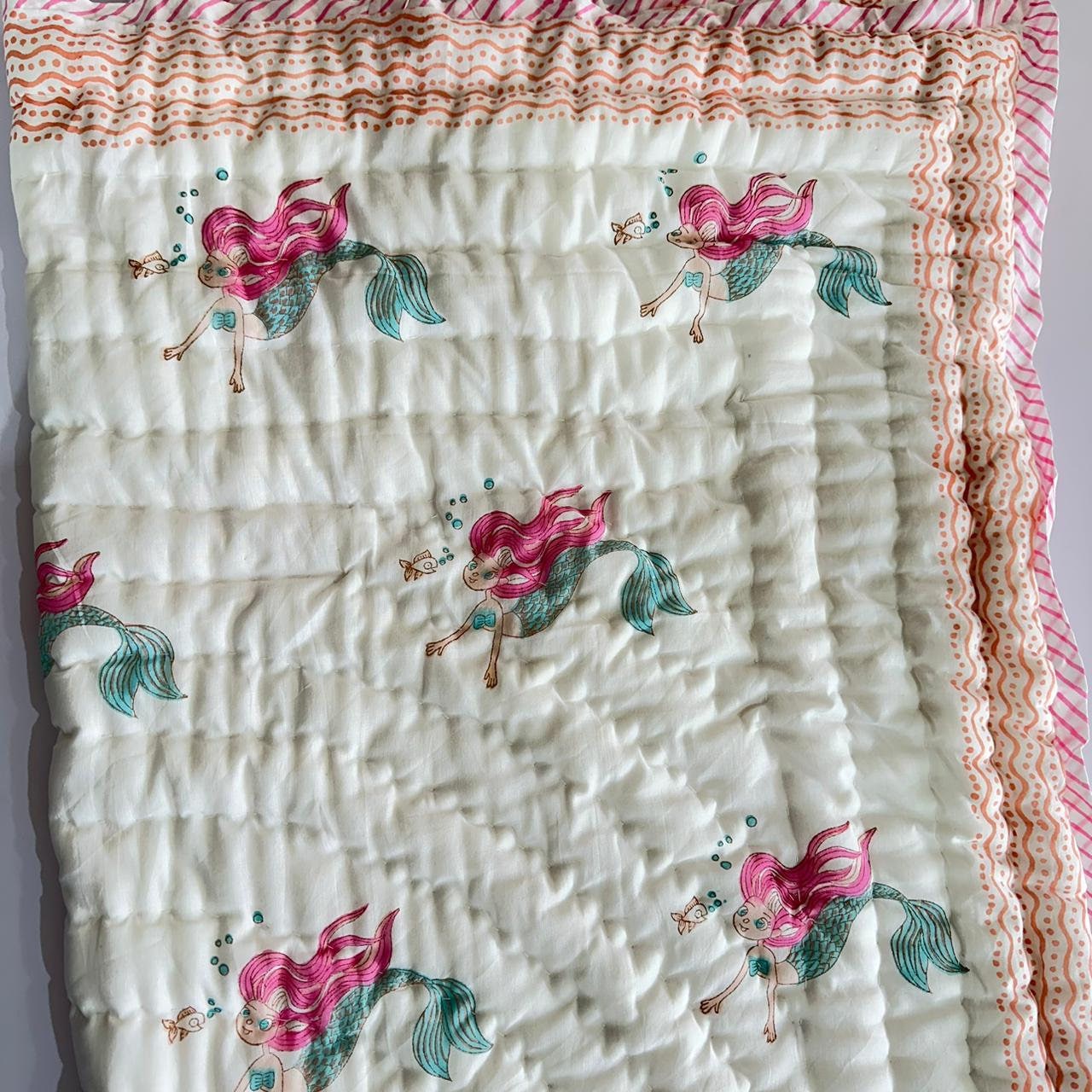 Hand Block Print Baby Quilt: Mermaid Design Cotton Mulmul Blanket