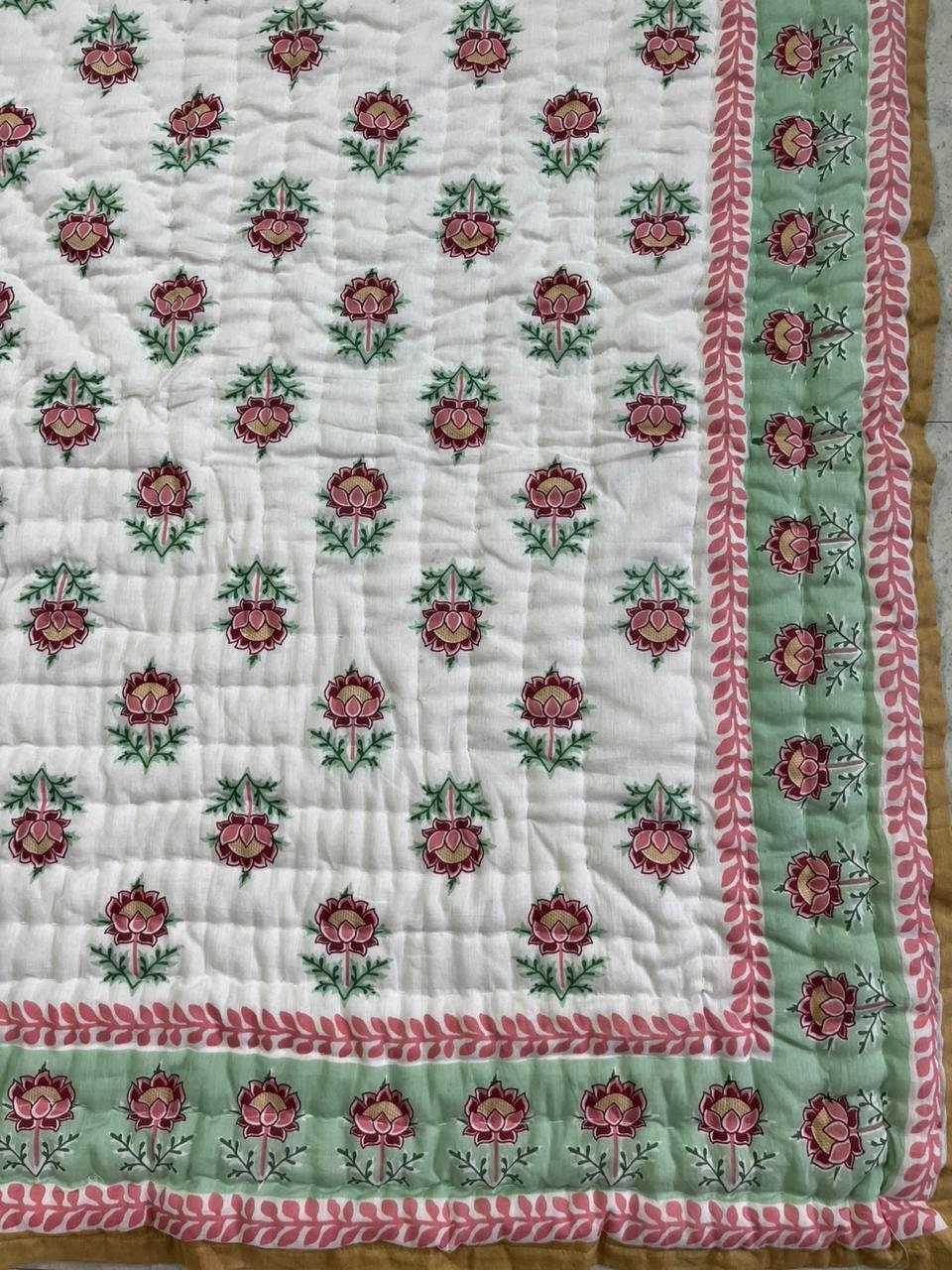 Indulge in the artistry of traditional craftsmanship with our exquisite Hand Stitched Hand Block Print Quilt. Each quilt is a masterpiece of skill and creativity, meticulously crafted by skilled artisans in Jaipur, India. From the intricate hand block printing to the careful stitching, every step in the process is a labor of love, resulting in a quilt that's as beautiful as it is functional.
