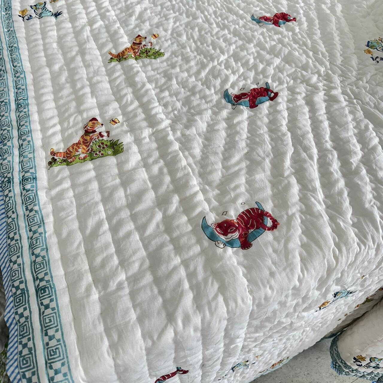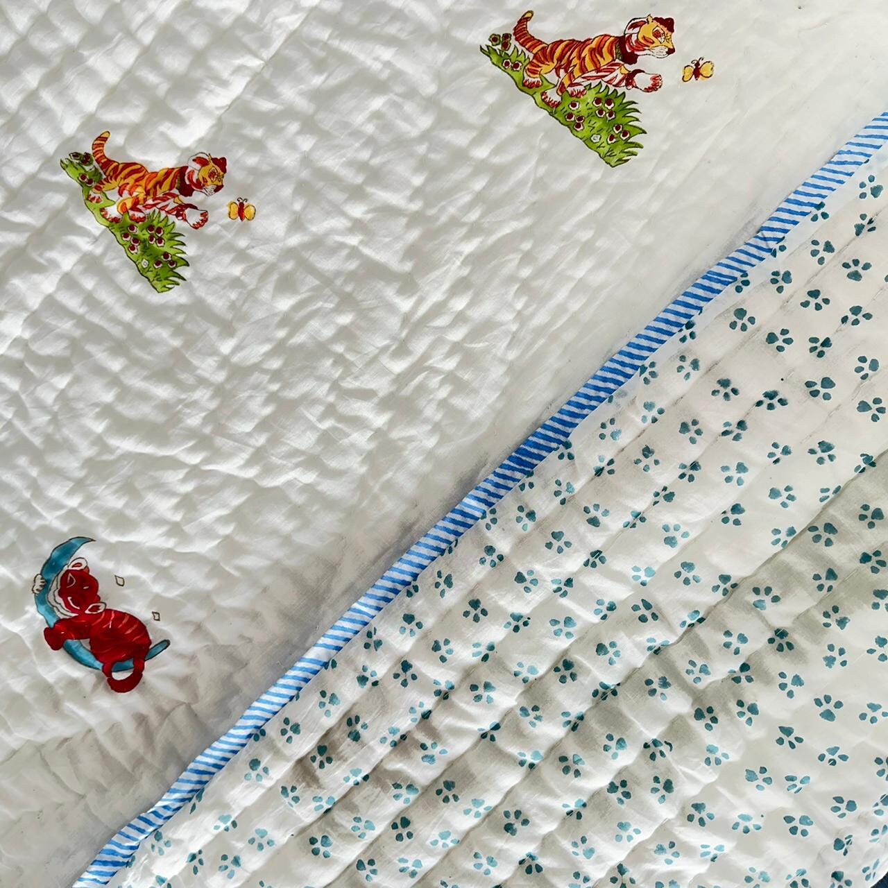 Wrap your baby in warmth and luxury with our Hand Block Printed Baby Quilt, featuring delightful hand block printing on soft Malmal cotton fabric. Filled with natural loose cotton, it offers unparalleled comfort and coziness, perfect for keeping your little one snug and warm. The quilt is double thread hand-stitched throughout, ensuring durability and charm. Sized perfectly for babies, it's the ideal addition to any nursery decor.