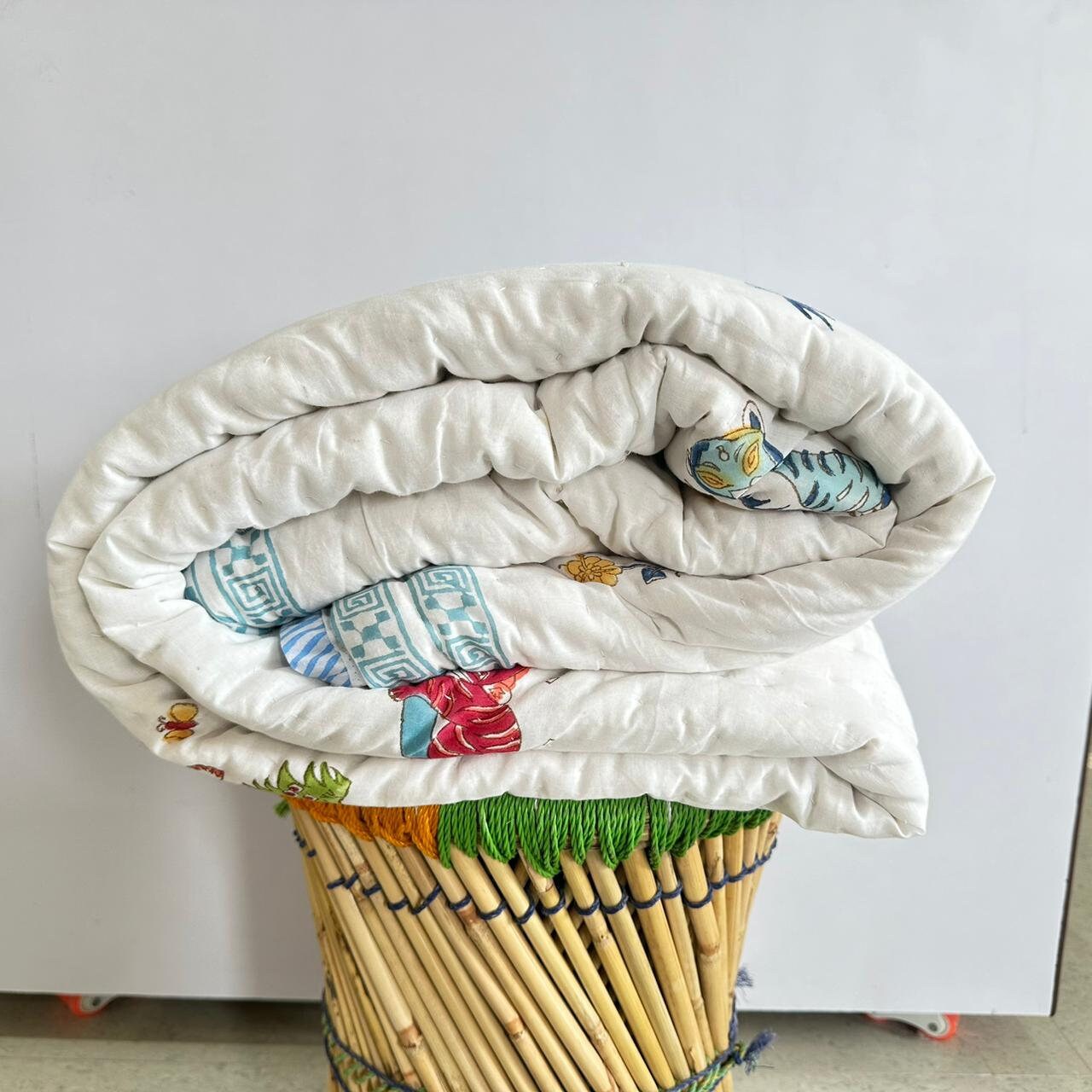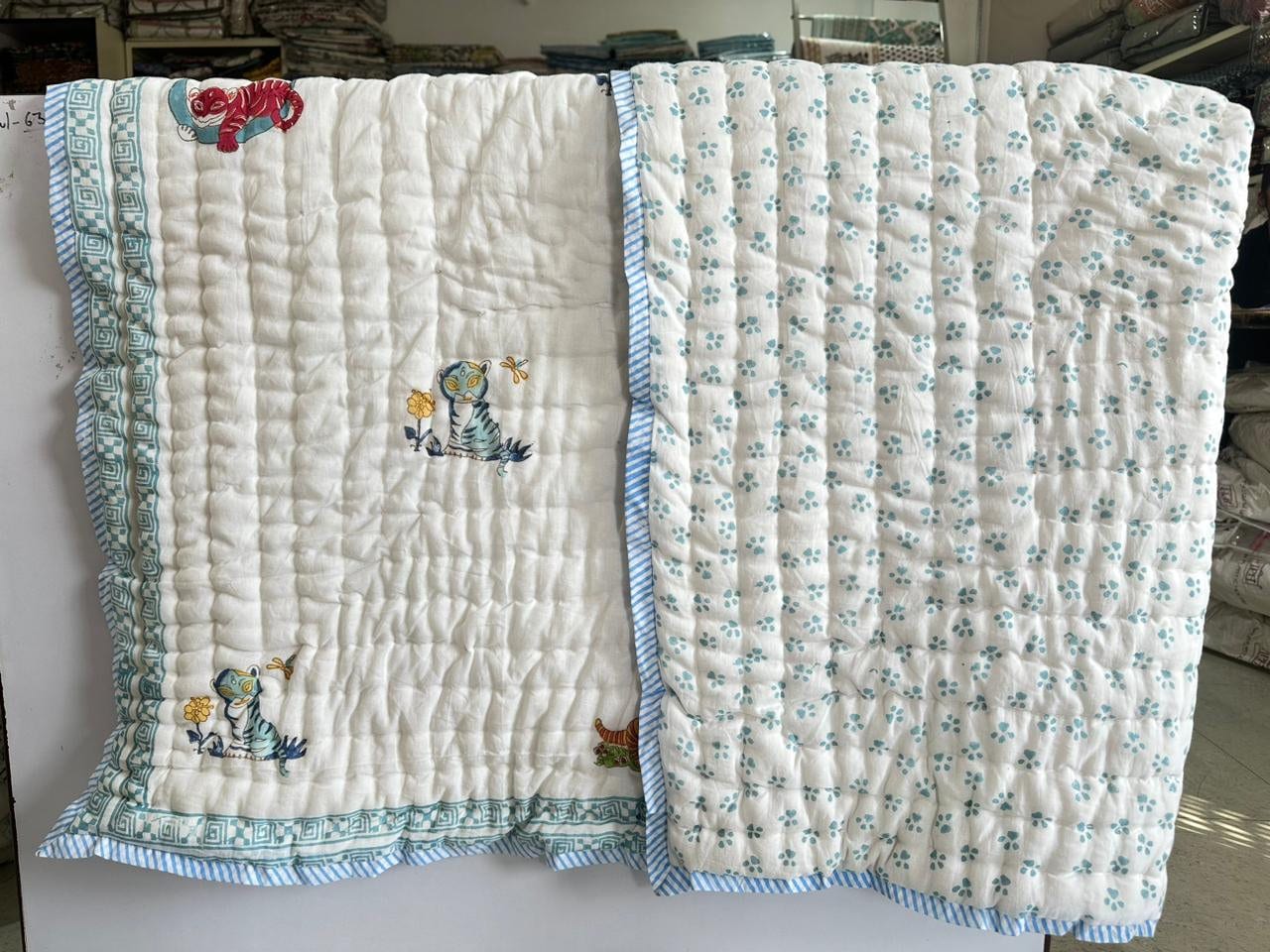 Elevate your nursery decor with our charming Hand Block Printed Baby Quilt and AC Blanket (Dohar), crafted from premium Malmal cotton fabric. Each piece is a testament to the timeless artistry of hand block printing, meticulously created to enhance your little one's comfort and style.