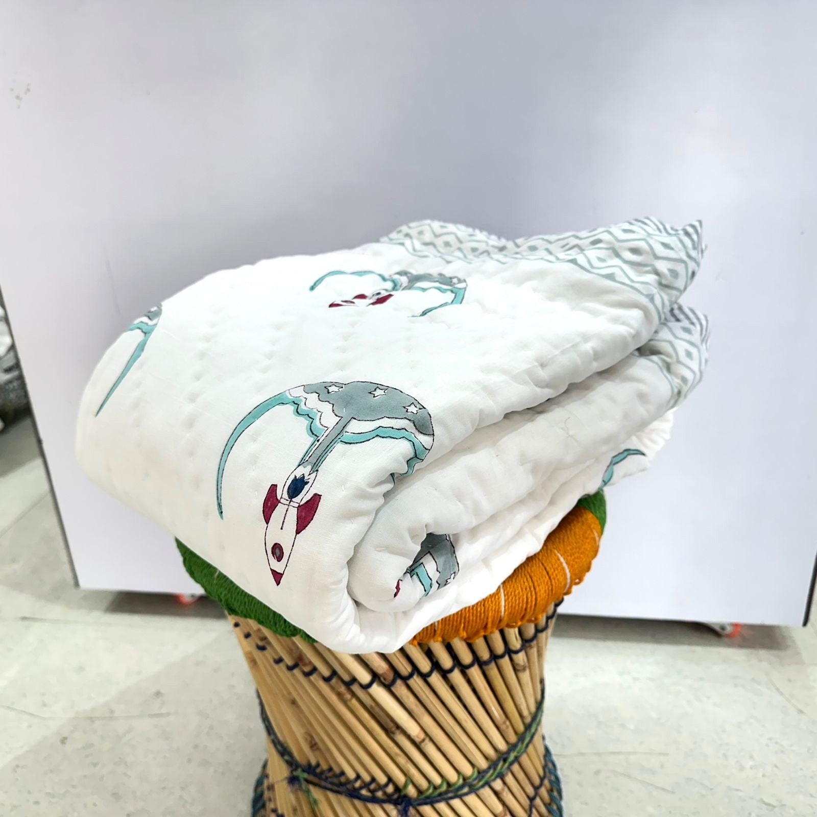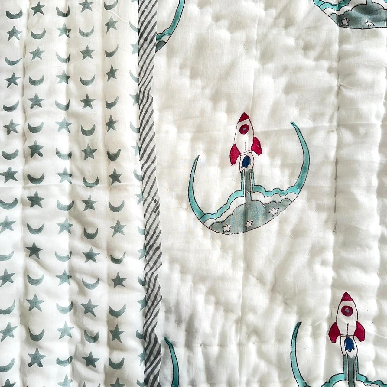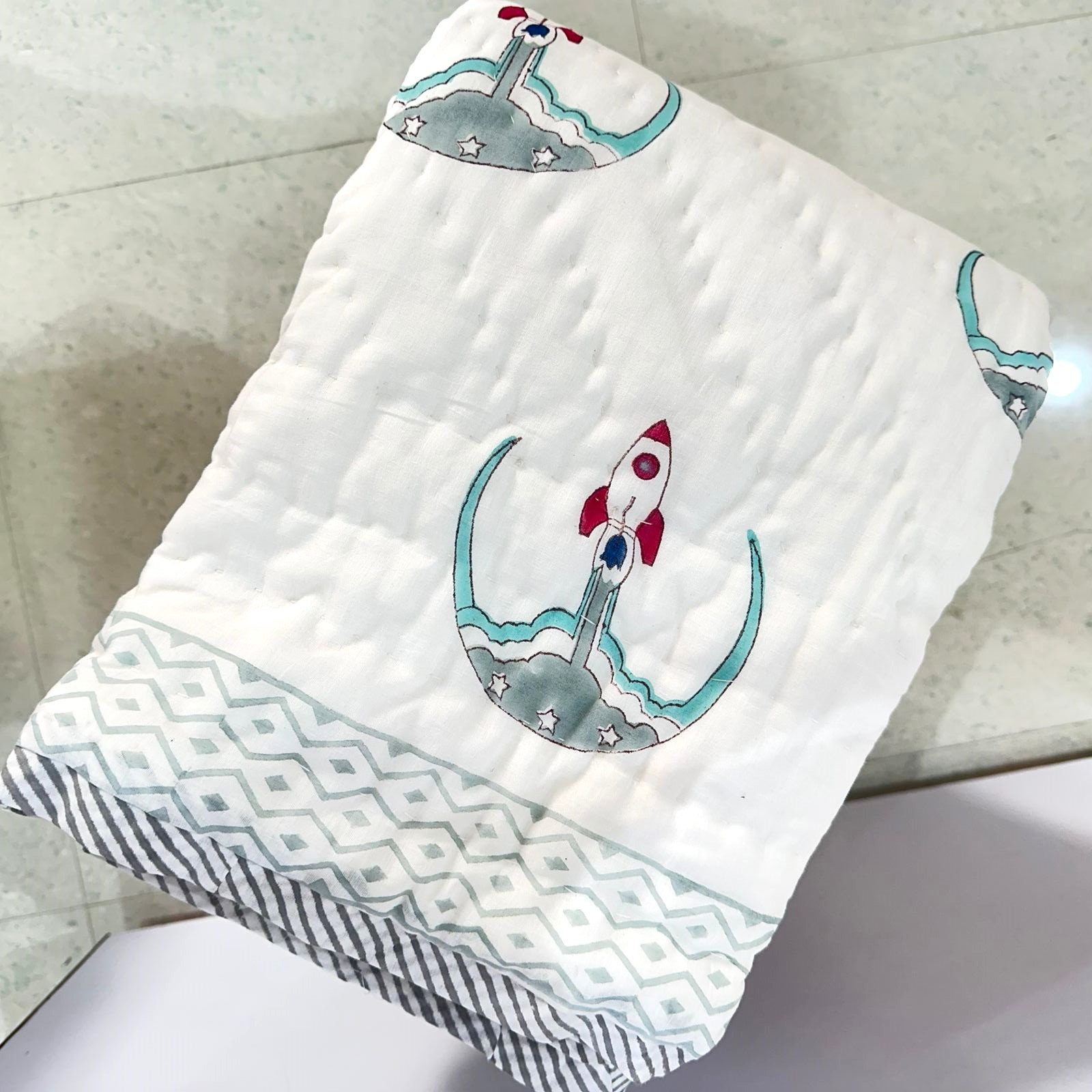 Policy- Buyer Are Responsible to Pay Duty and Taxes Charges,New Rocket Launcher Design Block Print Cotton Comforter, Handmade Baby Quilt, Warm Winter Filling For Baby Bedding
