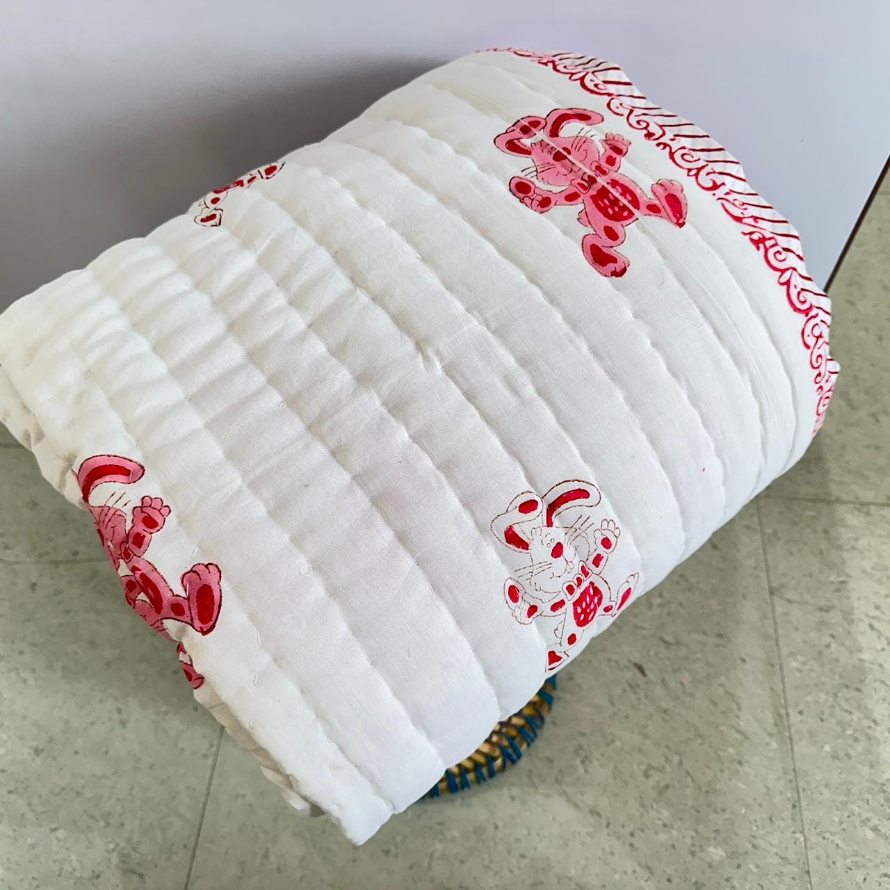 Add a touch of whimsy to your nursery decor with our Hand Block Printed Crib Quilt. Featuring a charming rabbit design in soft pink, this quilt is perfect for keeping your little one snug and cozy during naptime or playtime. Measuring 40 by 60 inches, it's the ideal size for a crib or toddler bed. Filled with natural loose cotton, it offers unmatched comfort and warmth for your baby. The quilt is double thread hand-stitched for durability and charm, making it a must-have addition to your nursery.