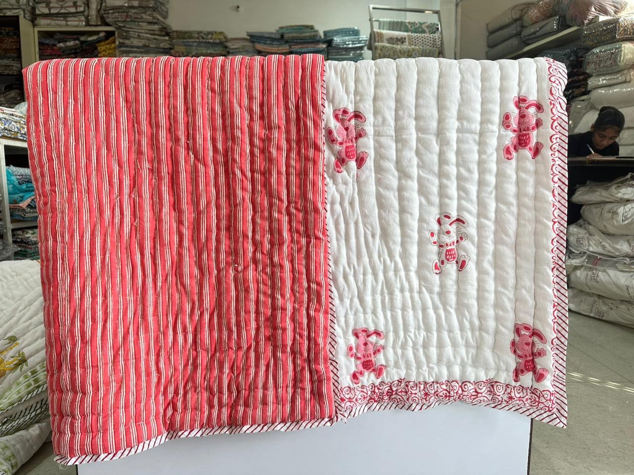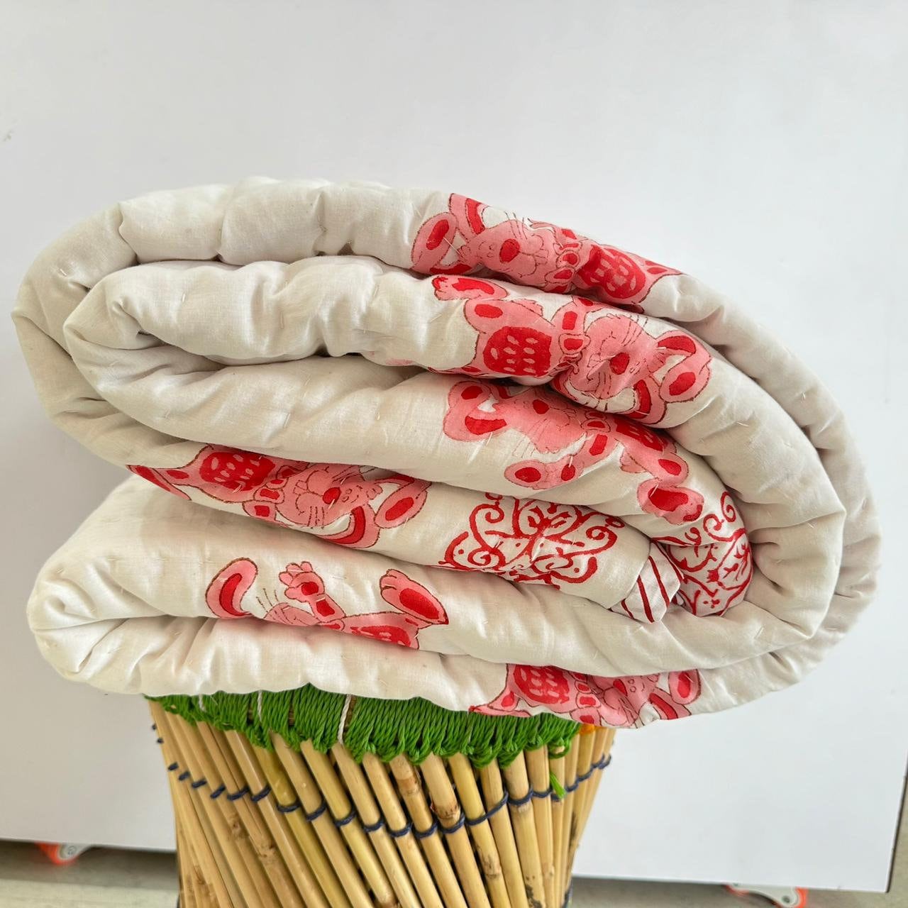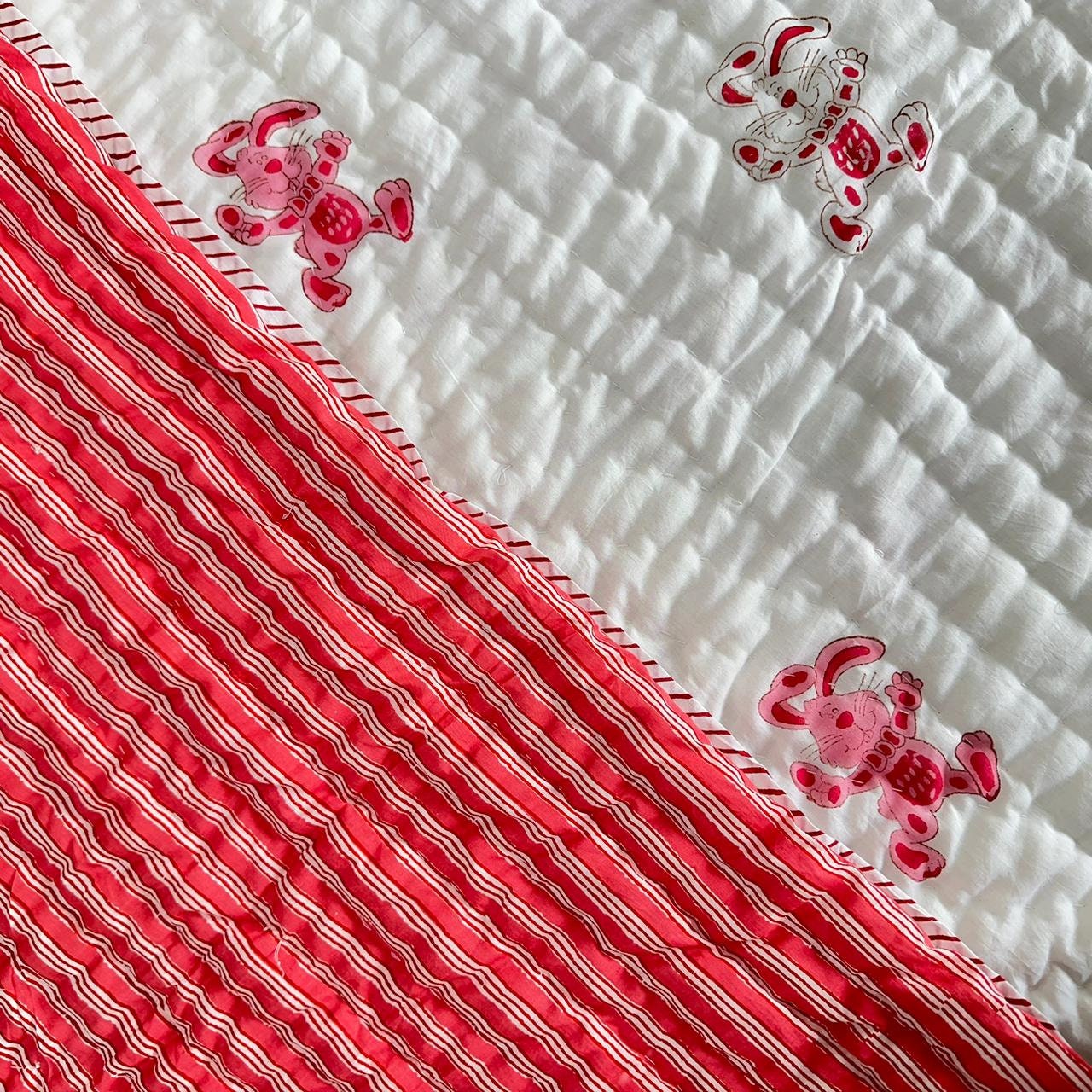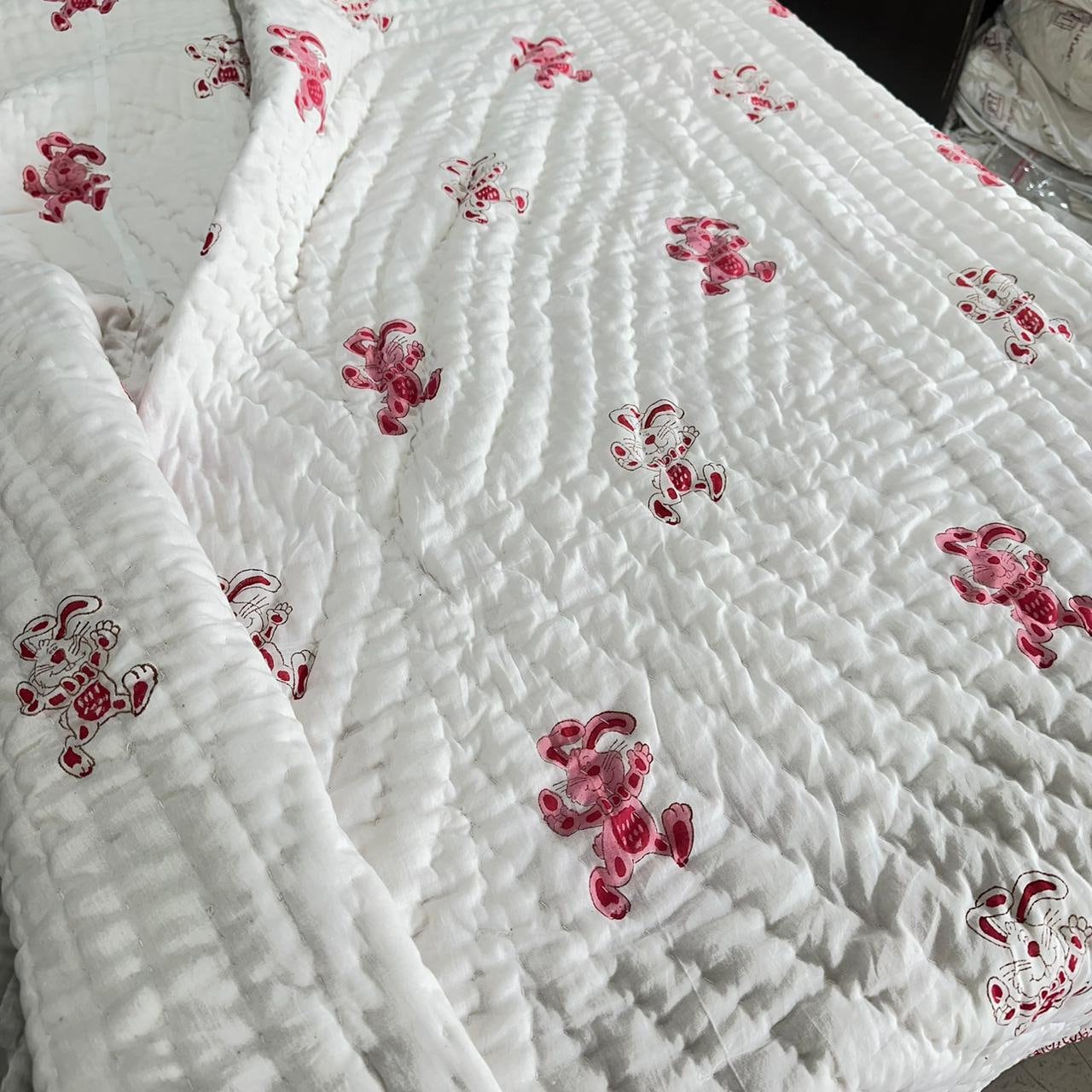 Transform your nursery into a cozy haven with our Hand Block Printed Crib Quilt and AC Blanket (Dohar) set featuring a delightful rabbit design in soft pink. Add a touch of charm and warmth to your little one's space today!International Shipping & Customs Notice We are proud to ship our handmade cotton quilts worldwide from Jaipur, India. Please be advised: