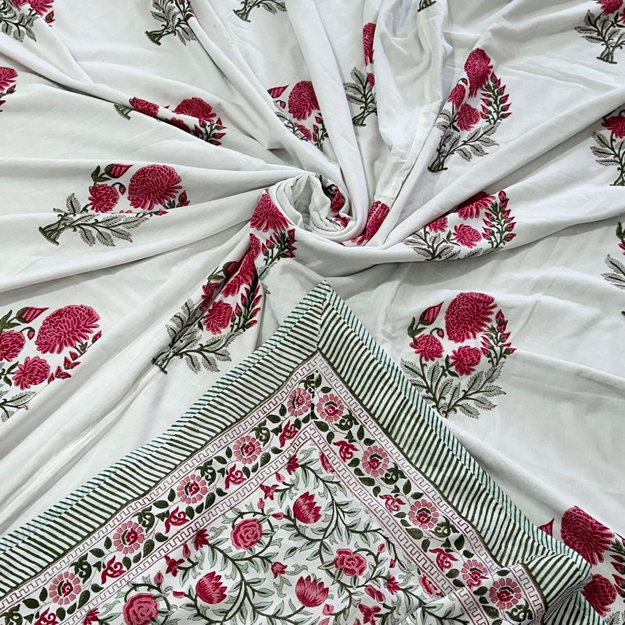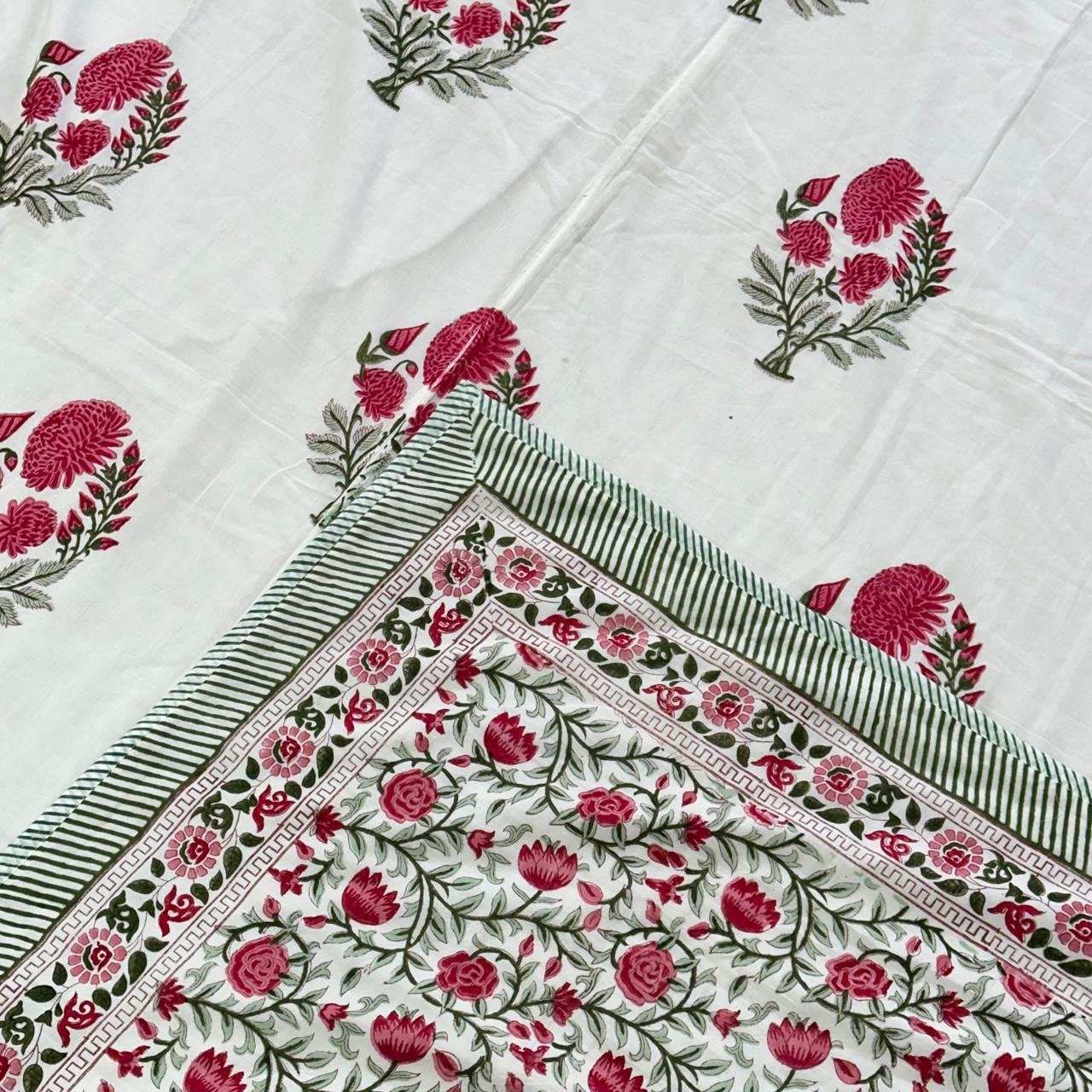 For those who prefer extra thickness and warmth, we also offer a hand-stitched quilt with the same beautiful floral design. This quilt is filled with natural loose cotton for a soft, breathable, and eco-friendly feel, making it perfect for colder seasons or for adding a cozy touch to your bedroom decor.