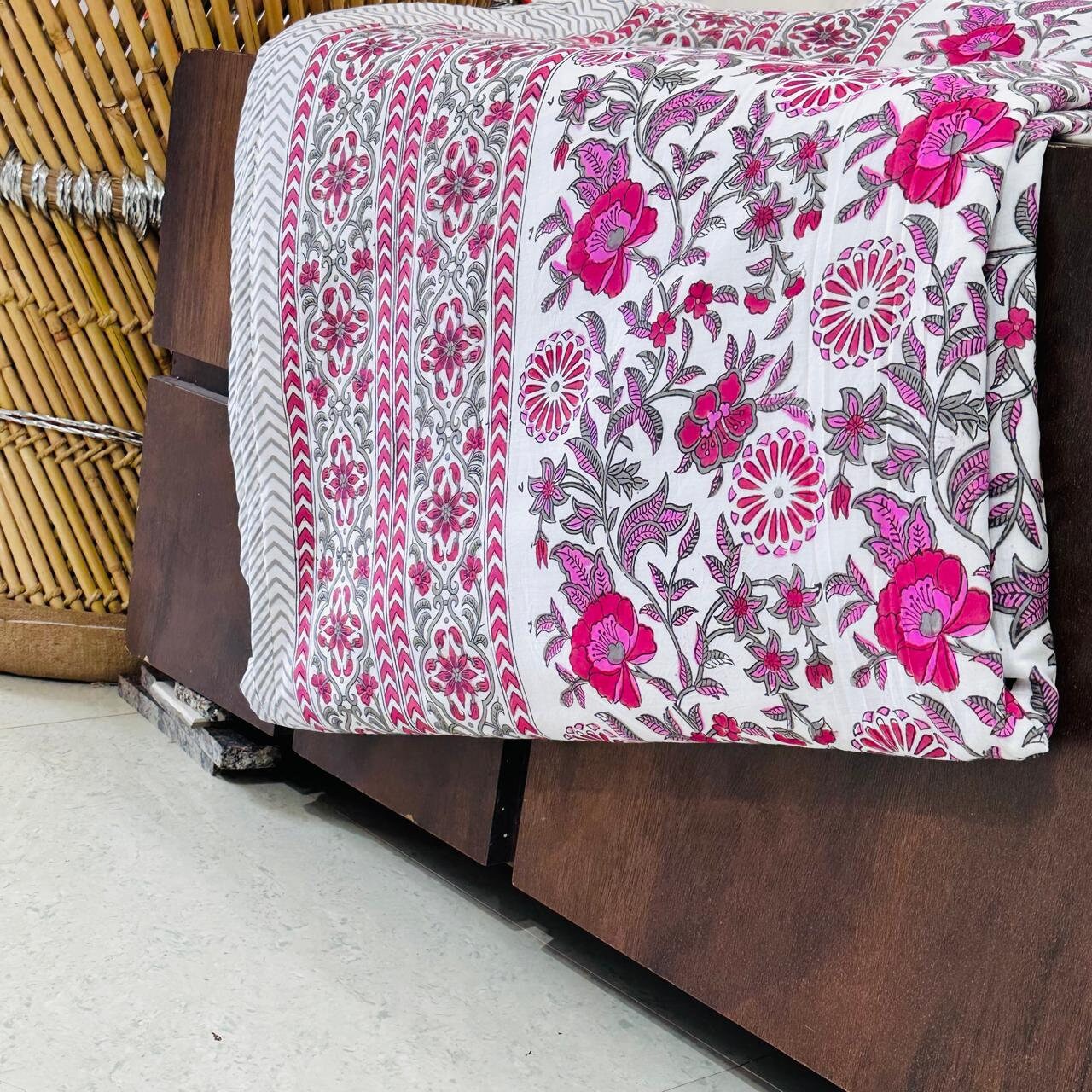 Handmade Indian Quilt: Pink Floral Block Print Cotton Dohar