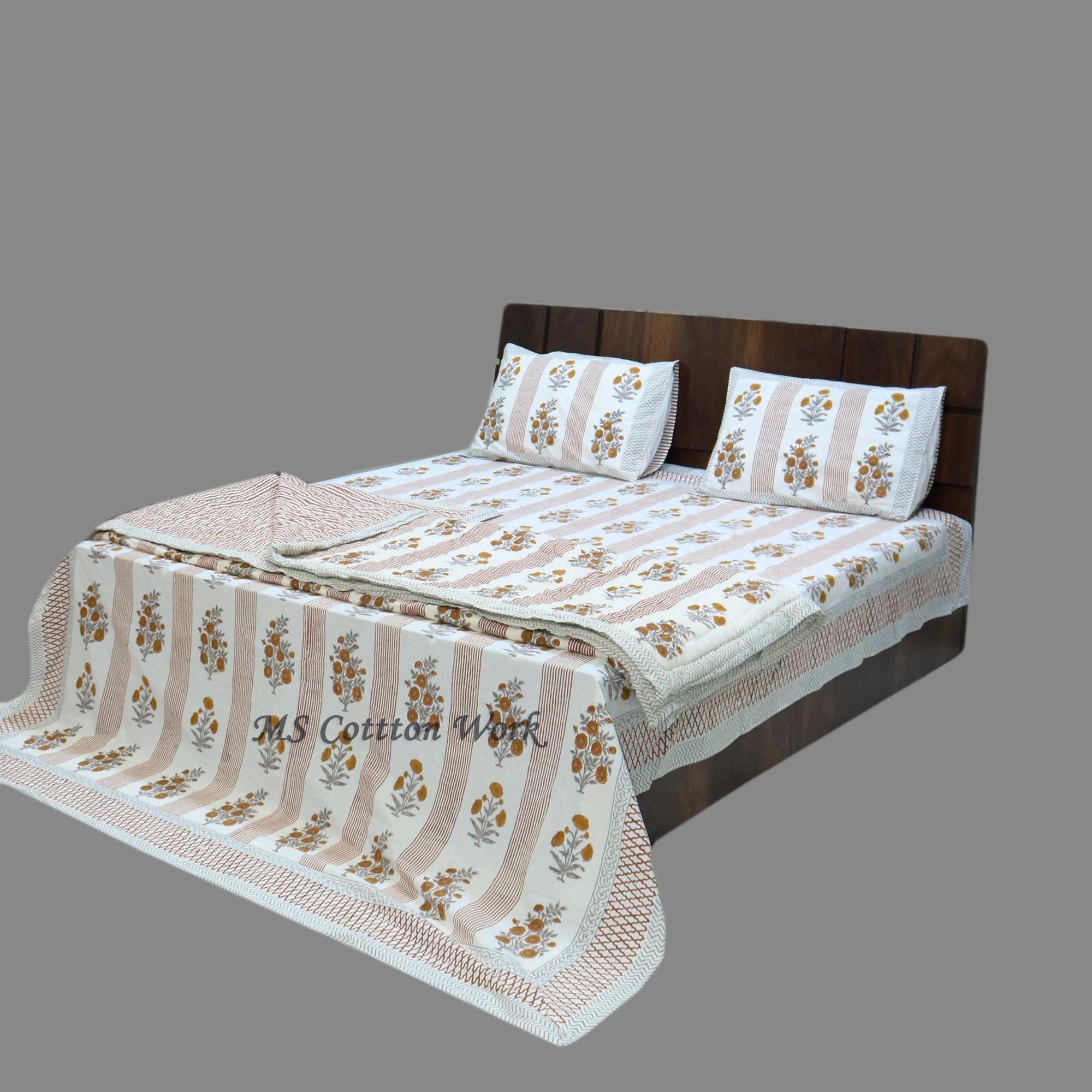 Wrap yourself in warmth and luxury with our Hand Block Printed Quilt, featuring intricate hand block printing on soft Malmal cotton fabric. Filled with natural loose cotton, it offers unparalleled comfort and coziness, perfect for colder seasons. Meticulously hand-stitched throughout, the quilt's unique design adds a touch of artistry and charm to your bedroom.