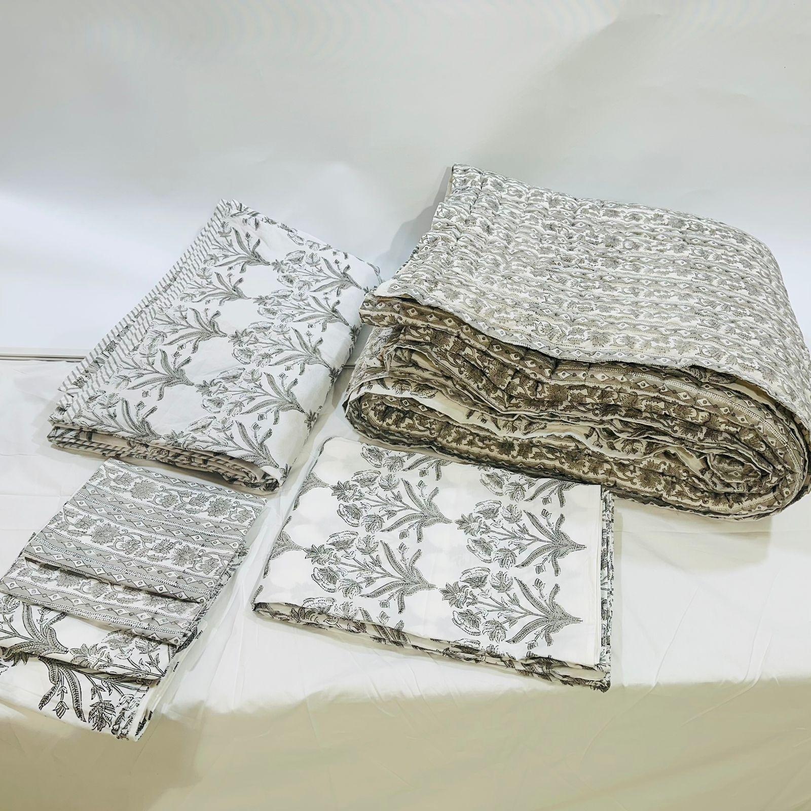 Cotton Block Print Quilt [Q.] (90x108 ) +Dohar [D.] (90x108 ) + (Bedsheet With 2 Pillow Cover) + 2 Pillow Cover - {18x28"} Inch