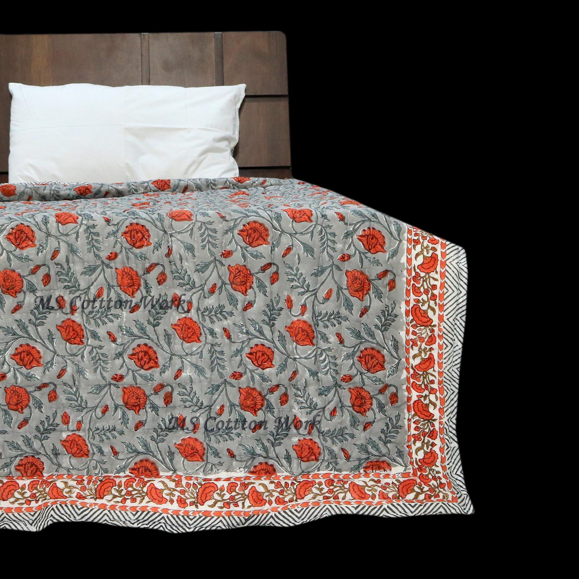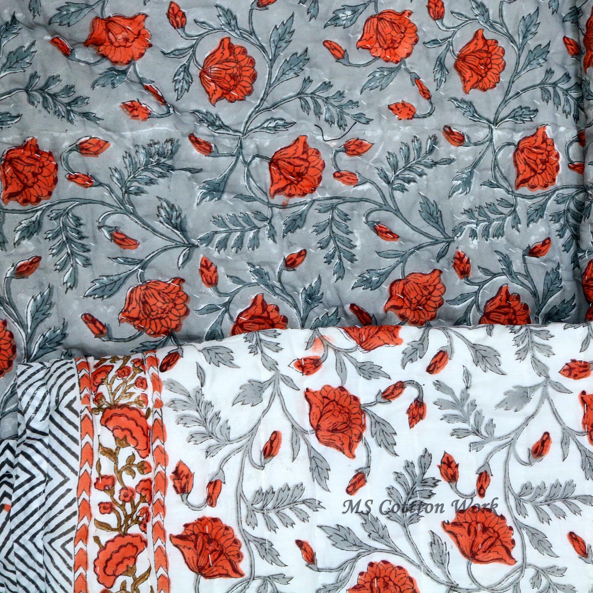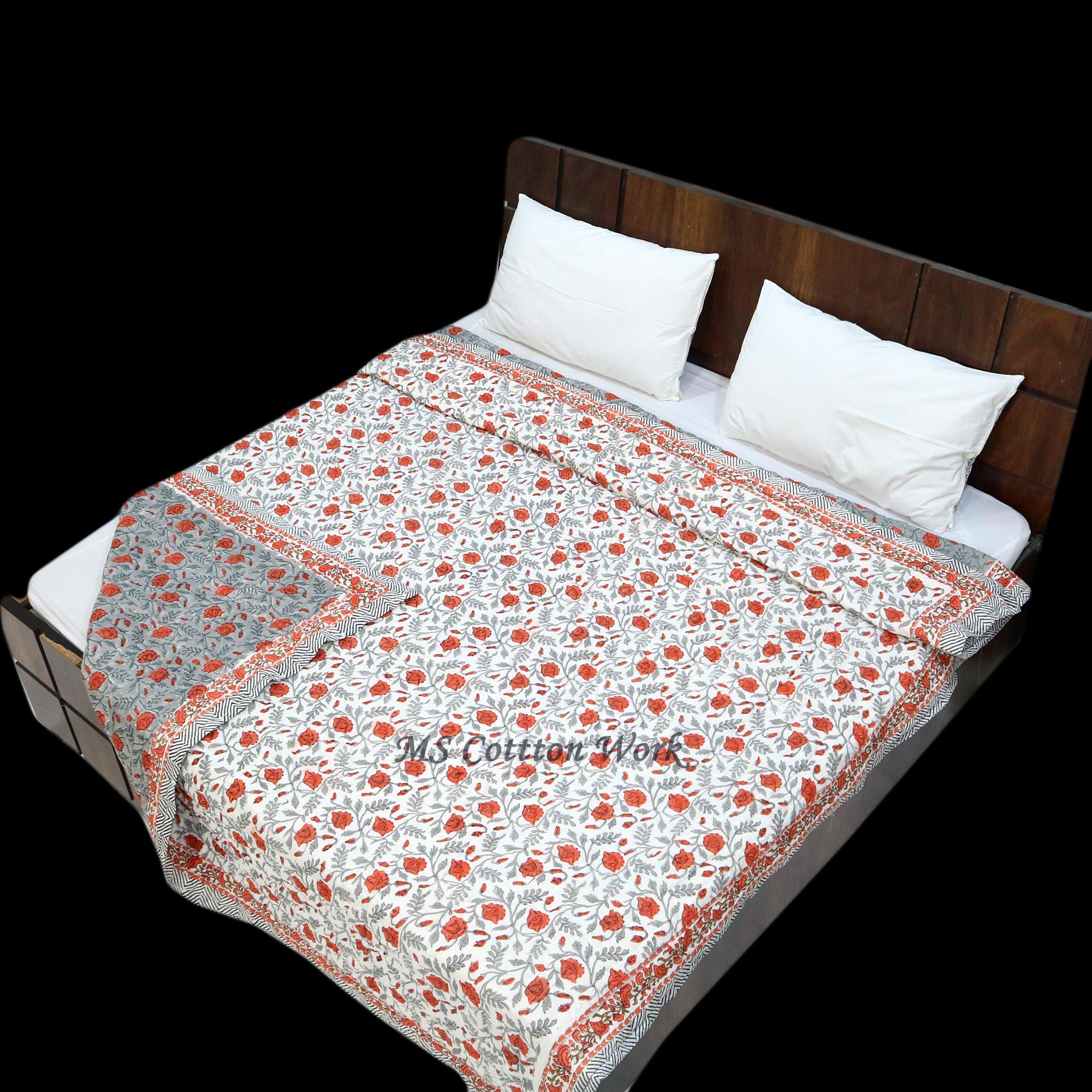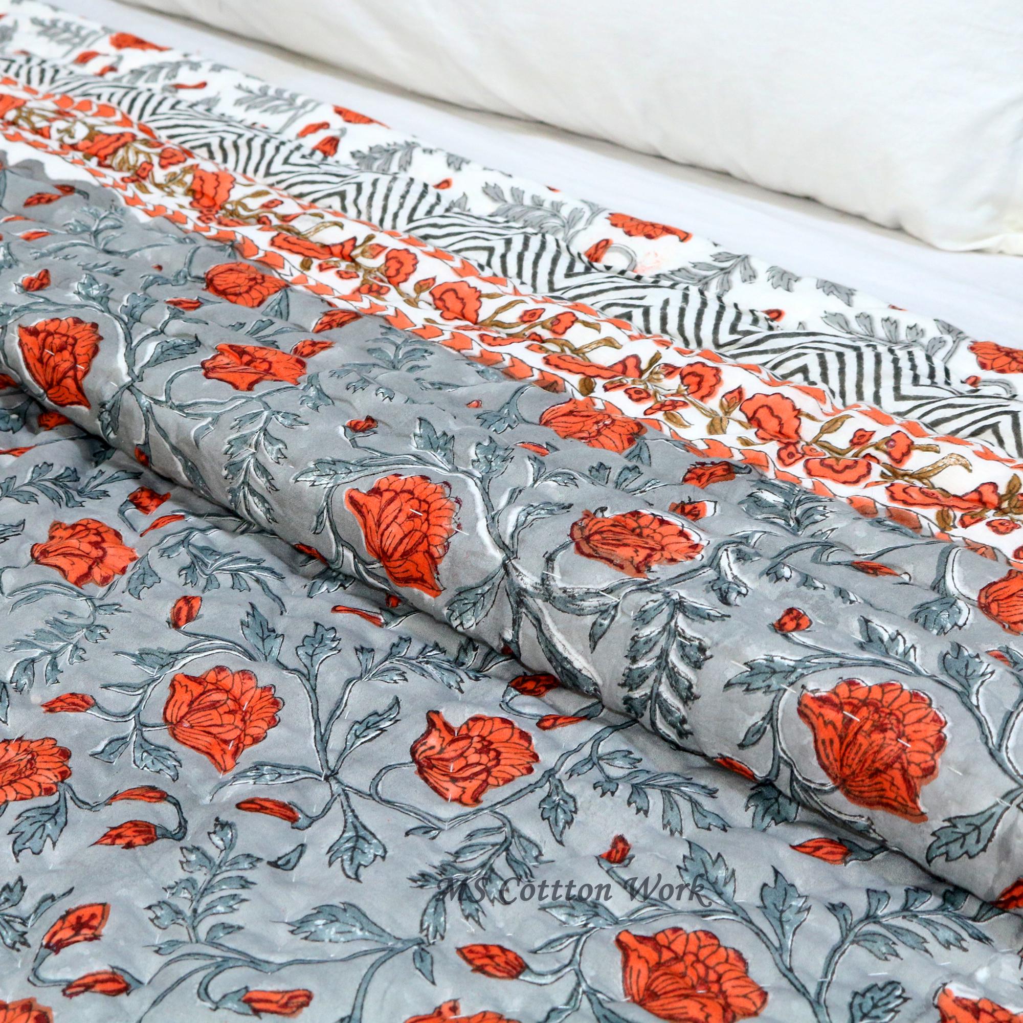 Hand Block Print Cotton Quilt: Reversible Floral Indian Bedding
