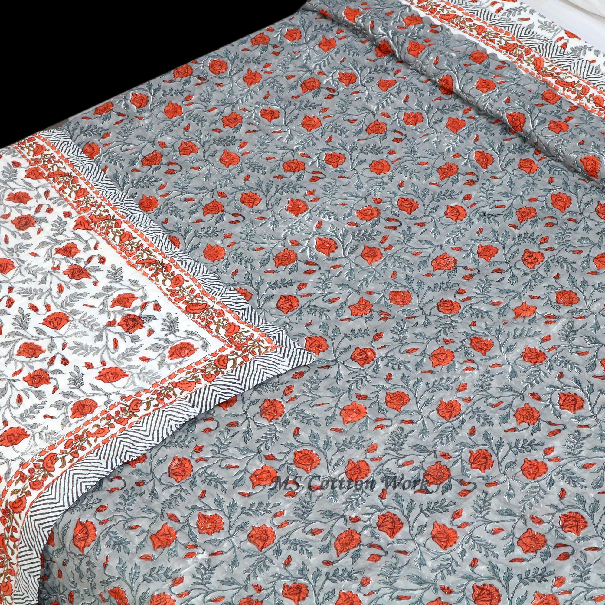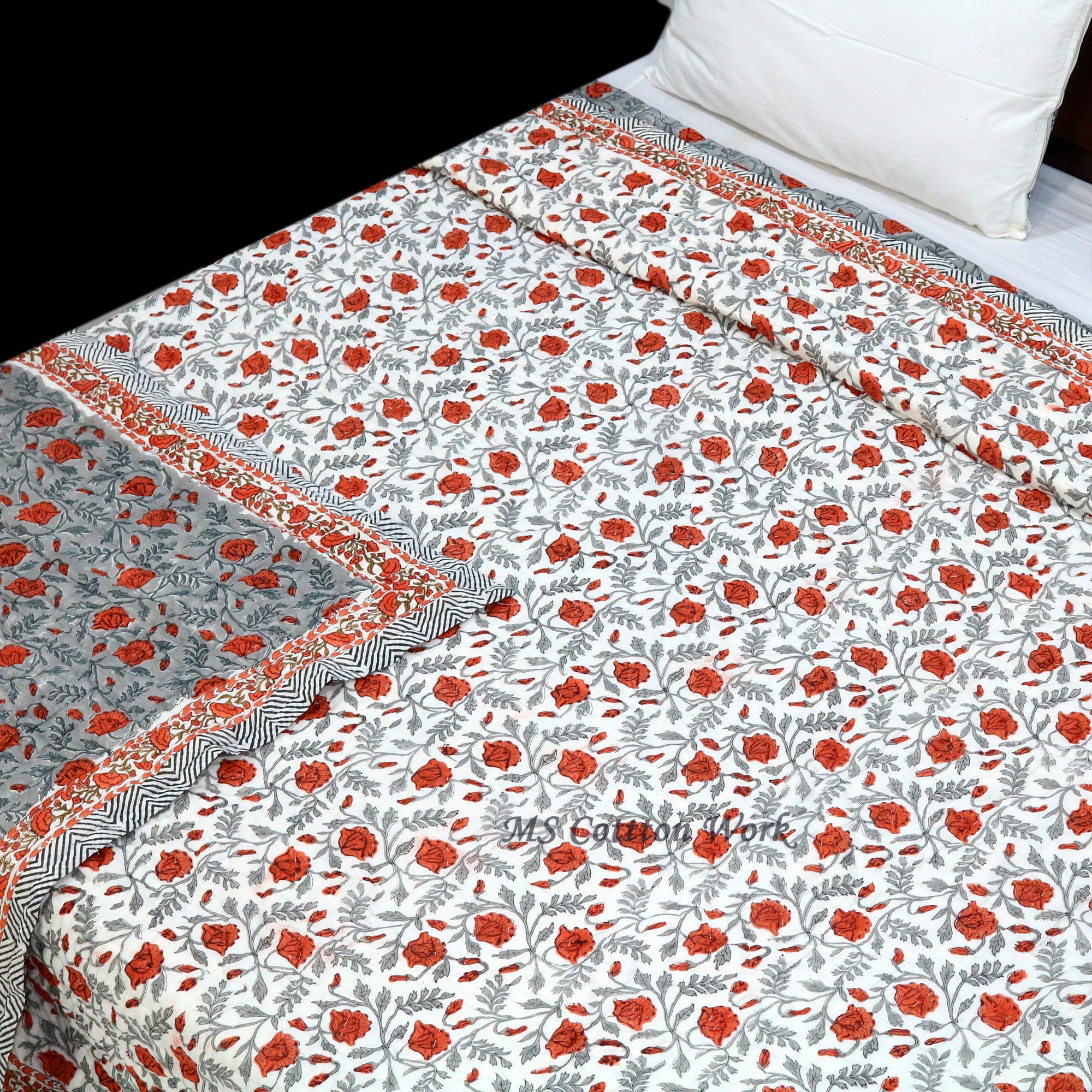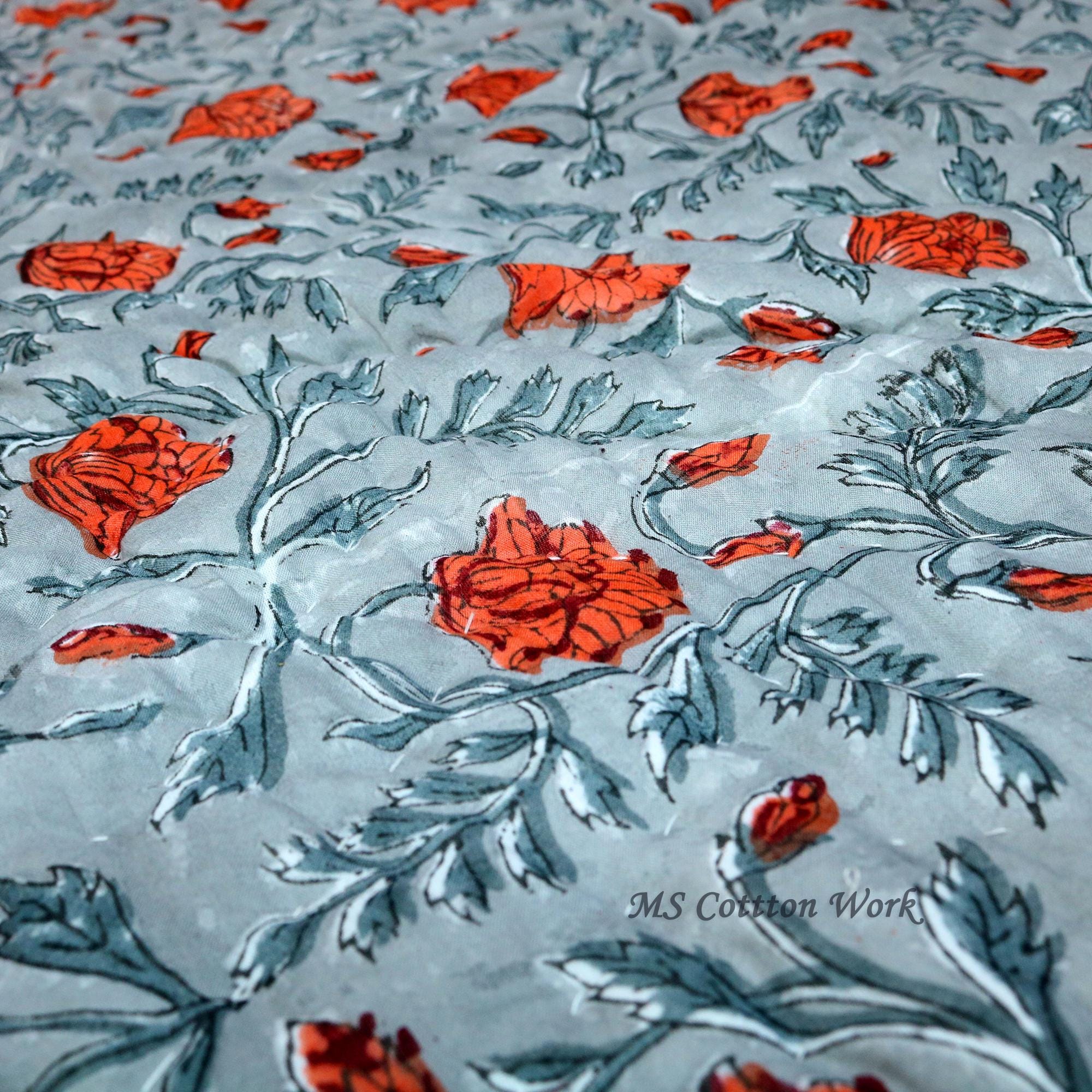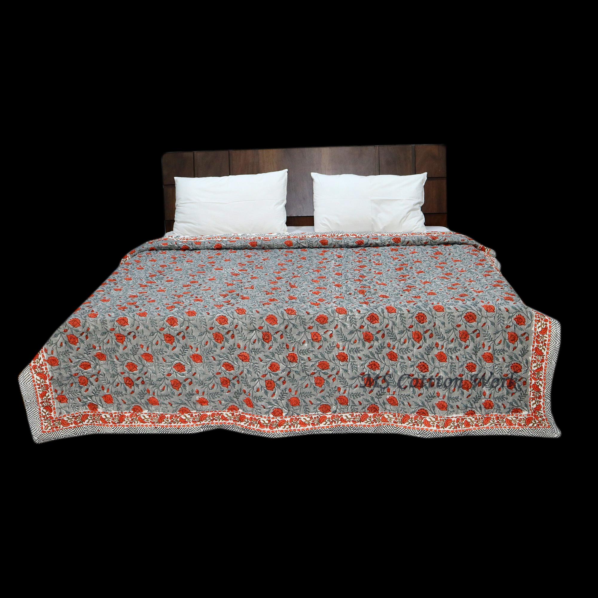Hand Block Print Cotton Quilt: Reversible Floral Indian Bedding