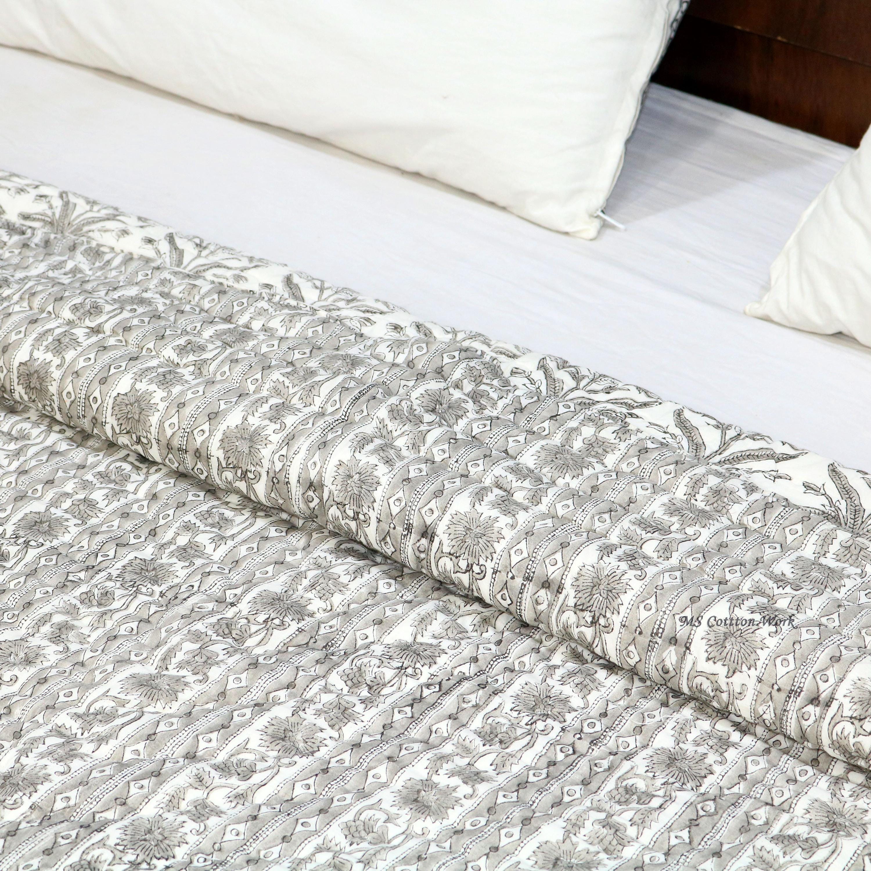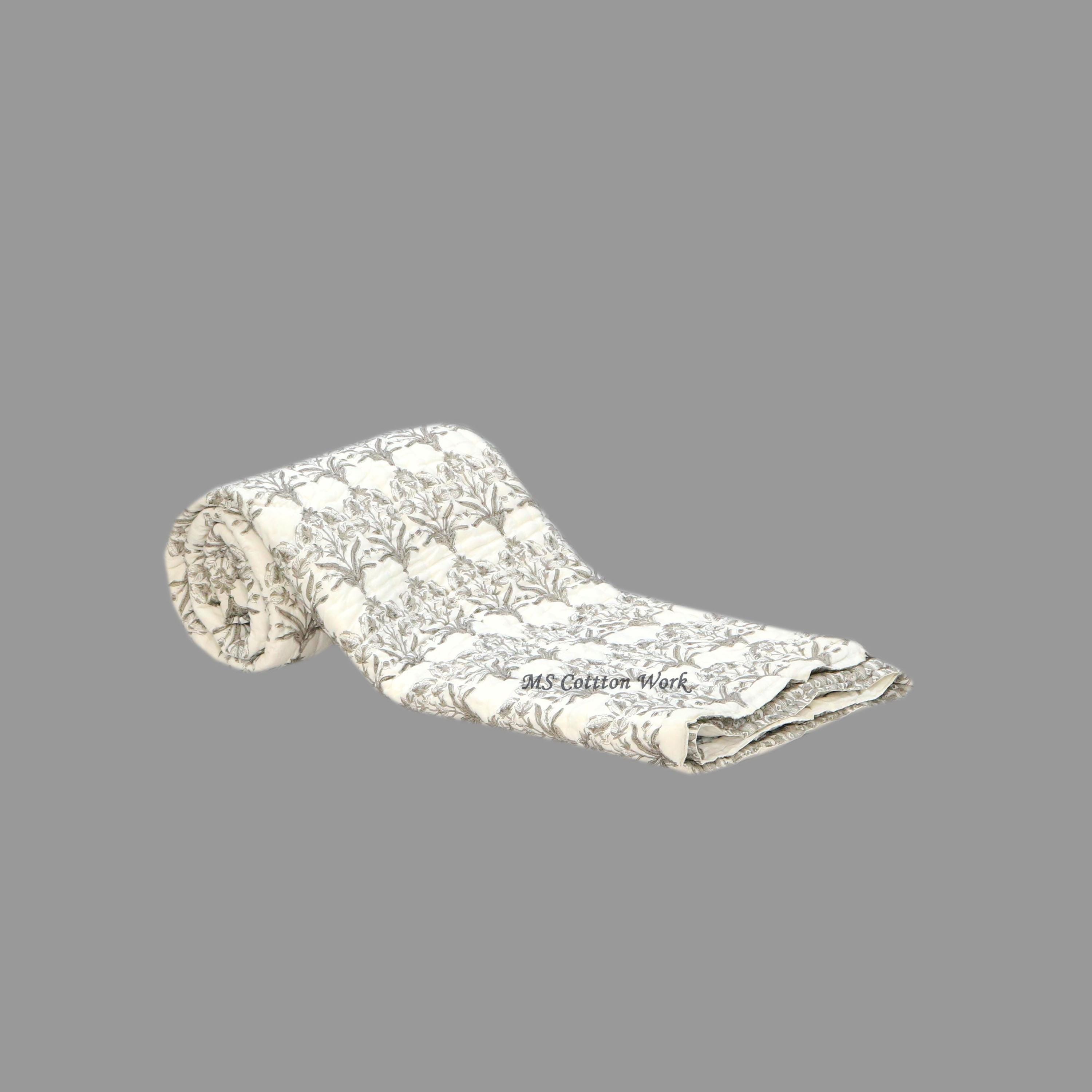 Wrap yourself in warmth and luxury with our Hand Block Printed Quilt, featuring intricate hand block printing on soft Malmal cotton fabric. Filled with natural loose cotton, it offers unparalleled comfort and coziness, perfect for colder seasons. Meticulously hand-stitched throughout, the quilt's unique design adds a touch of artistry and charm to your bedroom.
