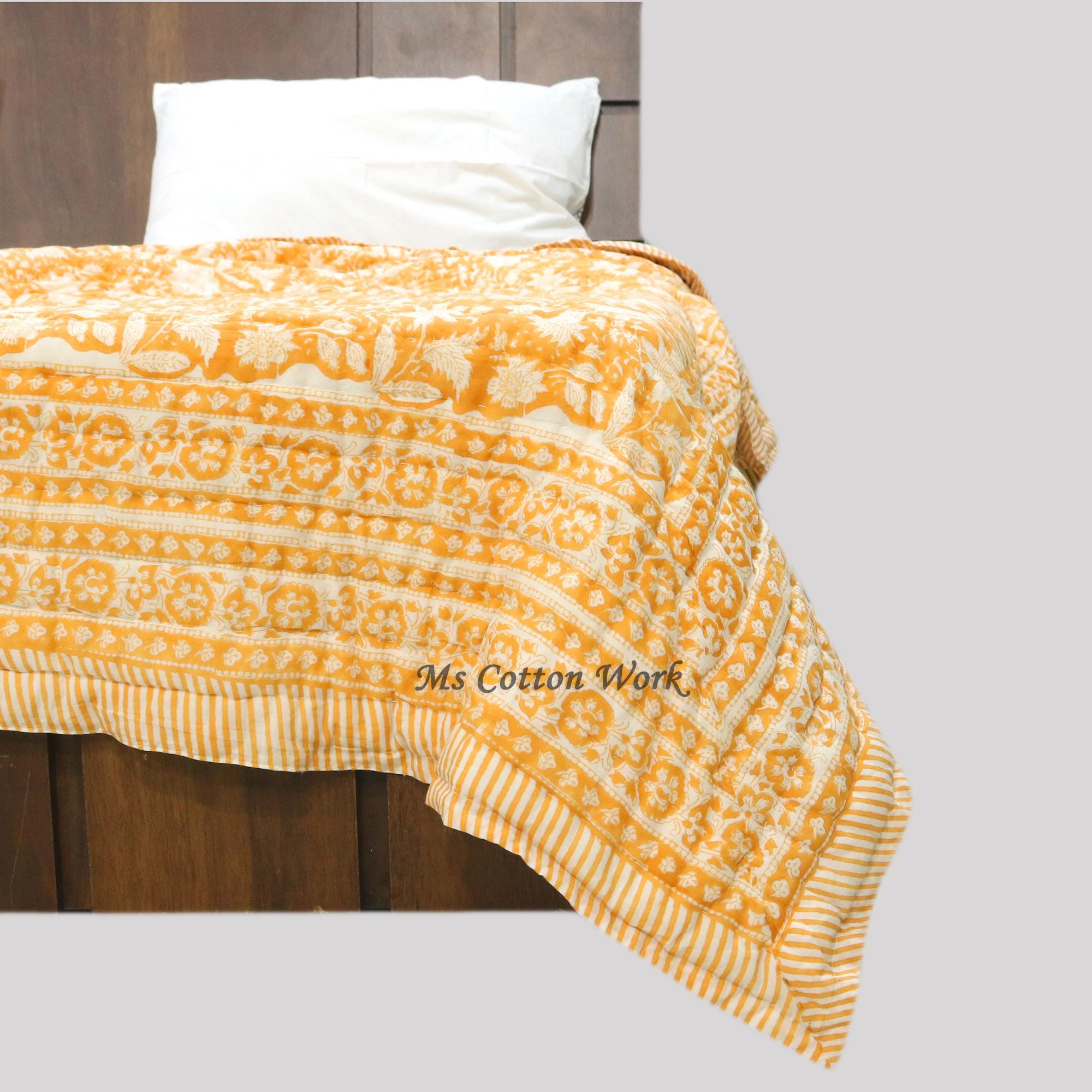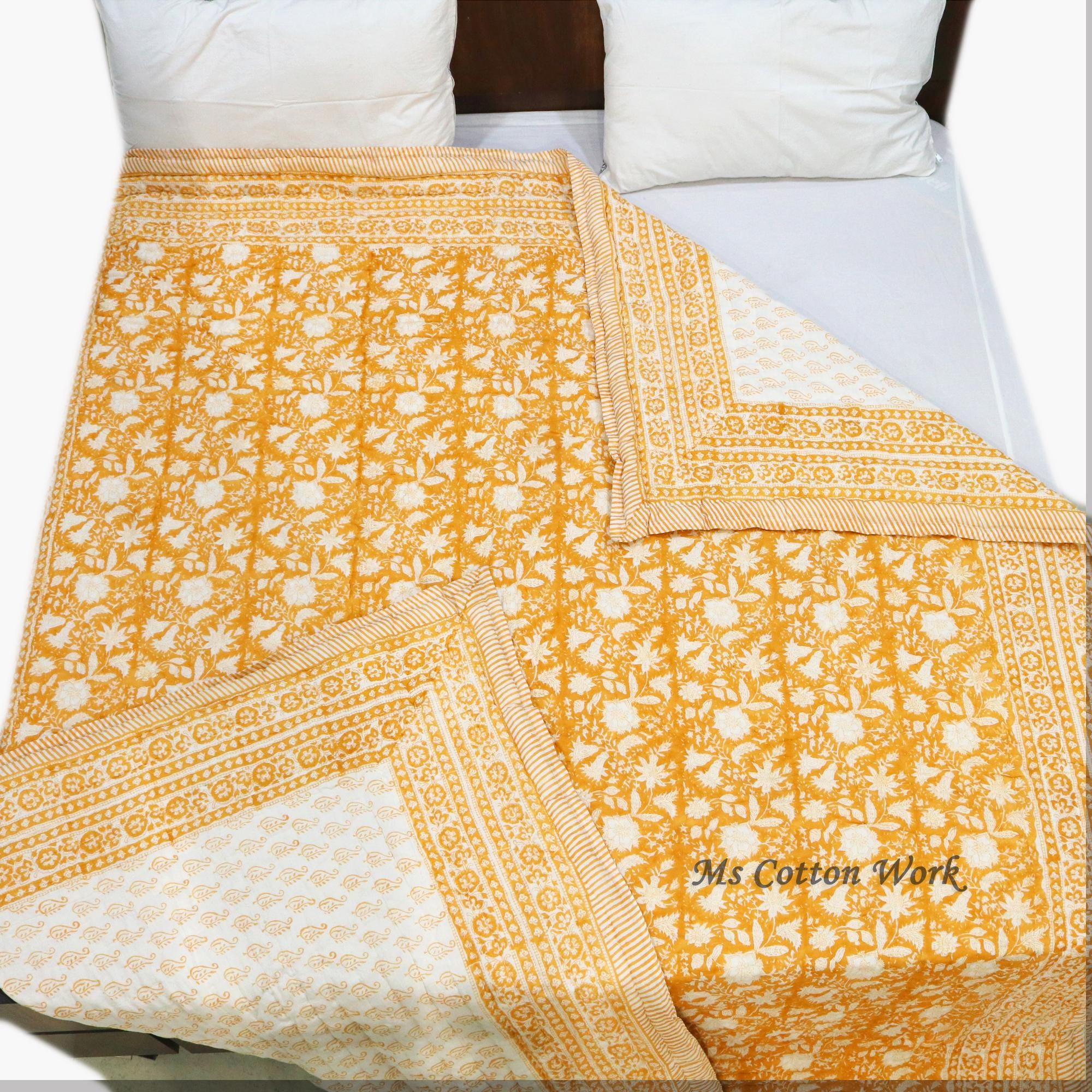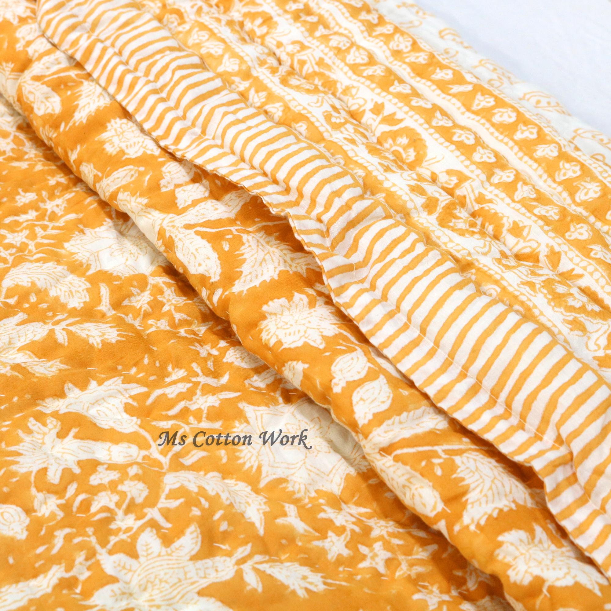 Handmade Block Printed Cotton Quilt: Reversible Floral Bedding