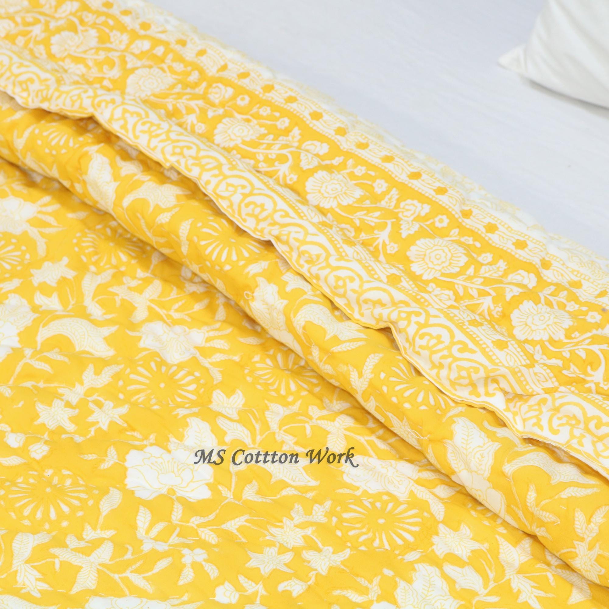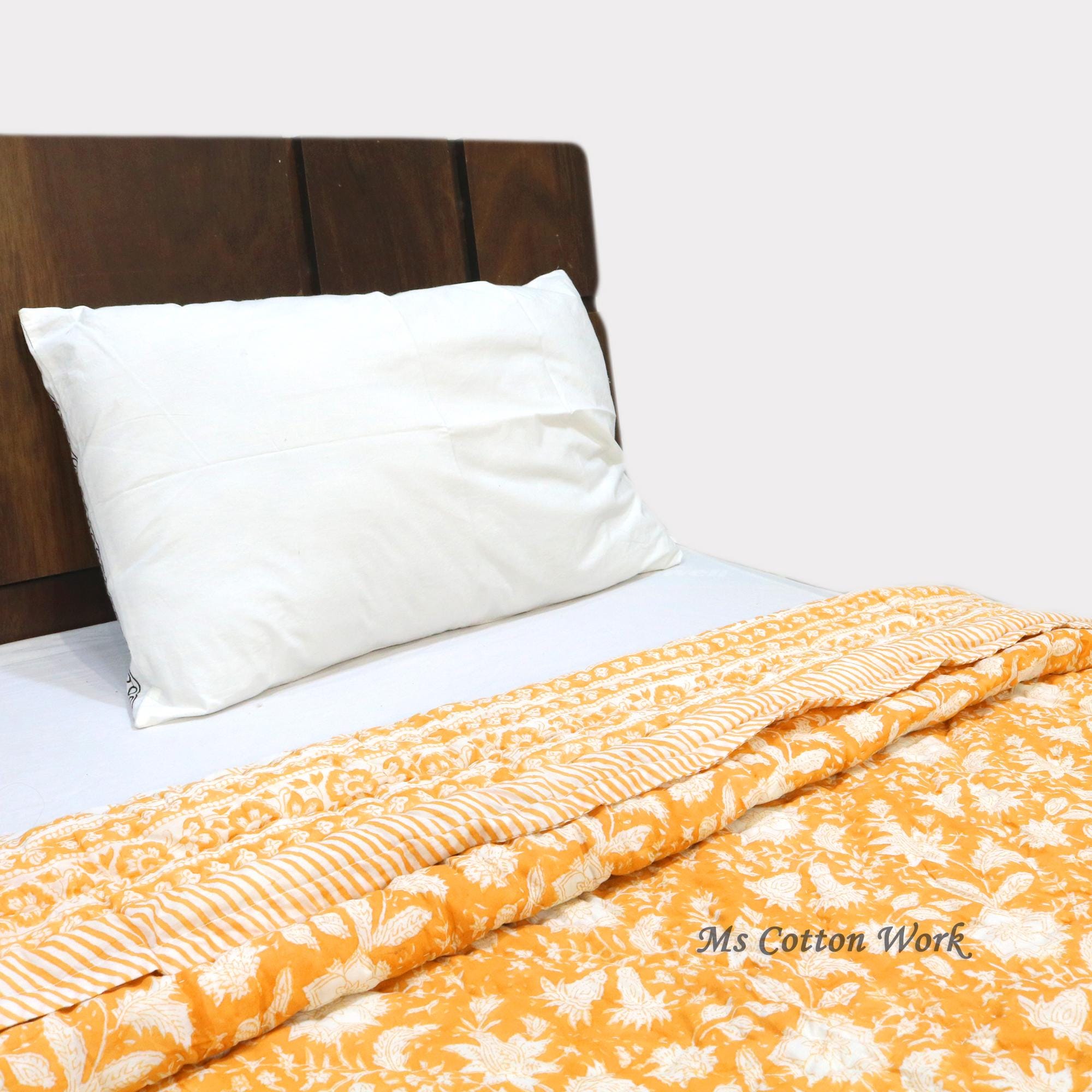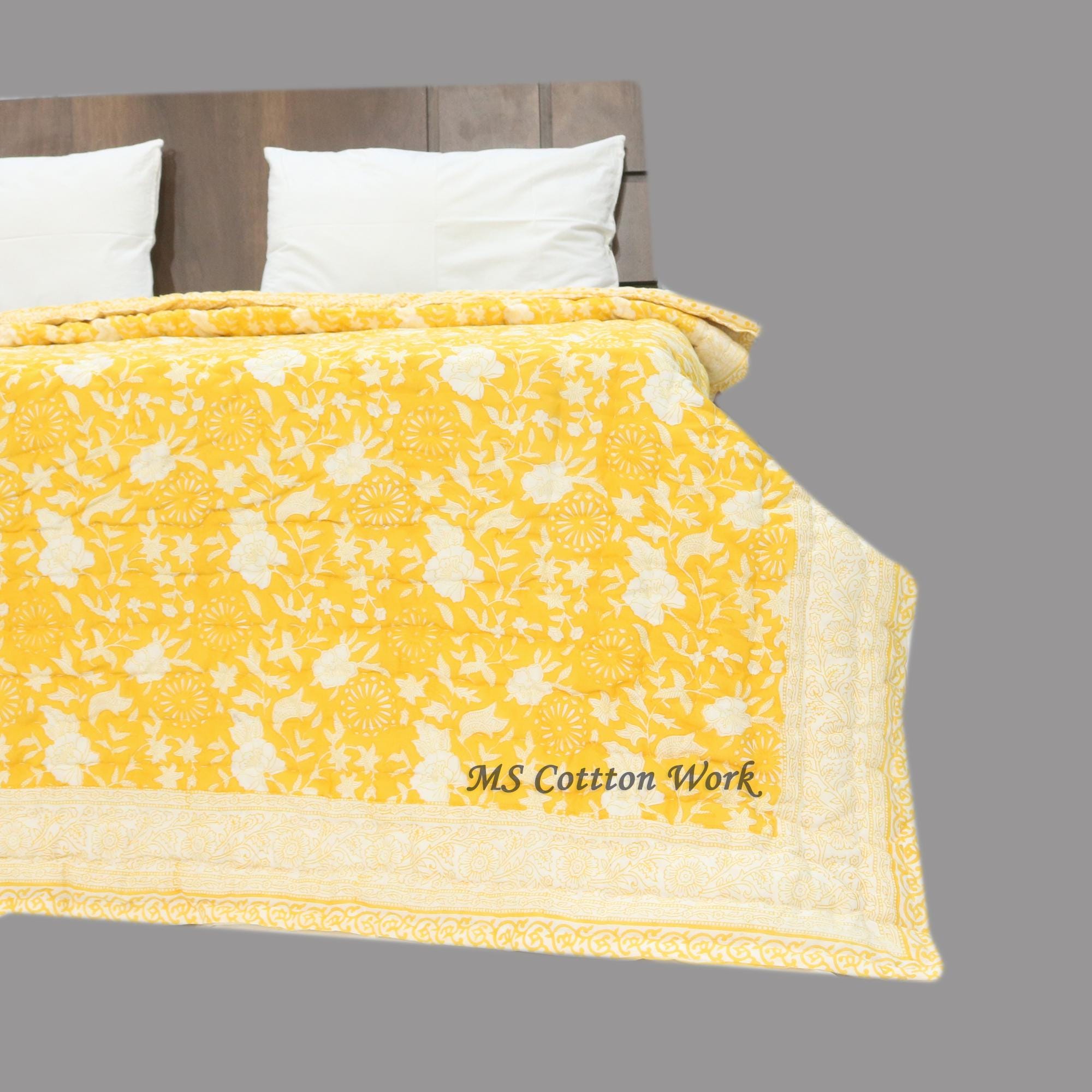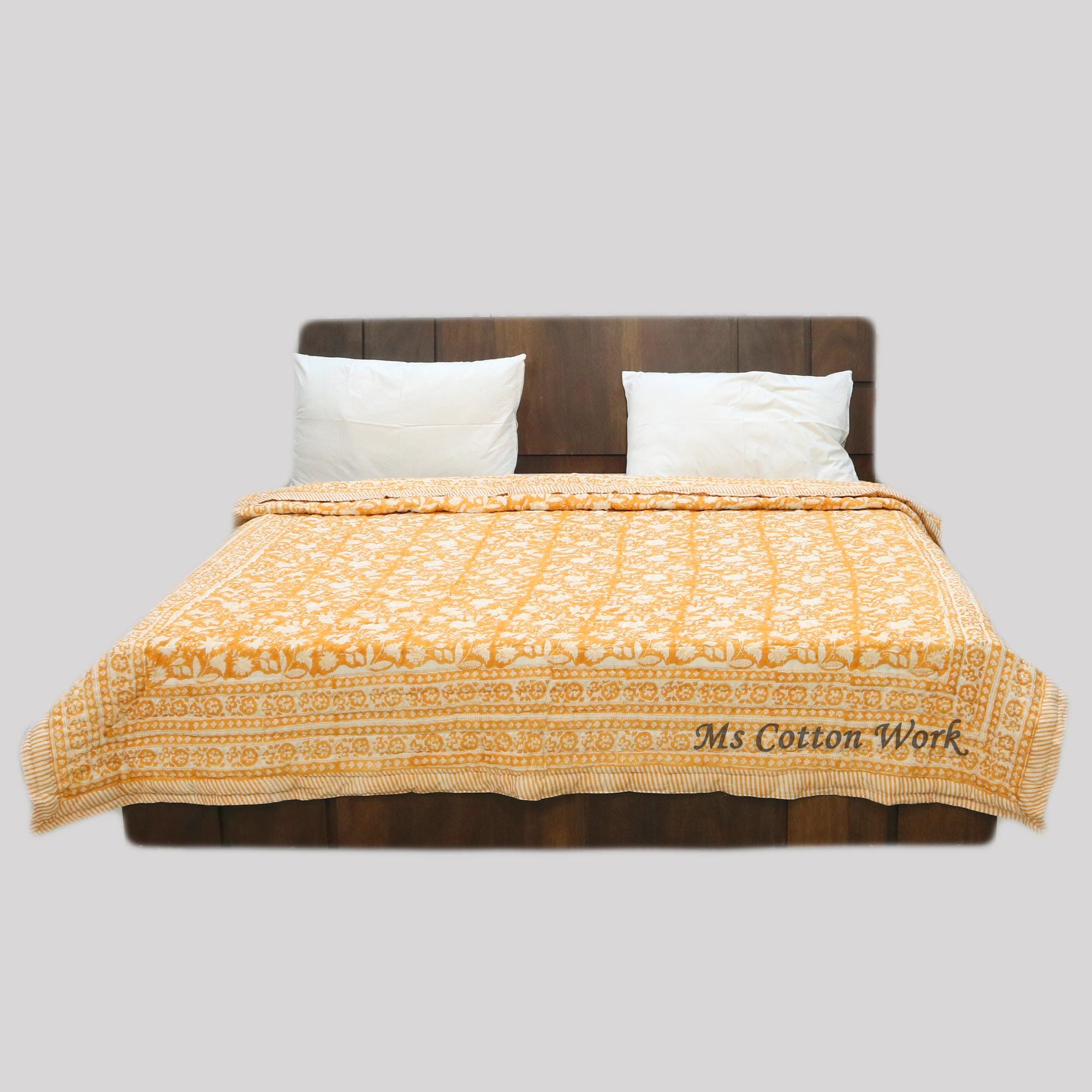 Handmade Block Printed Cotton Quilt: Reversible Floral Bedding