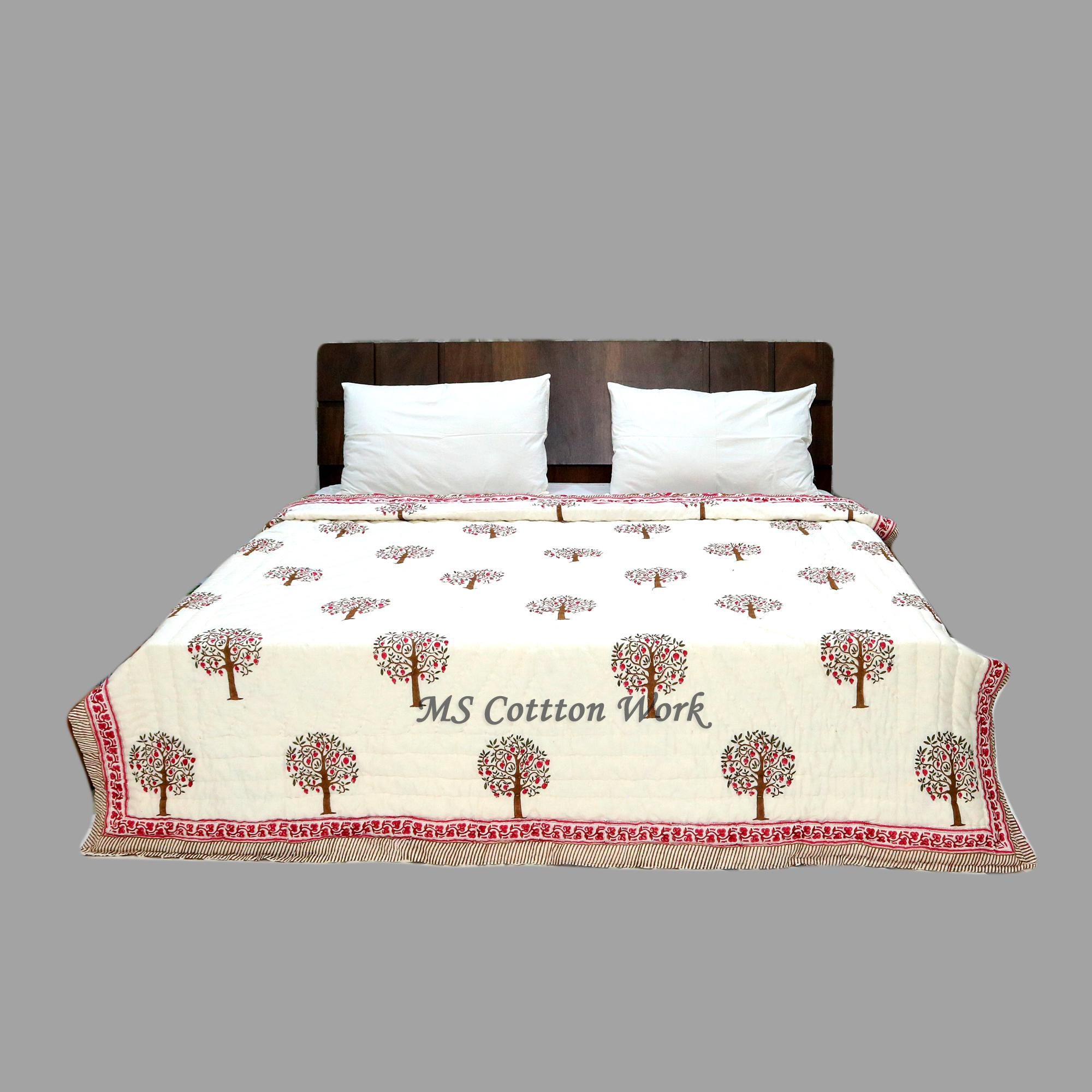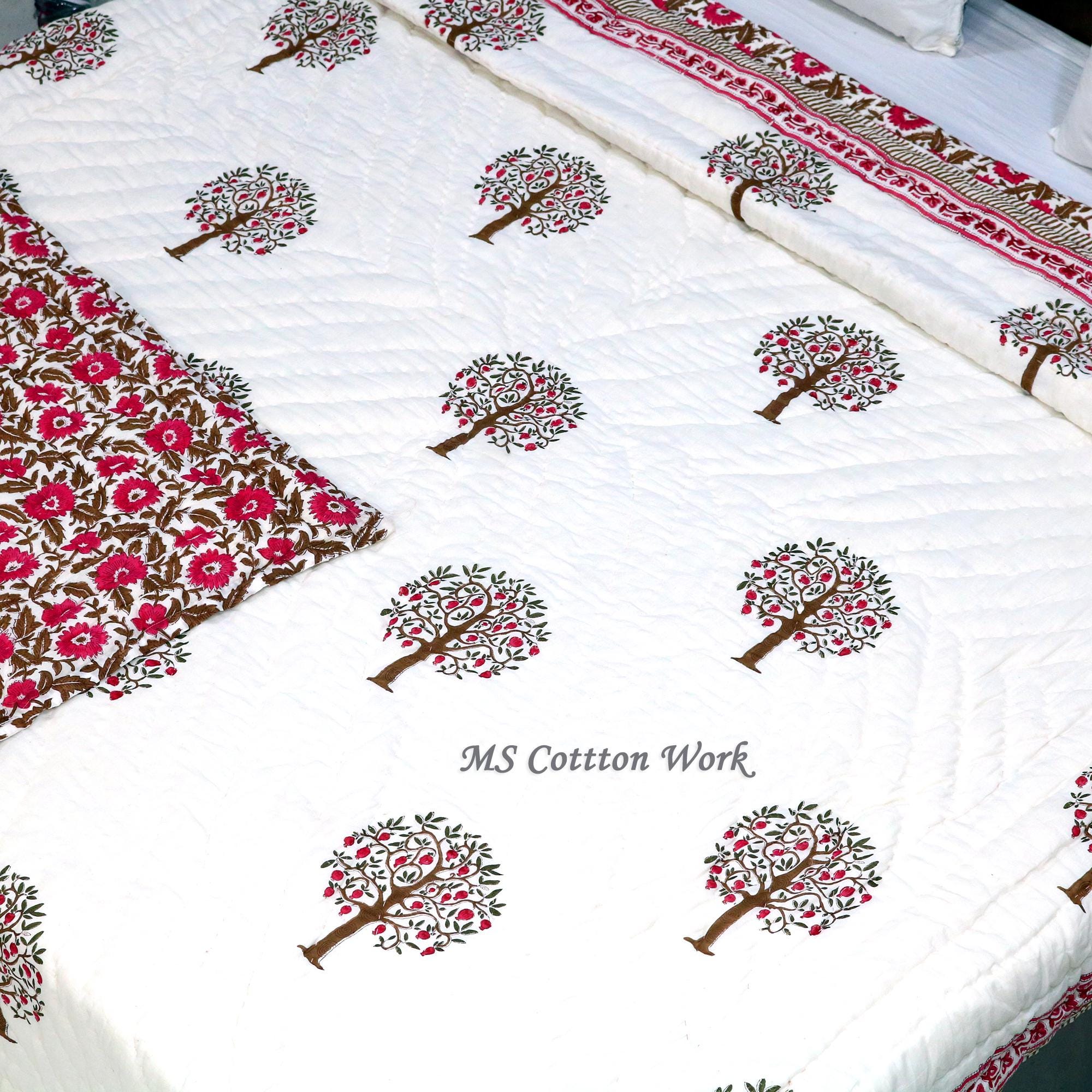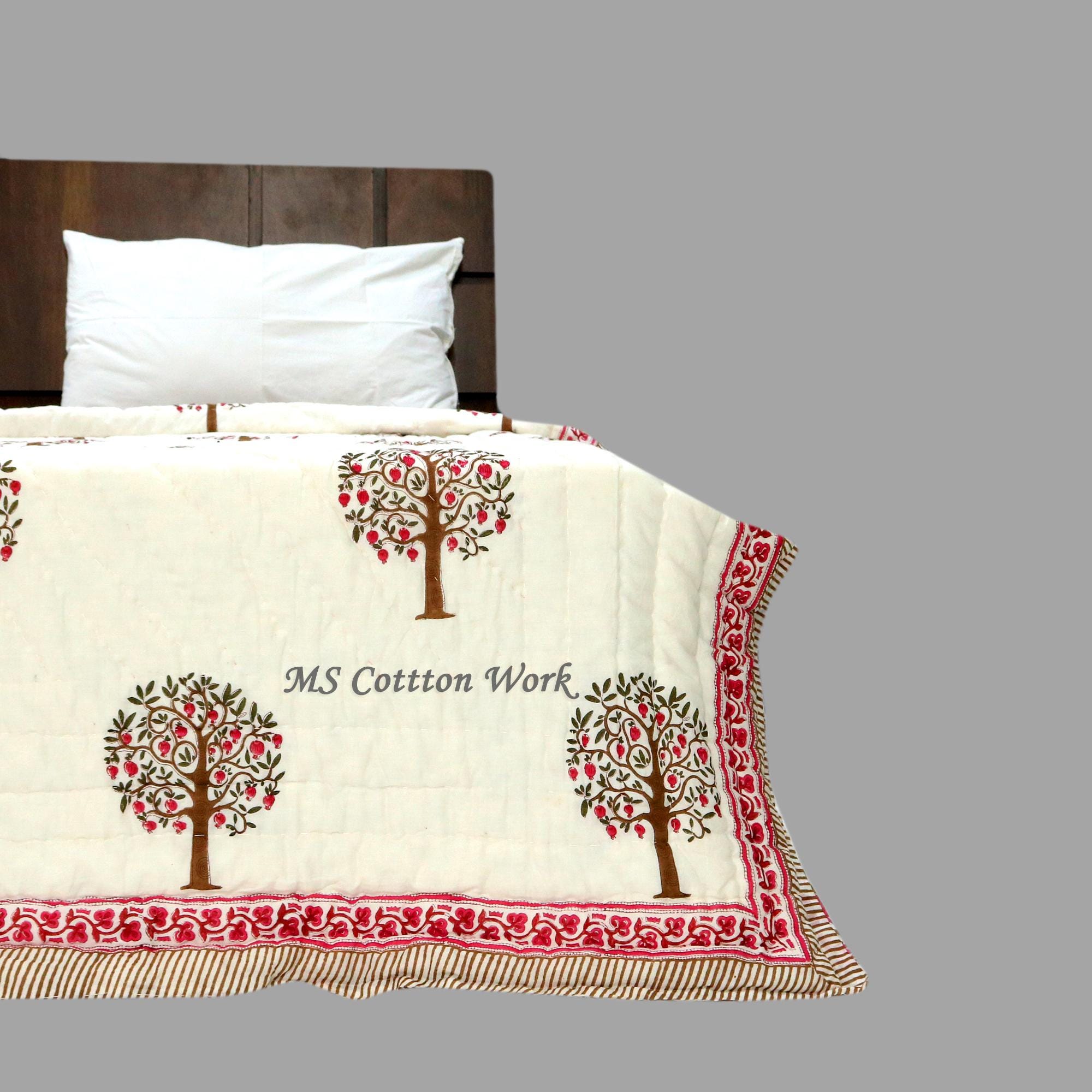 Hand Block Print Cotton Quilt: Reversible Tree Design Razai
