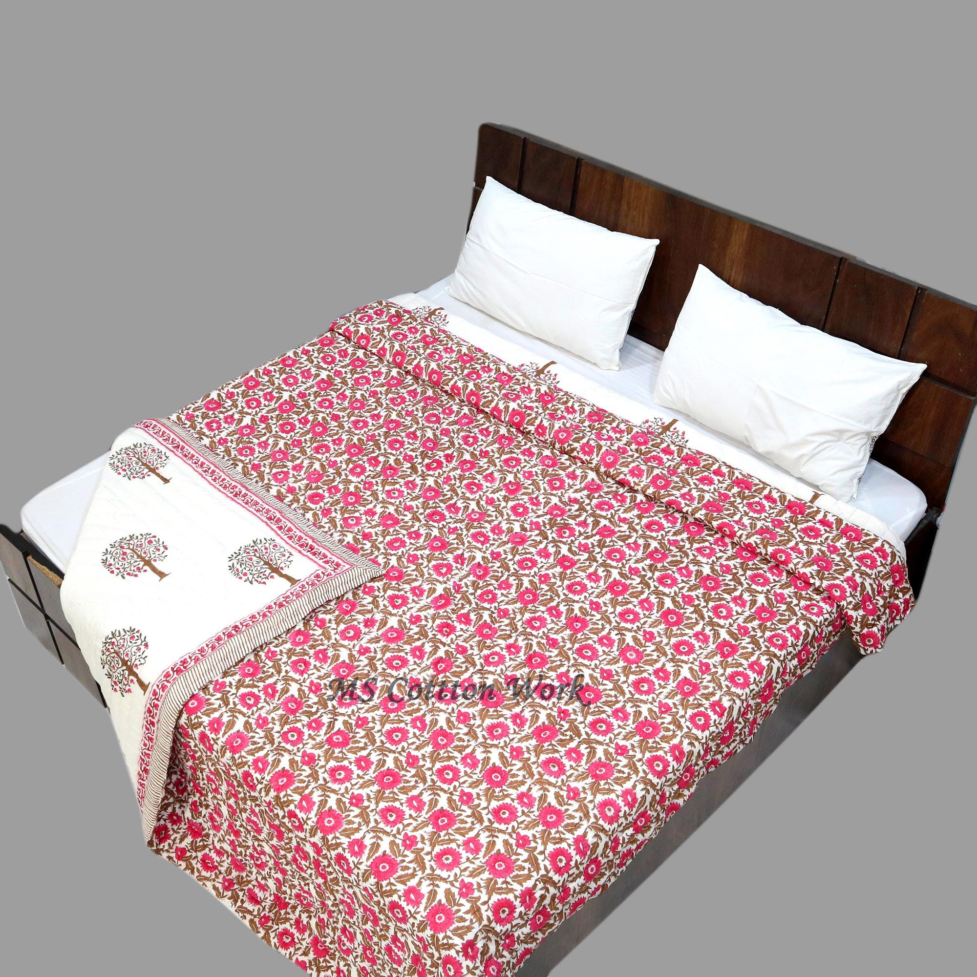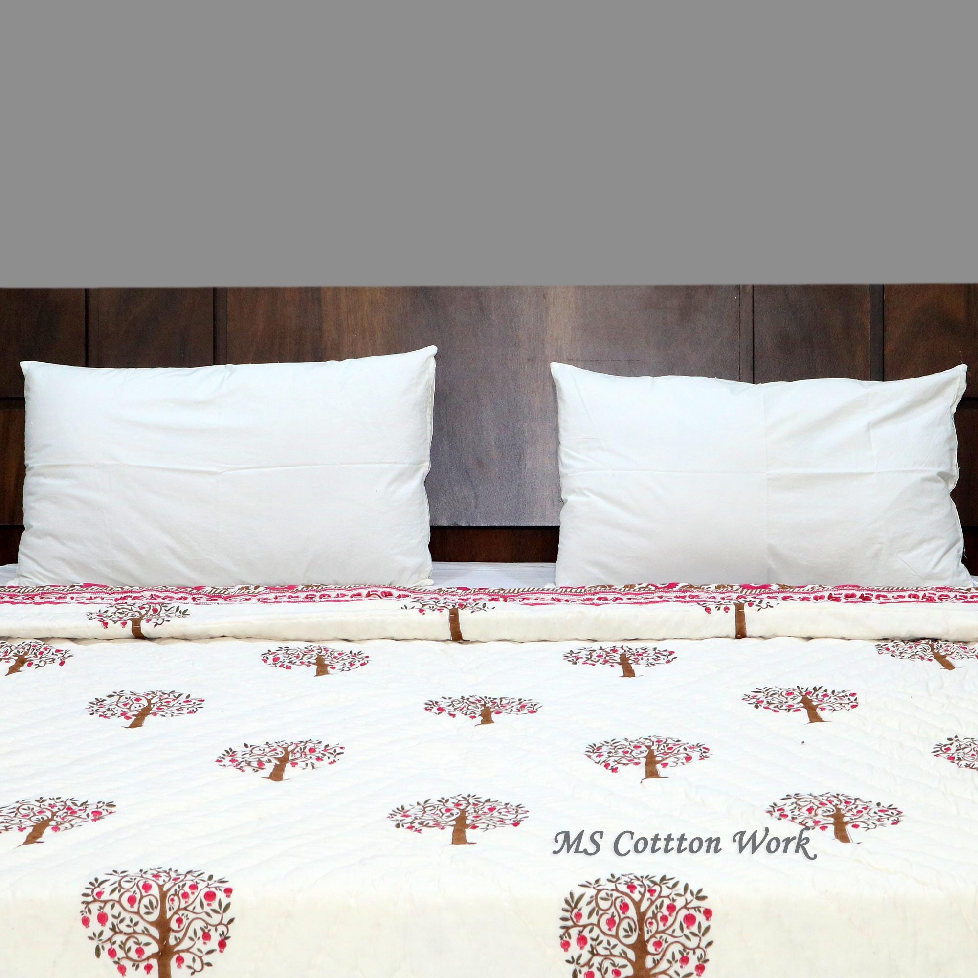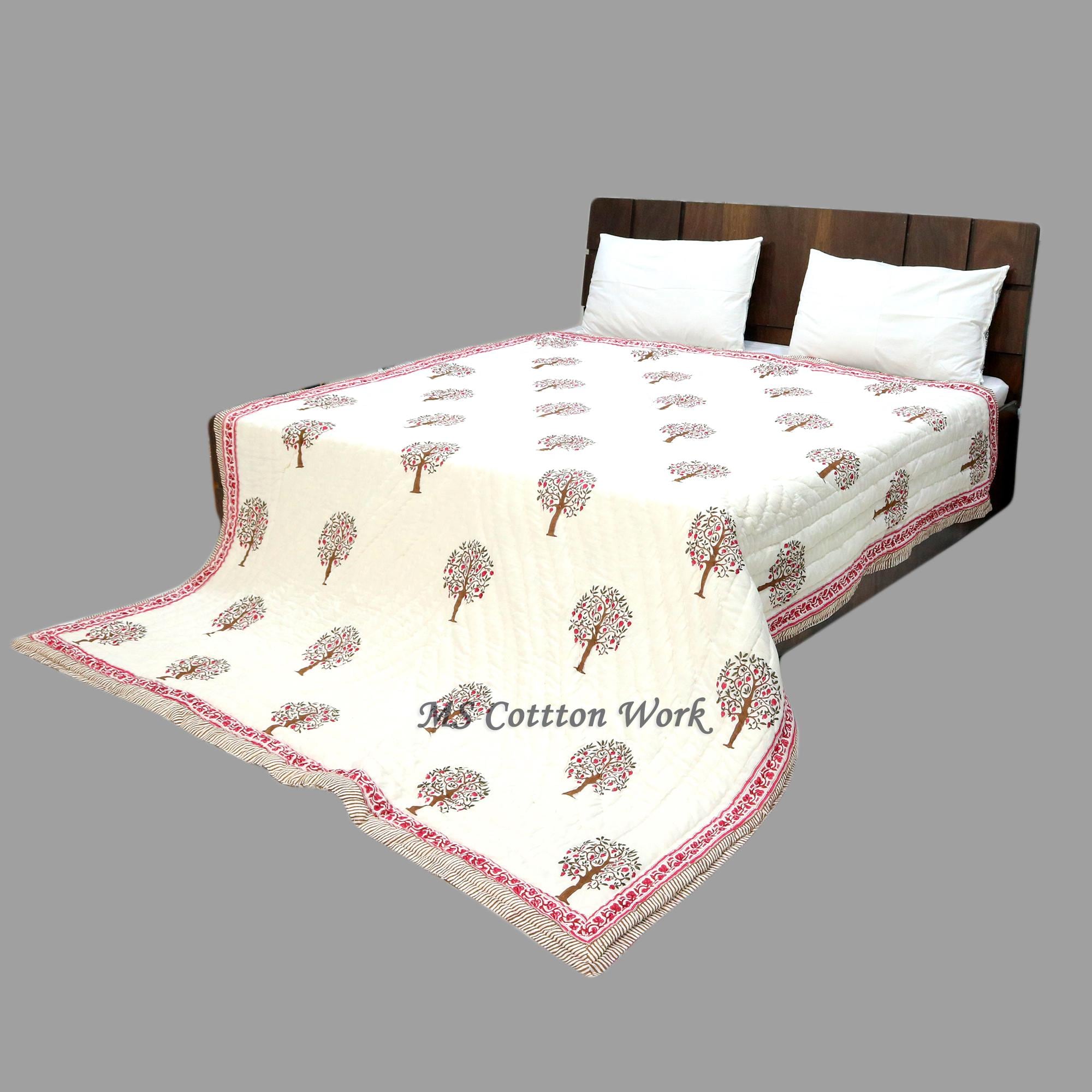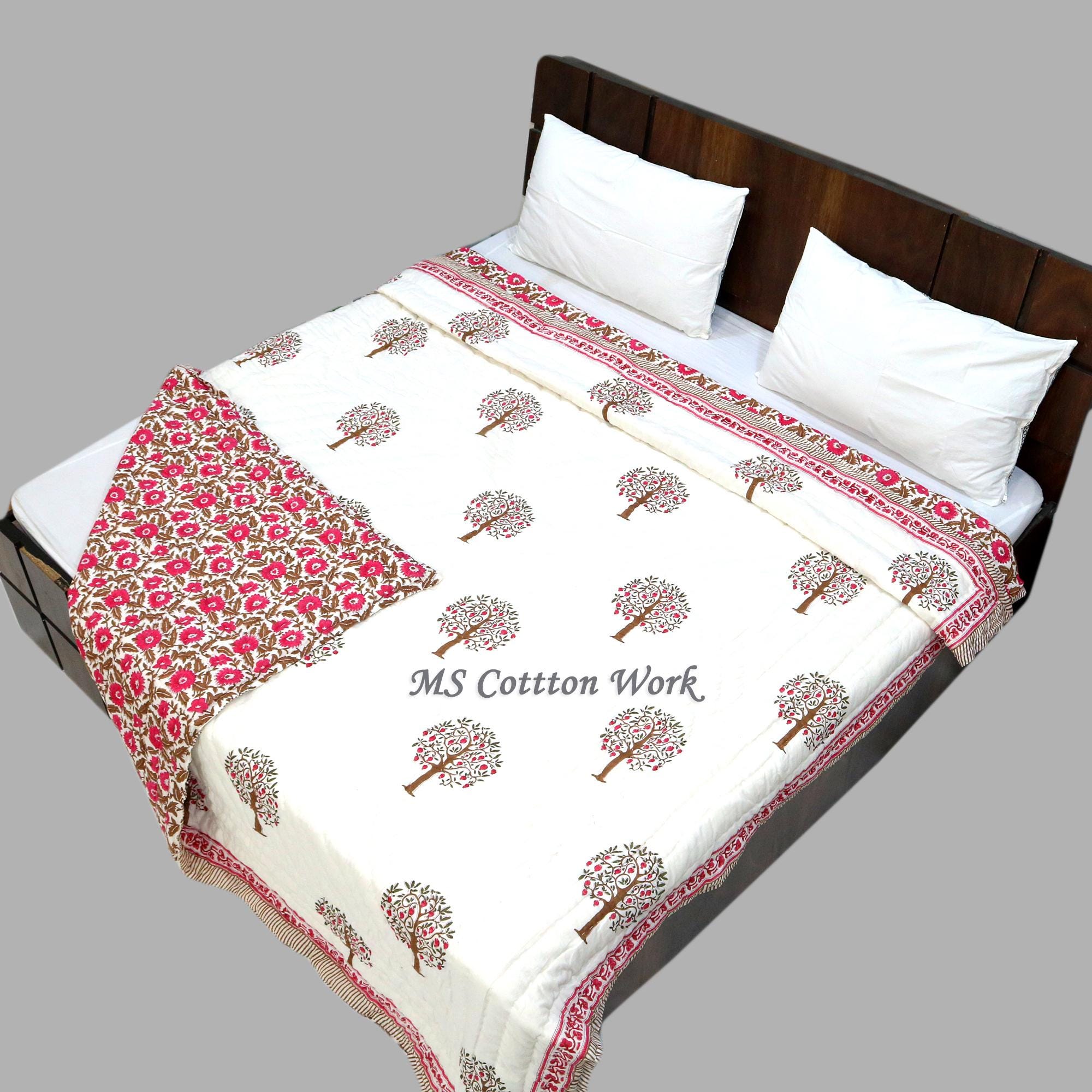 Hand Block Print Cotton Quilt: Reversible Tree Design Razai
