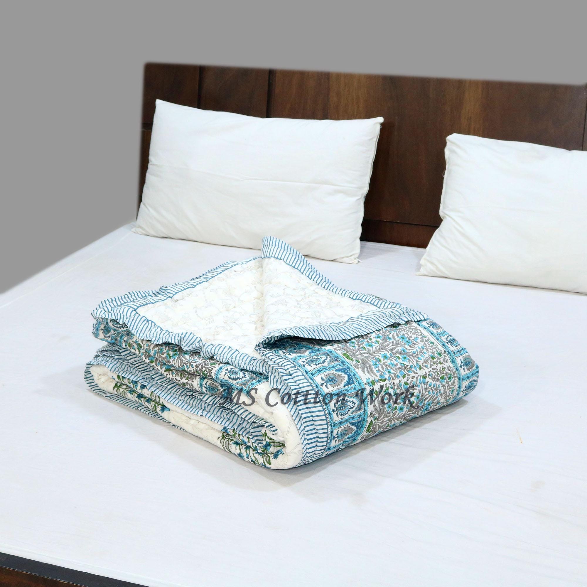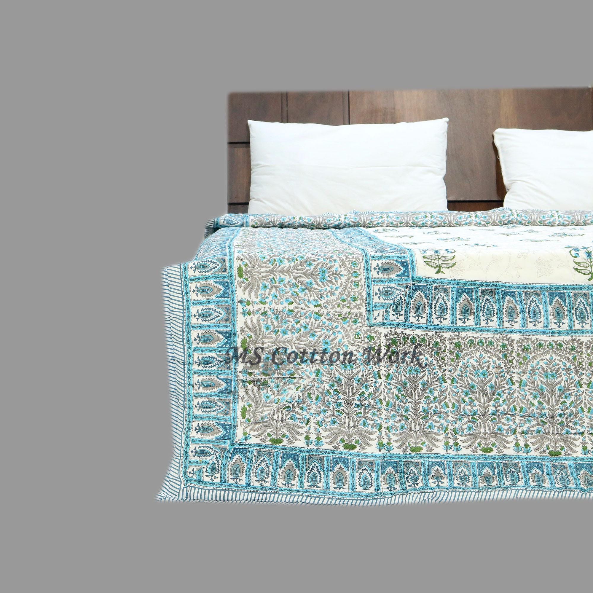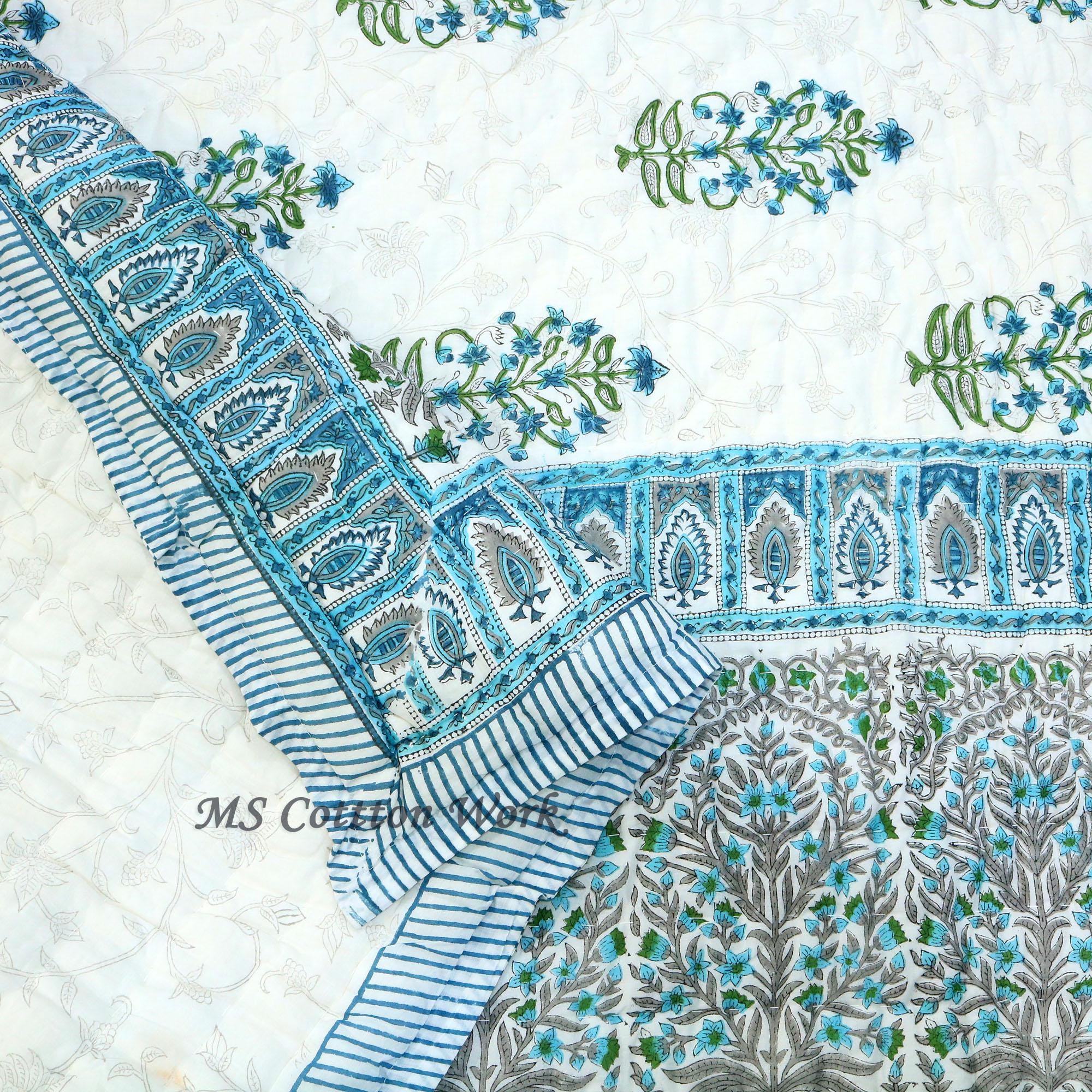 Hand Block Printed Cotton Queen Quilt: Jaipur Razai Bedspread